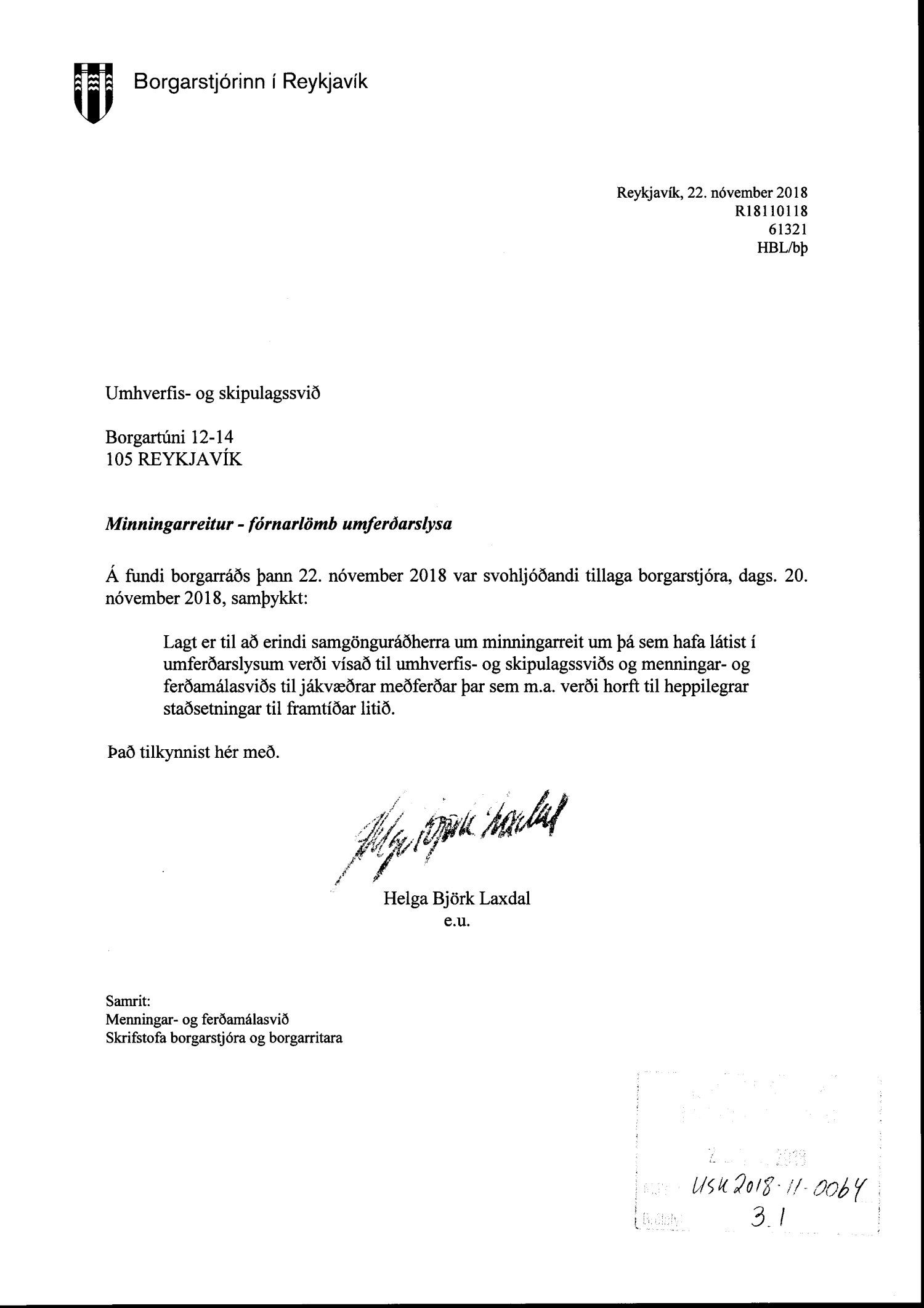Lagt fram bréf borgarstjóra dags. 22. nóvember 2018 vegna samþykktar borgarráðs frá 22. nóvember 2018 á eftirfarandi tillögu borgarstjóra: Lagt er til að erindi samgönguráðherra um minningarreit um þá sem hafa látist í umferðarslysum verði vísað til umhverfis- og skipulagssviðs og menningar- og ferðamálasviðs til jákvæðrar meðferðar þar sem m.a. verði horft til heppilegrar staðsetnigar til framtíðar litið.