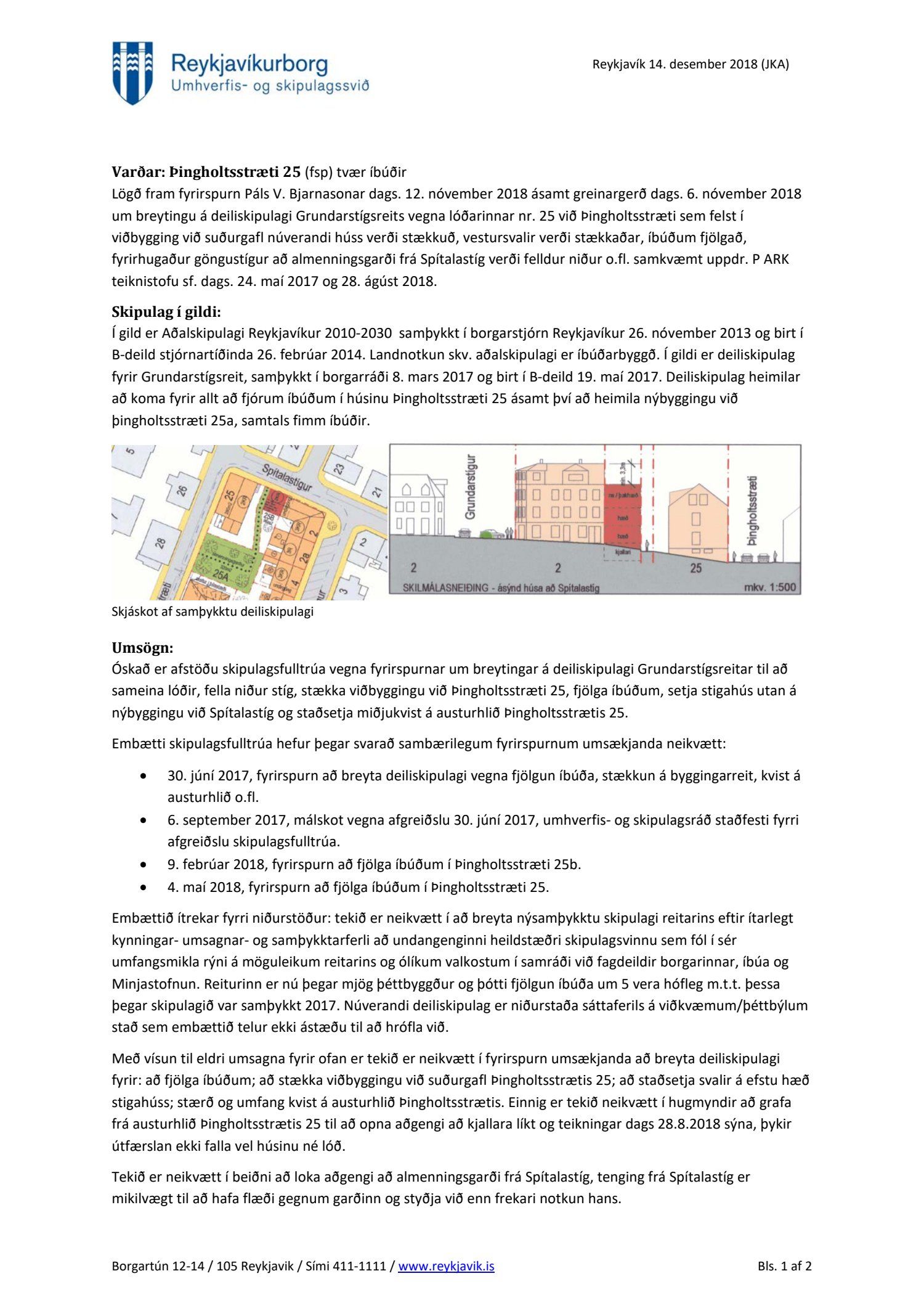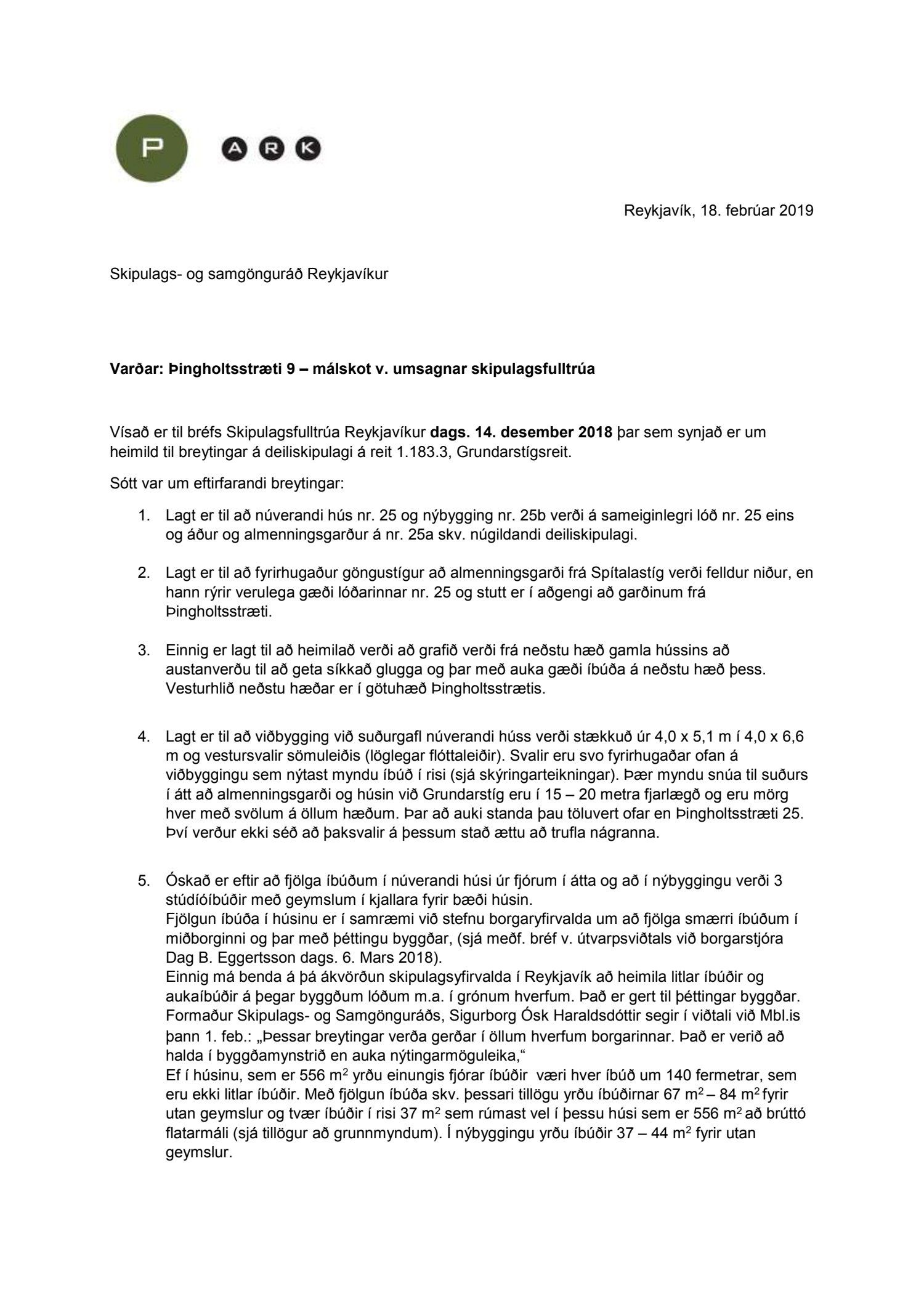 Lagt fram málskot P ARK teiknistofu sf dags. 18. febrúar 2019 vegna neikvæðrar afgreiðslu skipulagsfulltrúa frá 14. desember 2018 um breytingu á deiliskipulagi Grundarstígsreits vegna lóðarinnar nr. 25 við Þingholtsstræti sem felst í viðbygging við suðurgafl núverandi húss verði stækkuð, vestursvalir verði stækkaðar, íbúðum fjölgað, fyrirhugaður göngustígur að almenningsgarði frá Spítalastíg verði felldur niður o.fl. samkvæmt uppdr. P