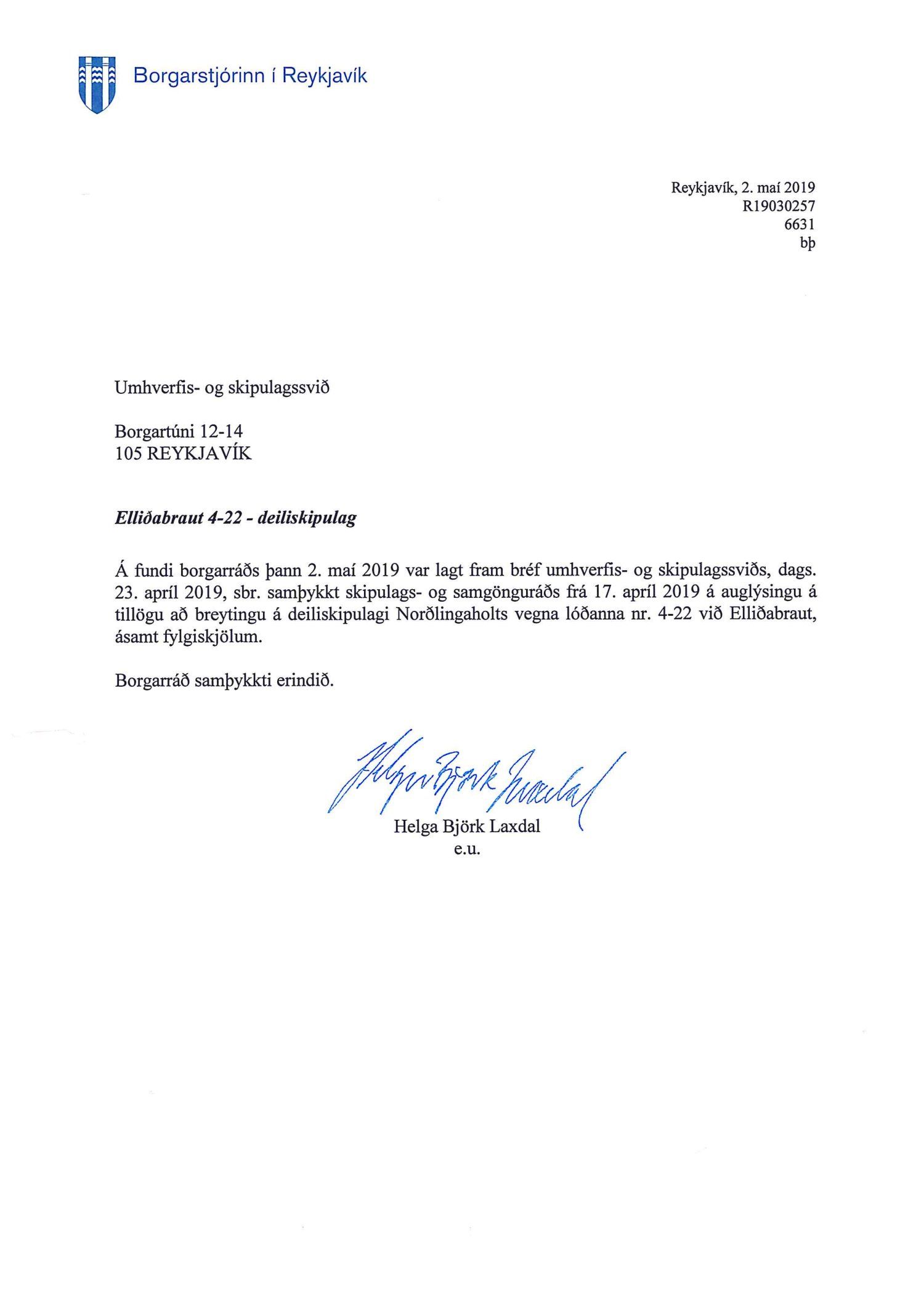 Lagt fram bréf borgarstjóra dags. 2. maí 2019 vegna samþykktar borgarráðs frá 2. maí 2019 á auglýsingu á tillögu að breytingu á deiliskipulagi Norðlingaholts vegna lóðanna nr. 4-22 við Elliðabraut.