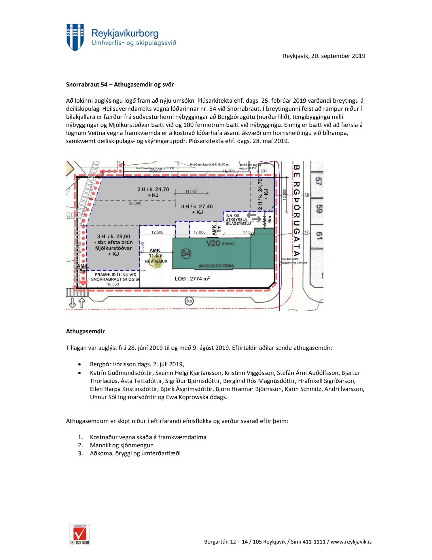 dags. 28. maí 2019. Tillagan var auglýst frá 28. júní 2019 til og með 9. ágúst 2019. Eftirtaldir aðilar sendu athugasemdir: Bergþór Þórisson dags. 2. júlí 2019, Katrín Guðmundsdóttir, Sveinn Helgi Kjartansson, Kristinn Viggósson, Stefán Árni Auðólfsson, Bjartur Thorlacius, Ásta Teitsdóttir, Sigríður Björnsdóttir, Berglind Rós Magnúsdóttir, Hrafnkell Sigríðarson, Ellen Harpa Kristinsdóttir, Björk Ásgrímsdóttir, Björn Hrannar Björnsson, Karin Schmitz, Andri Ívarsson, Unnur Sól Ingimarsdóttir og Ewa Koprowska ódags. Einnig er lögð fram umsögn skipulagsfulltrúa dags. 20. september 2019.