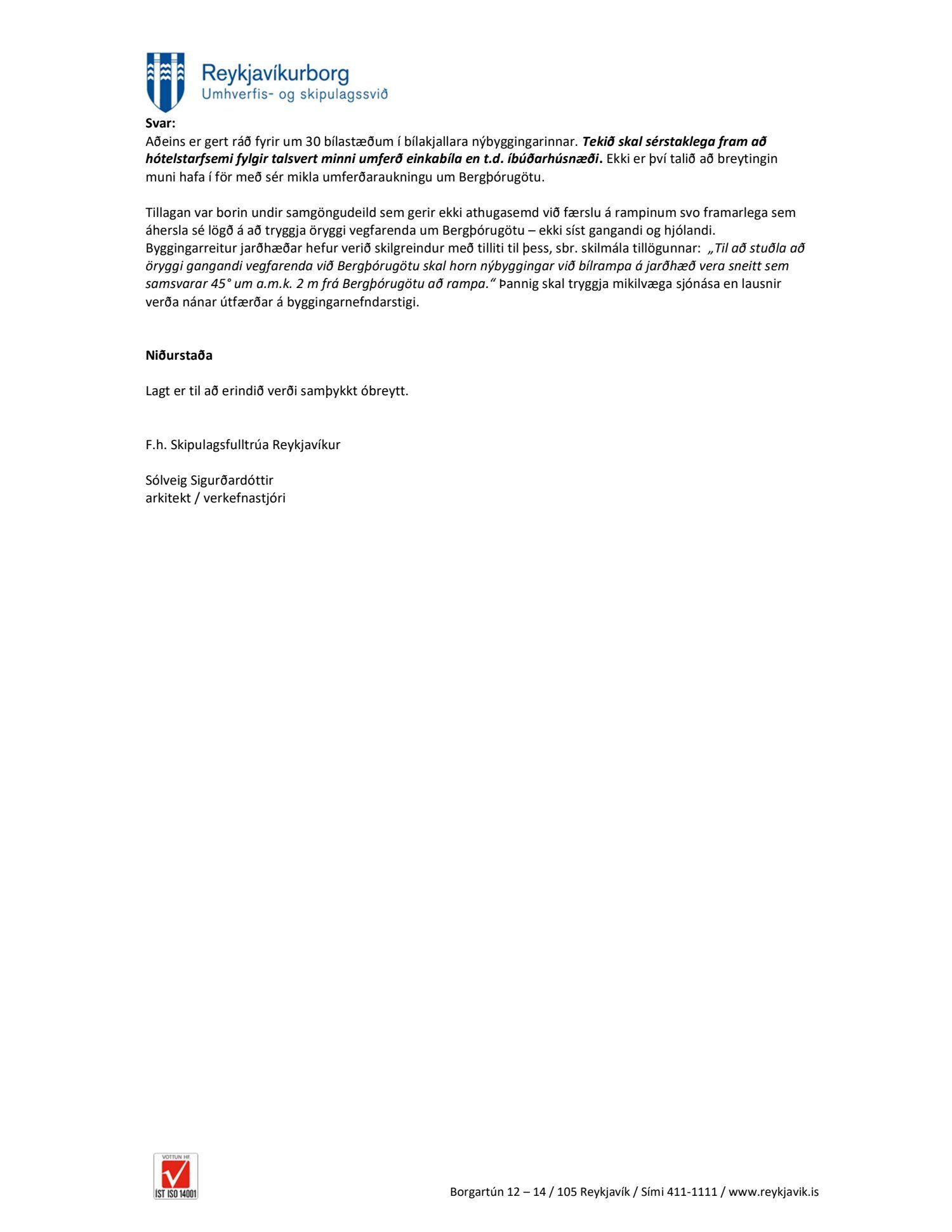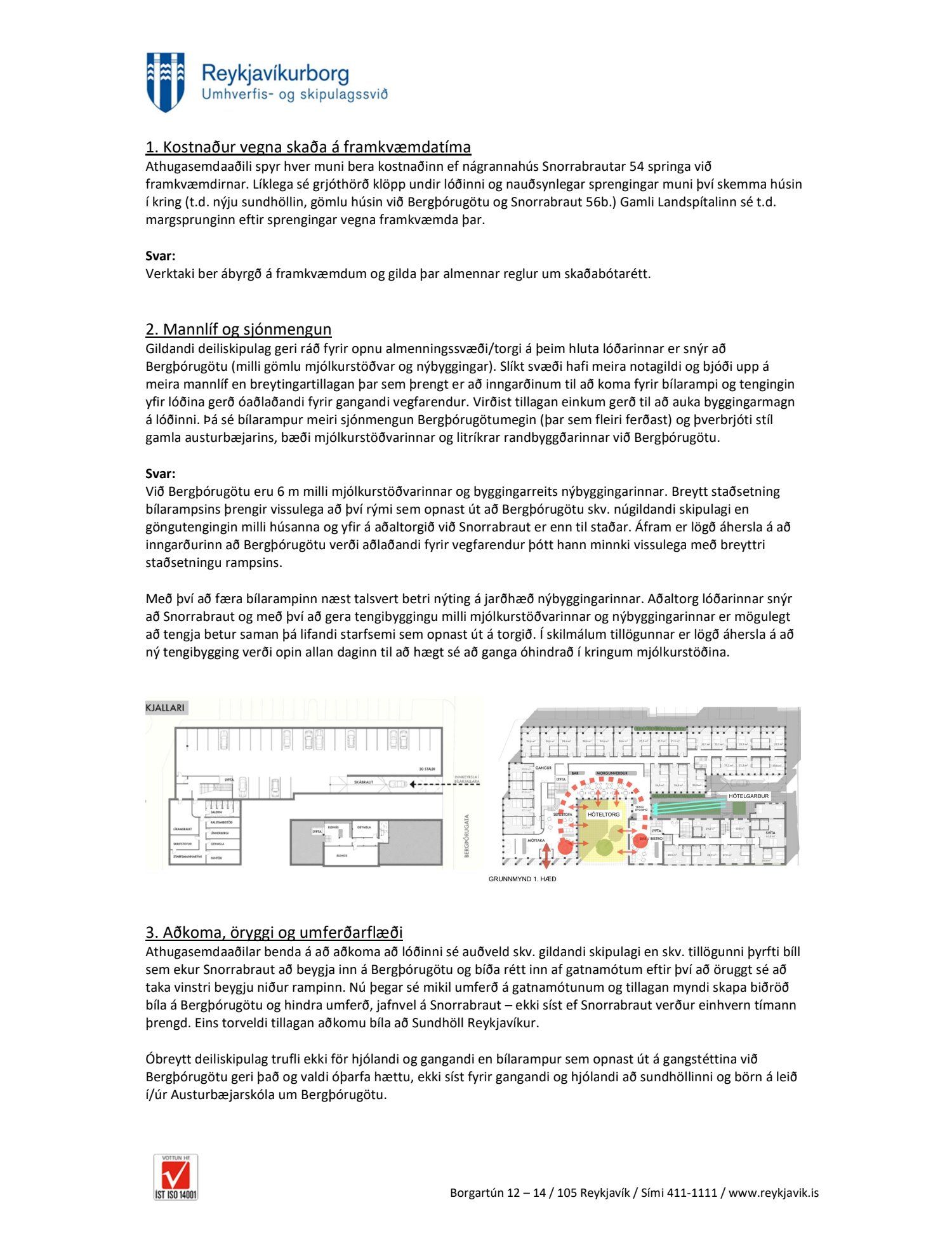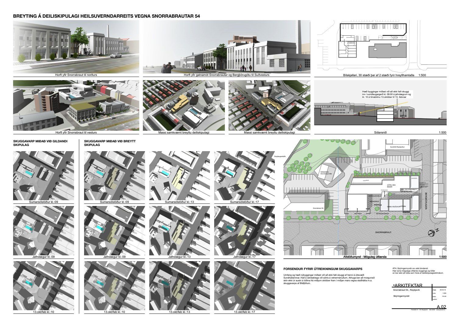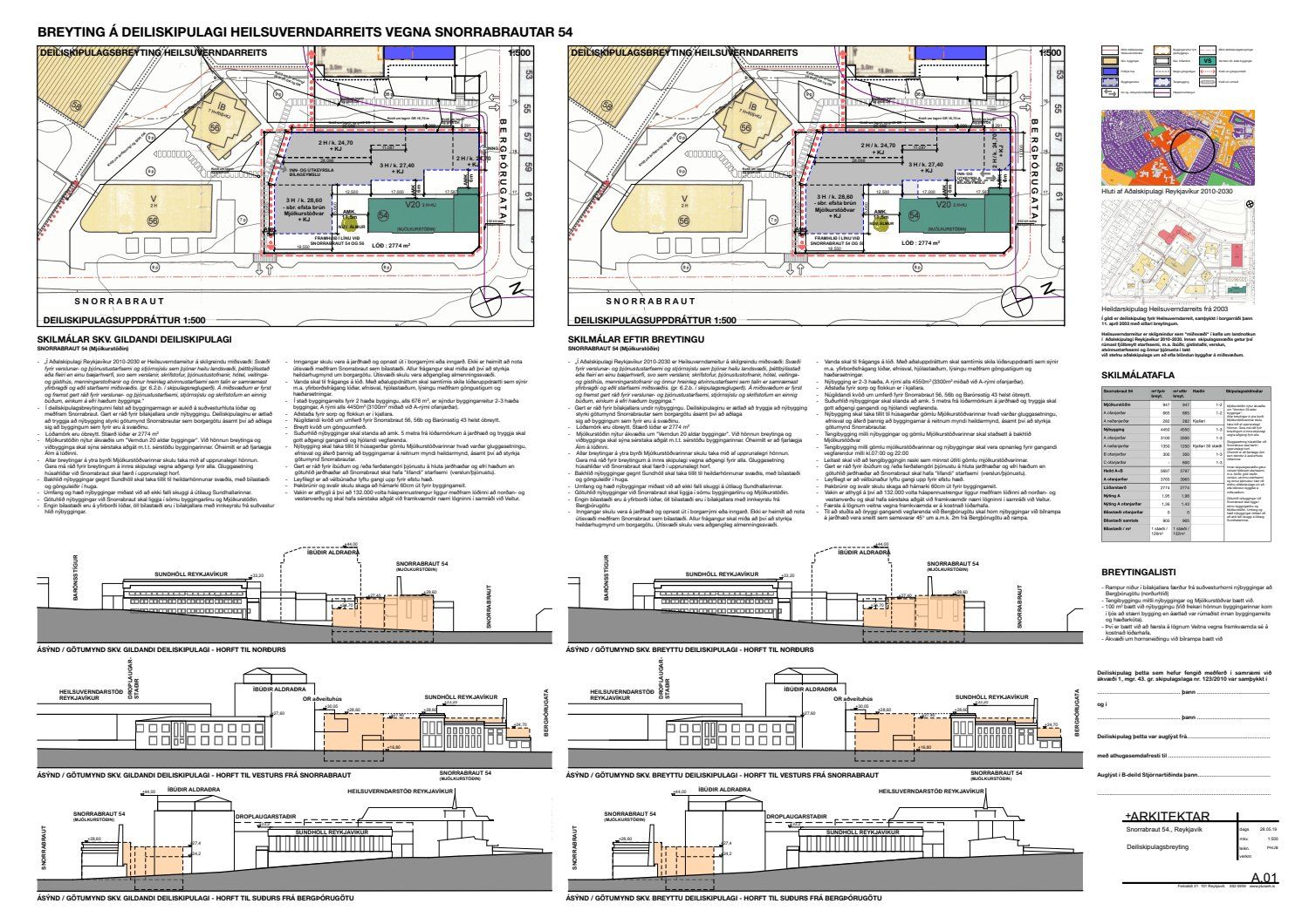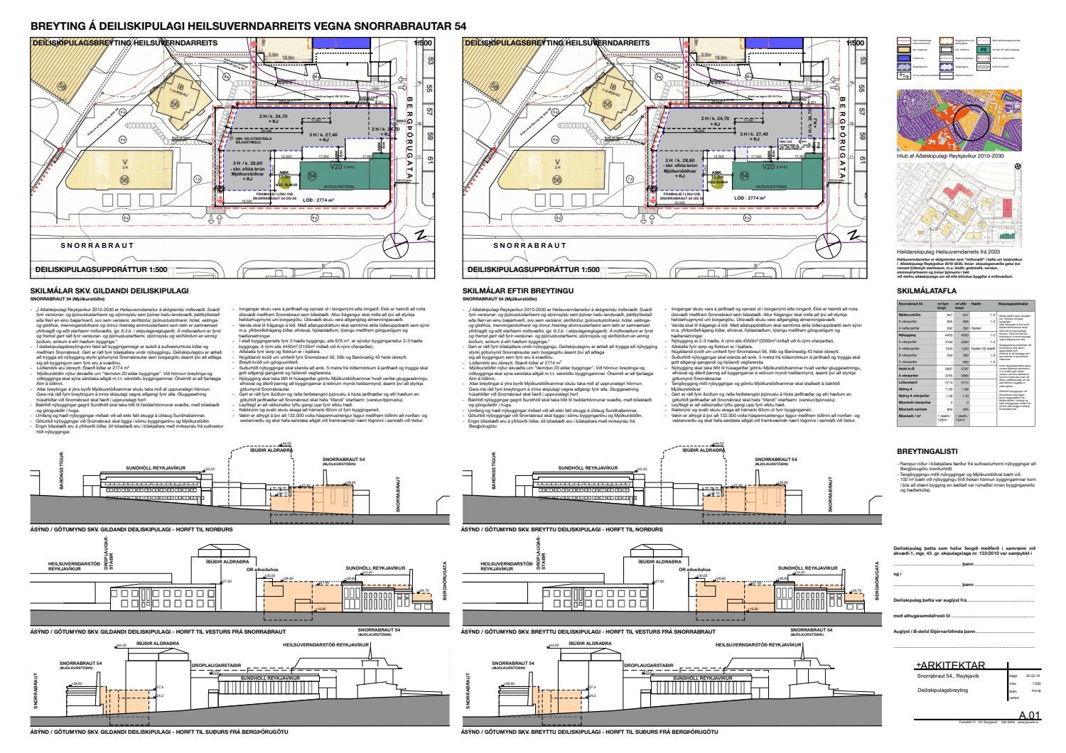 dags. 25. febrúar 2019 um breytingu á deiliskipulagi Heilsuverndarreits vegna lóðarinnar nr. 54 við Snorrabraut. Í breytingunni felst að rampur niður í bílakjallara er færður frá suðvesturhorni nýbyggingar að Bergþórugötu (norðurhlið), tengibyggingu milli nýbyggingar og Mjólkurstöðvar bætt við og 100 fermetrum bætt við nýbyggingu. Einnig er bætt við að færsla á lögnum Veitna vegna framkvæmda er á kostnað lóðarhafa ásamt ákvæði um hornsneiðingu við bílrampa, samkvæmt deiliskipulags- og skýringaruppdr.