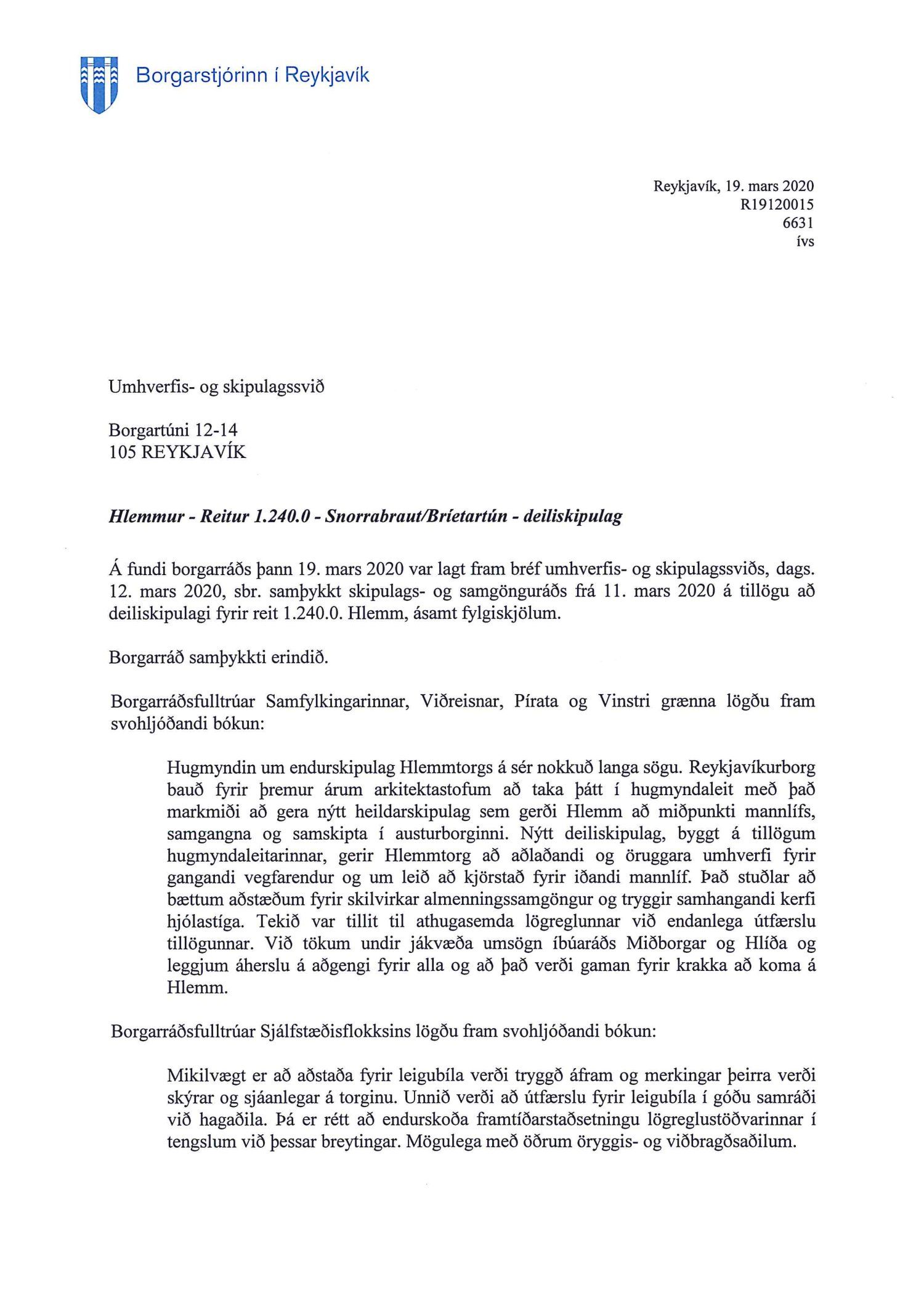 Lagt fram bréf borgarstjóra dags. 19. mars 2020 vegna samþykktar borgarráðs s.d. á tillögu að deiliskipulagi fyrir reit 1.240.0, Hlemm.