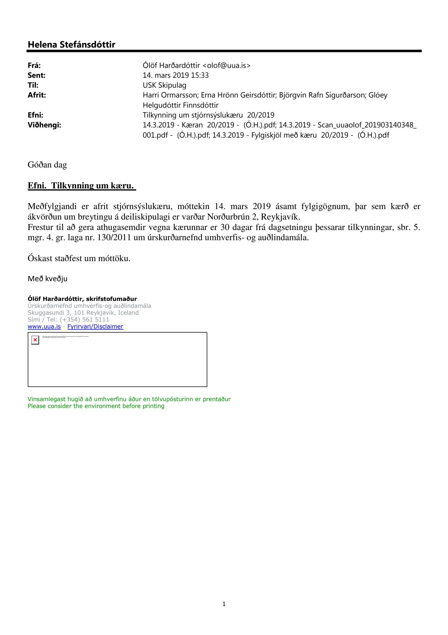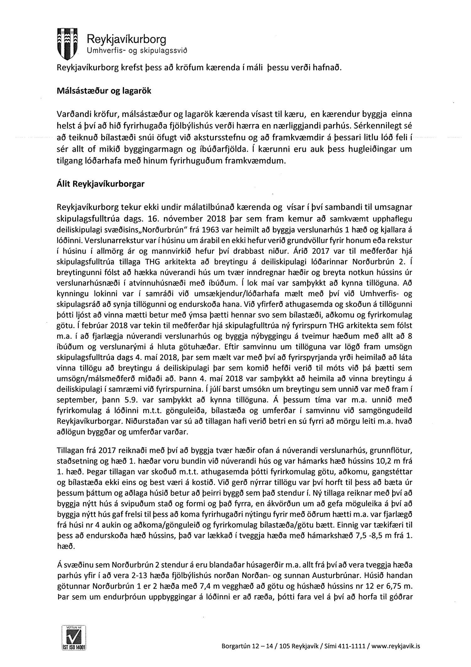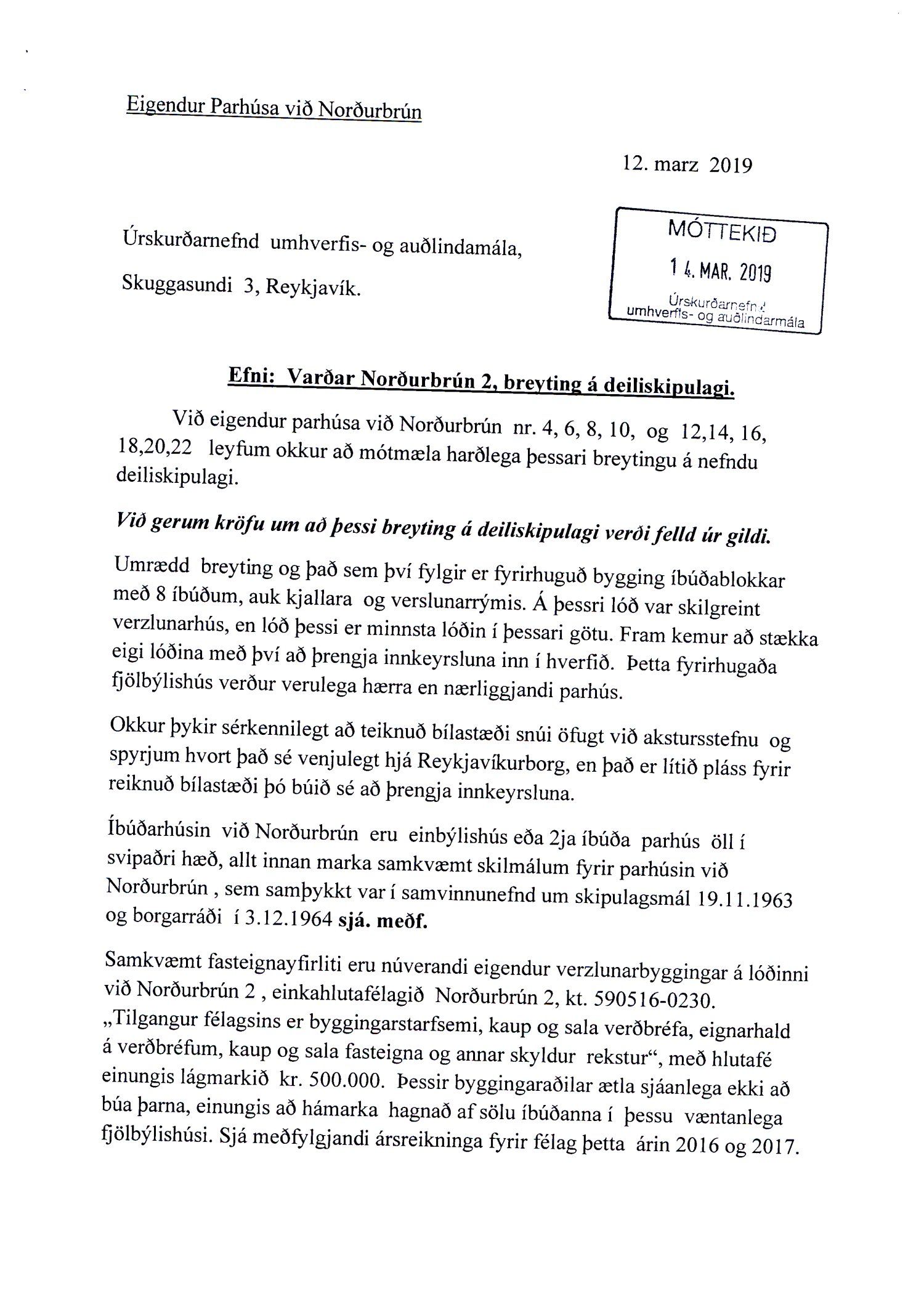Lagt fram erindi úrskurðarnefndar umhverfis- og auðlindamála dags. 14. mars 2019 ásamt kæru dags. 12. mars 2019 þar sem kærð er samþykkt borgarráð frá 7. febrúar 2019 um breytingu á deiliskipulagi lóðarinnar nr. 2 við Norðurbrún. Einnig er lögð fram umsögn skrifstofu sviðsstjóra dags. 6. maí 2019.