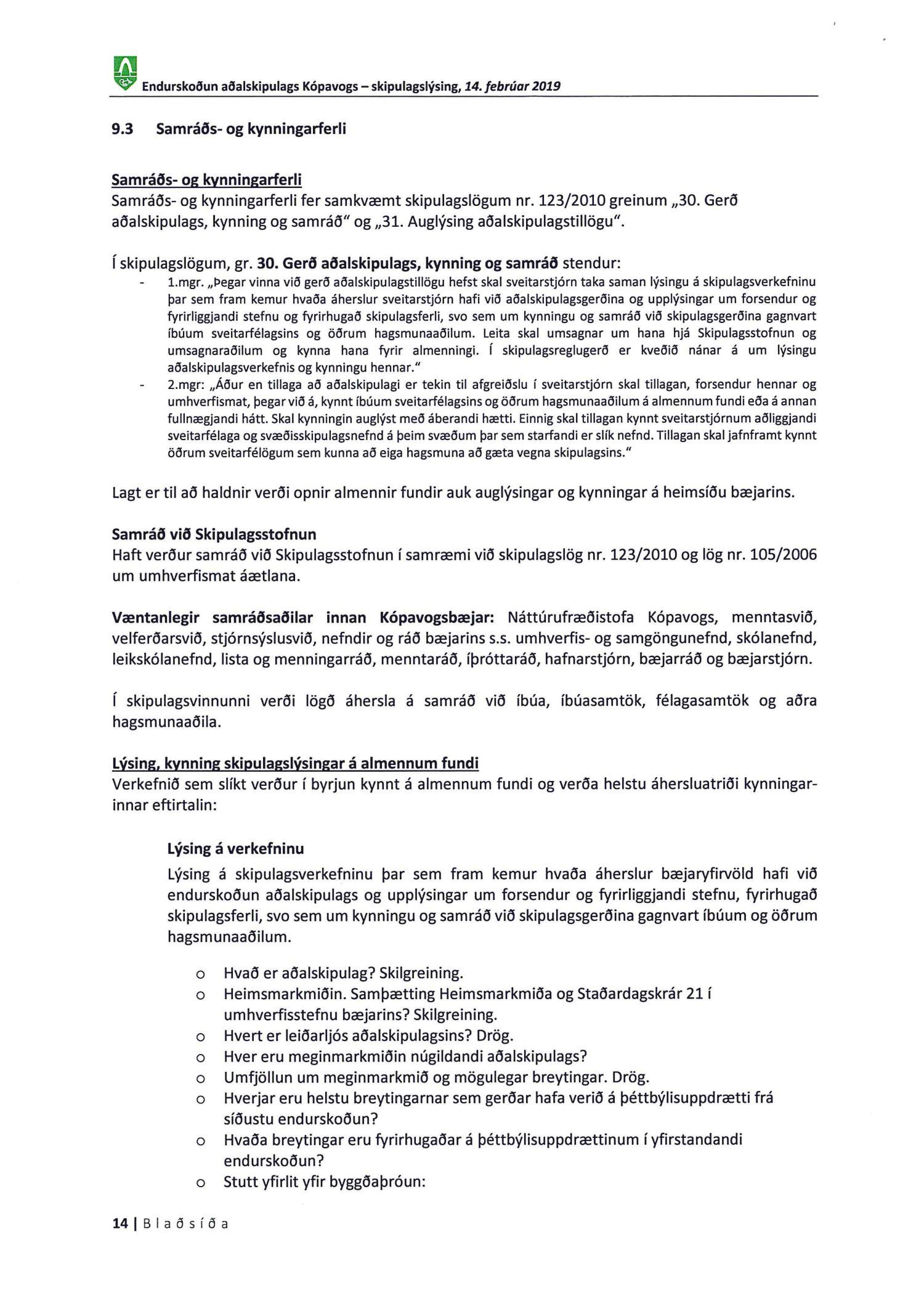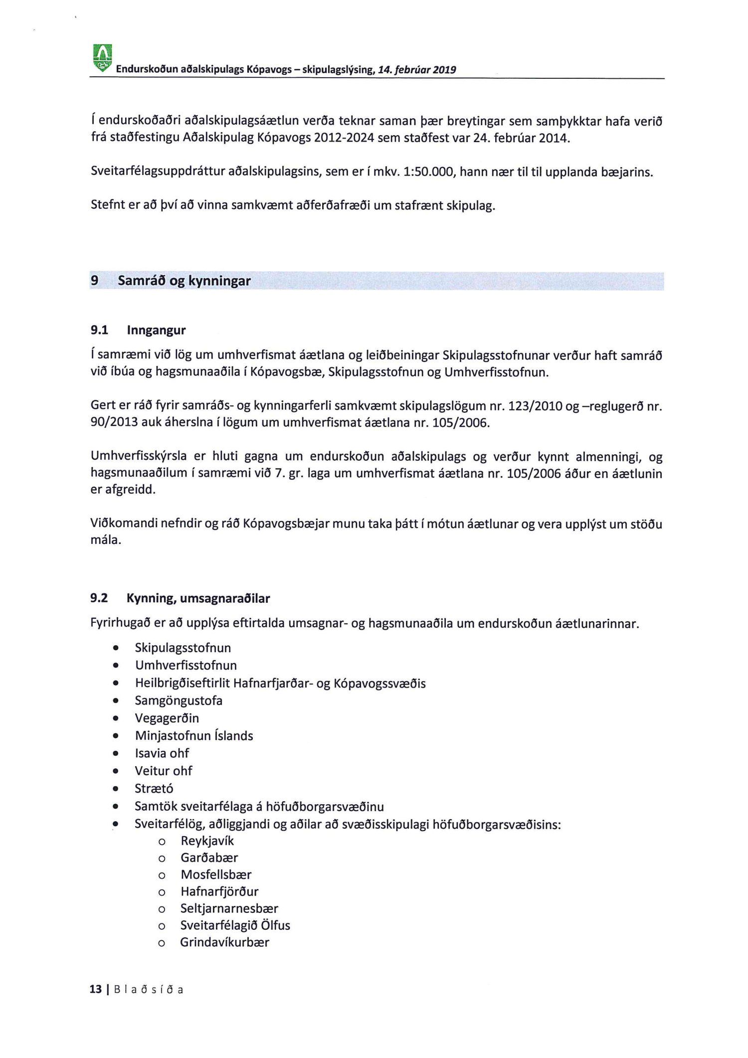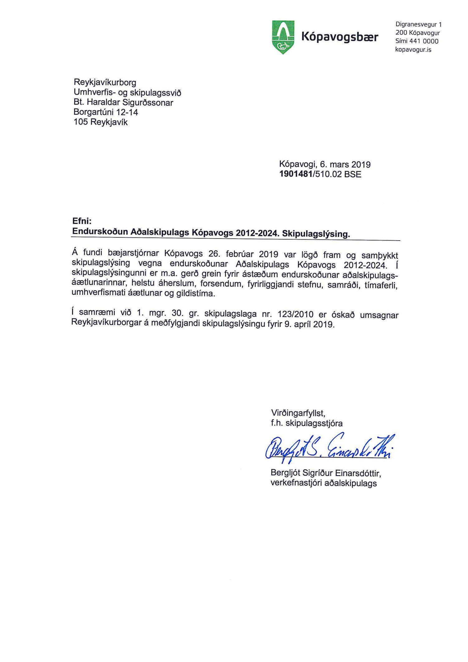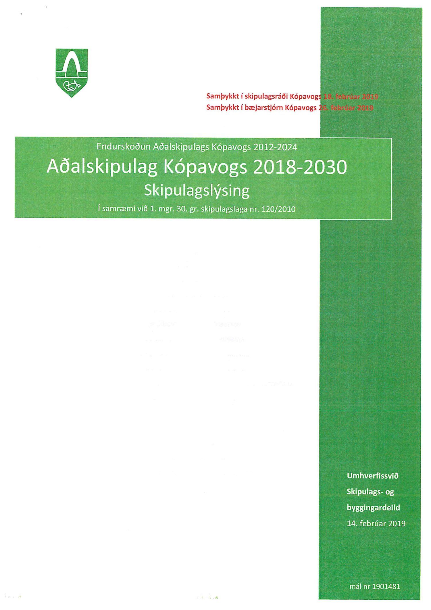 Kynnt bréf Kópavogsbæjar dags. 6. mars 2019 þar sem óskað er eftir umsögn á skipulagslýsingu Kópavogsbæjar dags. 14. febrúar 2019 vegna endurskoðunar Aðalskipulags Kópavogs 2012-2024. Einnig er kynnt umsögn deildarstjóra aðalskipulags dags. 5. apríl 2019.