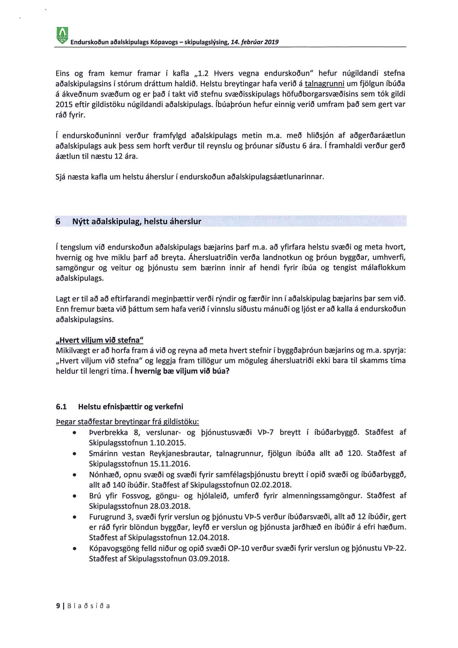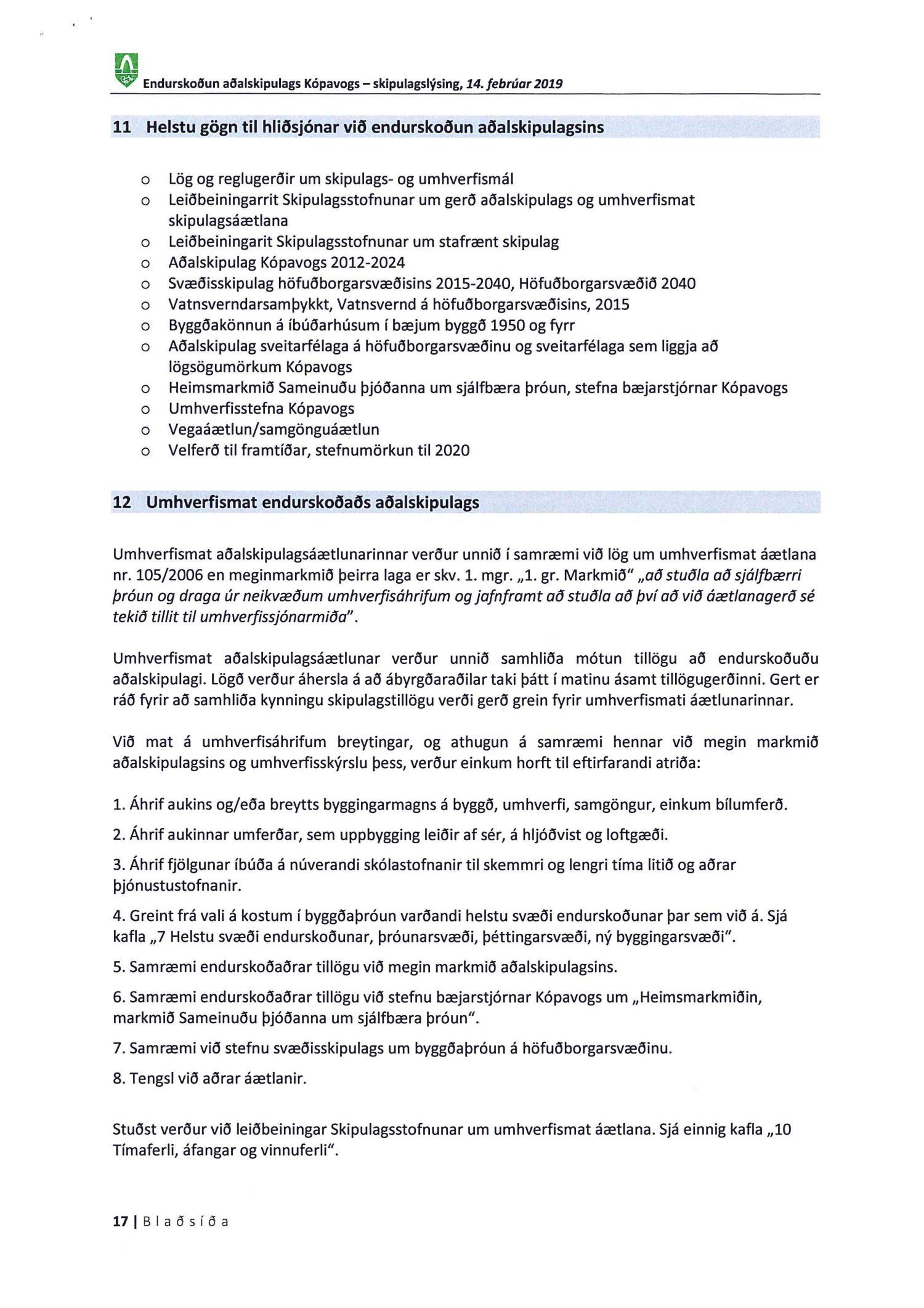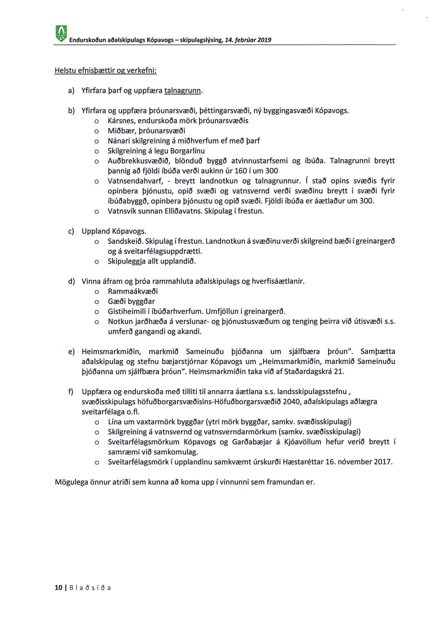 Kynnt bréf Kópavogsbæjar dags. 6. mars 2019 þar sem óskað er eftir umsögn á skipulagslýsingu Kópavogsbæjar dags. 14. febrúar 2019 vegna endurskoðunar Aðalskipulags Kópavogs 2012-2024. Einnig er kynnt umsögn deildarstjóra aðalskipulags dags. 5. apríl 2019.