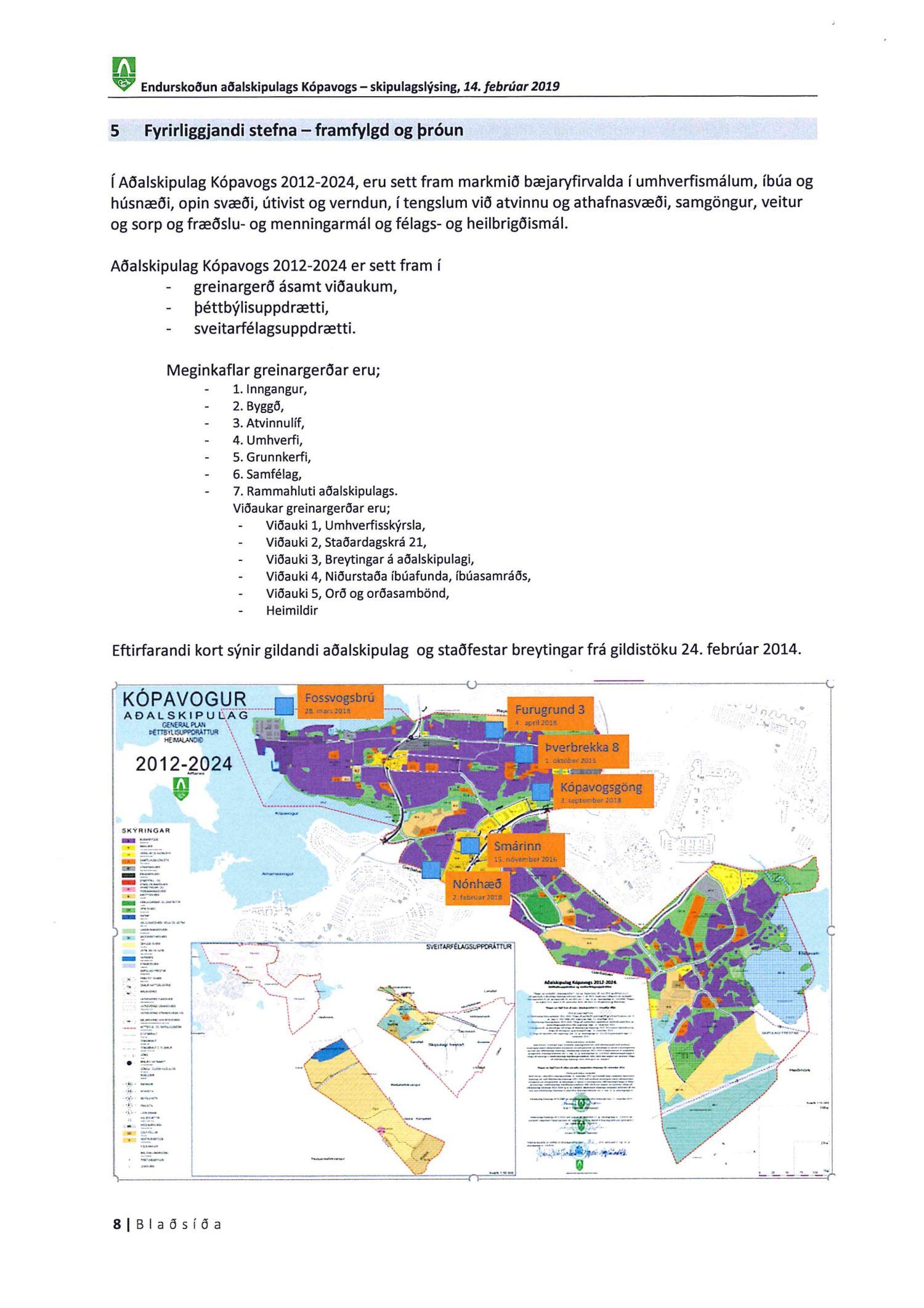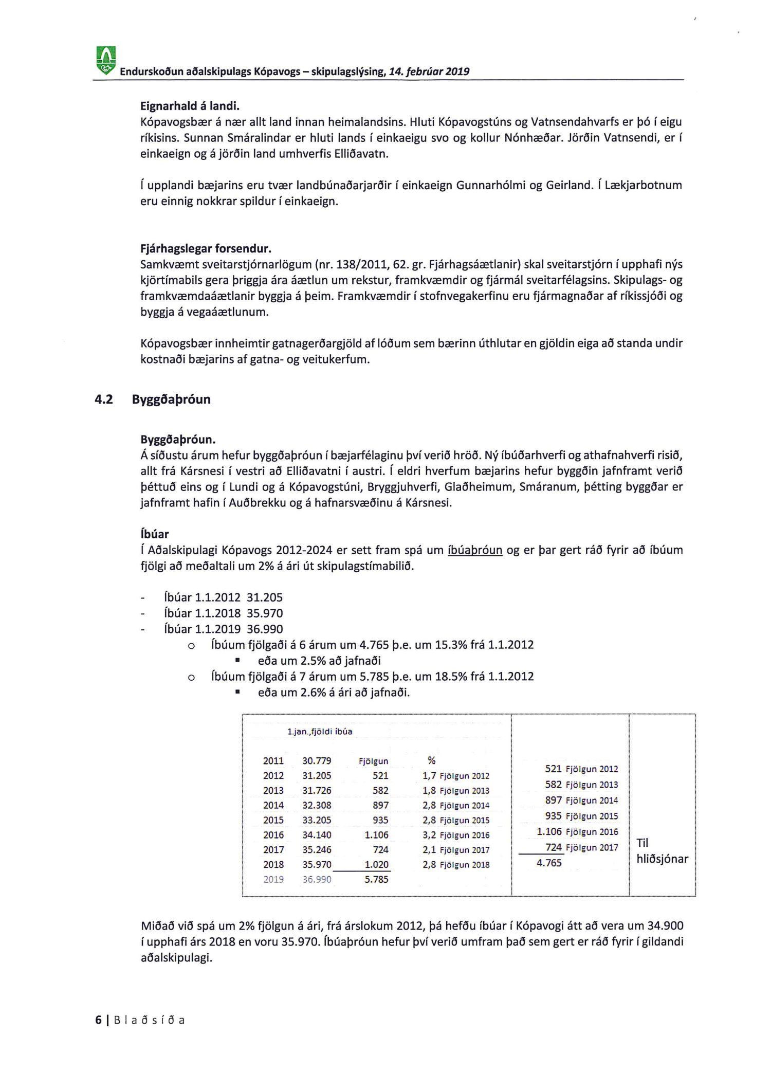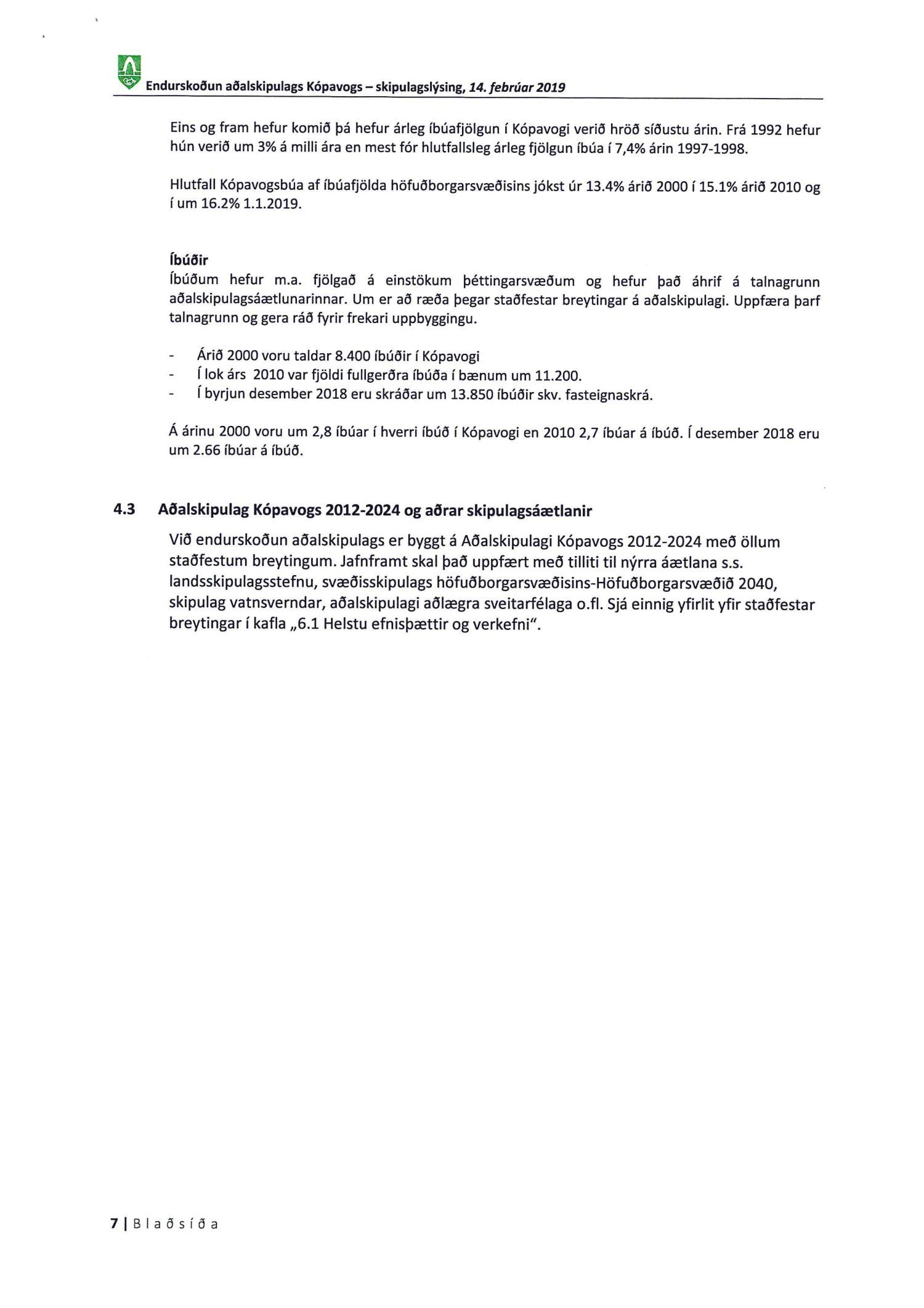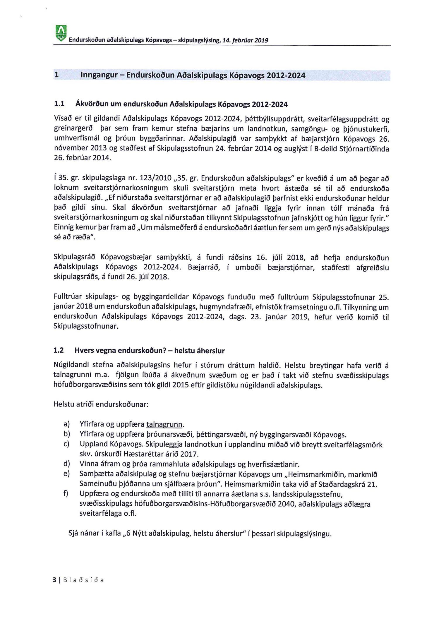 Kynnt bréf Kópavogsbæjar dags. 6. mars 2019 þar sem óskað er eftir umsögn á skipulagslýsingu Kópavogsbæjar dags. 14. febrúar 2019 vegna endurskoðunar Aðalskipulags Kópavogs 2012-2024. Einnig er kynnt umsögn deildarstjóra aðalskipulags dags. 5. apríl 2019.