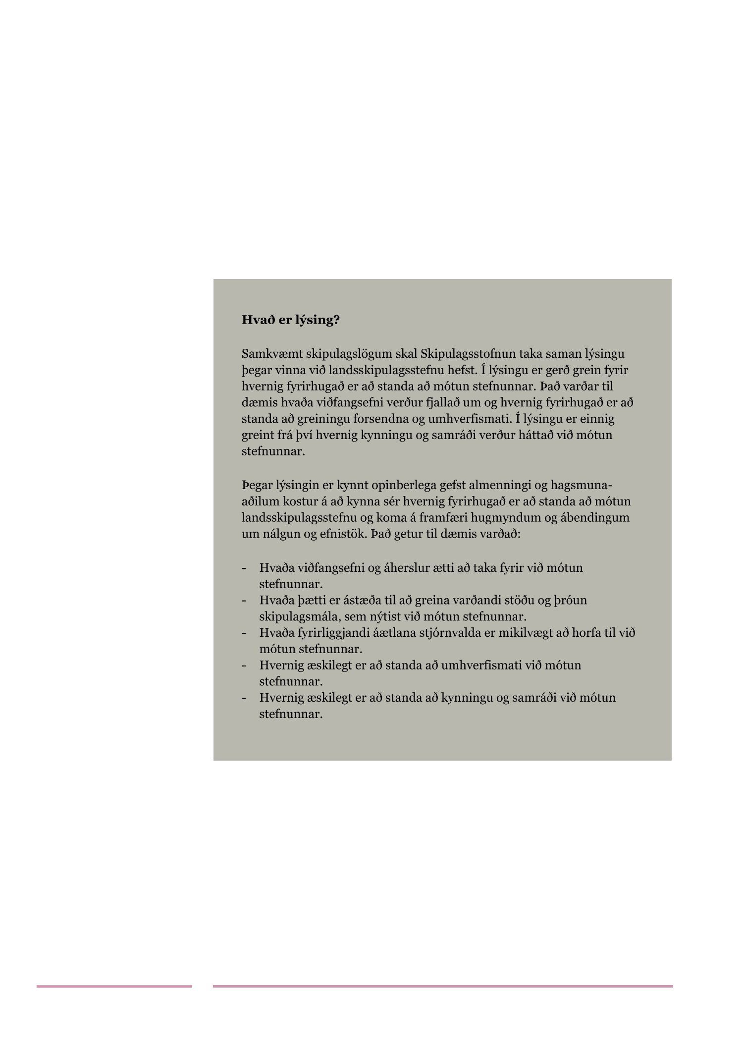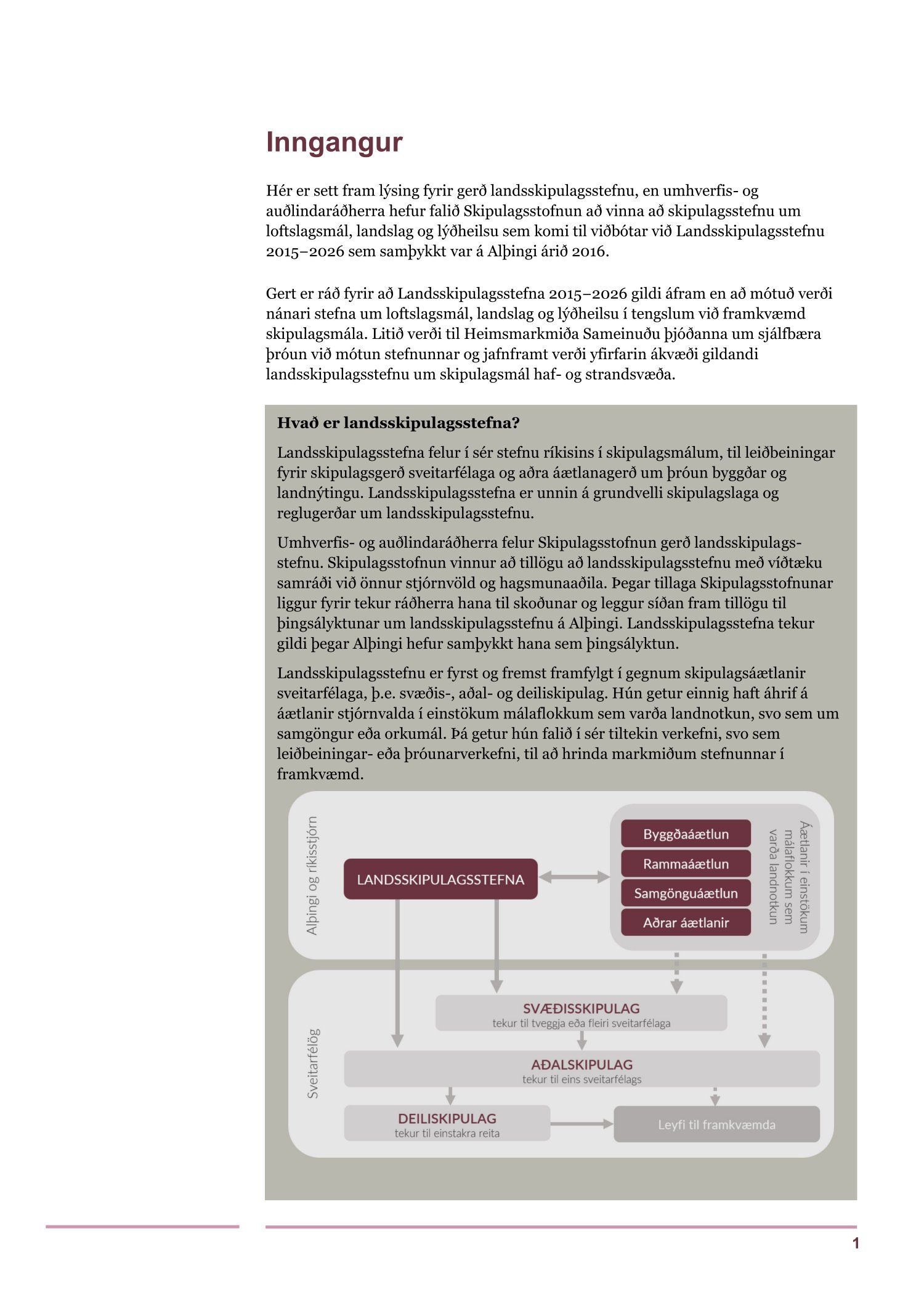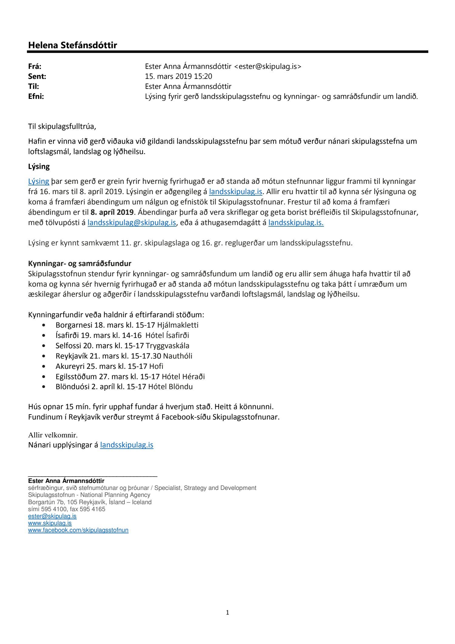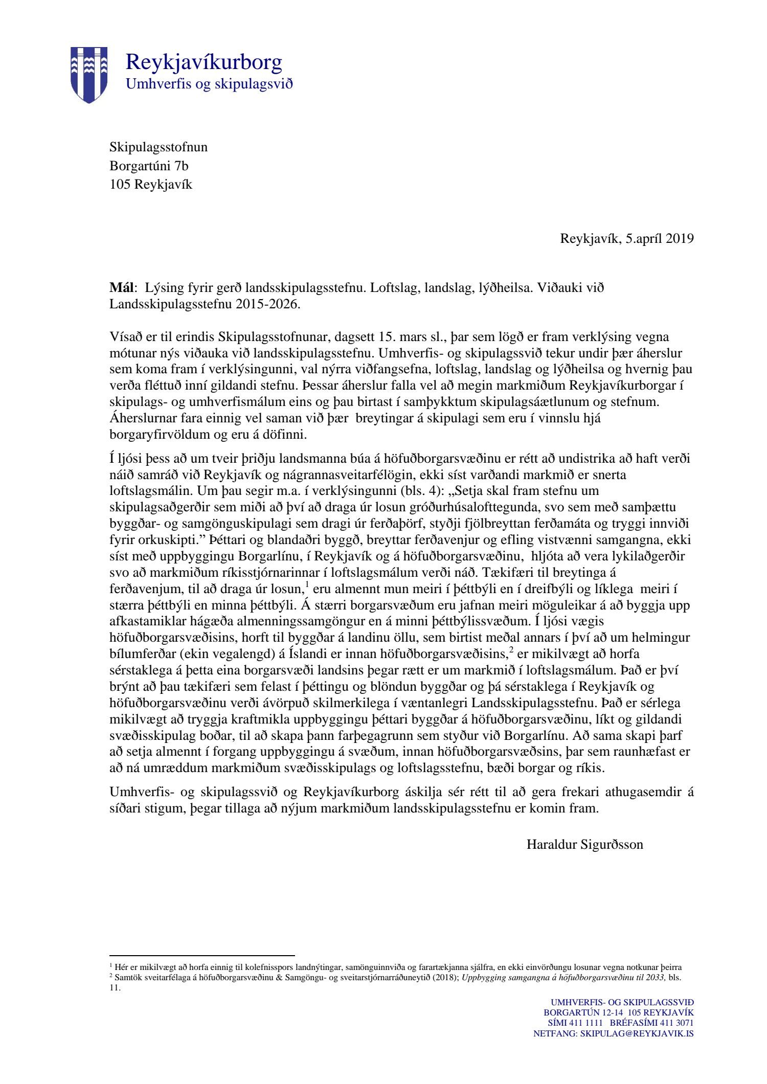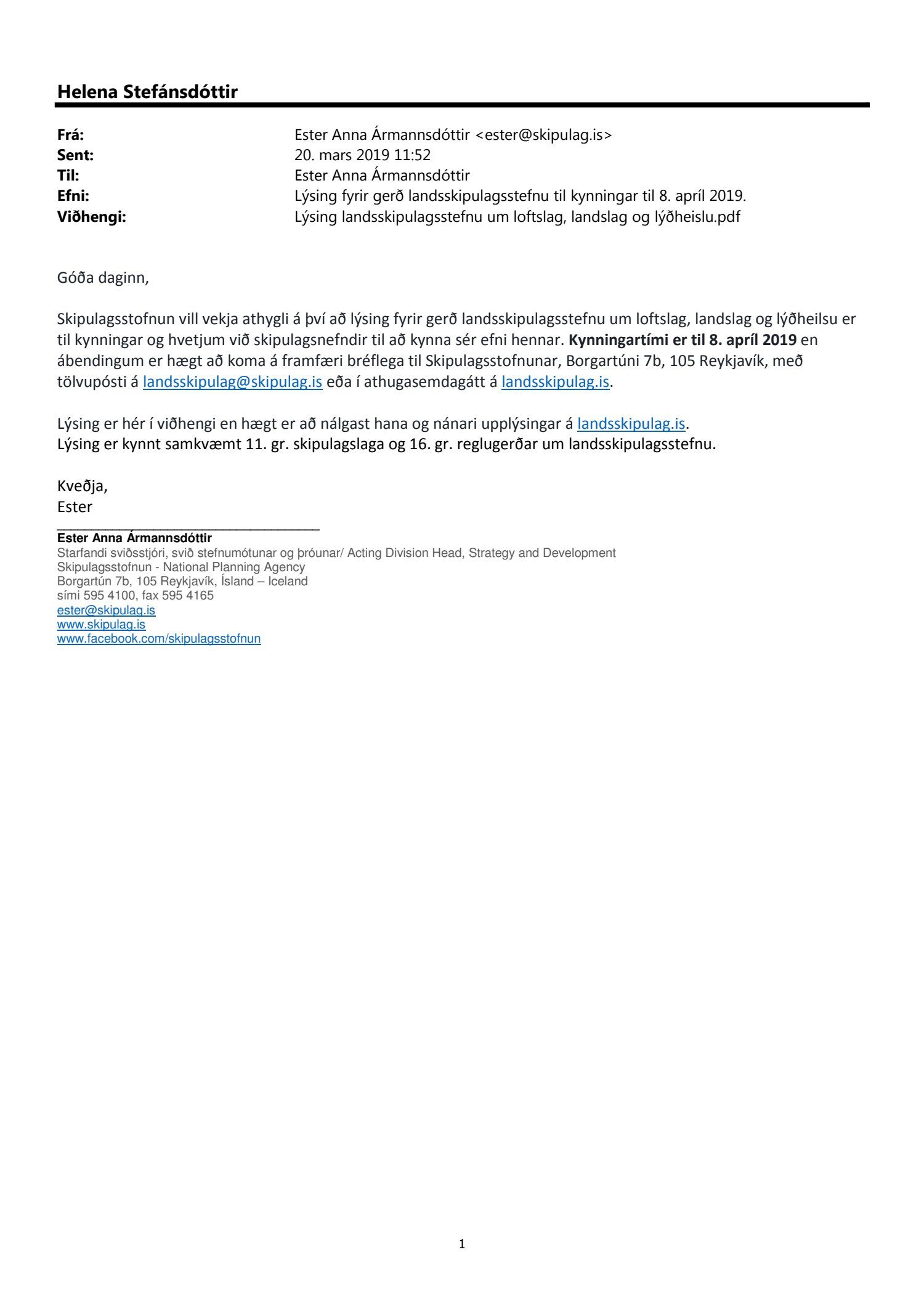 Lagt fram til kynningar erindi Skipulagsstofnunar dags. 15. og 20. mars 2019 þar sem kynnt er lýsing dags. í mars 2019 fyrir gerð Landsskipulagsstefnu. Kynningartími er til 8. apríl 2019. Einnig er kynnt umsögn deildarstjóra aðalskipulags dags. 5. apríl 2019.