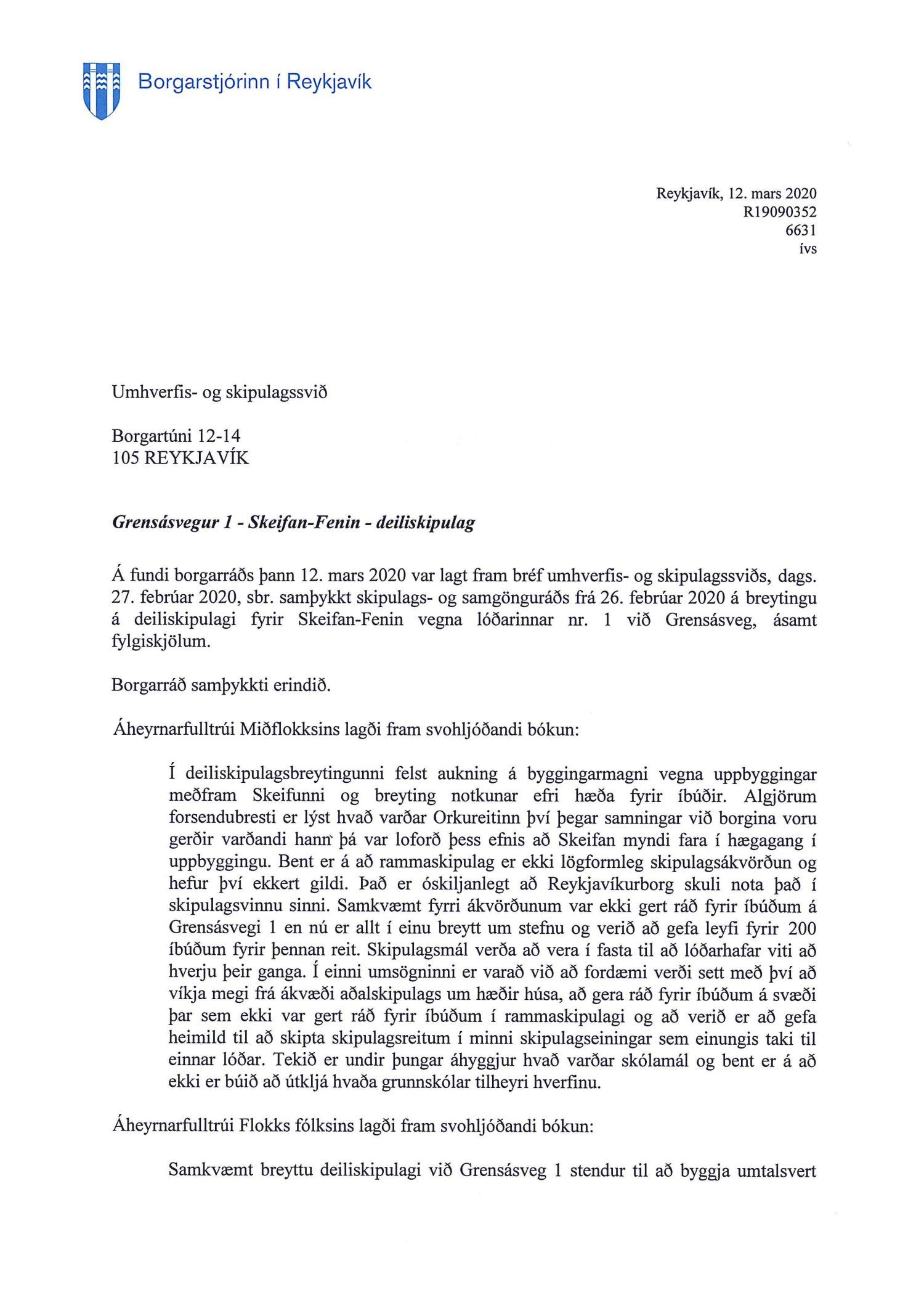 Lagt fram bréf borgarstjóra dags. 12. mars 2020 vegna samþykktar borgarráðs s.d. á tillögu að breytingu á deiliskipulagi fyrir Skeifan/Fenin vegna lóðarinnar nr. 1 við Grensásveg.