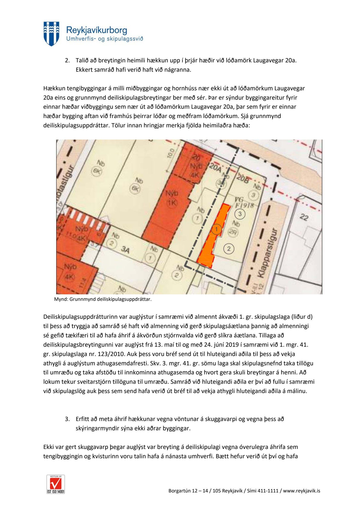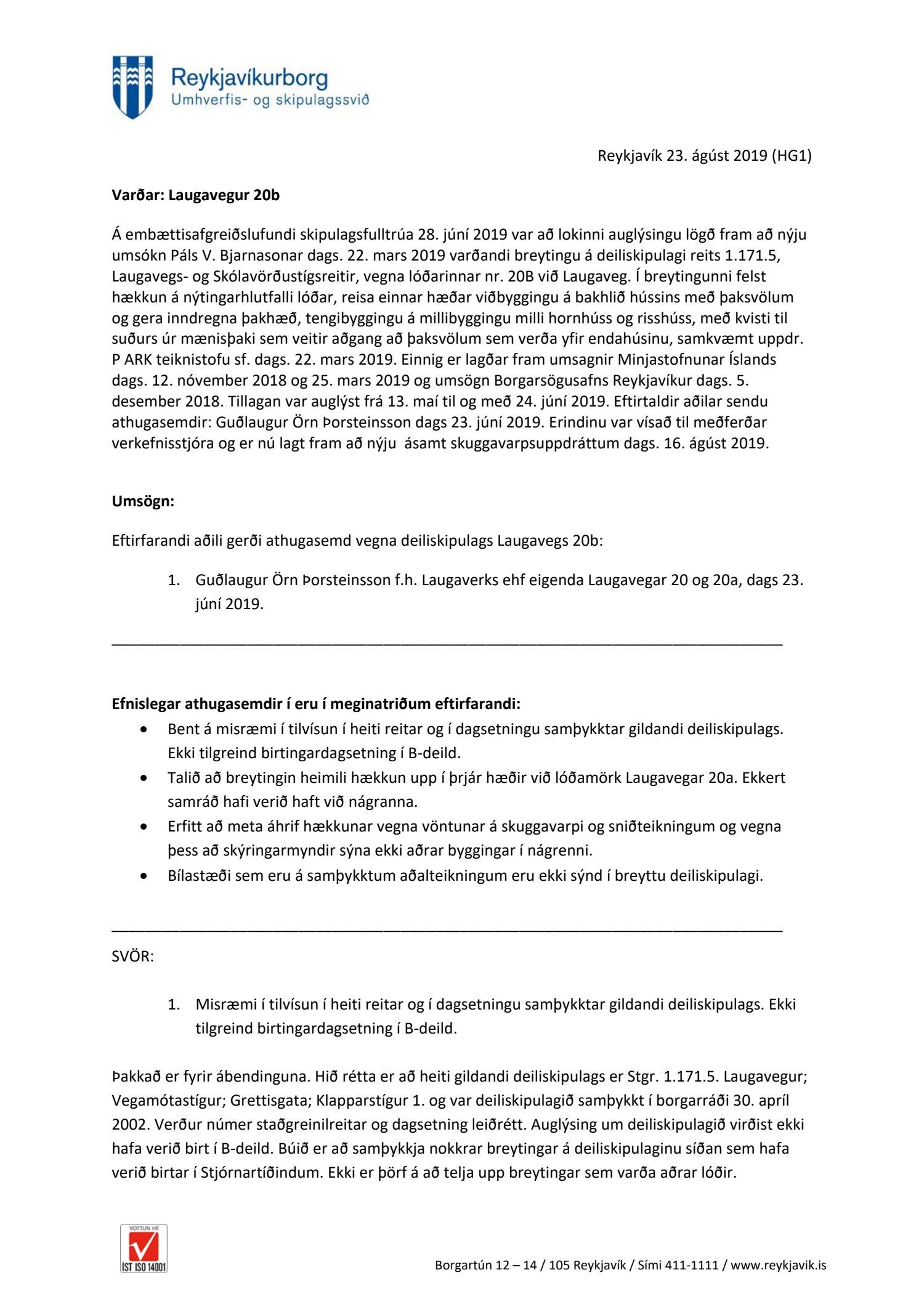 dags. 22. mars 2019, breytt 16. ágúst 2019 ásamt skuggavarpsuppdráttum dags. 16. ágúst 2019. Einnig eru lagðar fram umsagnir Minjastofnunar Íslands dags. 12. nóvember 2018 og 25. mars 2019 og umsögn Borgarsögusafns Reykjavíkur dags. 5. desember 2018. Tillagan var auglýst frá 13. maí til og með 24. júní 2019. Eftirtaldir aðilar sendu athugasemdir: Guðlaugur Örn Þorsteinsson dags 23. júní 2019. Einnig er lögð fram umsögn skipulagsfulltrúa dags. 23. ágúst 2019.