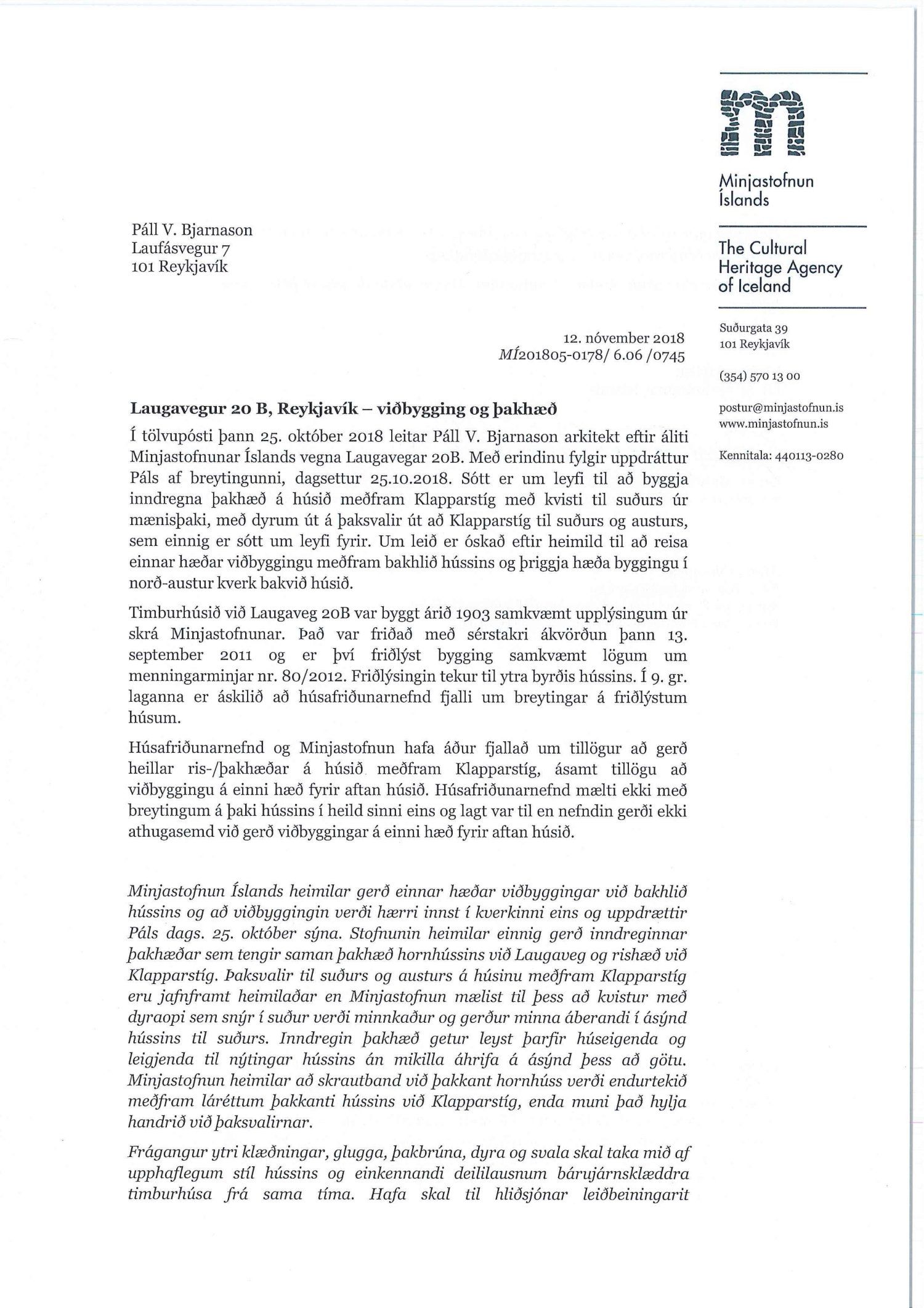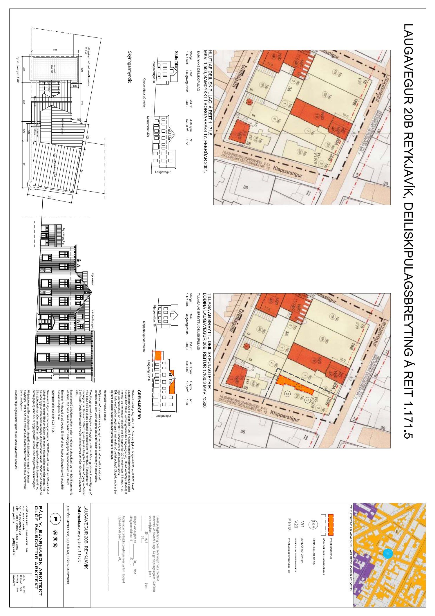 Lögð fram umsókn Páls V. Bjarnasonar dags. 22. mars 2019 varðandi breytingu á deiliskipulagi reits 1.171.5, Laugavegs- og Skólavörðustígsreita, vegna lóðarinnar nr. 20B við Laugaveg. Í breytingunni felst hækkun á nýtingarhlutfalli lóðar, að reisa einnar hæðar viðbyggingu á bakhlið hússins með þaksvölum og gera inndregna þakhæð, tengibyggingu á millibyggingu milli hornhúss og risshúss, með kvisti til suðurs úr mænisþaki sem veitir aðgang að þaksvölum sem verða yfir endahúsinu, samkvæmt uppdr. P