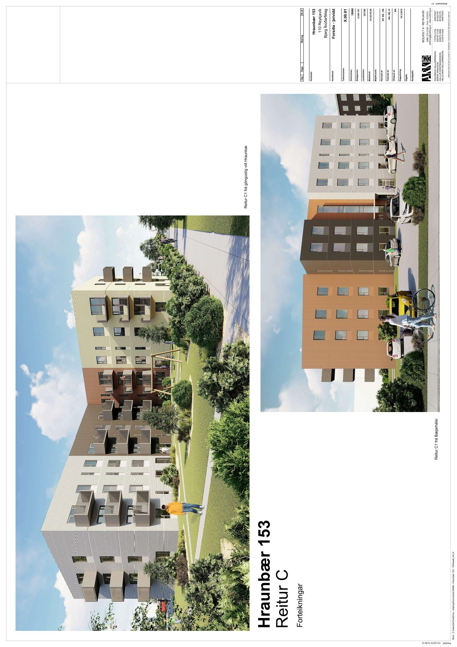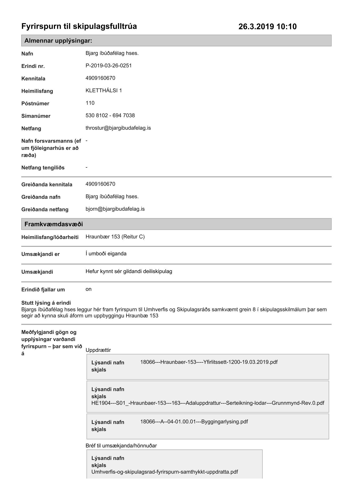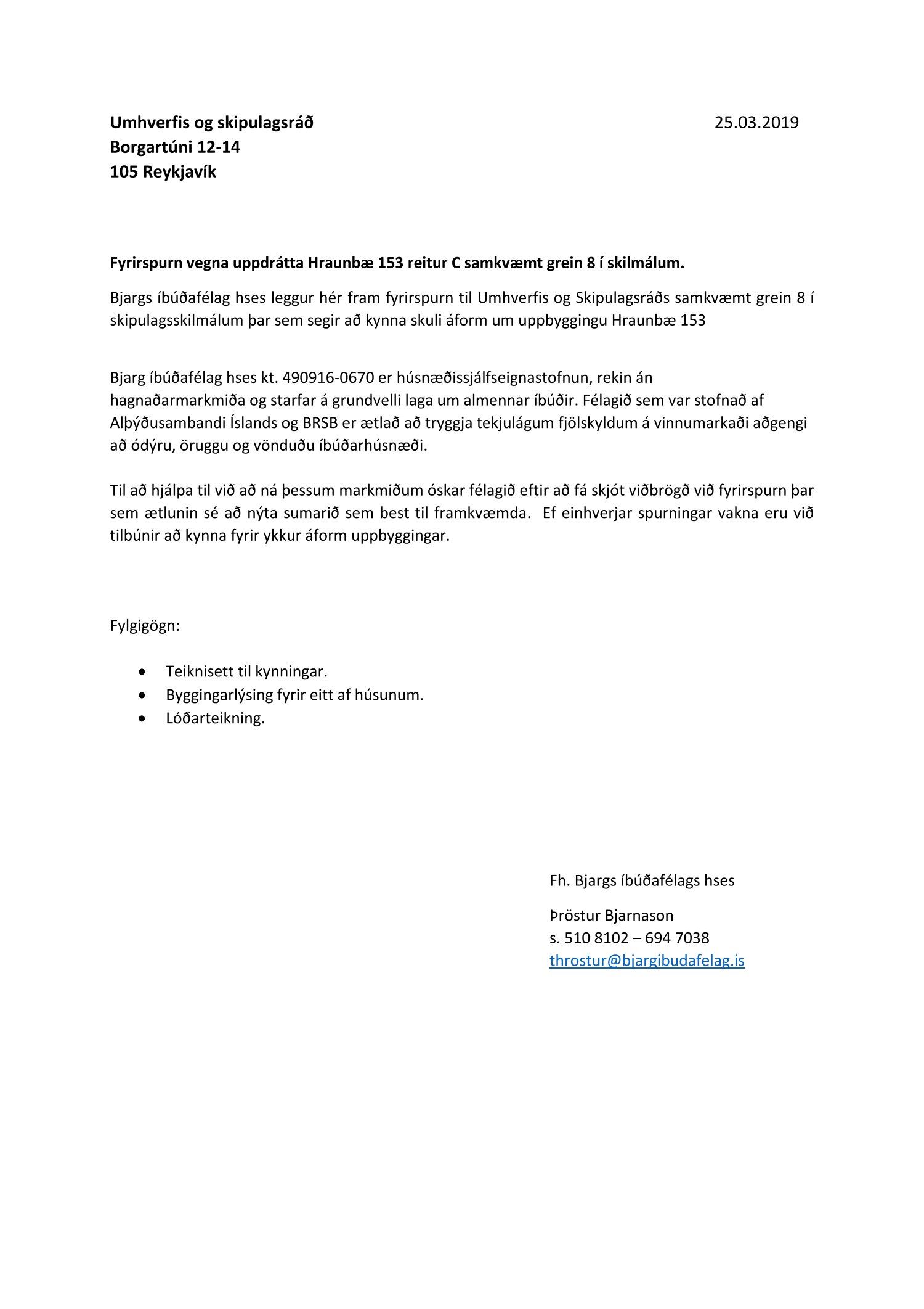 Lögð fram fyrirspurn Bjargs íbúðafélags hses dags. 26. mars 2019 ásamt bréfi dags. 25. mars 2019 varðandi uppbyggingu lóðarinnar nr. 153 við Hraunbæ (reitur C í gildandi deiliskipulagi fyrir Hraunbæ-Bæjarháls), samkvæmt teikningasetti Arkþings ehf. dags. 18. mars 2019. Einnig eru lagðir fram uppdrættir Arkþings ehf. dags. 11. mars 2019 þar sem fram kemur byggingarlýsing og grunnmynd lóðar dags. 11. mars 2019.