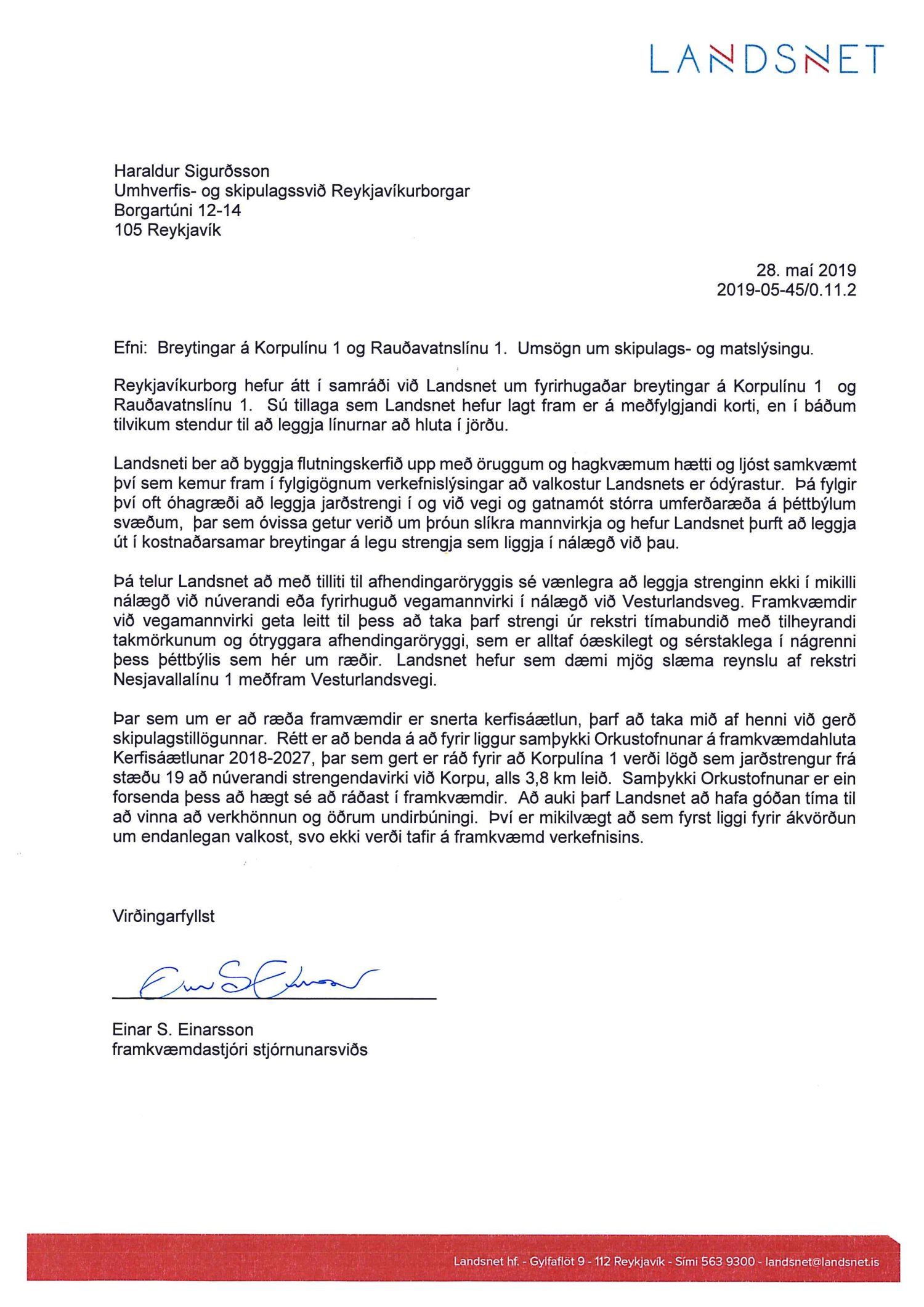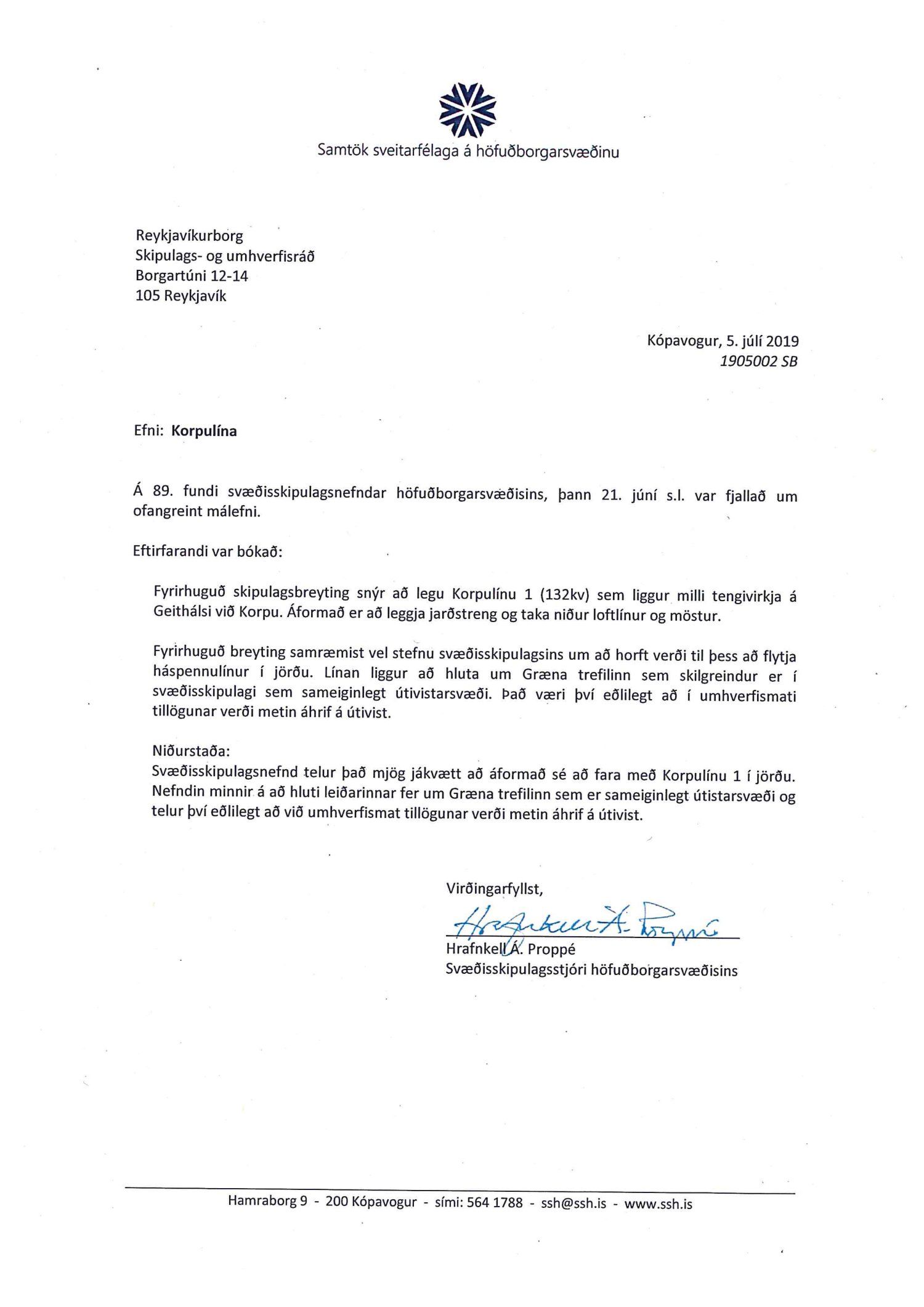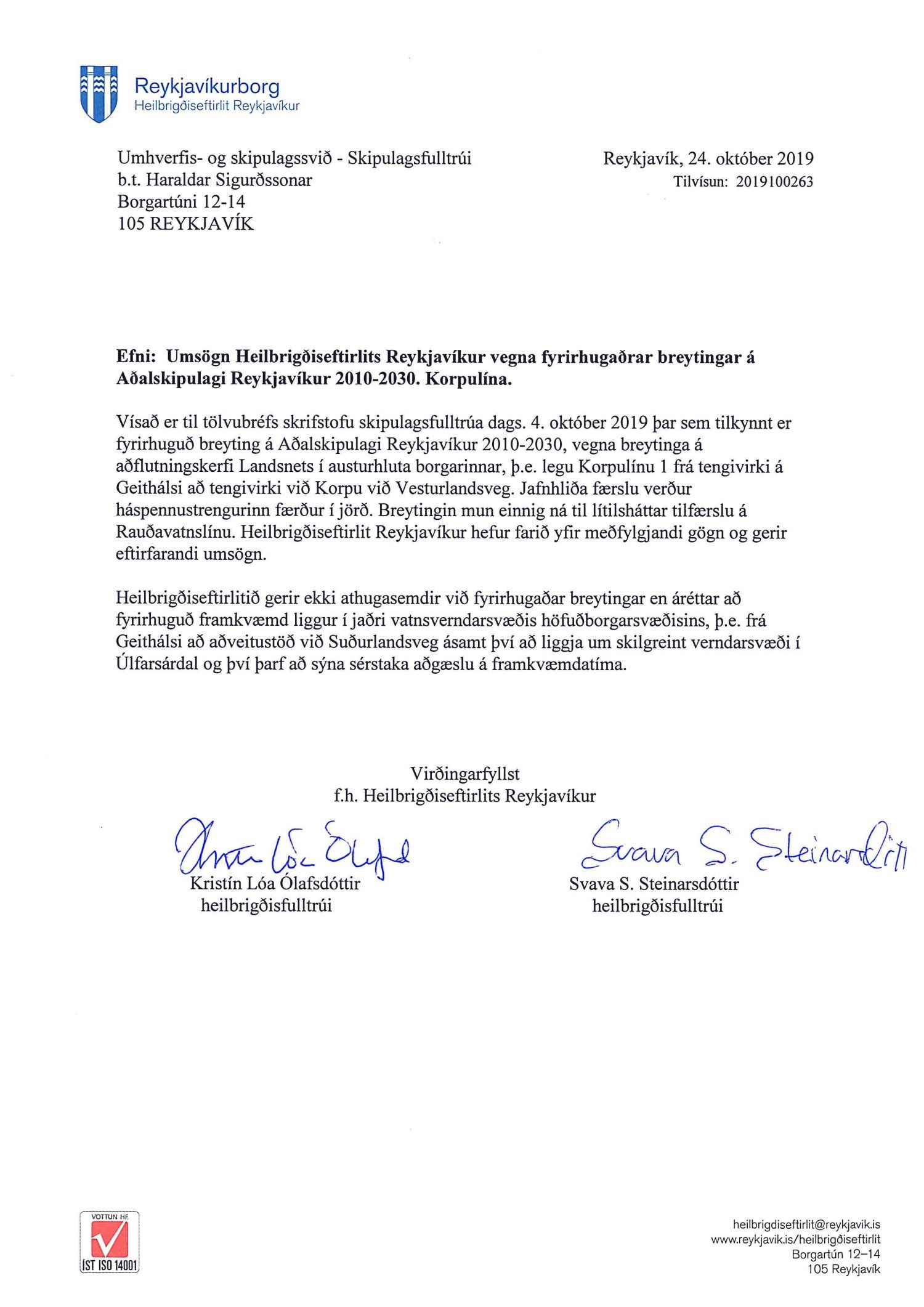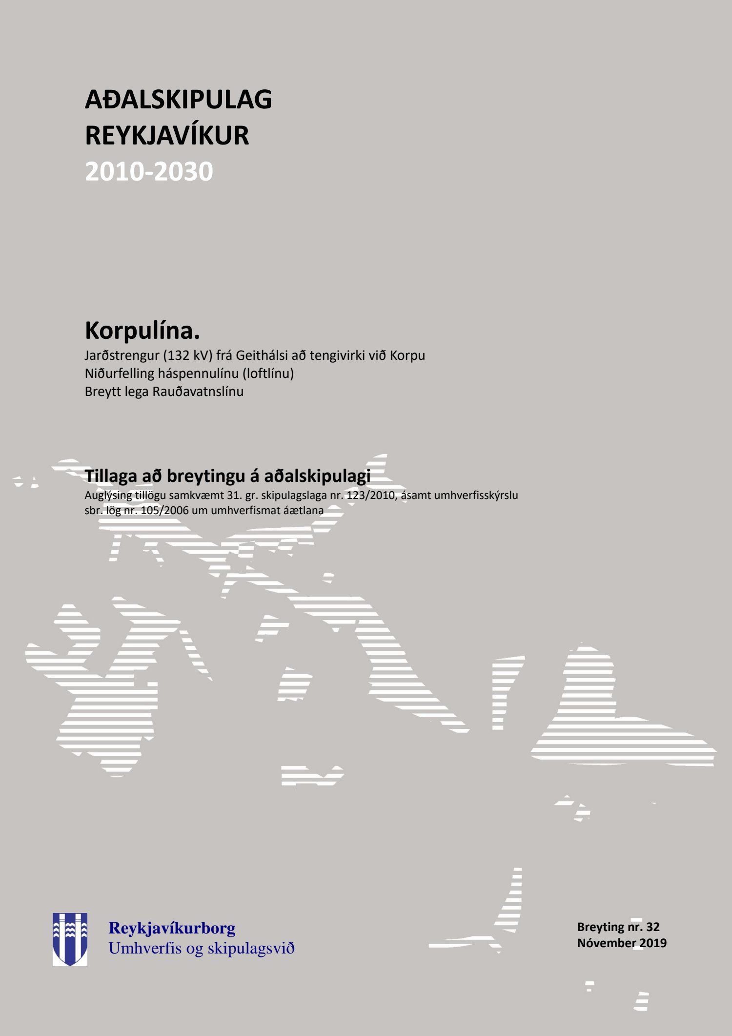 Að lokinn kynningu á drögum að tillögu umhverfis- og skipulagssviðs dags. í september 2019 er lögð fram tillaga umhverfis- og skipulagssviðs dags. í nóvember 2019 að breytingu á Aðalskipulagi Reykjavíkur 2010-2030. Tillaga að breytingu nær annarsvegar til legu Korpulínu 1 milli tengivirkisins við Geitháls að tengivirki Korpu við Vesturlandsveg og hinsvegar til lítilsháttar breytingar á legu Rauðavatnslínu 1, frá Geithálsi að aðveitustöð við Suðurlandsveg. Einnig er lögð fram umhverfisskýrsla dags. september 2019. Eftirtaldar stofnanir sendu umsagnir vegna kynningar á drögum á tillögu umhverfis- og skipulagssviðs: Mosfellsbær dags. 11. október 2019, Heilbrigðiseftirlit Reykjavíkur dags. 24. október 2019 og Garðabær dags. 25. október 2019.