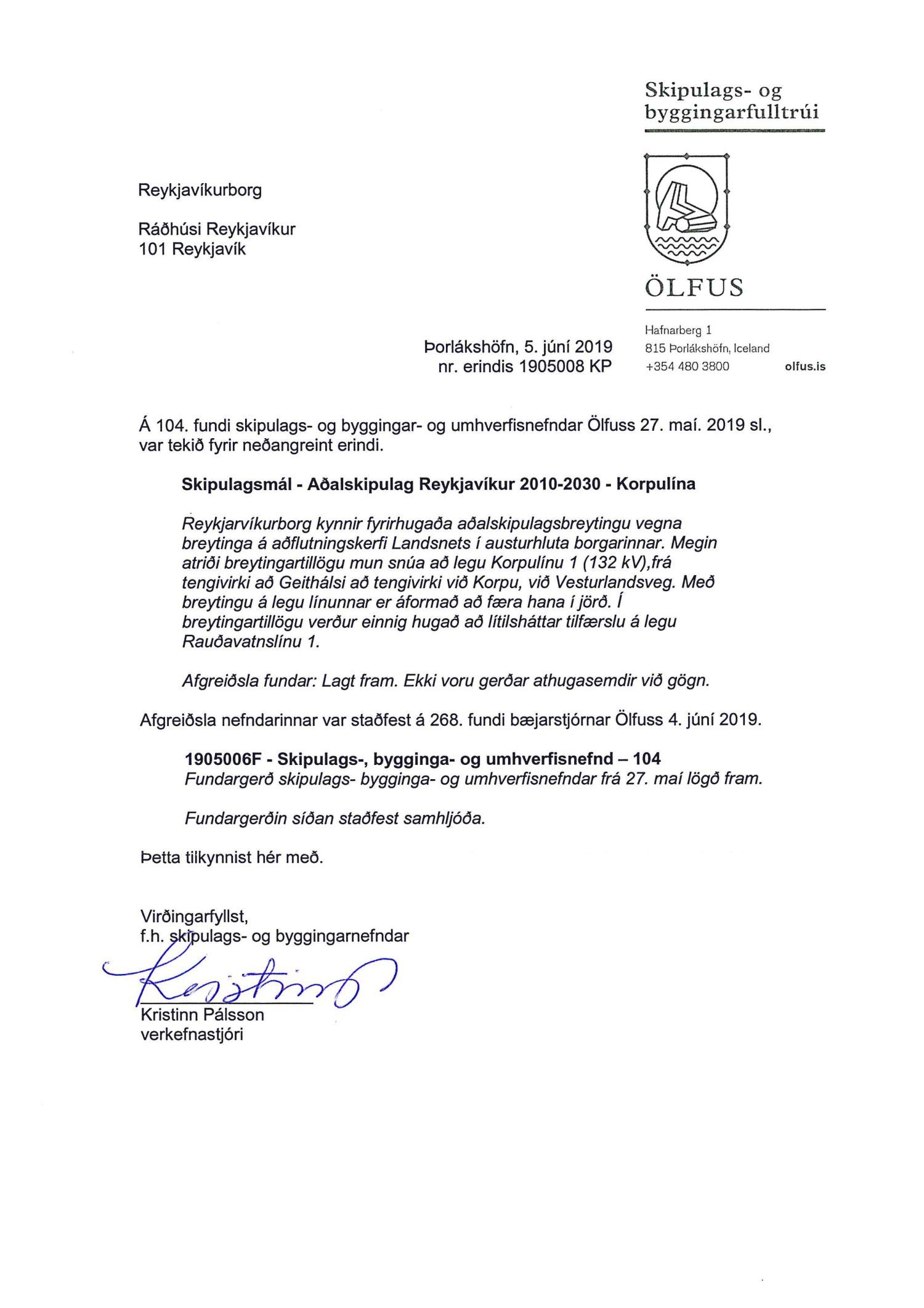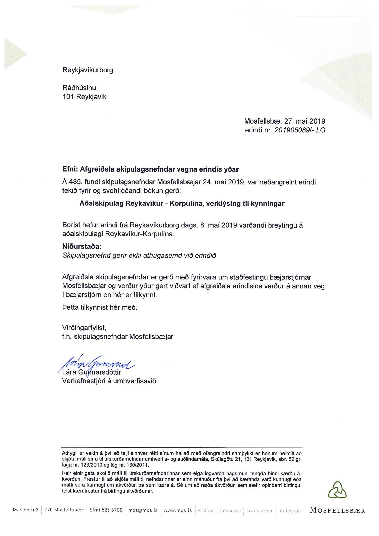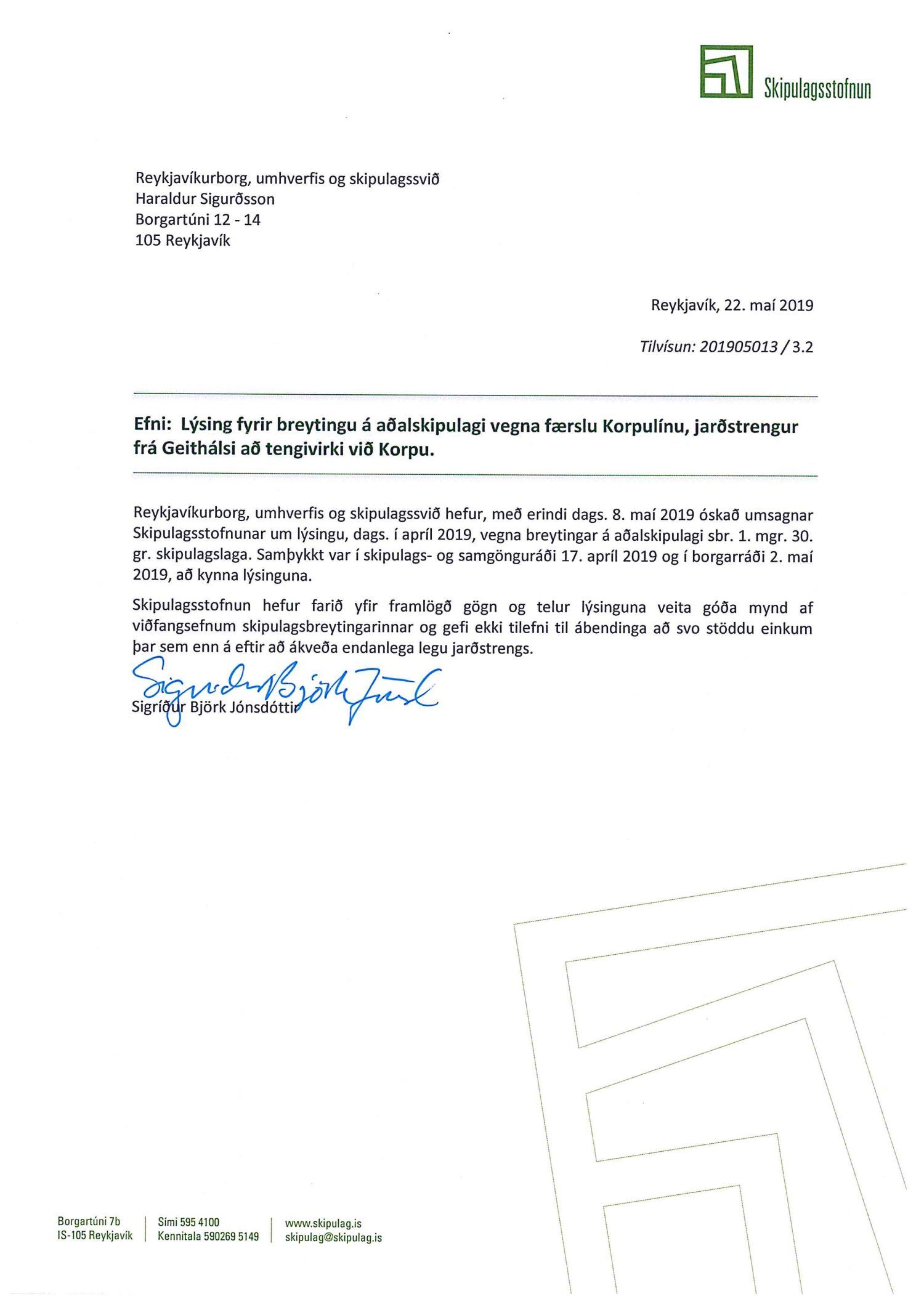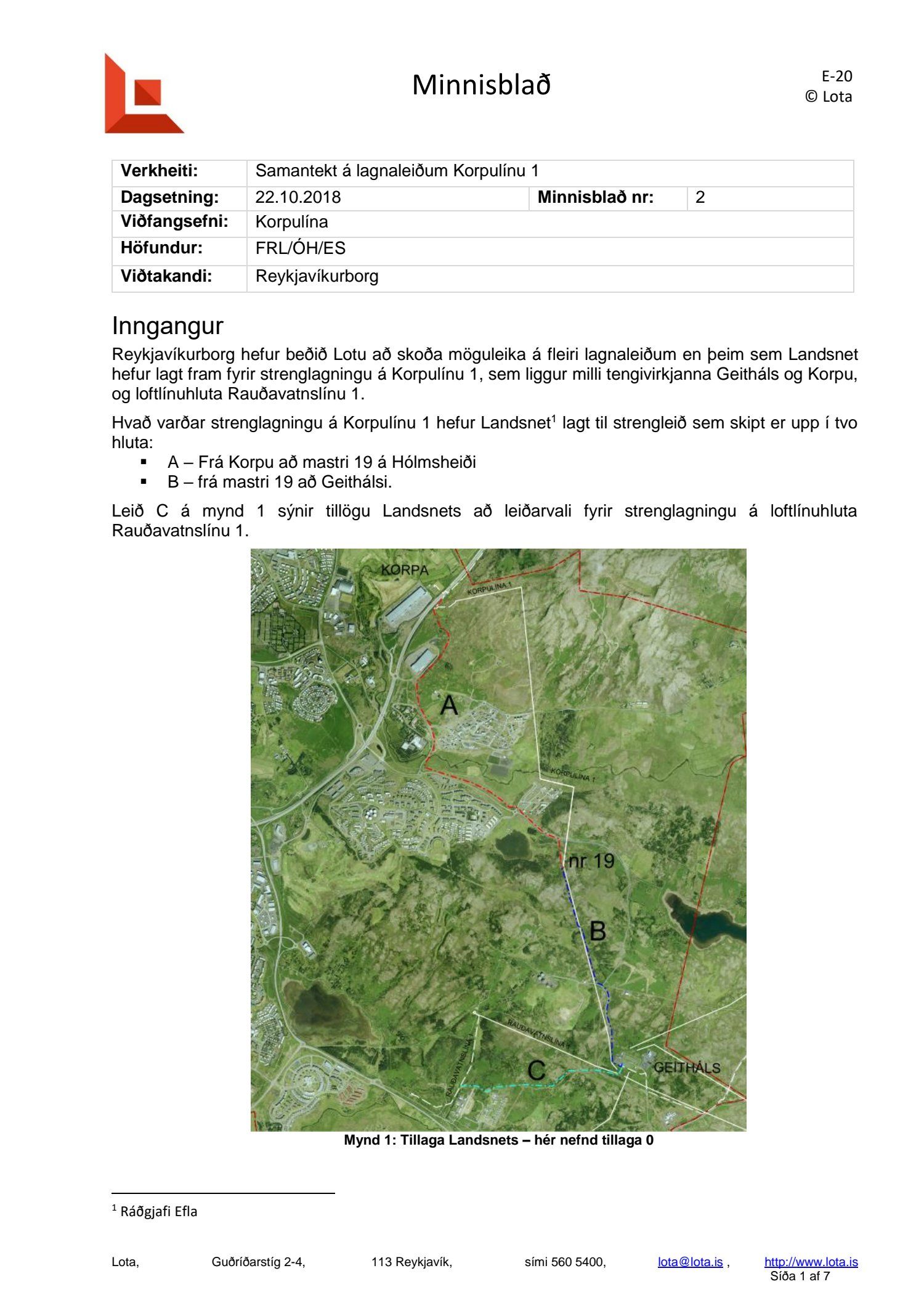Að lokinn kynningu á drögum að tillögu umhverfis- og skipulagssviðs dags. í september 2019 er lögð fram tillaga umhverfis- og skipulagssviðs dags. í nóvember 2019 að breytingu á Aðalskipulagi Reykjavíkur 2010-2030. Tillaga að breytingu nær annarsvegar til legu Korpulínu 1 milli tengivirkisins við Geitháls að tengivirki Korpu við Vesturlandsveg og hinsvegar til lítilsháttar breytingar á legu Rauðavatnslínu 1, frá Geithálsi að aðveitustöð við Suðurlandsveg. Einnig er lögð fram umhverfisskýrsla dags. september 2019. Eftirtaldar stofnanir sendu umsagnir vegna kynningar á drögum á tillögu umhverfis- og skipulagssviðs: Mosfellsbær dags. 11. október 2019, Heilbrigðiseftirlit Reykjavíkur dags. 24. október 2019 og Garðabær dags. 25. október 2019.