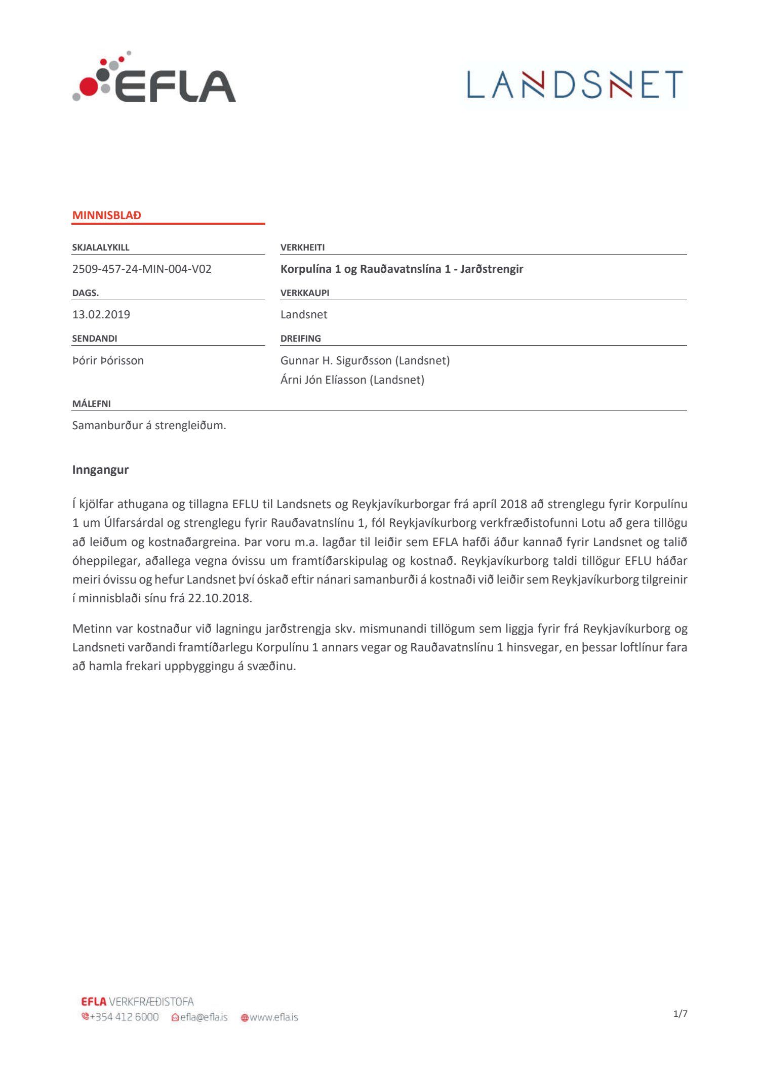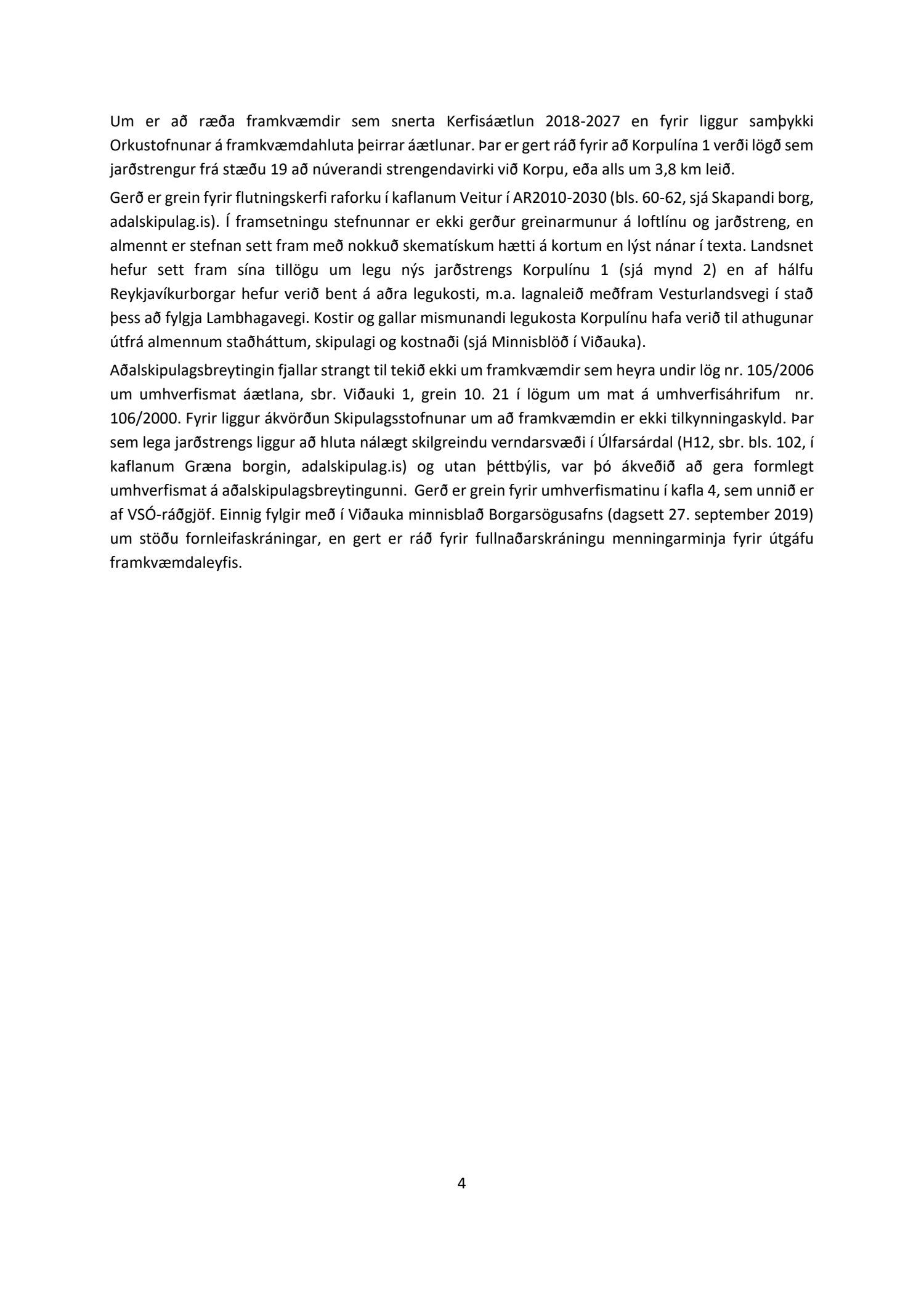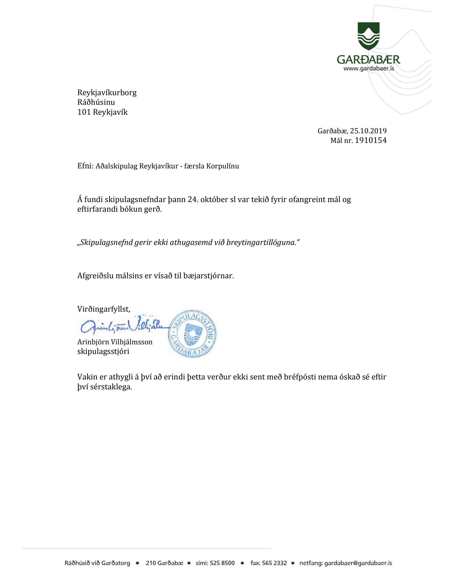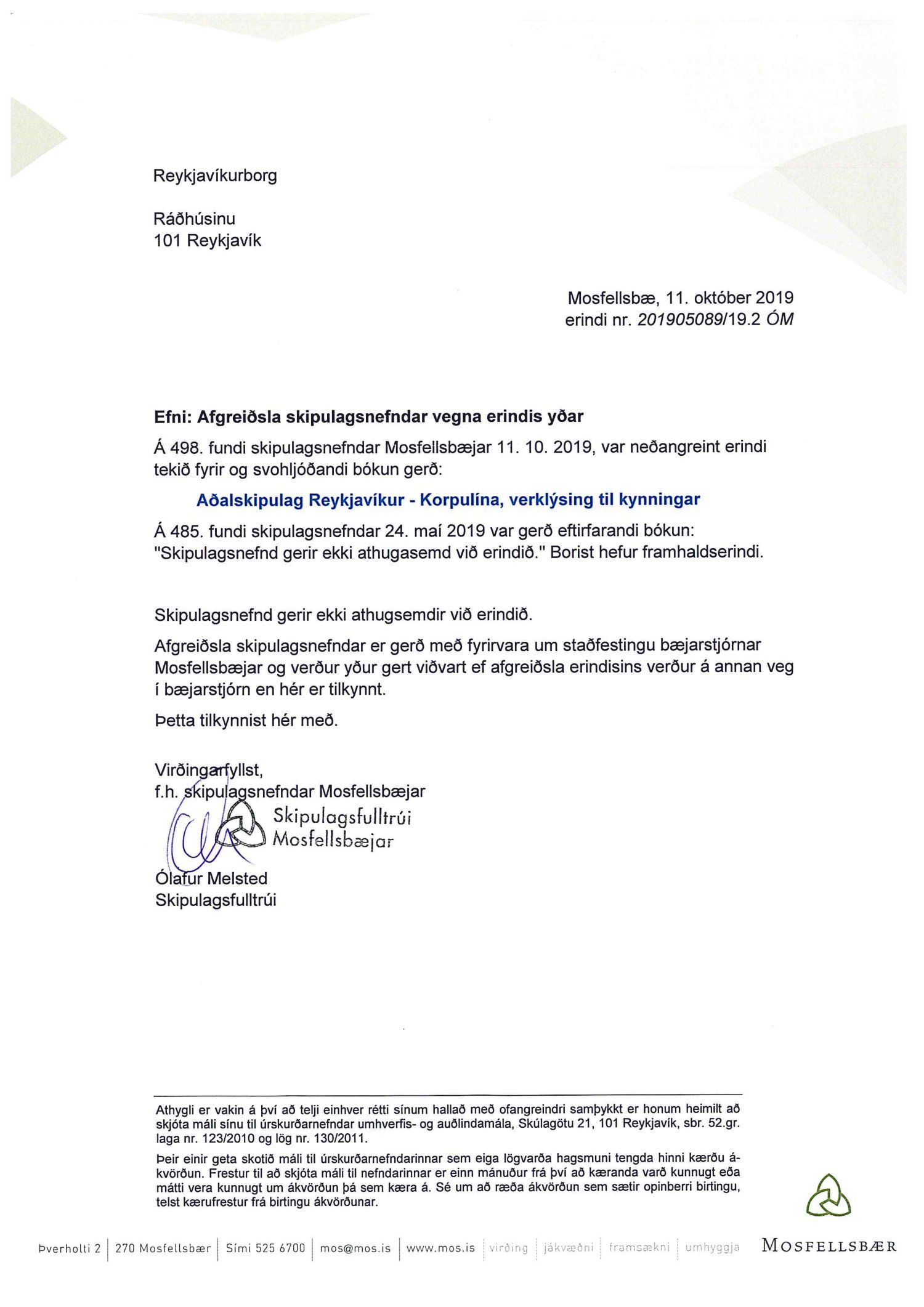Að lokinn kynningu á drögum að tillögu umhverfis- og skipulagssviðs dags. í september 2019 er lögð fram tillaga umhverfis- og skipulagssviðs dags. í nóvember 2019 að breytingu á Aðalskipulagi Reykjavíkur 2010-2030. Tillaga að breytingu nær annarsvegar til legu Korpulínu 1 milli tengivirkisins við Geitháls að tengivirki Korpu við Vesturlandsveg og hinsvegar til lítilsháttar breytingar á legu Rauðavatnslínu 1, frá Geithálsi að aðveitustöð við Suðurlandsveg. Einnig er lögð fram umhverfisskýrsla dags. september 2019. Eftirtaldar stofnanir sendu umsagnir vegna kynningar á drögum á tillögu umhverfis- og skipulagssviðs: Mosfellsbær dags. 11. október 2019, Heilbrigðiseftirlit Reykjavíkur dags. 24. október 2019 og Garðabær dags. 25. október 2019.