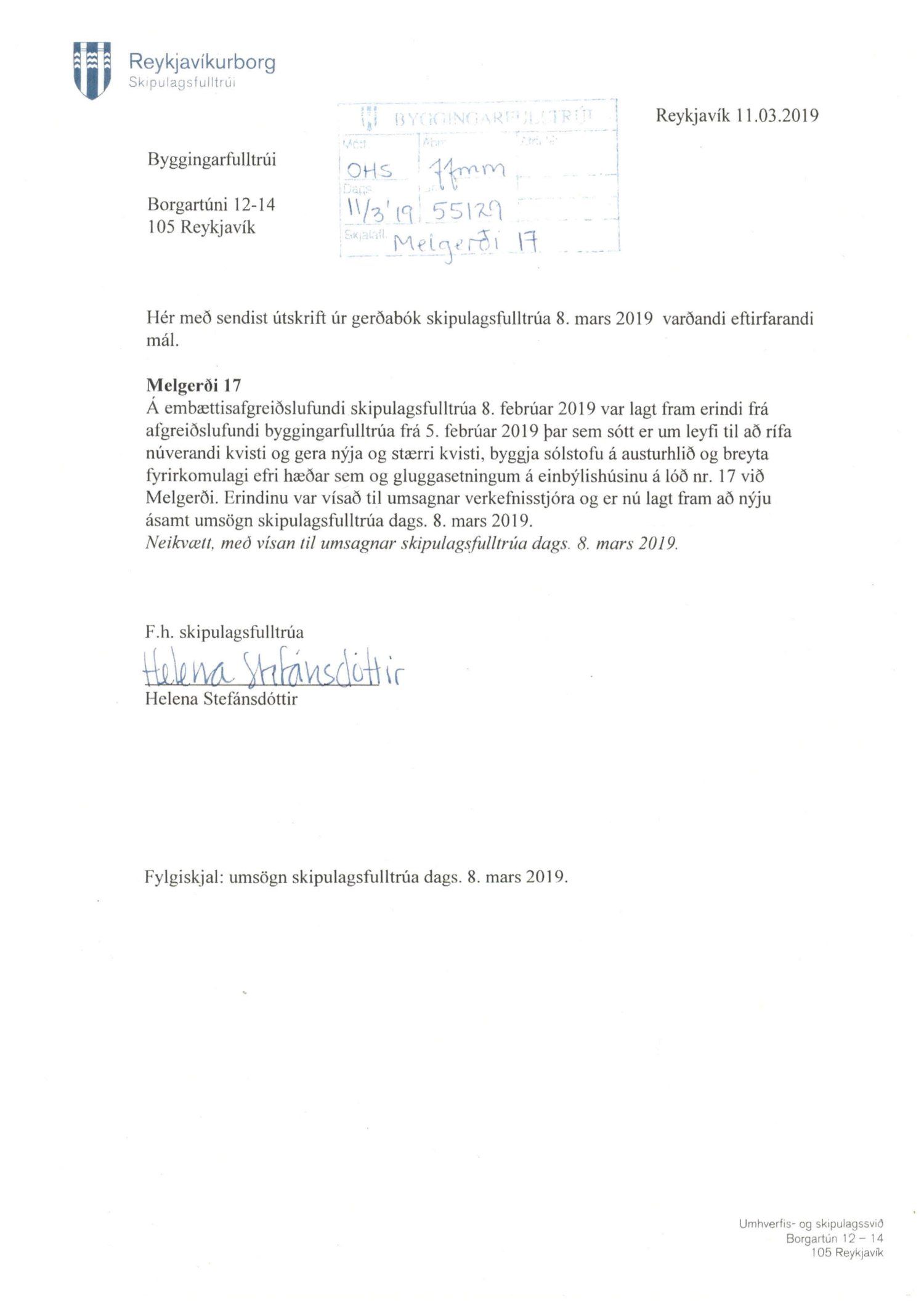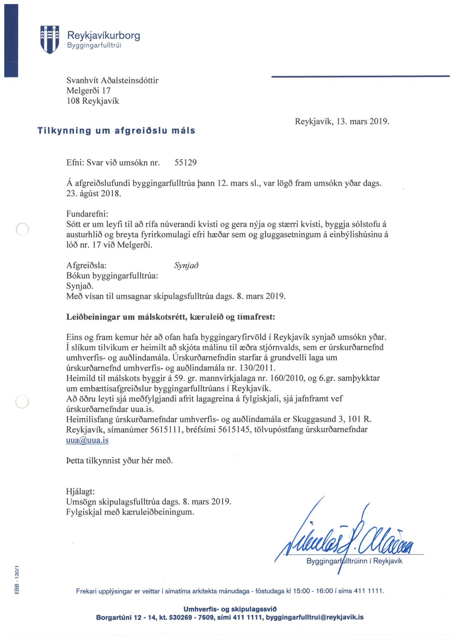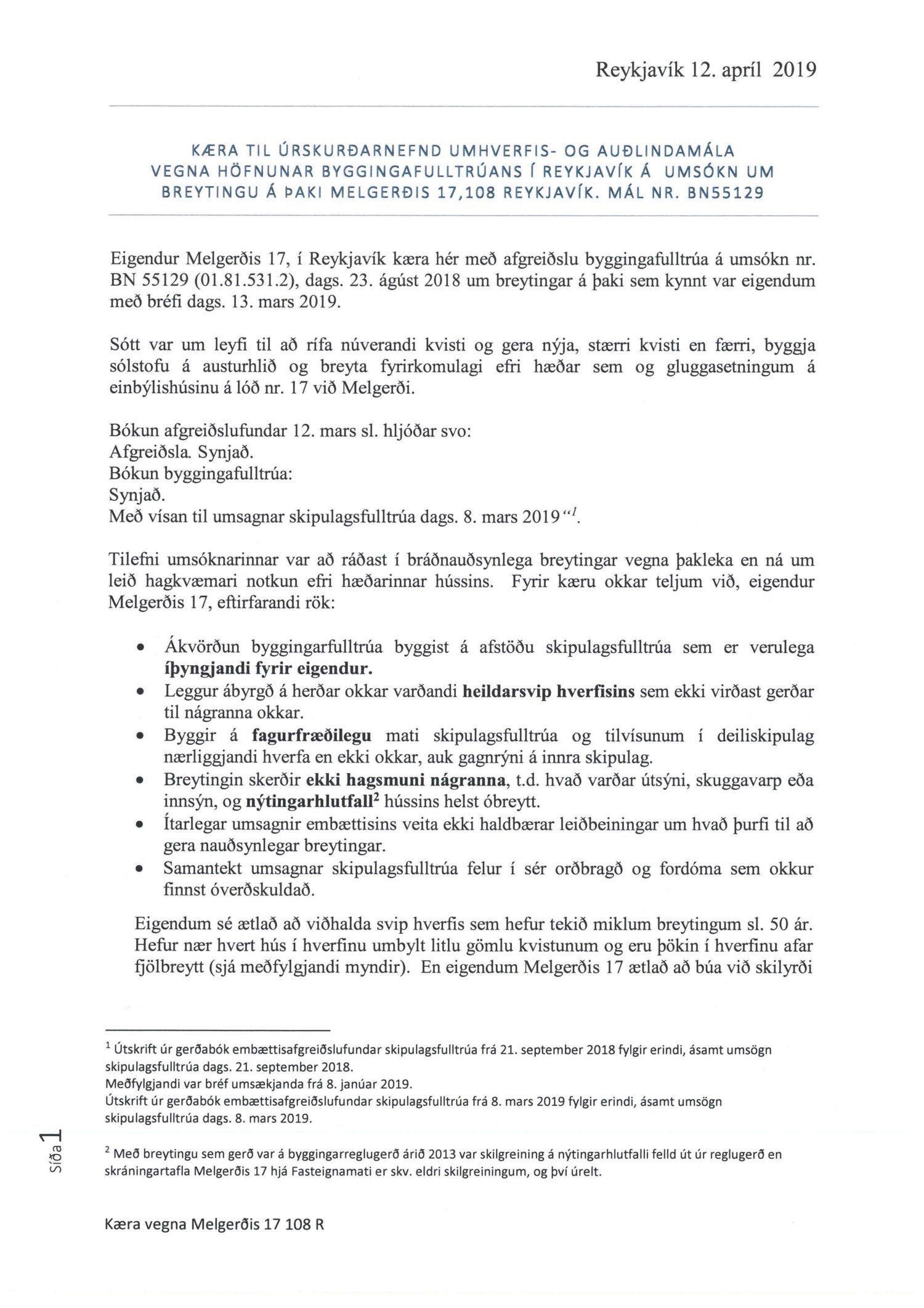 Lagt fram erindi úrskurðarnefndar umhverfis- og auðlindamála dags. 15. apríl 2019 ásamt kæru dags. 12. apríl 2019 þar sem kærð er afgreiðsla byggingarfulltrúa frá 12. mars á umsókn nr. BN05129 um breytingar á þaki o.fl. á einbýlishúsi á lóð nr. 17 við Melgerði.