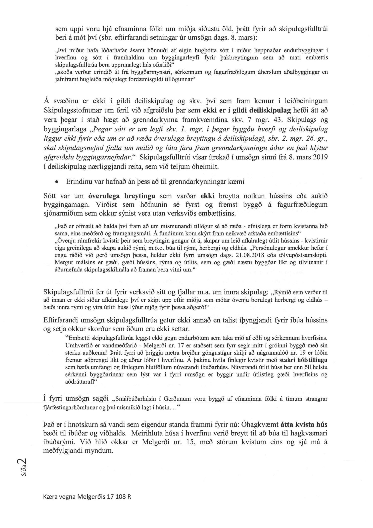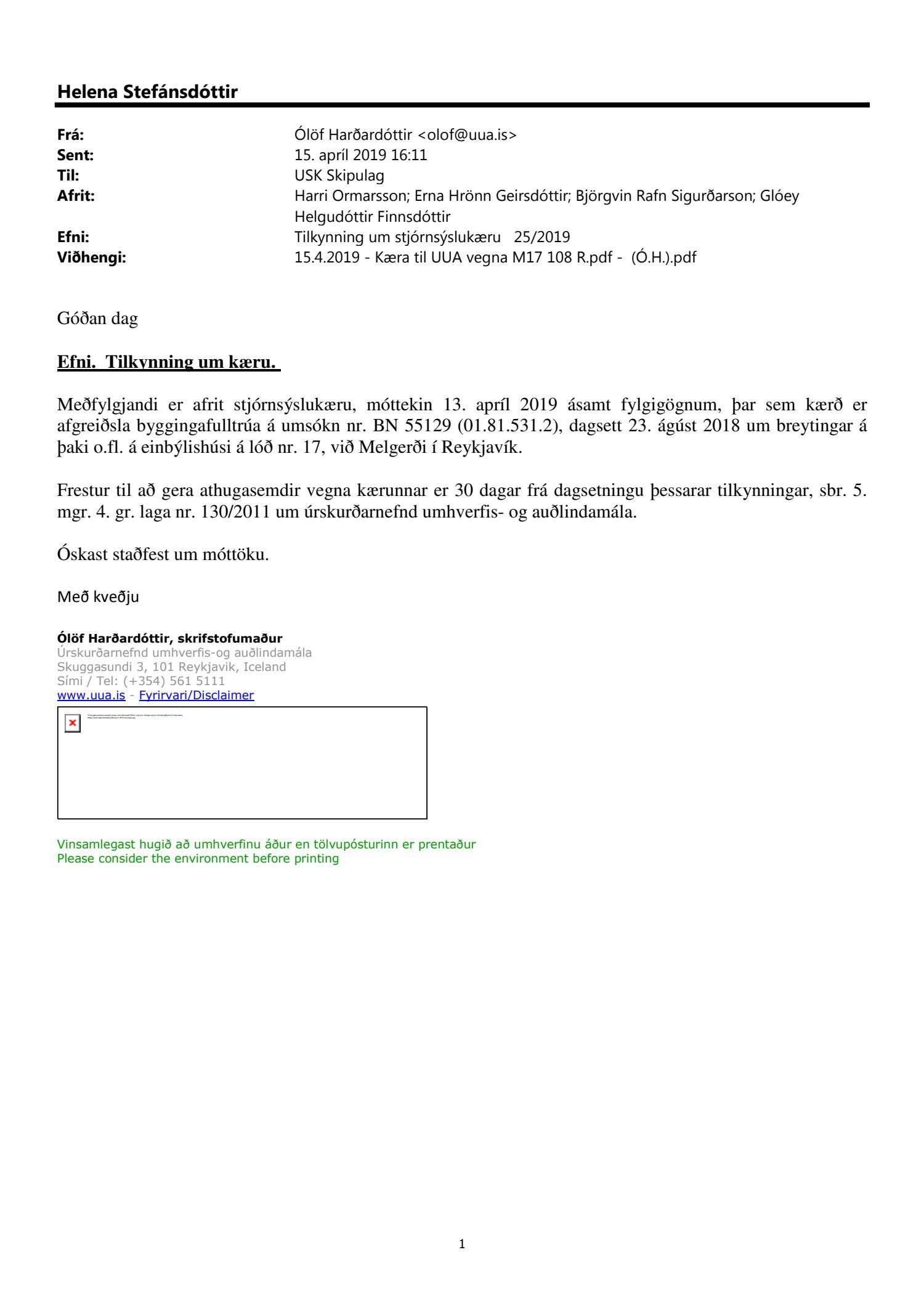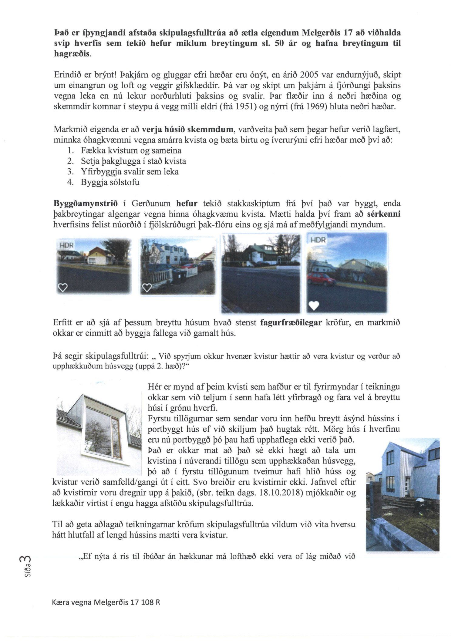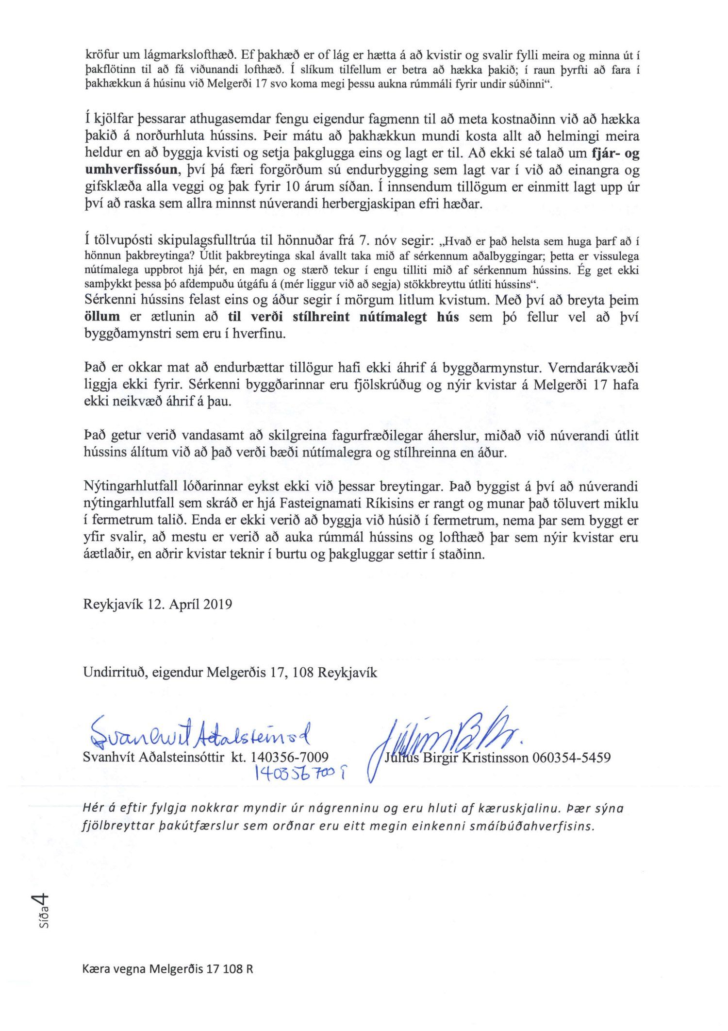 Lagt fram erindi úrskurðarnefndar umhverfis- og auðlindamála dags. 15. apríl 2019 ásamt kæru dags. 12. apríl 2019 þar sem kærð er afgreiðsla byggingarfulltrúa frá 12. mars á umsókn nr. BN05129 um breytingar á þaki o.fl. á einbýlishúsi á lóð nr. 17 við Melgerði.