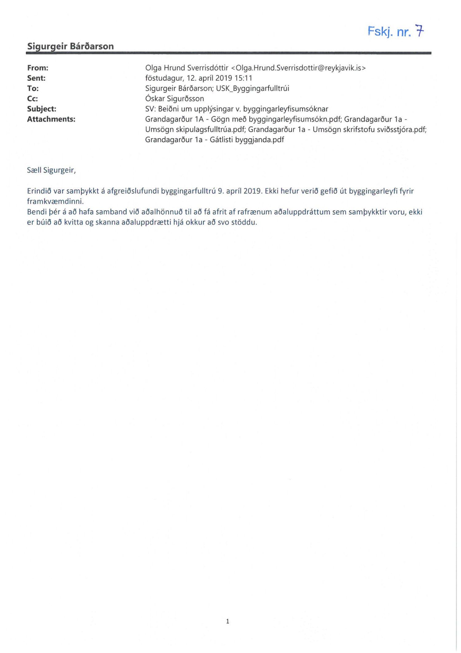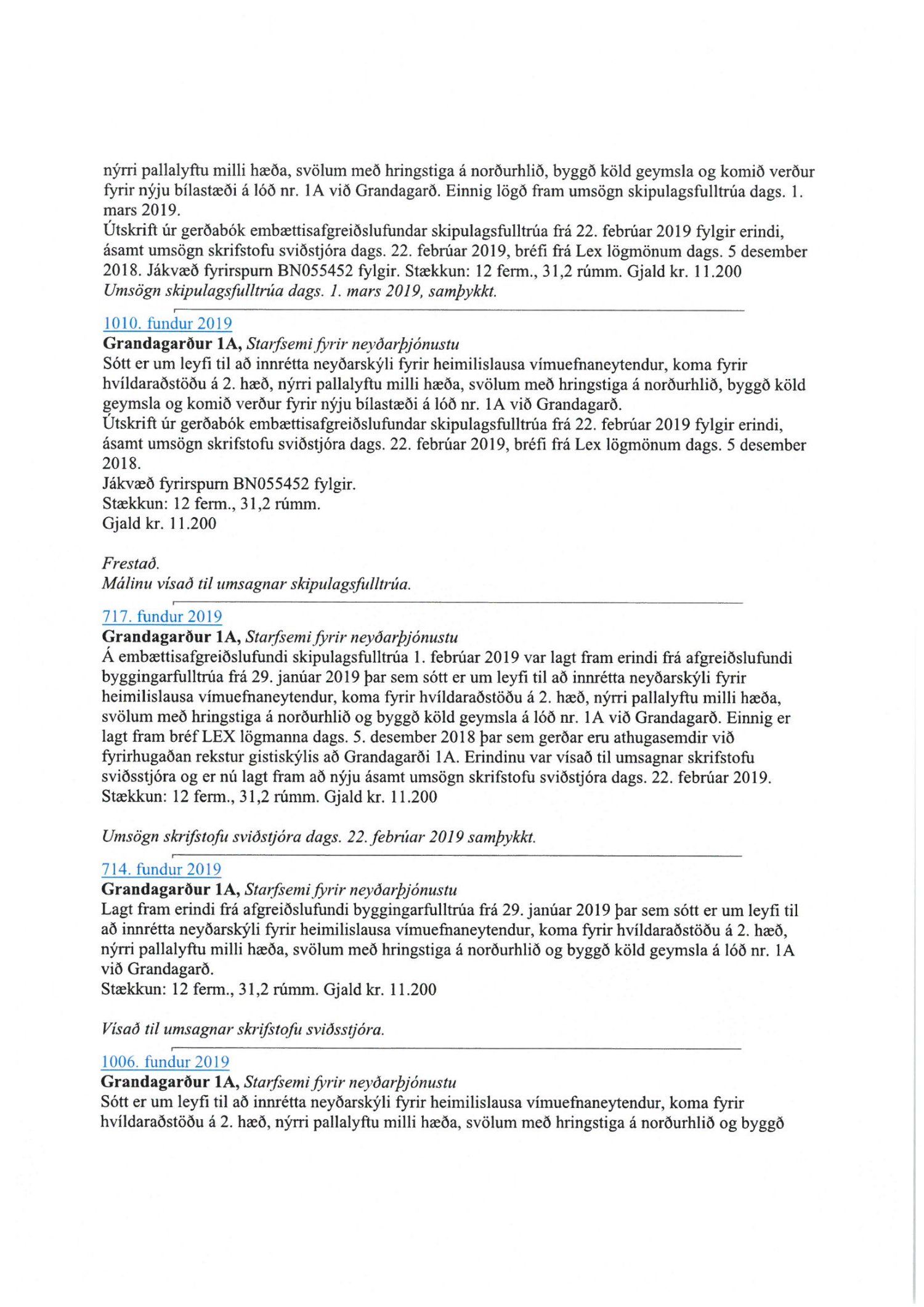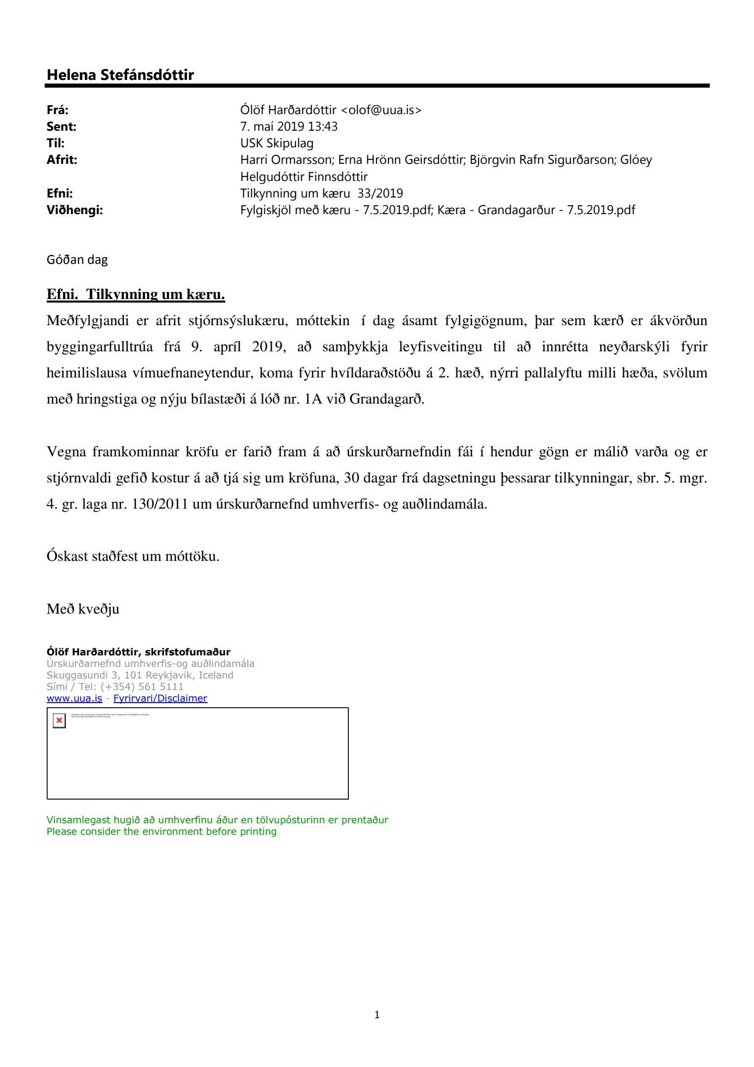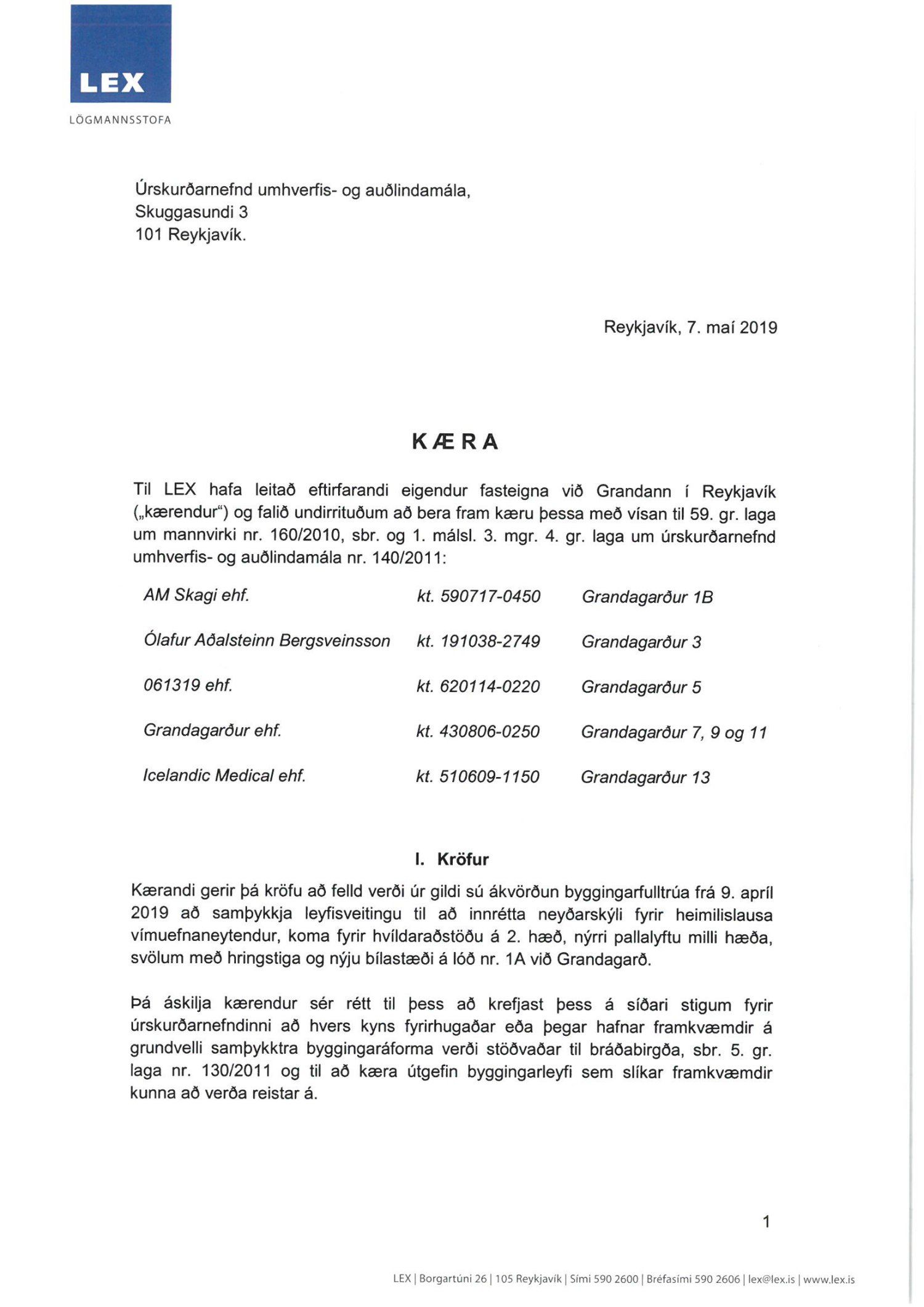 Lagt fram erindi úrskurðarnefndar umhverfis- og auðlindamála dags. 7. maí 2019 ásamt kæru dags. 7. maí 2019 þar sem kærð er ákvörðun byggingarfulltrúa frá 9. apríl 2019 að samþykkja leyfisveitingu til að innrétta neyðarskýli fyrir heimilislausa vímuefnaneytendur, koma fyrir hvíldaraðstöðu á 2. hæð, nýrri pallalyftu milli hæða, svölum með hringstiga, og komið verður fyrir nýju bílastæði á lóð nr. 1A við Grandagarð.