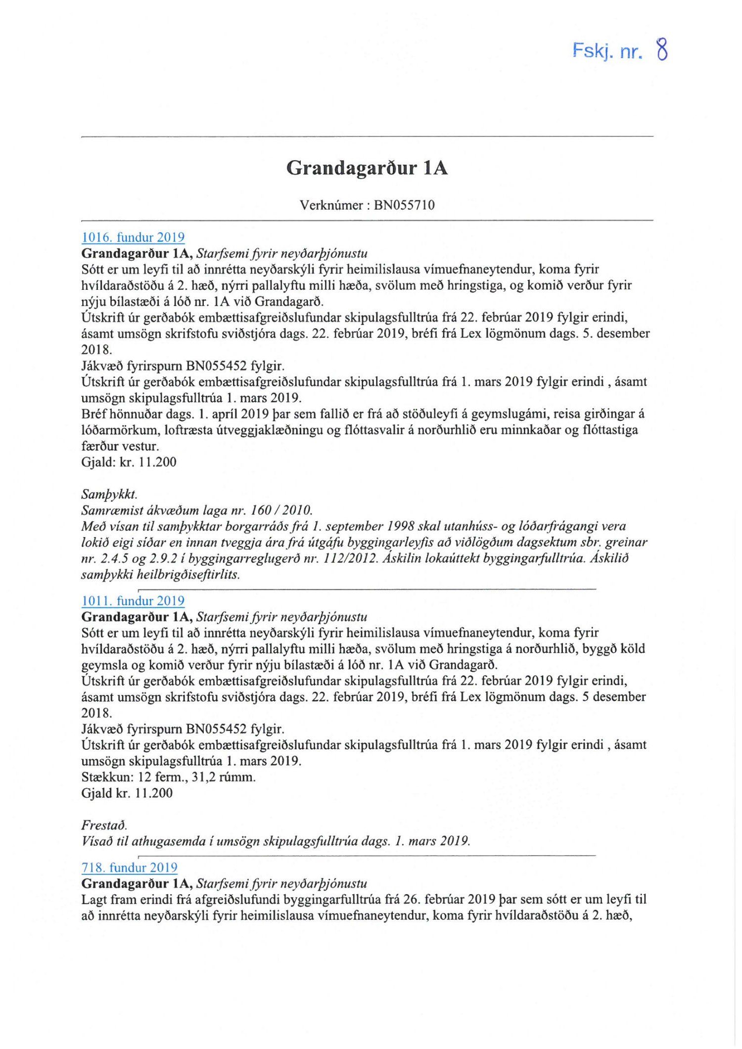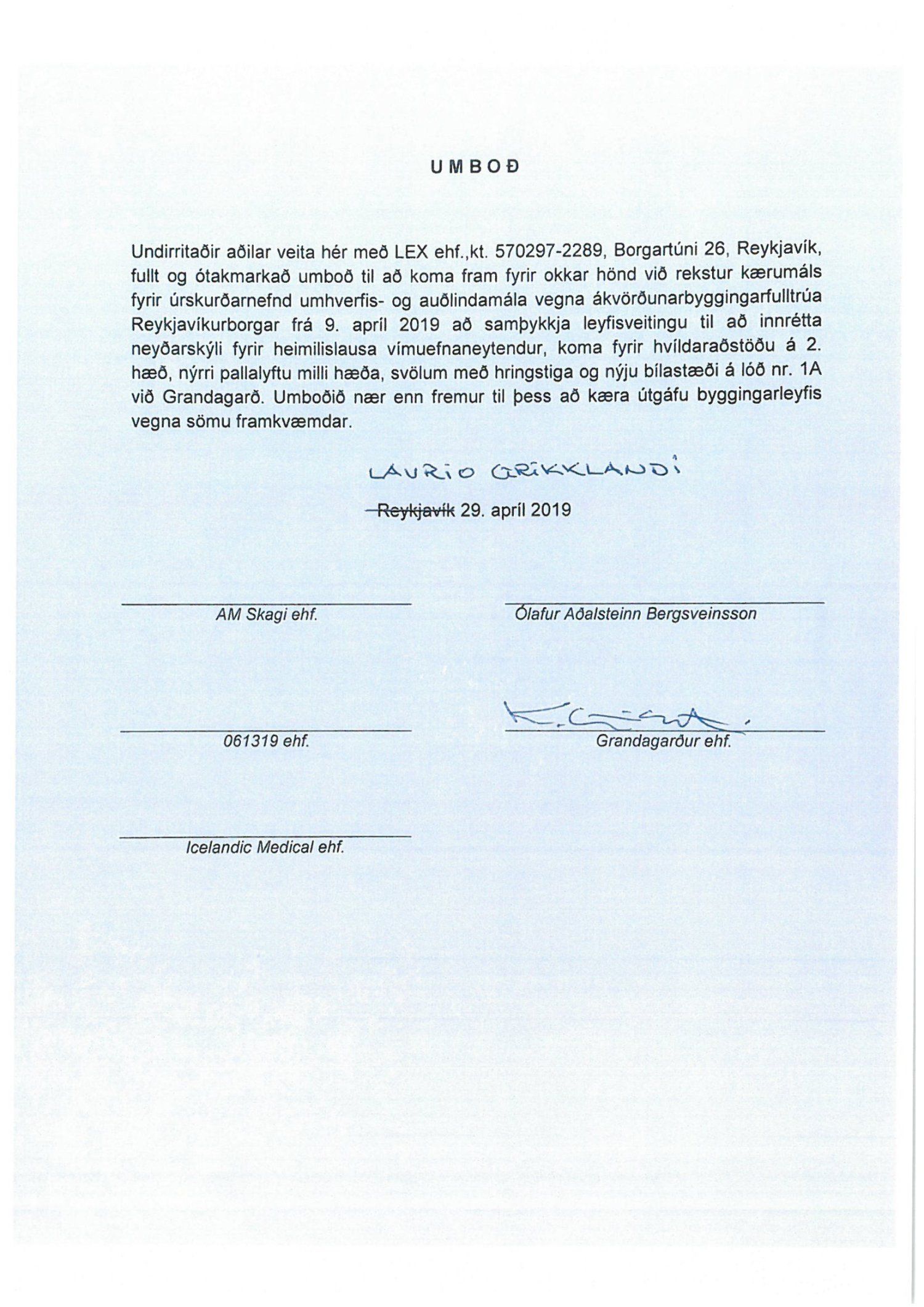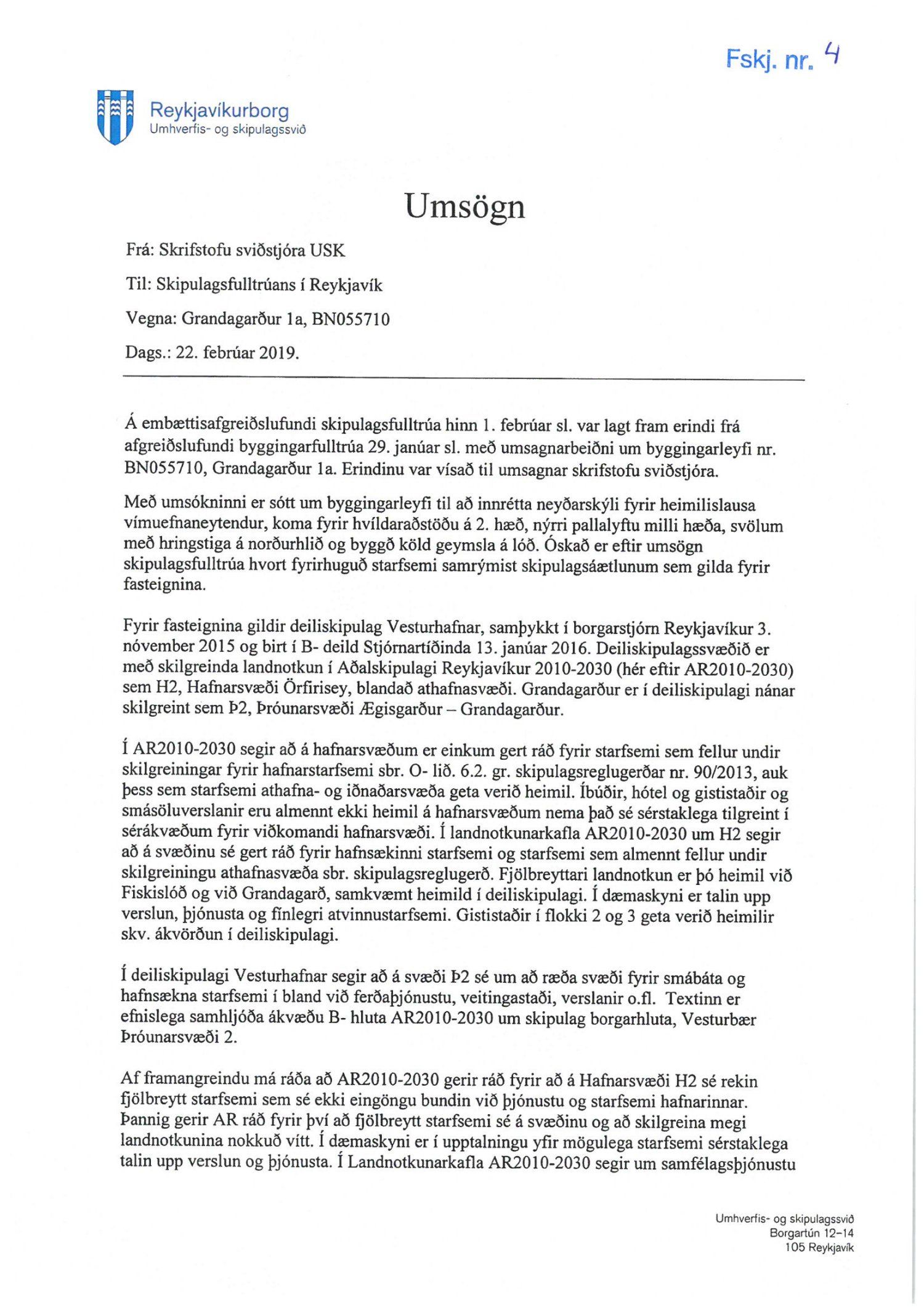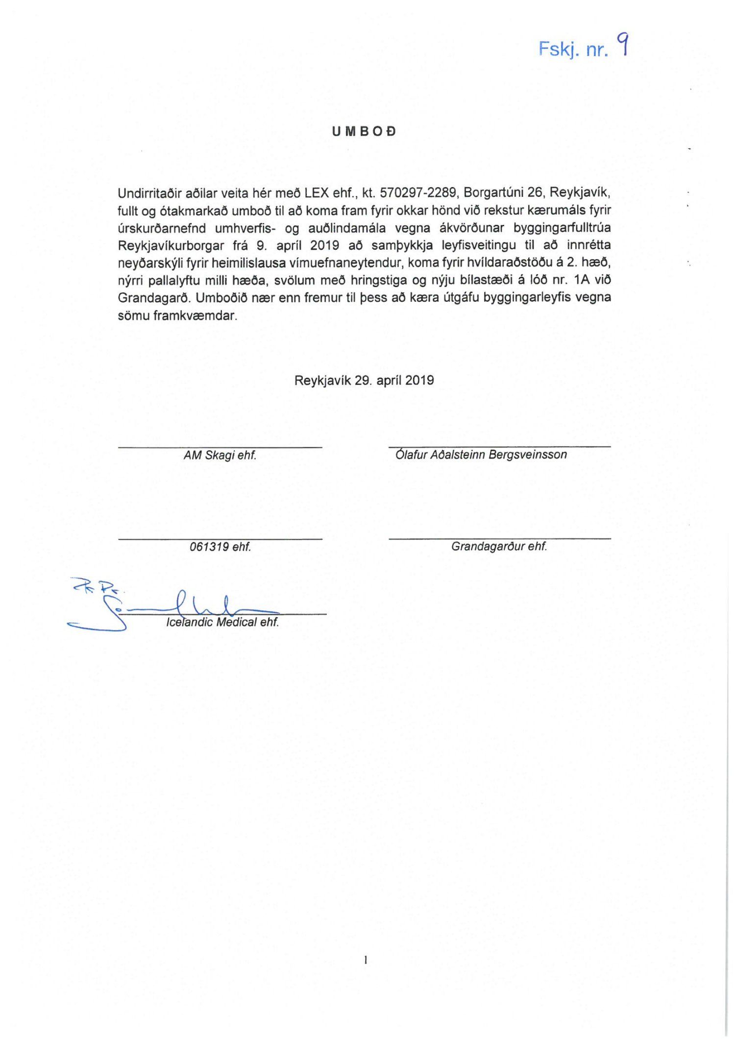 Lagt fram erindi úrskurðarnefndar umhverfis- og auðlindamála dags. 7. maí 2019 ásamt kæru dags. 7. maí 2019 þar sem kærð er ákvörðun byggingarfulltrúa frá 9. apríl 2019 að samþykkja leyfisveitingu til að innrétta neyðarskýli fyrir heimilislausa vímuefnaneytendur, koma fyrir hvíldaraðstöðu á 2. hæð, nýrri pallalyftu milli hæða, svölum með hringstiga, og komið verður fyrir nýju bílastæði á lóð nr. 1A við Grandagarð.
