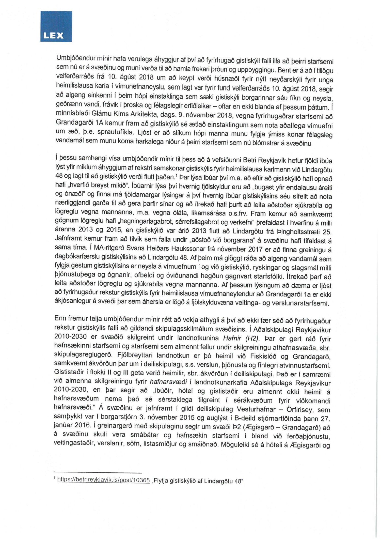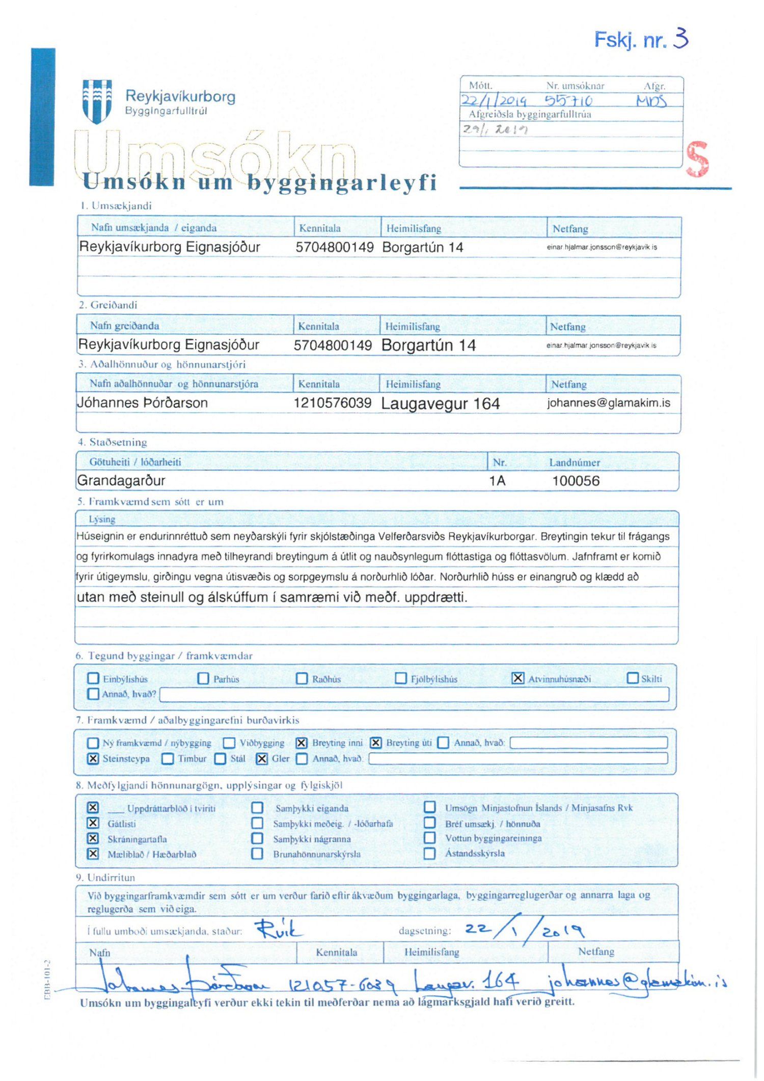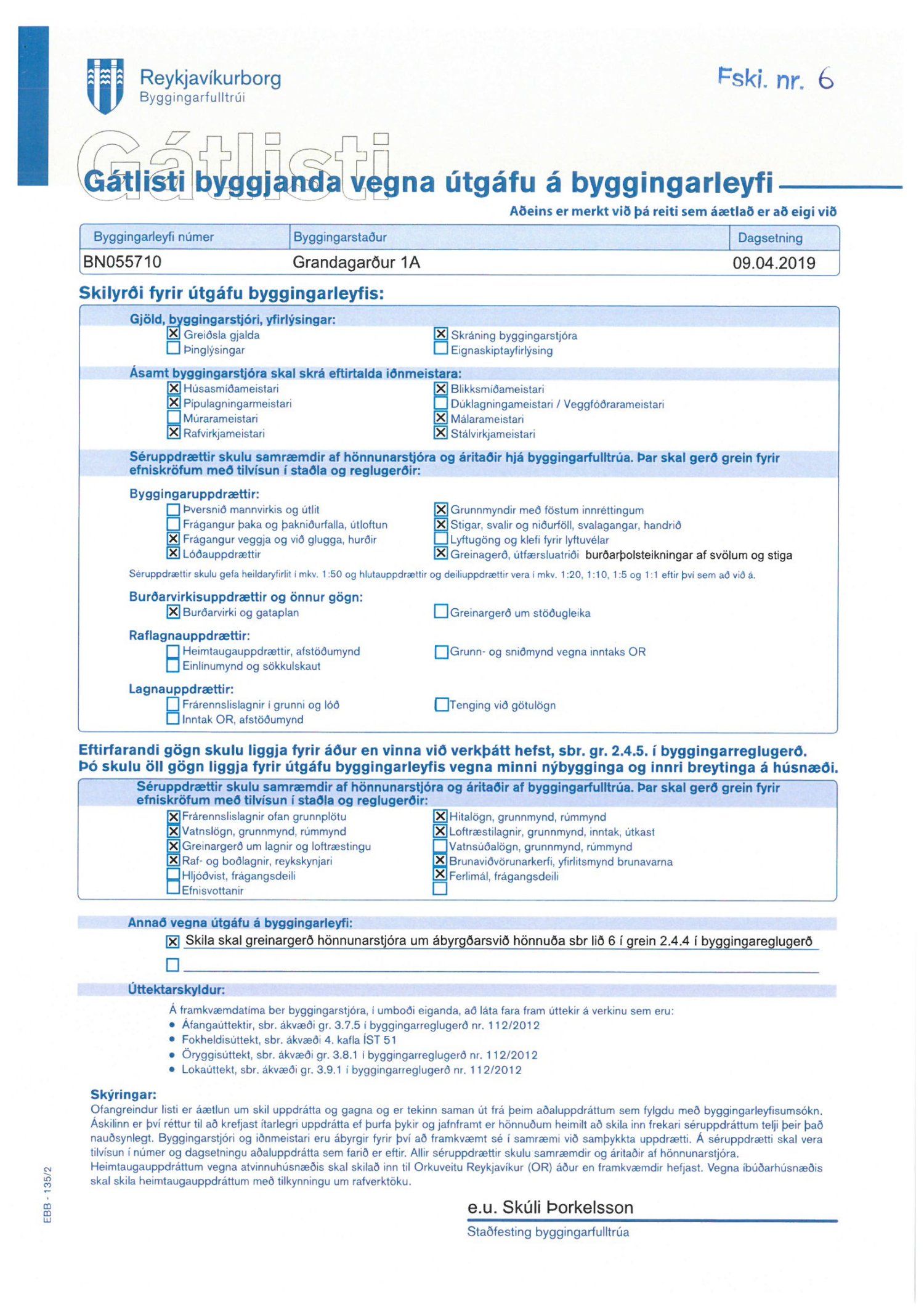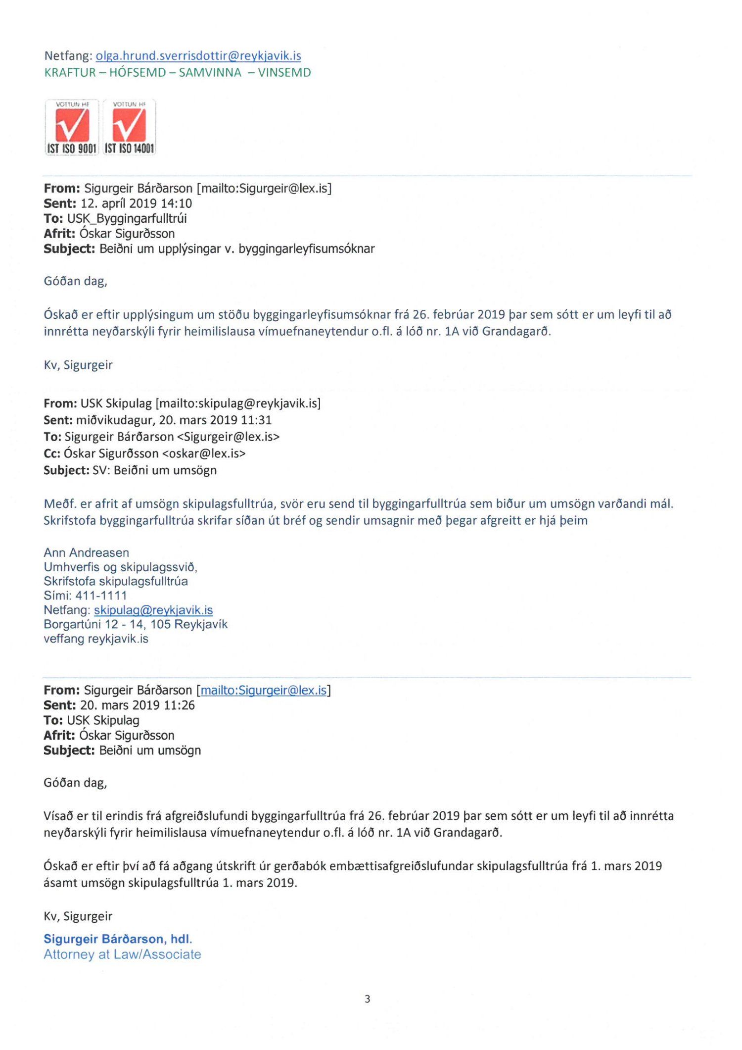 Lagt fram erindi úrskurðarnefndar umhverfis- og auðlindamála dags. 7. maí 2019 ásamt kæru dags. 7. maí 2019 þar sem kærð er ákvörðun byggingarfulltrúa frá 9. apríl 2019 að samþykkja leyfisveitingu til að innrétta neyðarskýli fyrir heimilislausa vímuefnaneytendur, koma fyrir hvíldaraðstöðu á 2. hæð, nýrri pallalyftu milli hæða, svölum með hringstiga, og komið verður fyrir nýju bílastæði á lóð nr. 1A við Grandagarð.