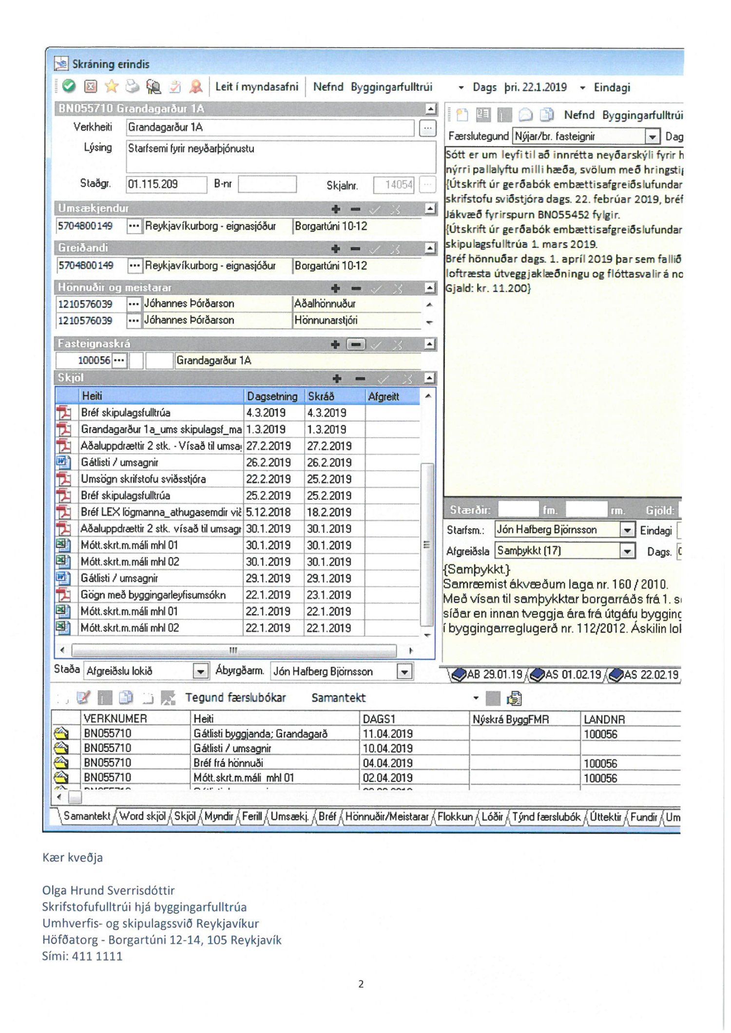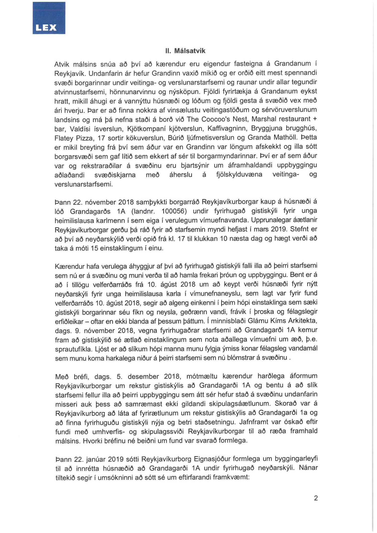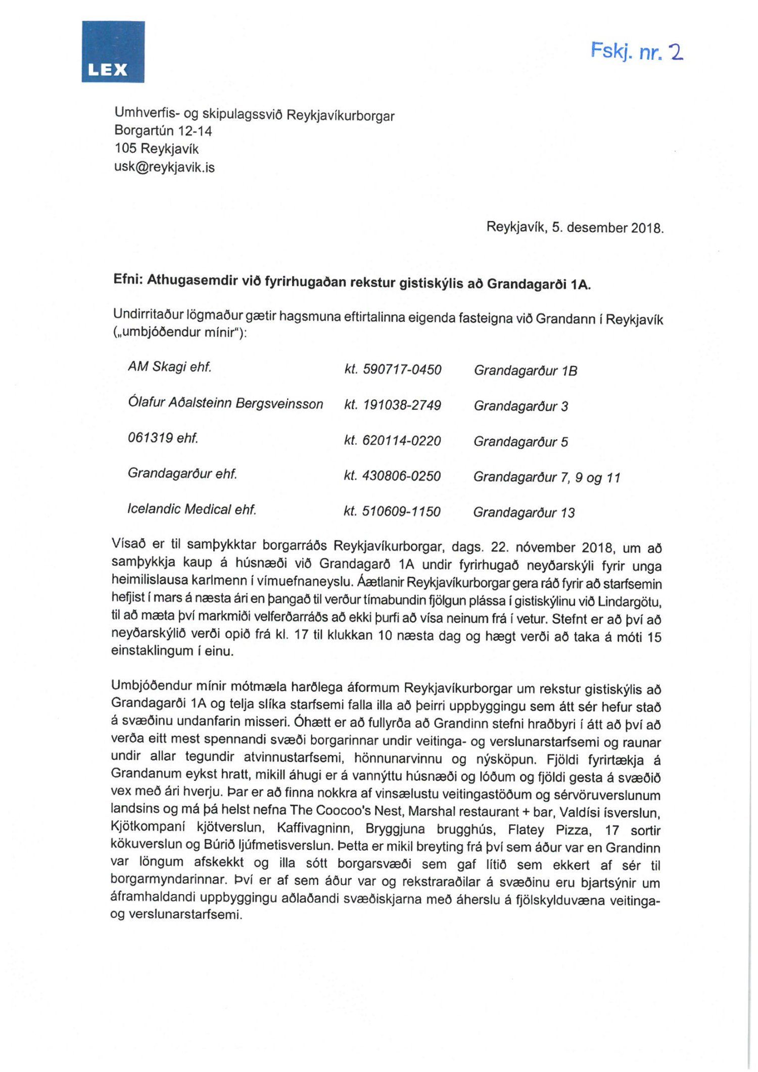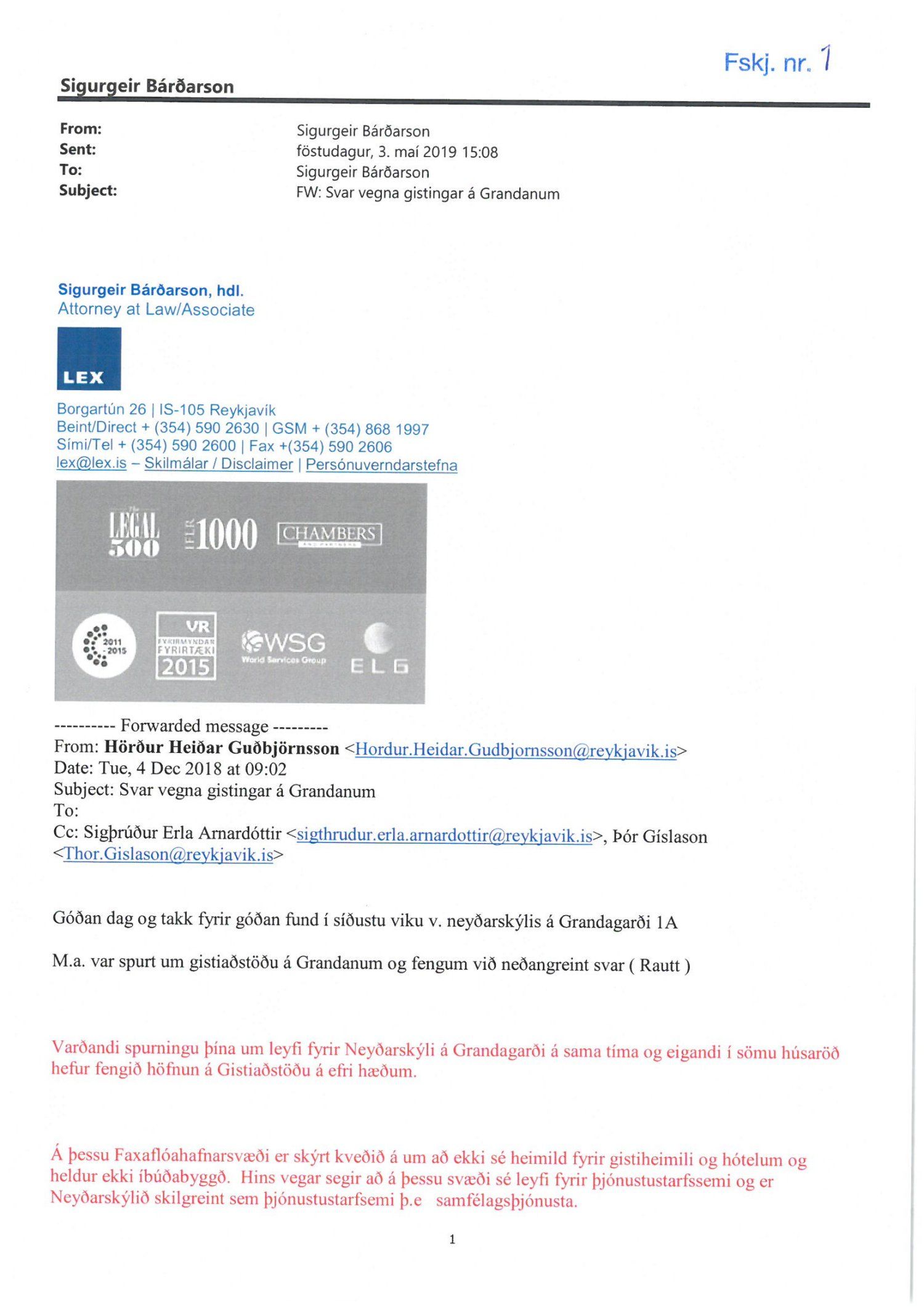 Lagt fram erindi úrskurðarnefndar umhverfis- og auðlindamála dags. 7. maí 2019 ásamt kæru dags. 7. maí 2019 þar sem kærð er ákvörðun byggingarfulltrúa frá 9. apríl 2019 að samþykkja leyfisveitingu til að innrétta neyðarskýli fyrir heimilislausa vímuefnaneytendur, koma fyrir hvíldaraðstöðu á 2. hæð, nýrri pallalyftu milli hæða, svölum með hringstiga, og komið verður fyrir nýju bílastæði á lóð nr. 1A við Grandagarð.