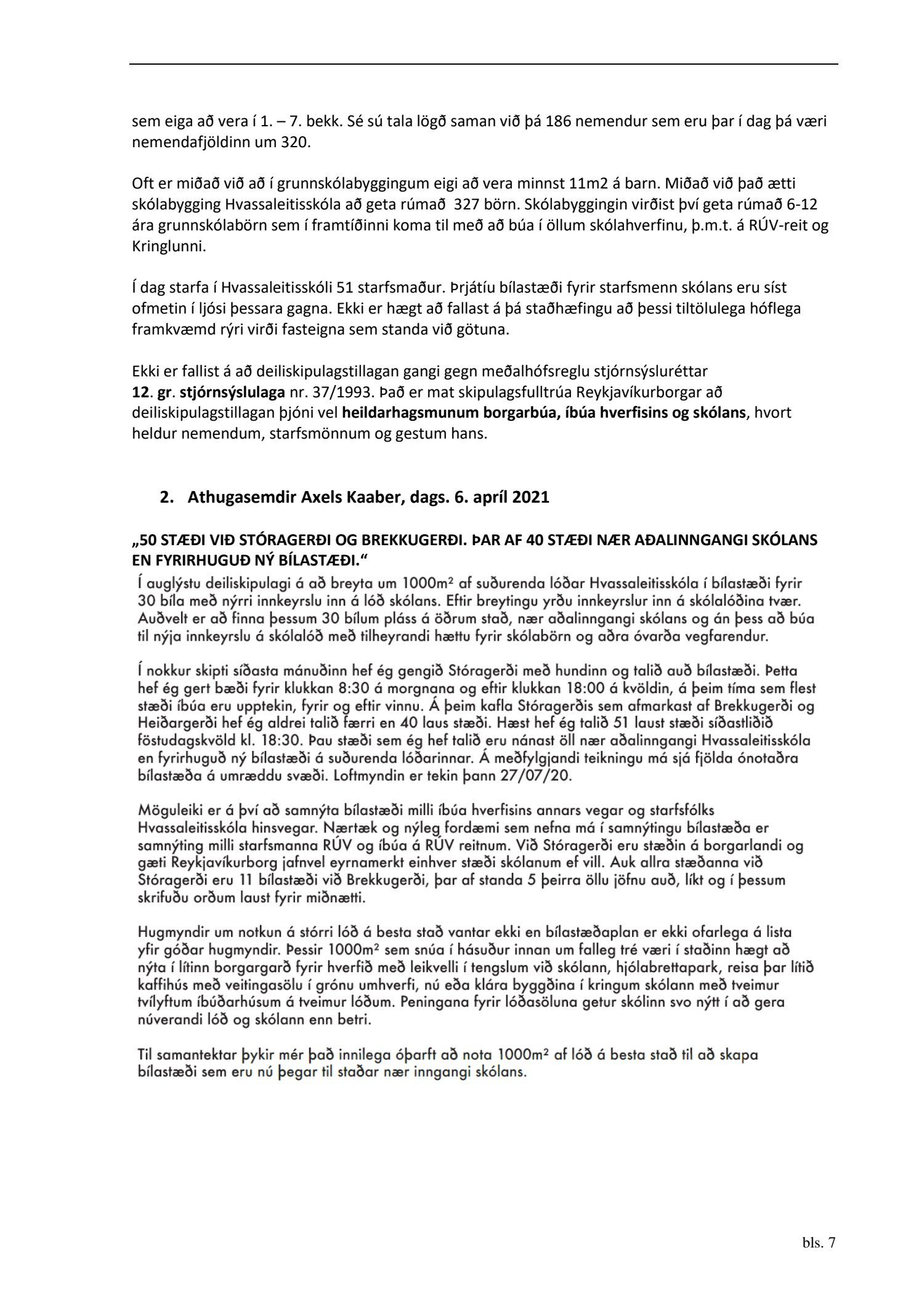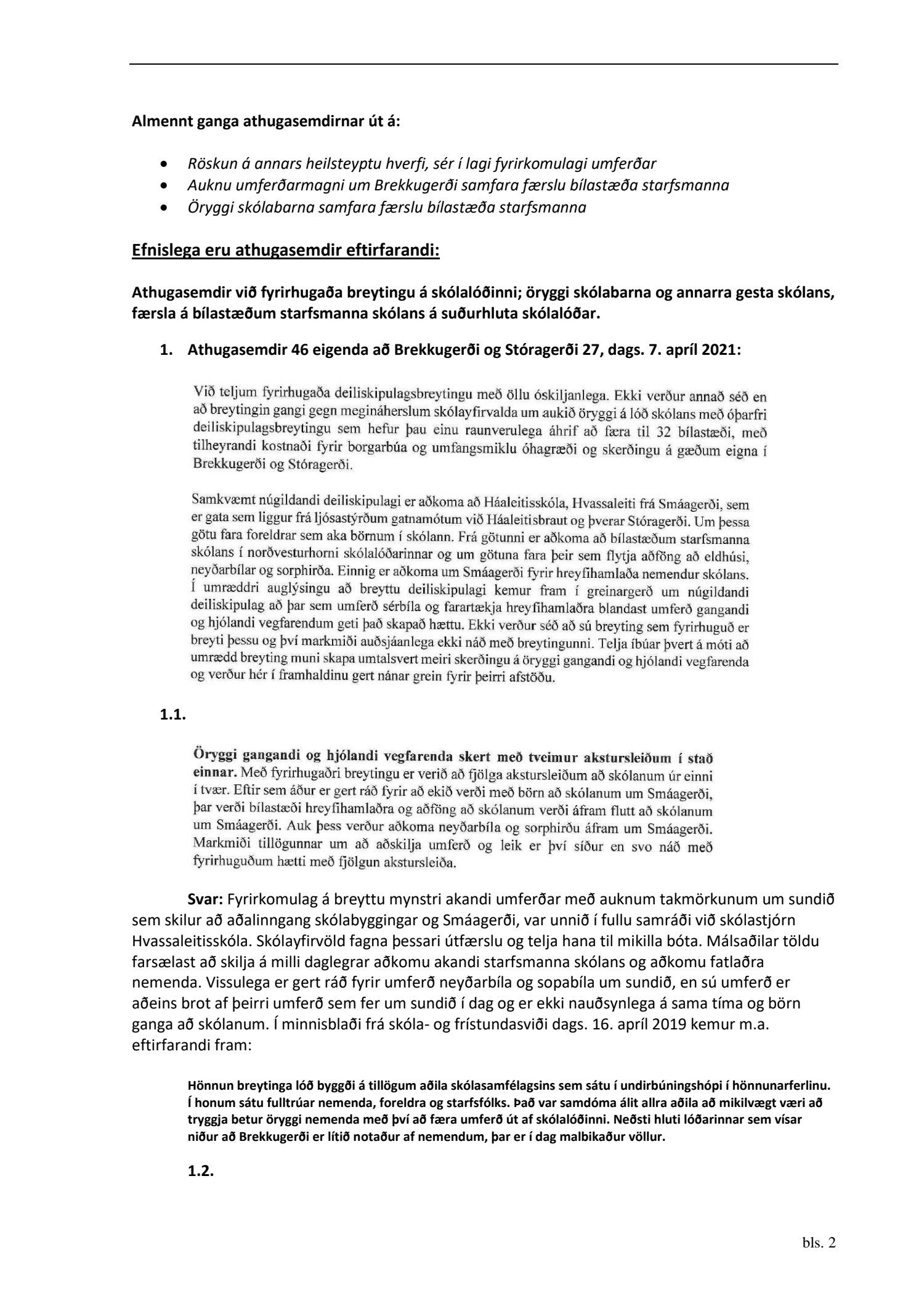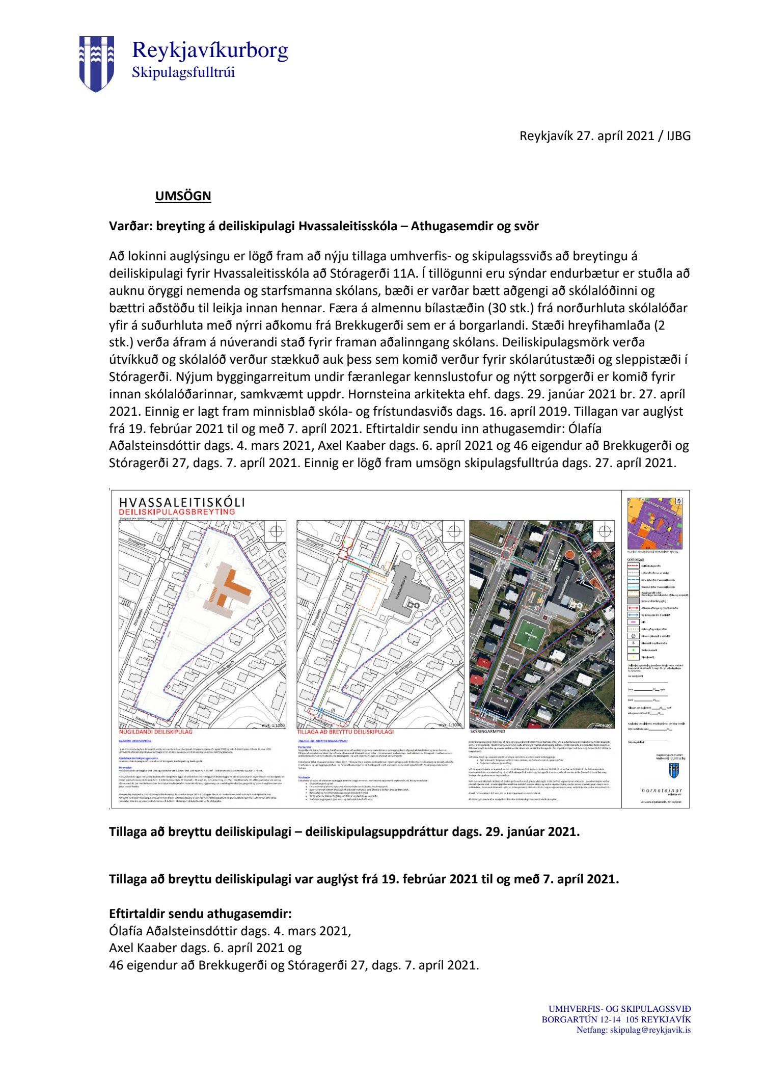 dags. 29. janúar 2021, br. 27. apríl 2021. Einnig er lagt fram minnisblað skóla- og frístundasviðs dags. 16. apríl 2019. Tillagan var auglýst frá 19. febrúar 2021 til og með 7. apríl 2021. Eftirtaldir sendu inn athugasemdir: Ólafía Aðalsteinsdóttir dags. 4. mars 2021, Axel Kaaber dags. 6. apríl 2021 og 46 eigendur að Brekkugerði og Stóragerði 27, dags. 7. apríl 2021. Einnig er lögð fram umsögn skipulagsfulltrúa dags. 27. apríl 2021.