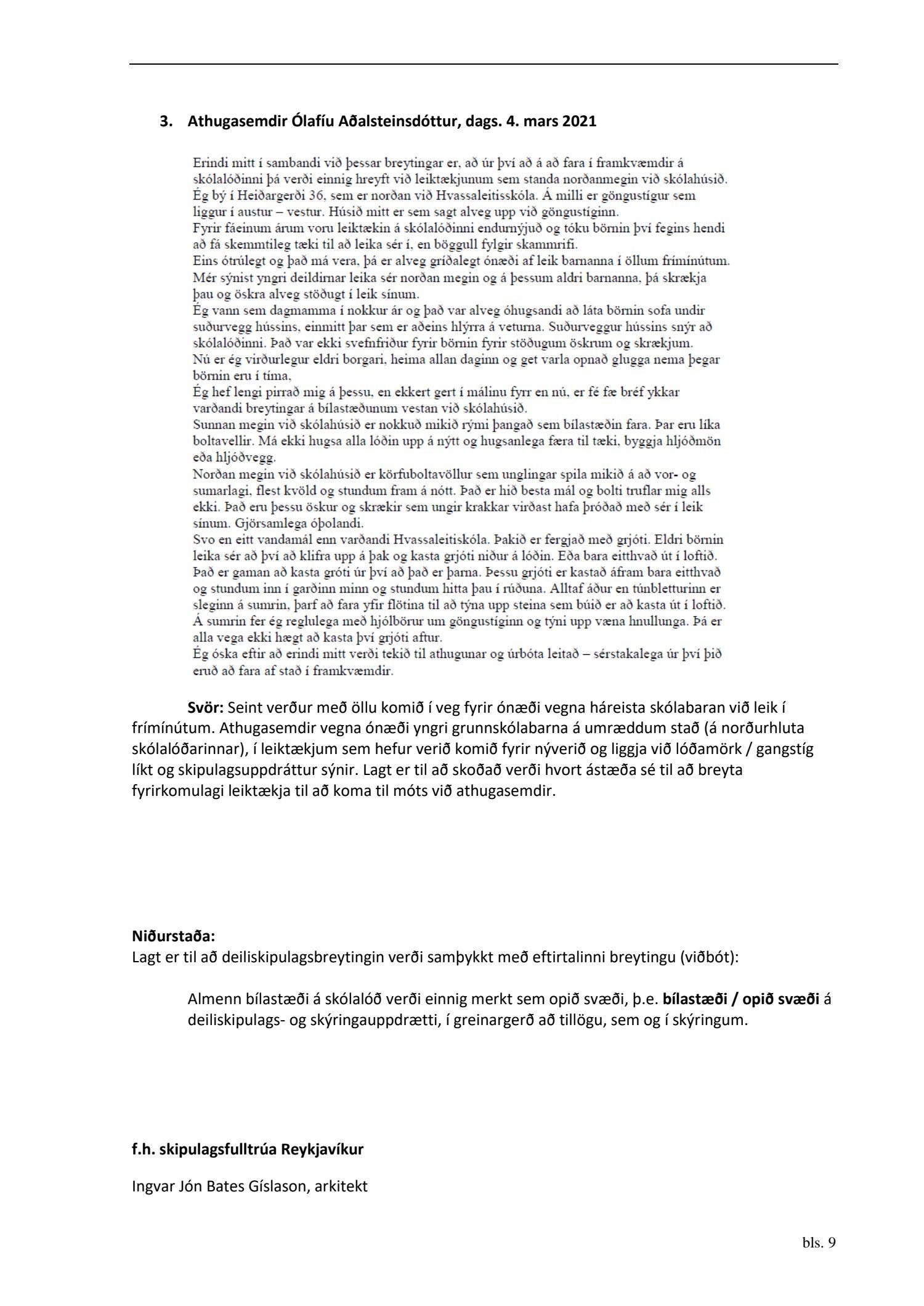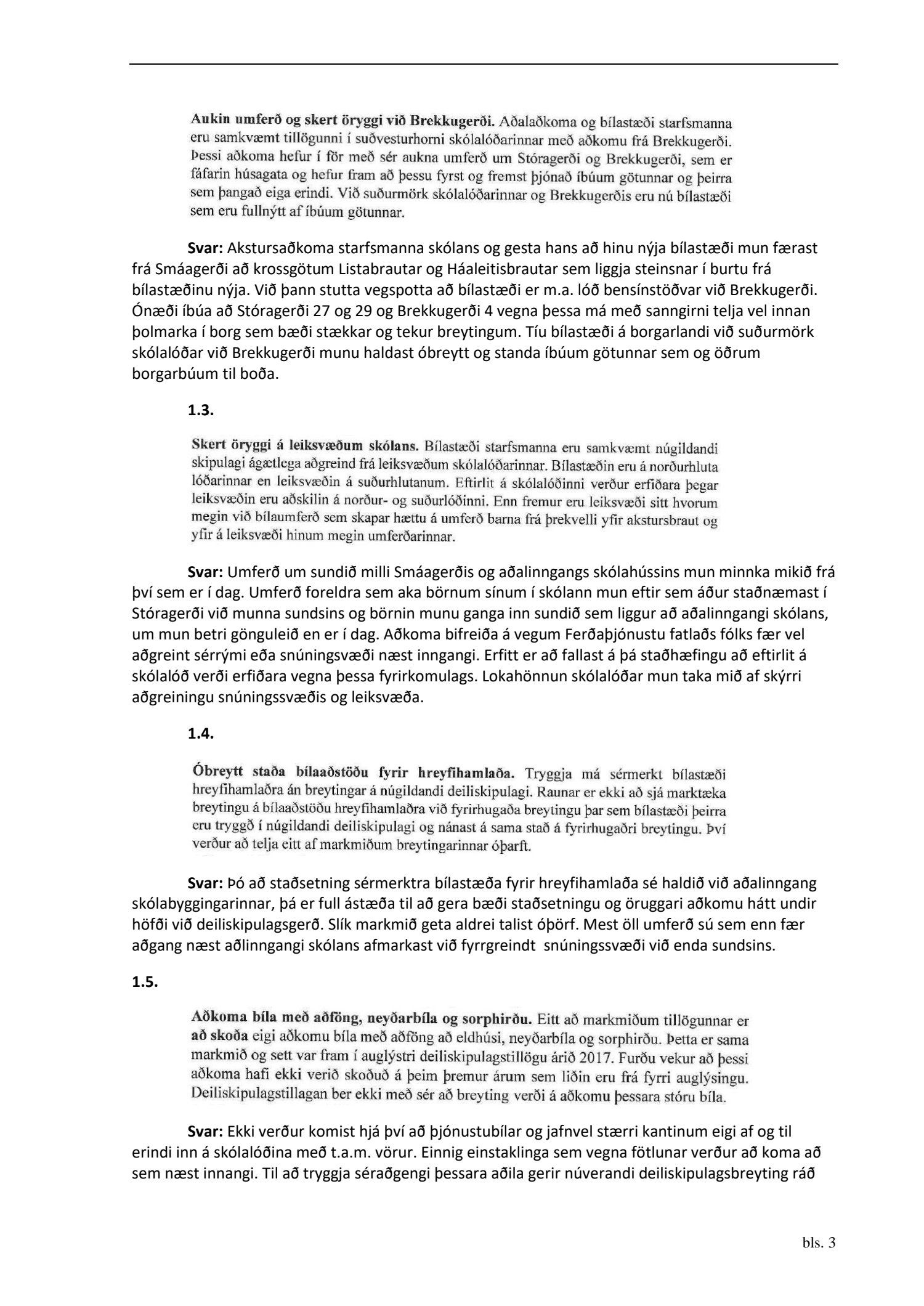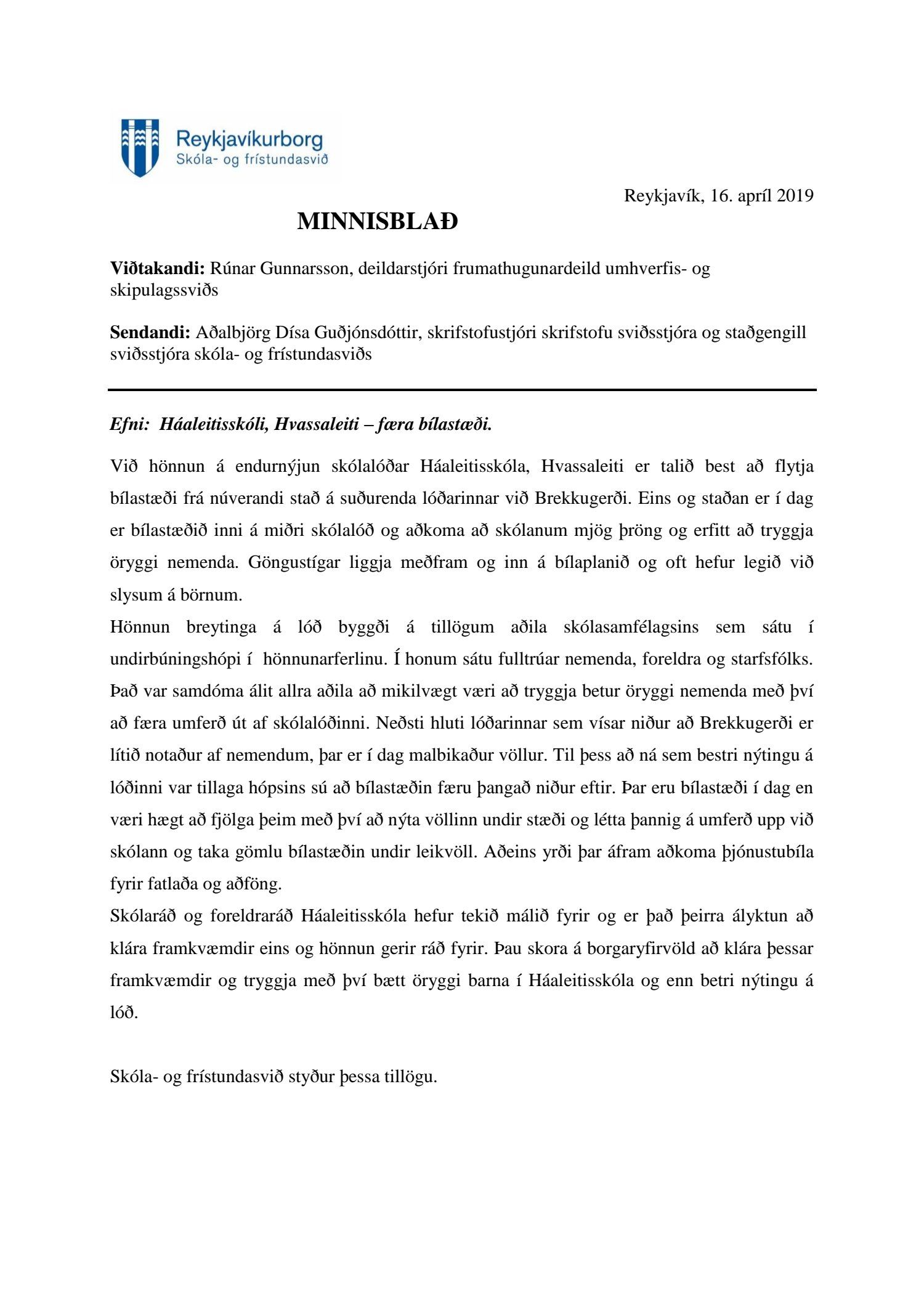 dags. 29. janúar 2021, br. 27. apríl 2021. Einnig er lagt fram minnisblað skóla- og frístundasviðs dags. 16. apríl 2019. Tillagan var auglýst frá 19. febrúar 2021 til og með 7. apríl 2021. Eftirtaldir sendu inn athugasemdir: Ólafía Aðalsteinsdóttir dags. 4. mars 2021, Axel Kaaber dags. 6. apríl 2021 og 46 eigendur að Brekkugerði og Stóragerði 27, dags. 7. apríl 2021. Einnig er lögð fram umsögn skipulagsfulltrúa dags. 27. apríl 2021.