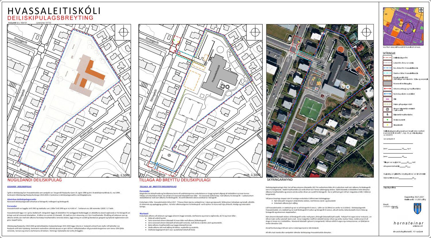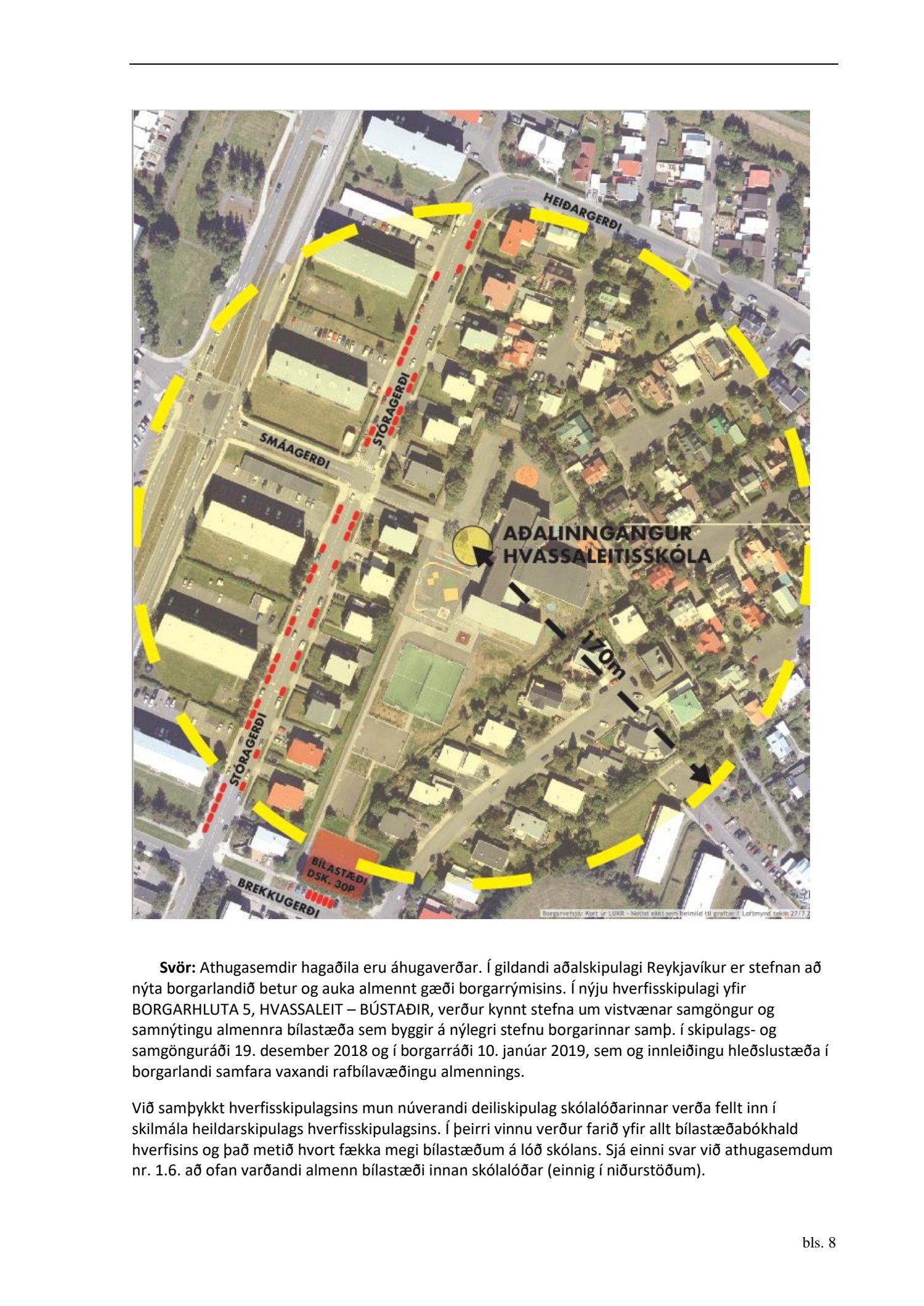 Að lokinni auglýsingu er lögð fram að nýju tillaga umhverfis- og skipulagssviðs að breytingu á deiliskipulagi fyrir Hvassaleitisskóla að Stóragerði 11A. Í tillögunni eru sýndar endurbætur er stuðla að auknu öryggi nemenda og starfsmanna skólans, bæði er varðar bætt aðgengi að skólalóðinni og bættri aðstöðu til leikja innan hennar. Færa á almennu bílastæðin (30 stk.) frá norðurhluta skólalóðar yfir á suðurhluta með nýrri aðkomu frá Brekkugerði sem er á borgarlandi. Stæði hreyfihamlaða (2 stk.) verða áfram á núverandi stað fyrir framan aðalinngang skólans. Deiliskipulagsmörk verða útvíkkuð og skólalóð verður stækkuð auk þess sem komið verður fyrir skólarútustæði og sleppistæði í Stóragerði. Nýjum byggingarreitum undir færanlegar kennslustofur og nýtt sorpgerði er komið fyrir innan skólalóðarinnar, samkvæmt uppdr.