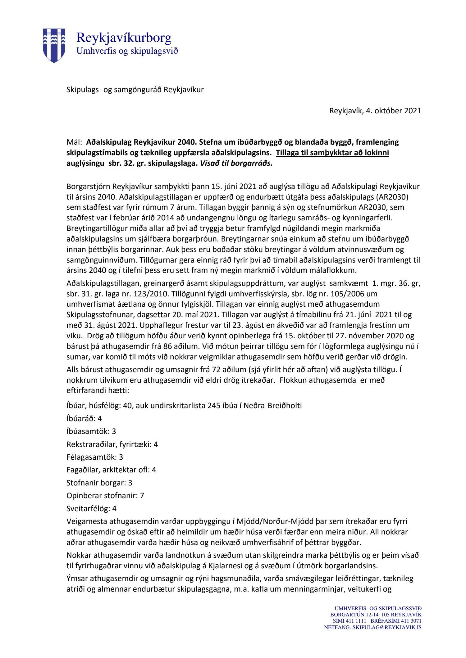 Að lokinni auglýsingu er lögð fram að nýju tillaga umhverfis- og skipulagssviðs að Aðalskipulagi Reykjavíkur 2040, endurskoðun stefnu um íbúðarbyggð og blandaða byggð og tæknileg uppfærsla Aðalskipulags Reykjavíkur 2010-2030, með lengingu skipulagstímabils til ársins 2040. Eftirfarandi eru gögn sem fylgja málinu og eru hér lögð fram;