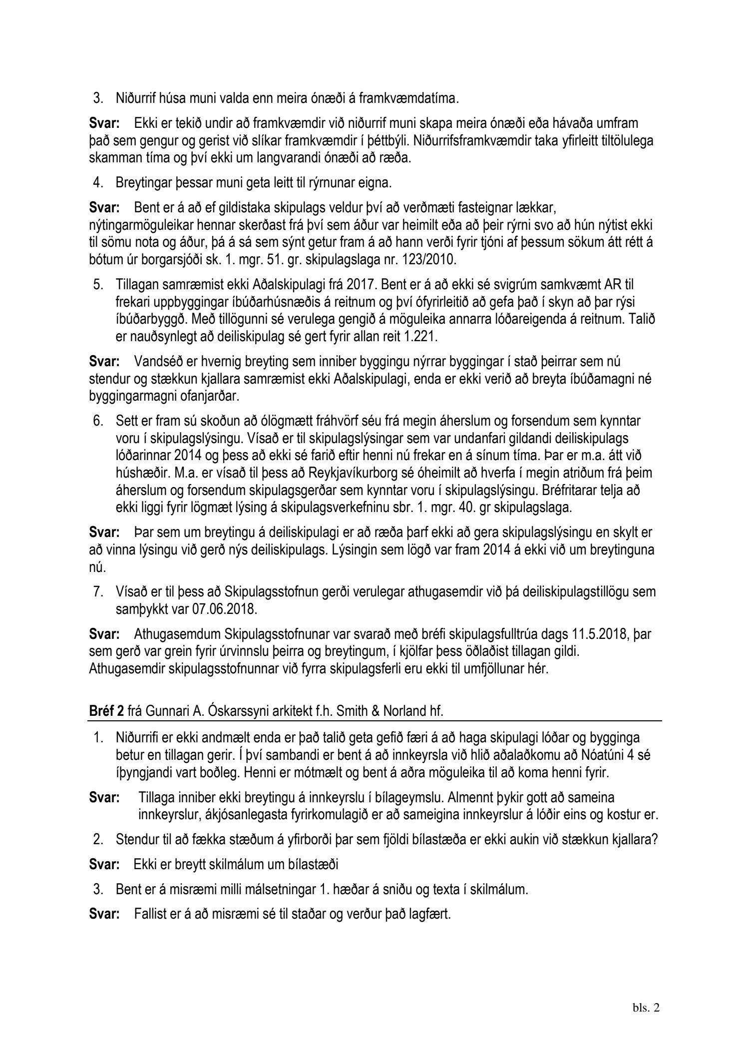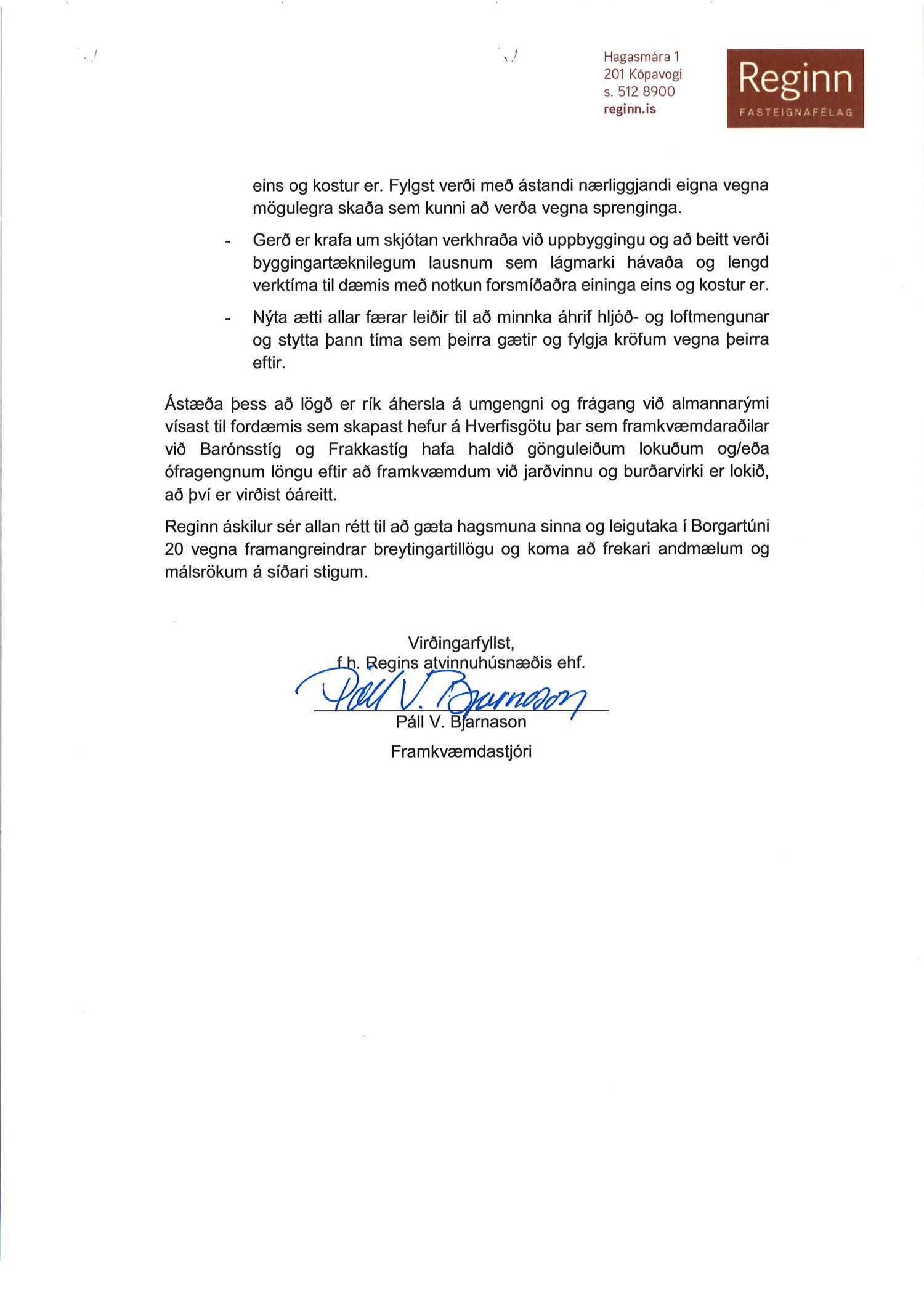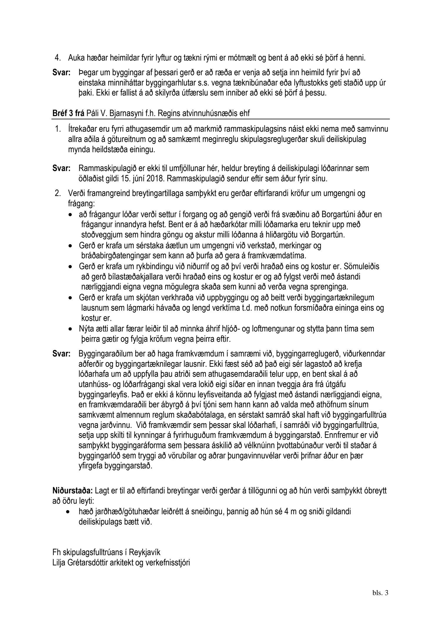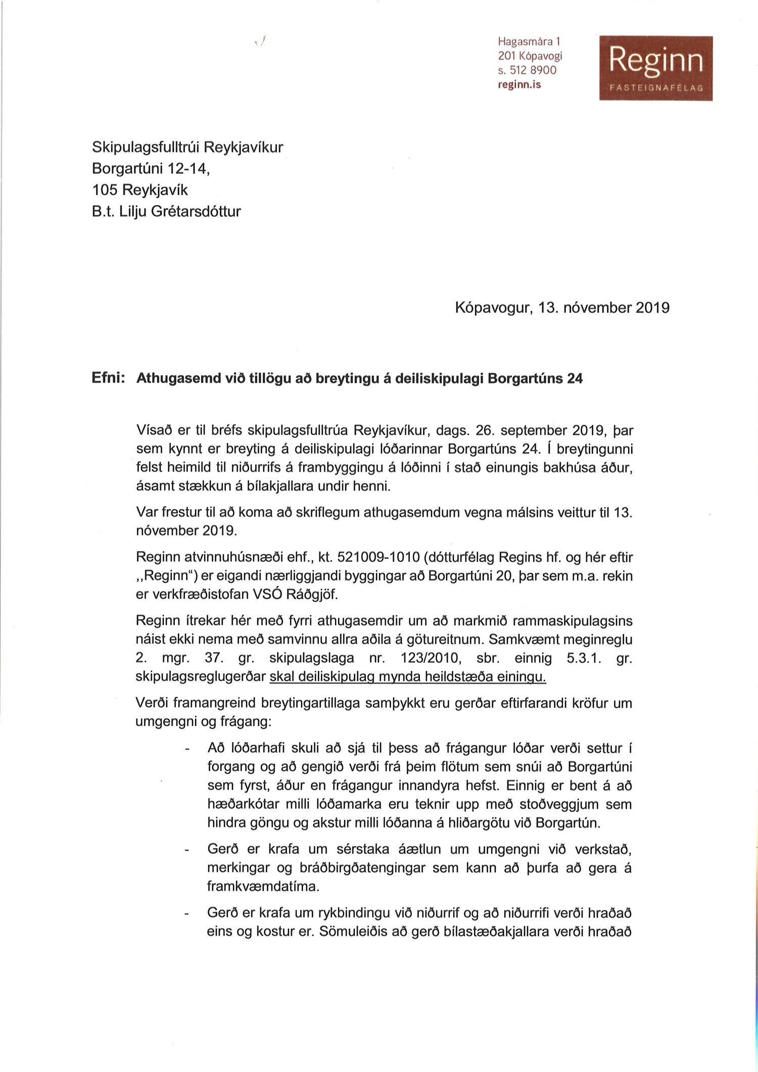 dags. 13. nóvember 2019 og Páll V. Bjarnason f.h. Regins atvinuhúsnæðis ehf. dags. 13. nóvember 2019. Einnig er lögð fram umsögn skipulagsfulltrúa dags. 19. desember 2019.