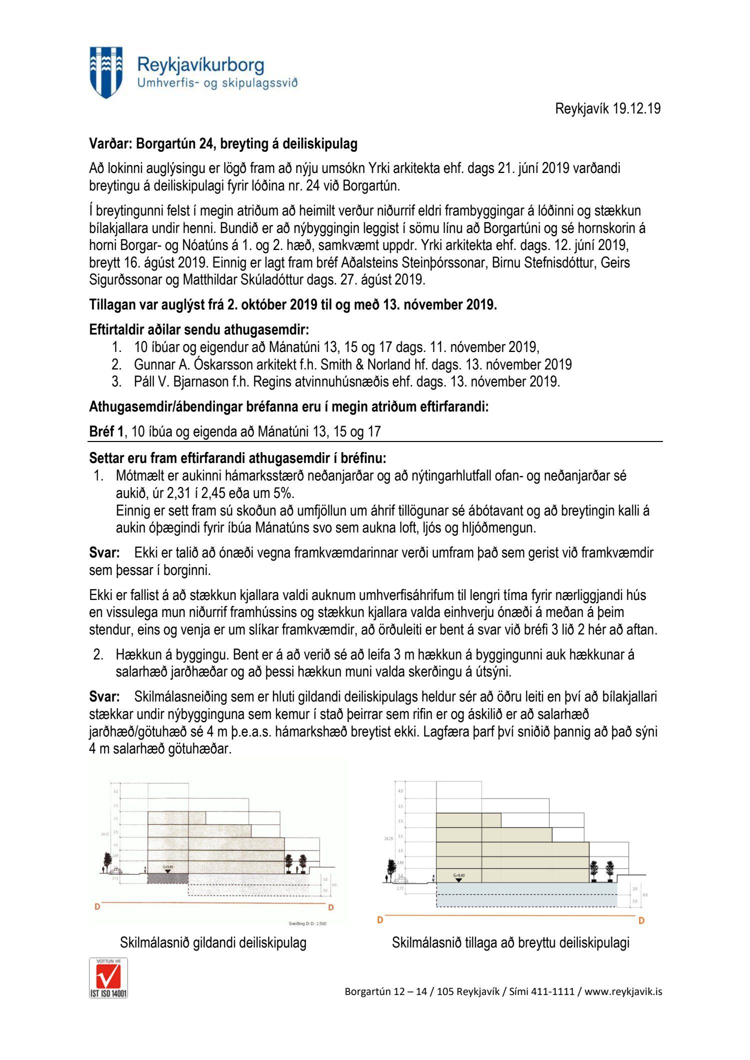 dags 21. júní 2019 varðandi breytingu á deiliskipulagi fyrir lóðina nr. 24 við Borgartún. Í breytingunni felst í megin atriðum að heimilt verður niðurrif eldri frambyggingar á lóðinni og stækkun bílakjallara undir henni. Bundið er að nýbyggingin leggist í sömu línu að Borgartúni og sé hornskorin á horni Borgar- og Nóatúns á 1. og 2. hæð, samkvæmt uppdr.