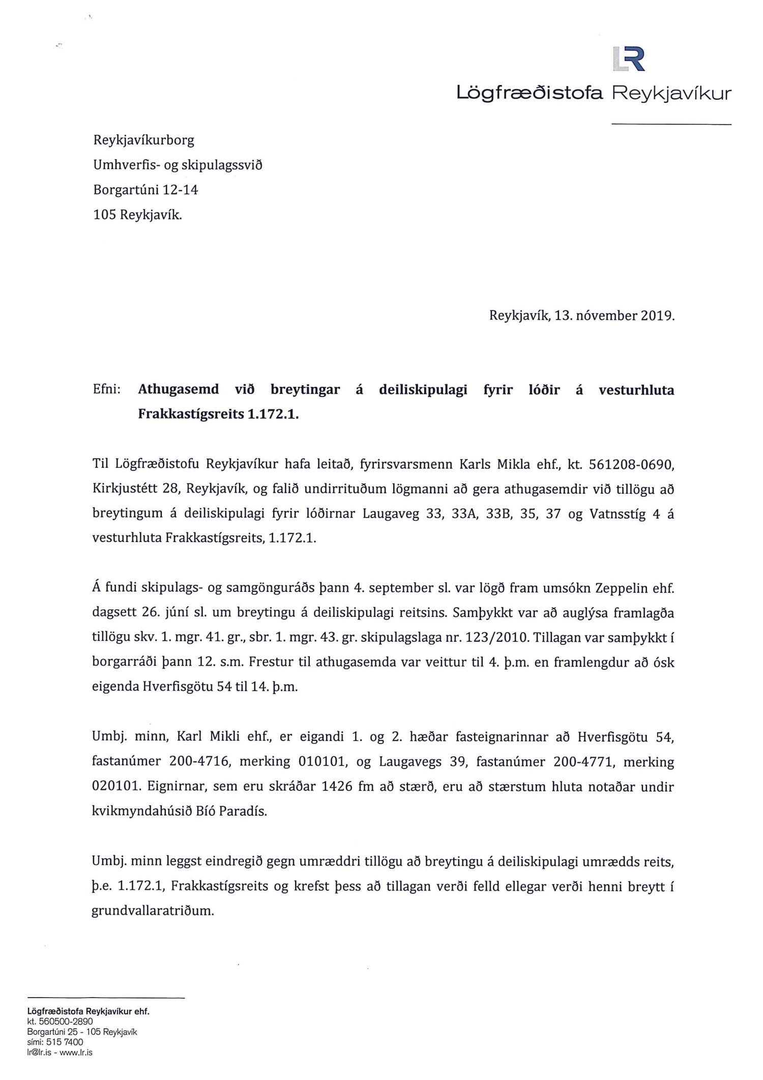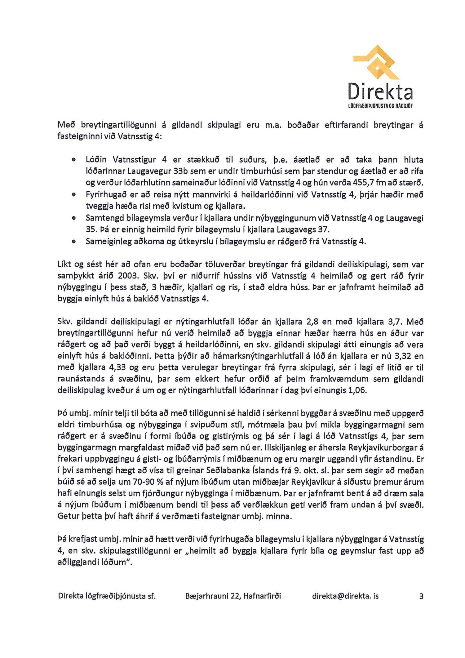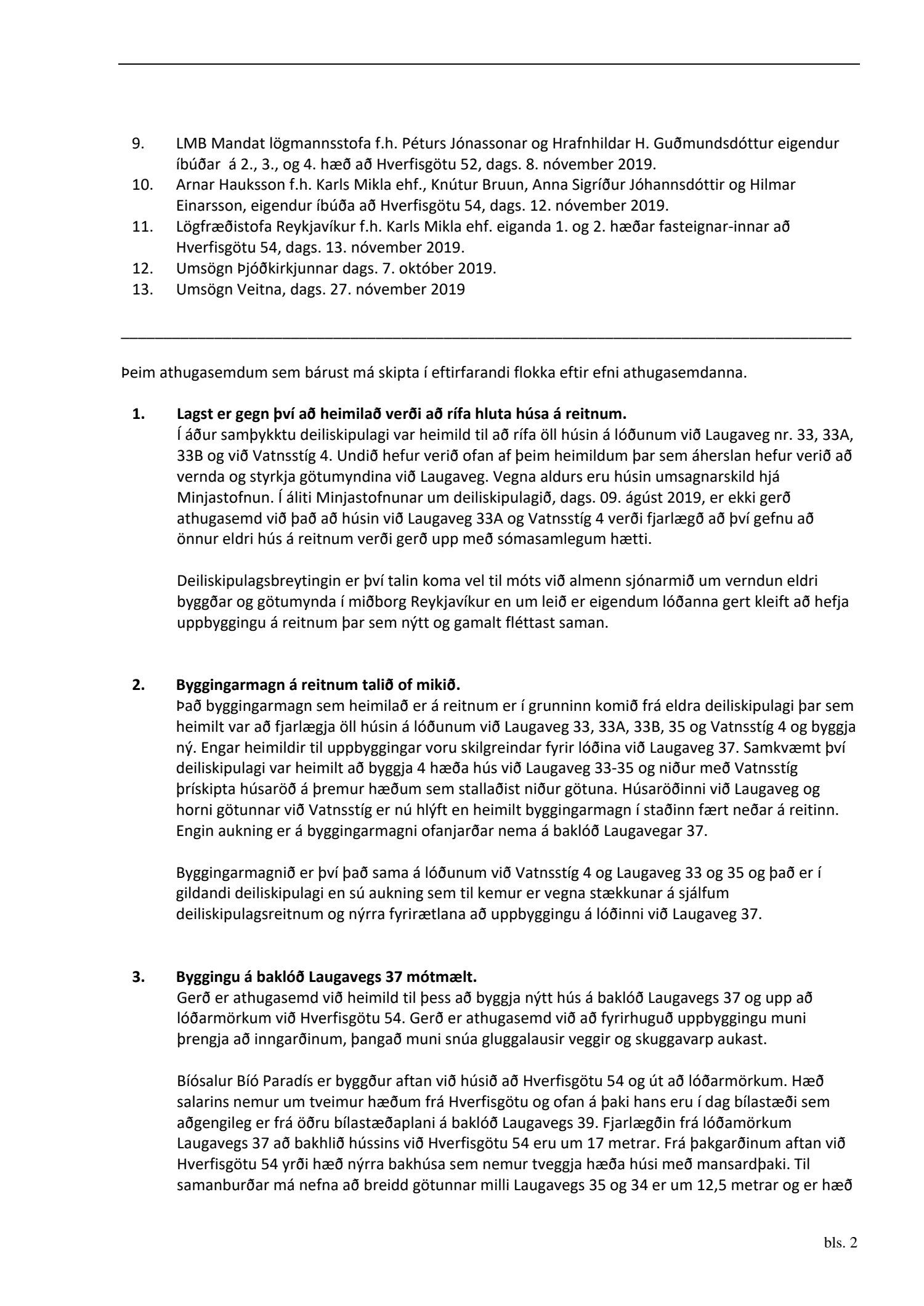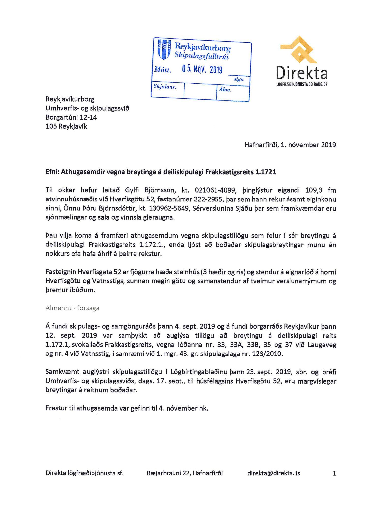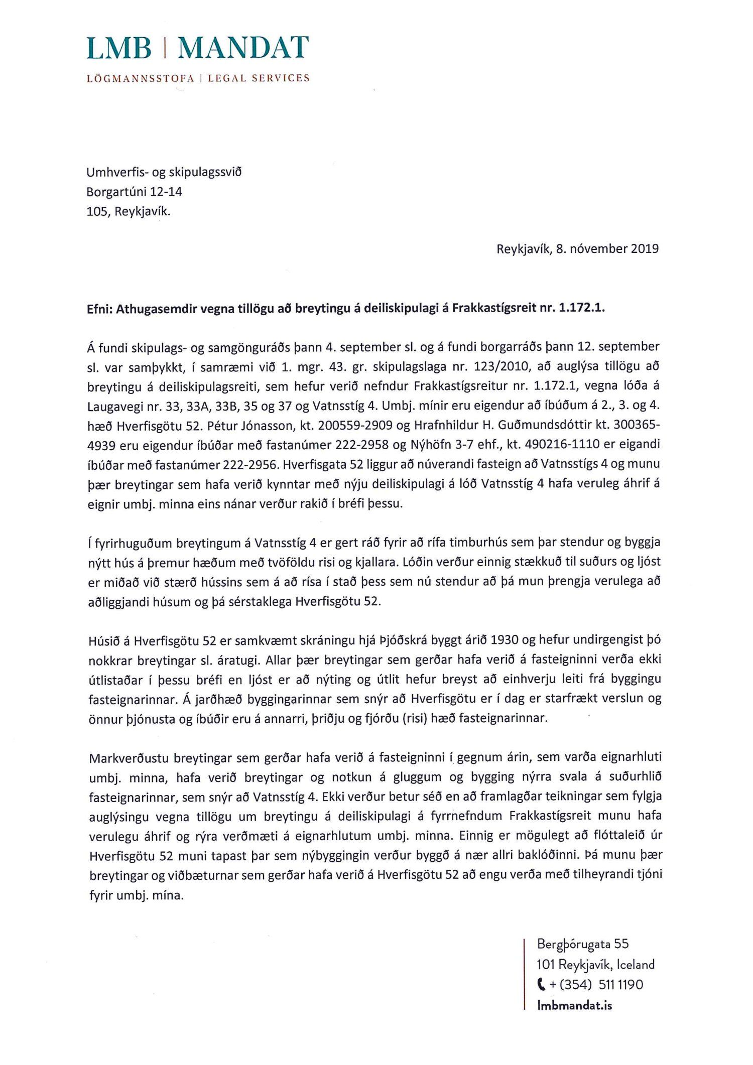 dags. 8. október 2019, Ásmundur Hrafn Sturluson frá Kurt og Pí dags. 30. október 2019, Direkta lögfræðiþjónusta og rágjöf f.h. Gylfa Björnssonar og Önnu Þóru Björnsdóttur dags. 1. nóvember 2019, Lena G. Hákonardóttir dags. 3. nóvember 2019, Valgerður Árnadóttir dags. 4. nóvember 2019, Benóný Ægisson f.h. Íbúasamtaka Miðborgar Reykjavíkur dags. 4. nóvember 2019, Eva María Þórarinsdóttir Lange dags. 4. nóvember 2019, Birna Hrönn Björnsdóttir dags. 4. nóvember 2019, LMB Mandat lögmannsstofa f.h. Péturs Jónassonar og Hrafnhildar H. Guðmundsdóttur eigendur íbúðar með fastanr. 222-2958 og Nýhafnar 3-7 ehf. eiganda íbúðar með fastanr. 222-2956 dags. 8. nóvember 2019,