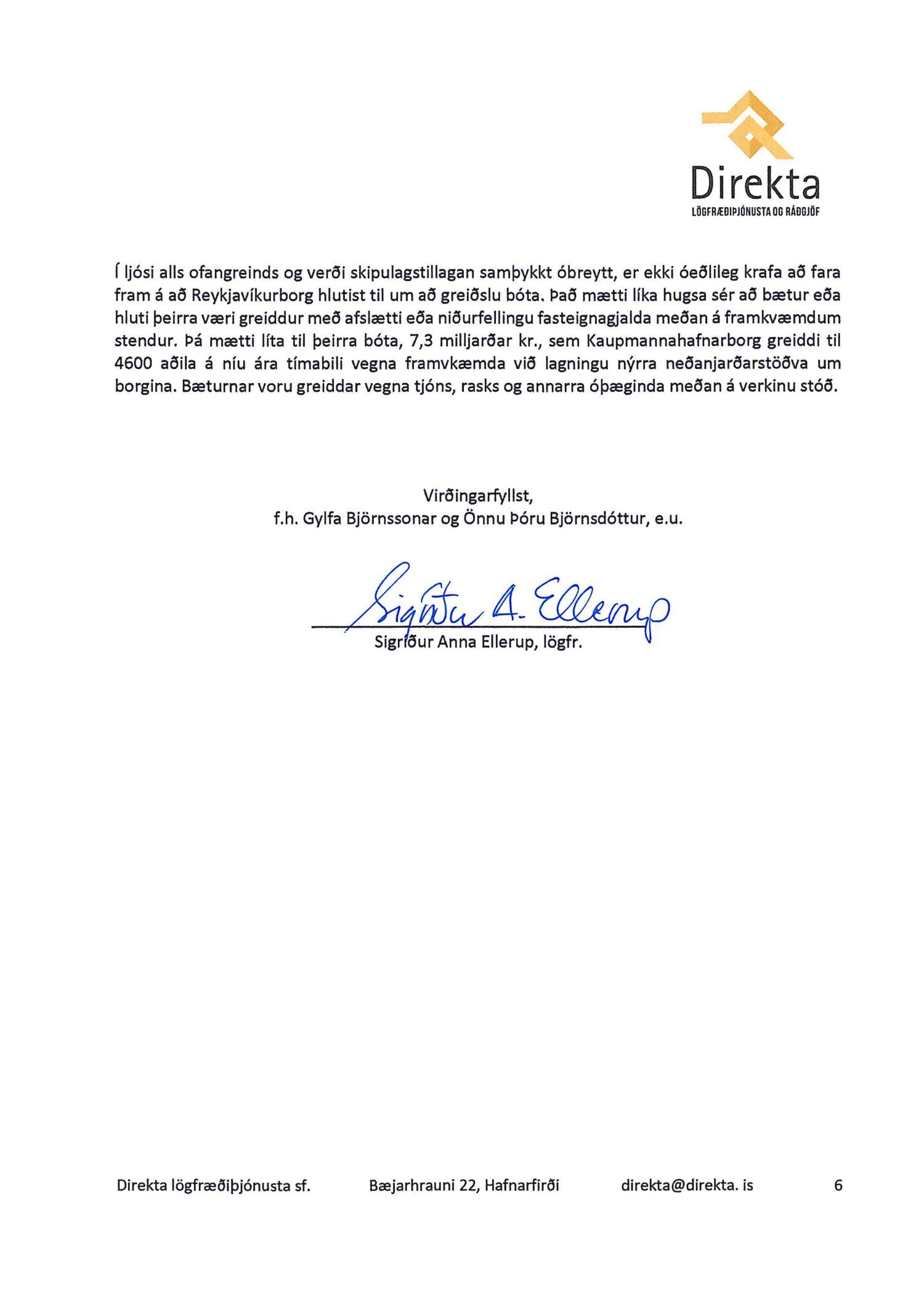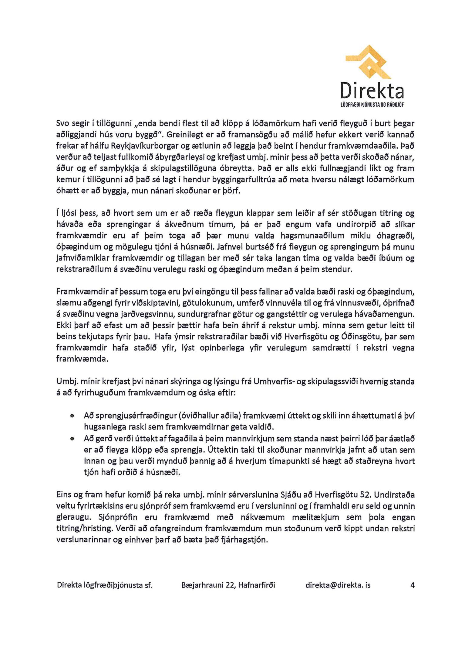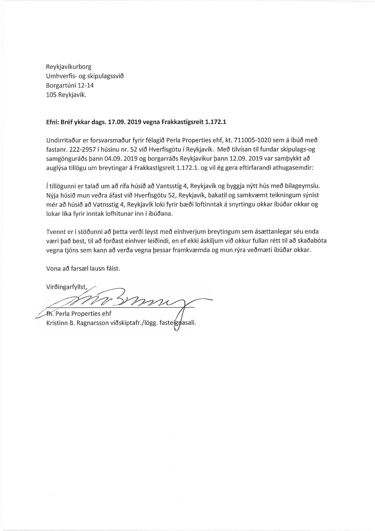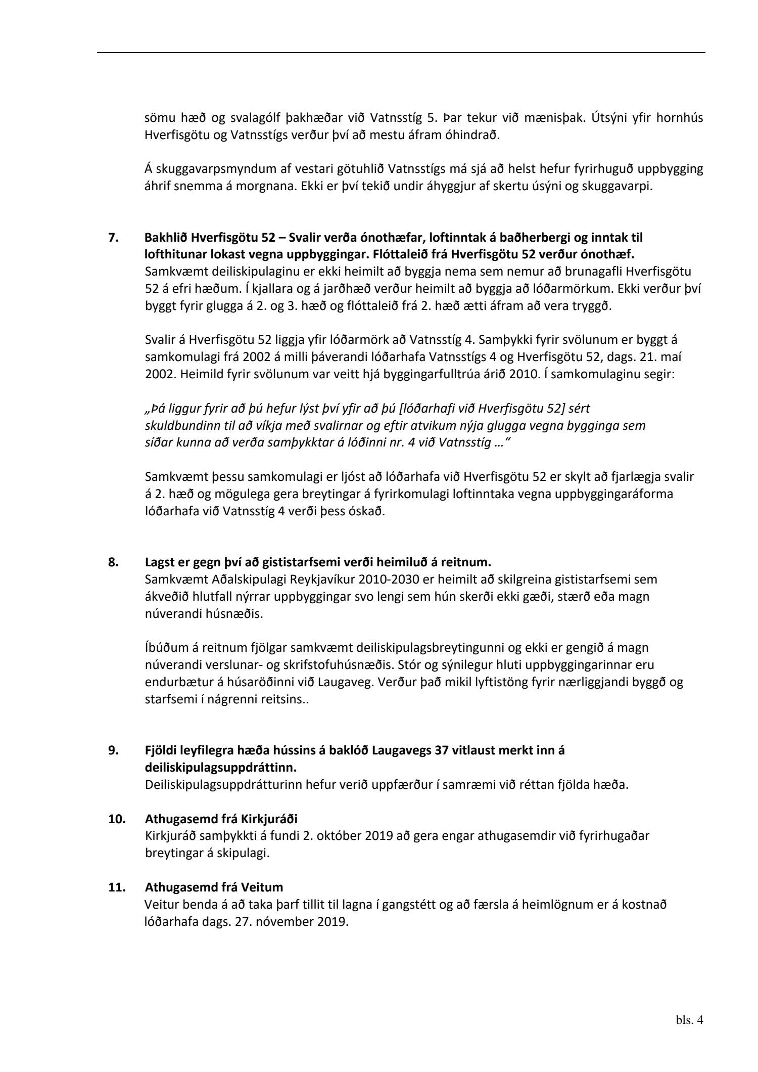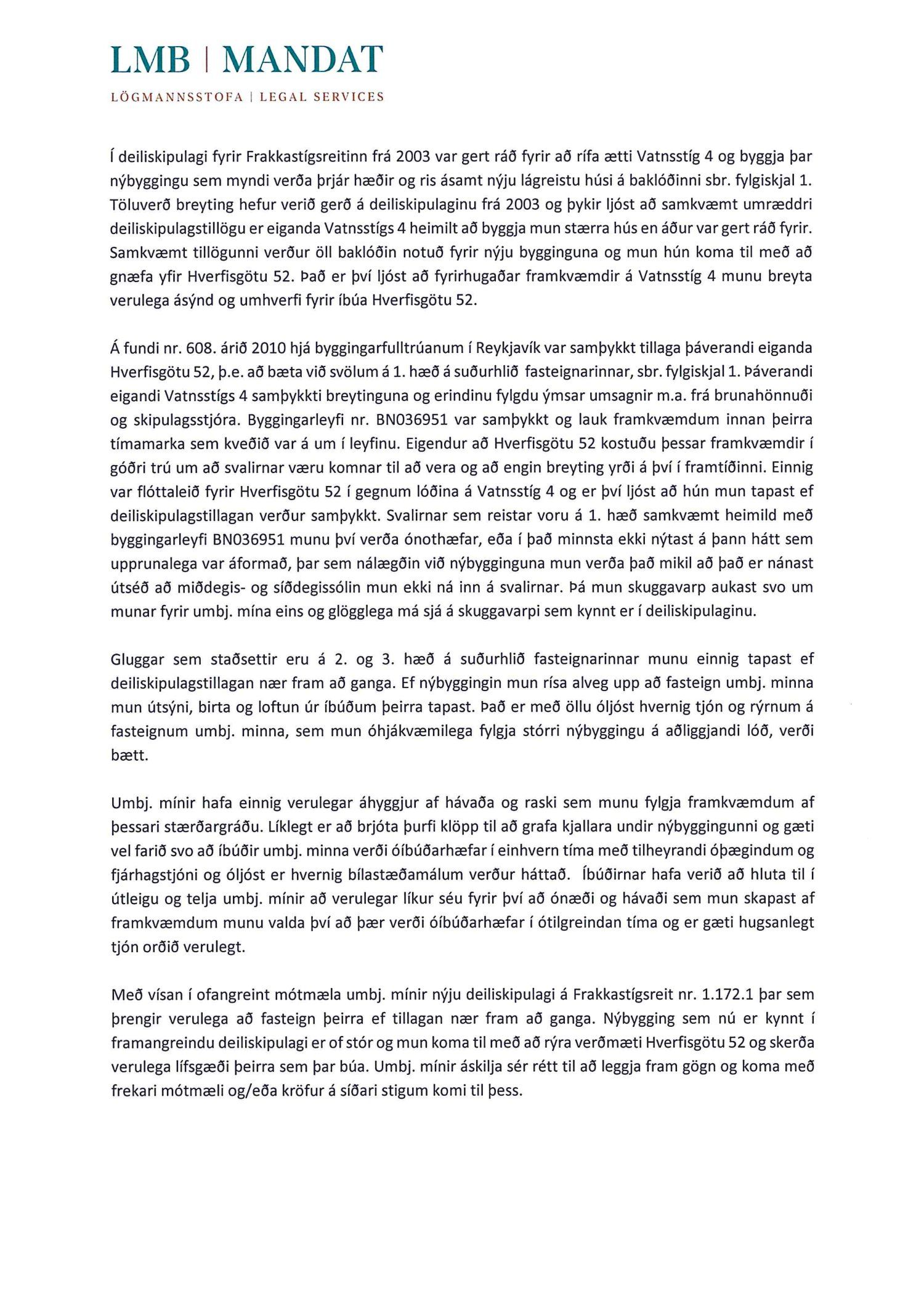 dags. 8. október 2019, Ásmundur Hrafn Sturluson frá Kurt og Pí dags. 30. október 2019, Direkta lögfræðiþjónusta og rágjöf f.h. Gylfa Björnssonar og Önnu Þóru Björnsdóttur dags. 1. nóvember 2019, Lena G. Hákonardóttir dags. 3. nóvember 2019, Valgerður Árnadóttir dags. 4. nóvember 2019, Benóný Ægisson f.h. Íbúasamtaka Miðborgar Reykjavíkur dags. 4. nóvember 2019, Eva María Þórarinsdóttir Lange dags. 4. nóvember 2019, Birna Hrönn Björnsdóttir dags. 4. nóvember 2019, LMB Mandat lögmannsstofa f.h. Péturs Jónassonar og Hrafnhildar H. Guðmundsdóttur eigendur íbúðar með fastanr. 222-2958 og Nýhafnar 3-7 ehf. eiganda íbúðar með fastanr. 222-2956 dags. 8. nóvember 2019,