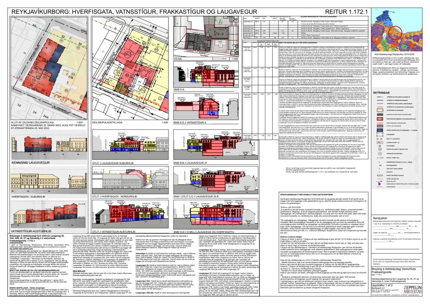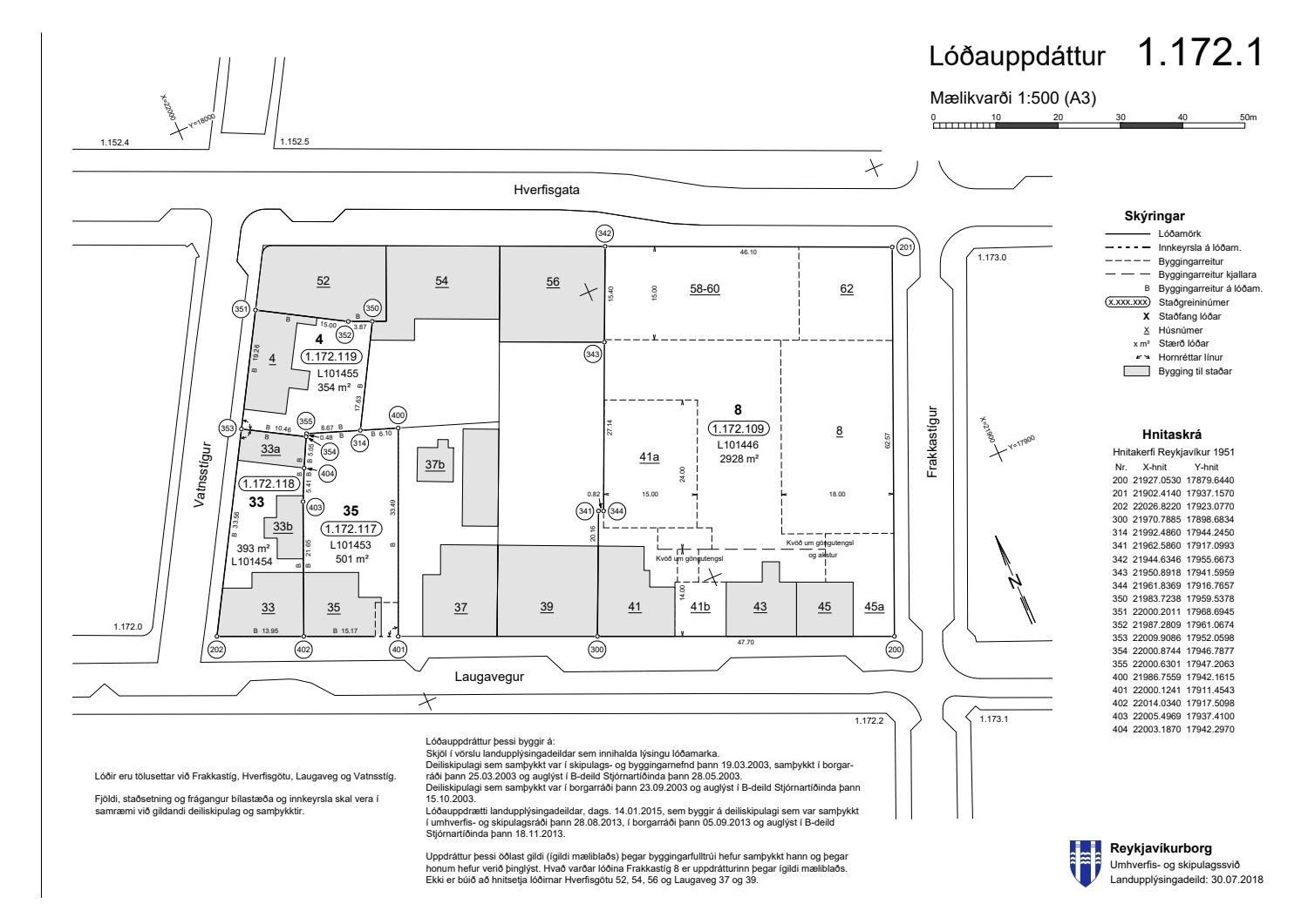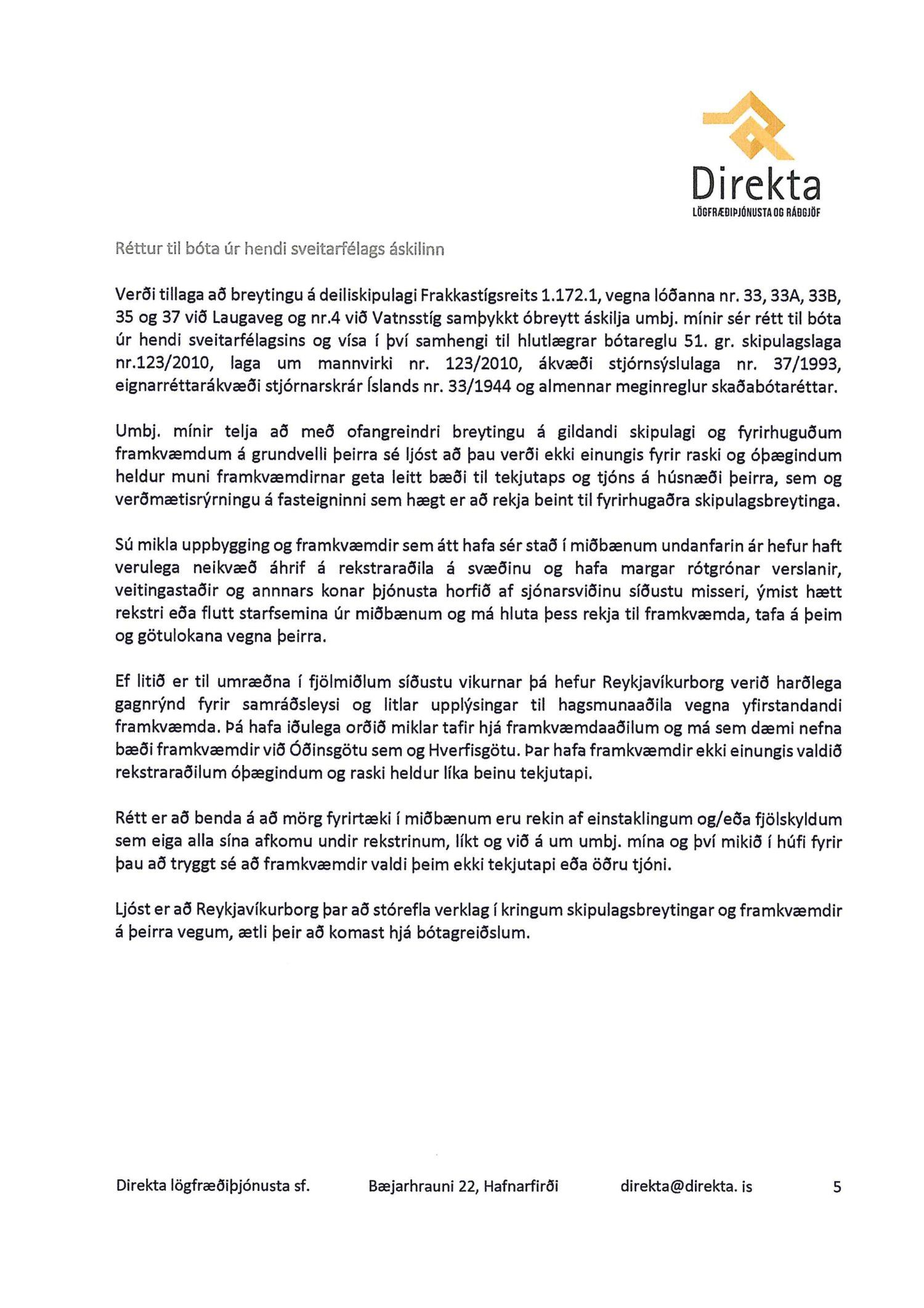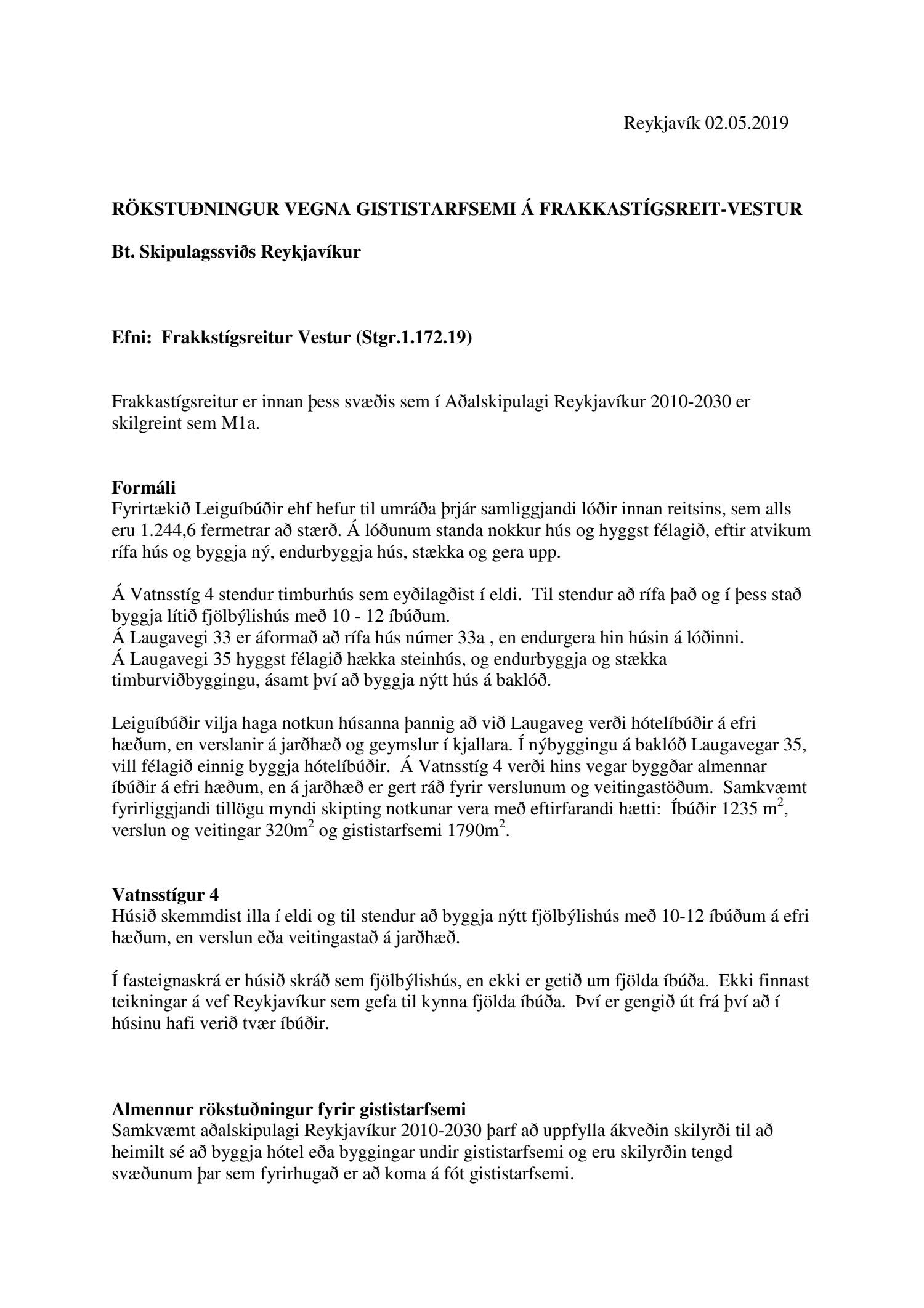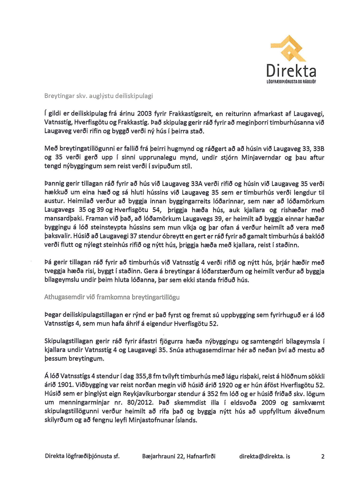 dags. 26. júní 2019 um breytingu á deiliskipulagi reits 1.172.1, Frakkastígsreits, vegna lóðanna nr. 33, 33A, 33B, 35 og 37 við Laugaveg og 4 við Vatnsstíg. Í breytingunni felst að húsin á Laugavegi 33, 33B og 35 verði gerð upp í upprunalegri mynd, heimilað verði að rífa Laugaveg 33A, húsin við Laugaveg 35 verði hækkuð um eina hæð, timburhúsið að Laugavegi 35 verði lengt til austurs og leyft verði að byggja fjórlyft hús á baklóð. Húsið að Laugavegi 37, sem stendur við götu helst óbreytt, en gert er ráð fyrir að gamalt timburhús á baklóð Laugavegs 37 verði flutt, nýlegt steinhús á baklóð rifið og nýtt hús, þriggja hæða með kjallara, reist í staðinn. Einnig er gert ráð fyrir að timburhúsið við Vatnsstíg 4 verði rifið og nýtt hús, þrjár hæðir með tveggja hæða risi, byggt í staðinn. Deiliskipulagið heimilar byggingu bílageymslu undir þeim hluta lóðanna, þar sem ekki standa friðuð hús. Breytingar verða á lóðarstærðum samkvæmt deiliskipulagsuppdr.