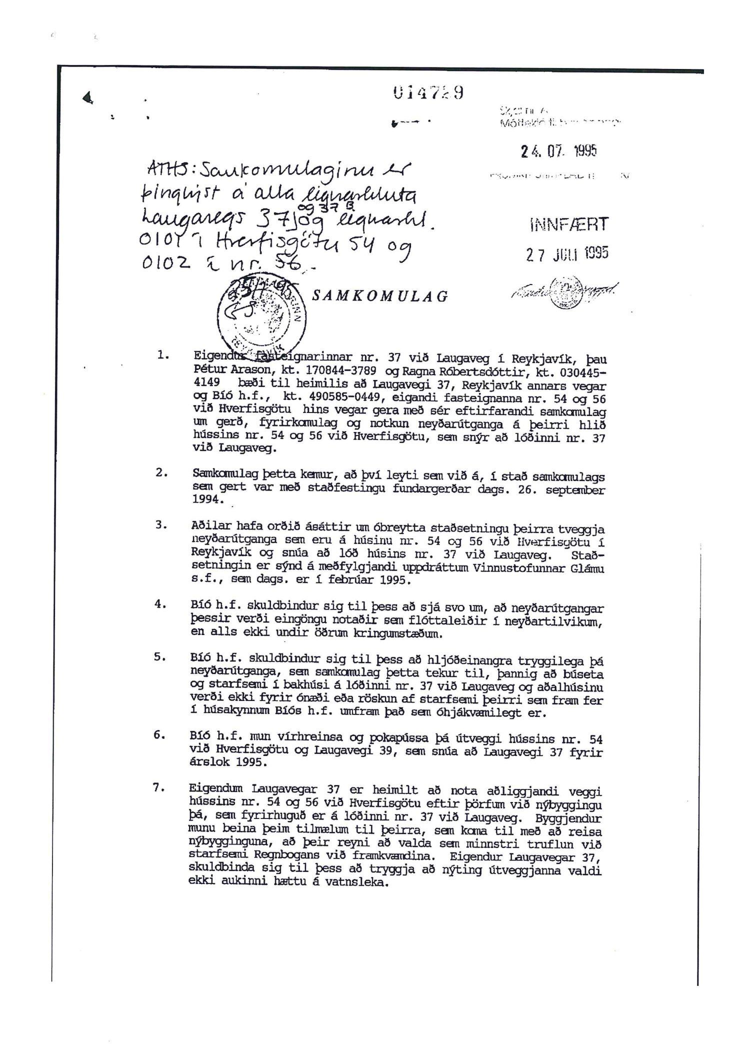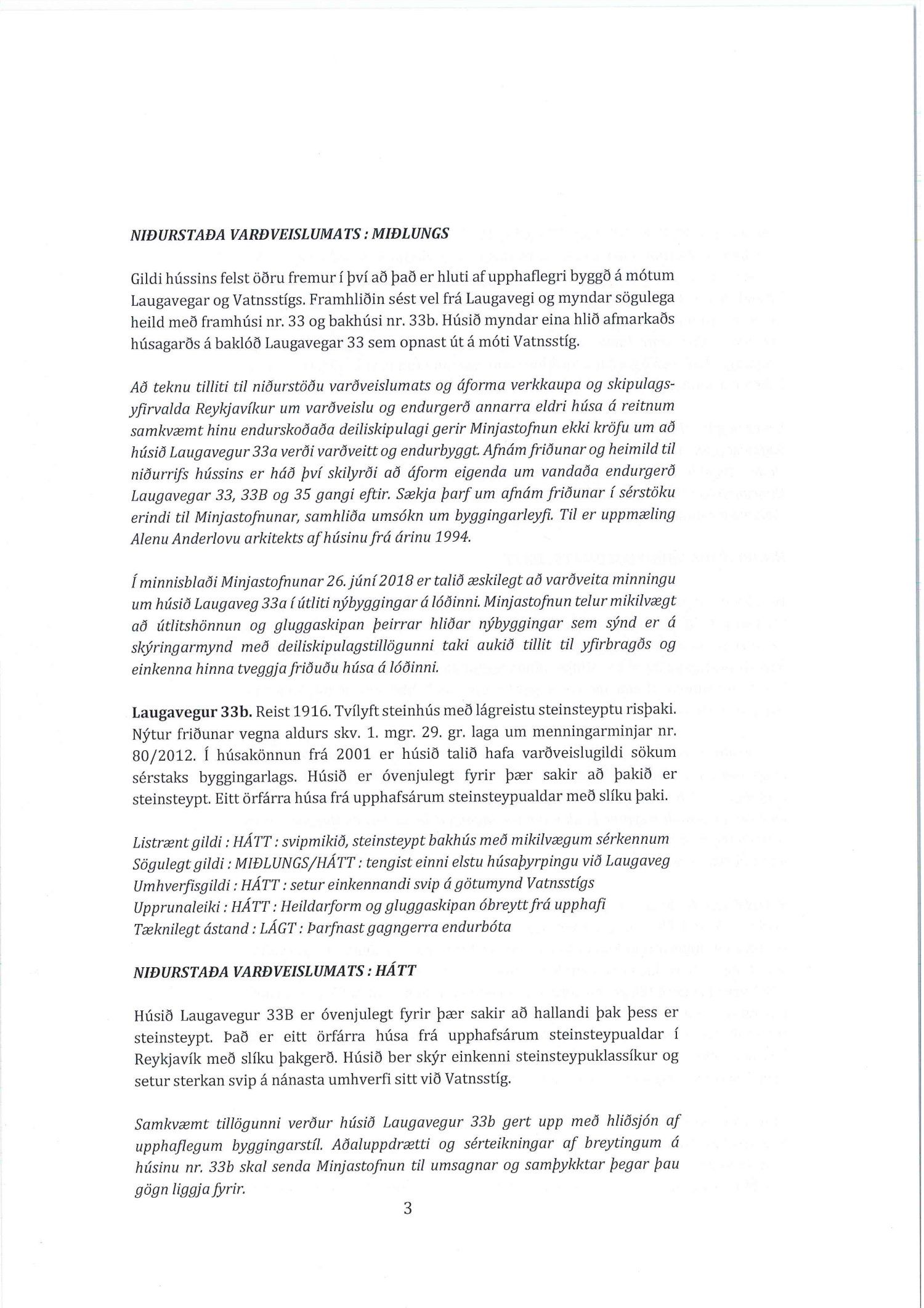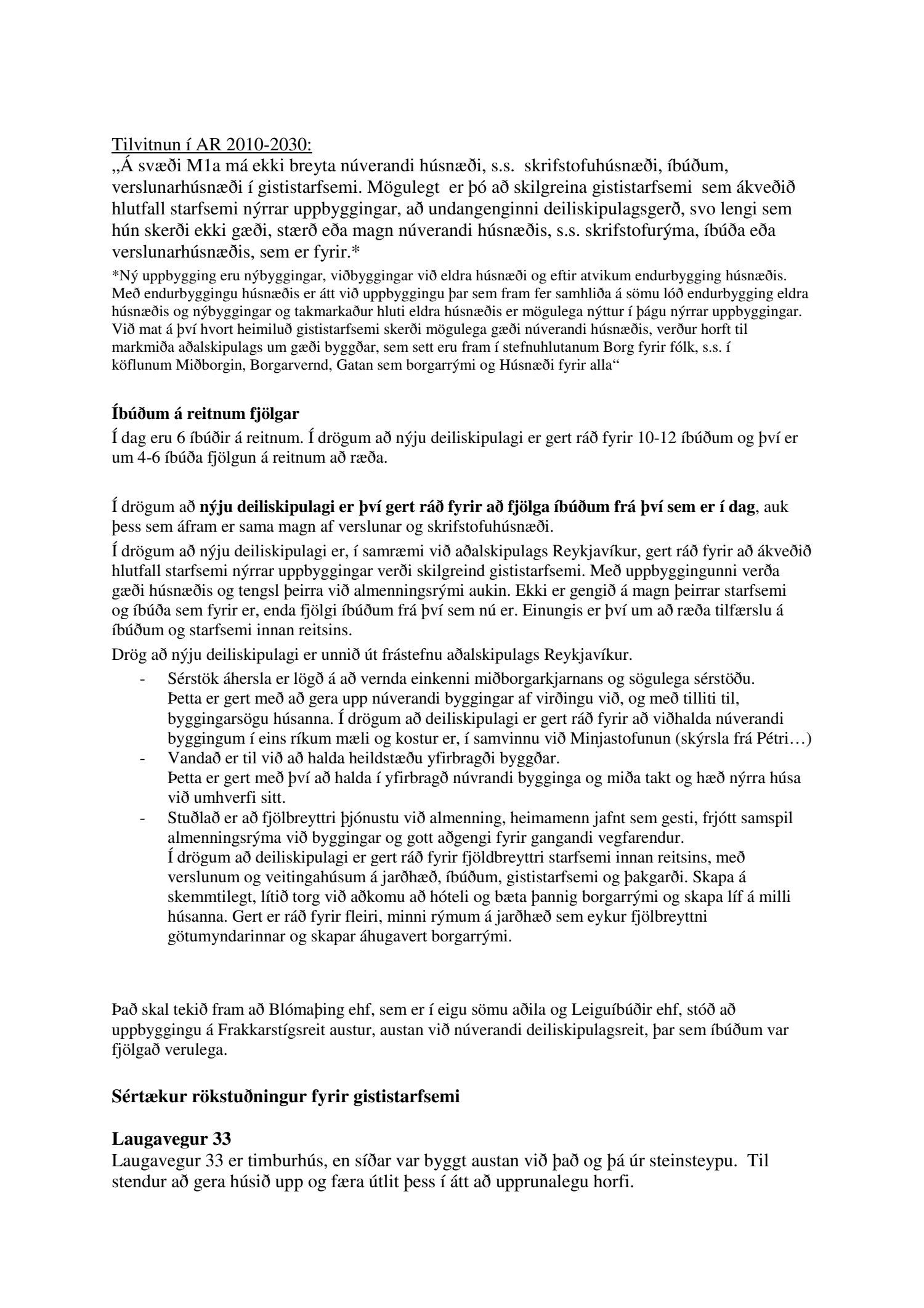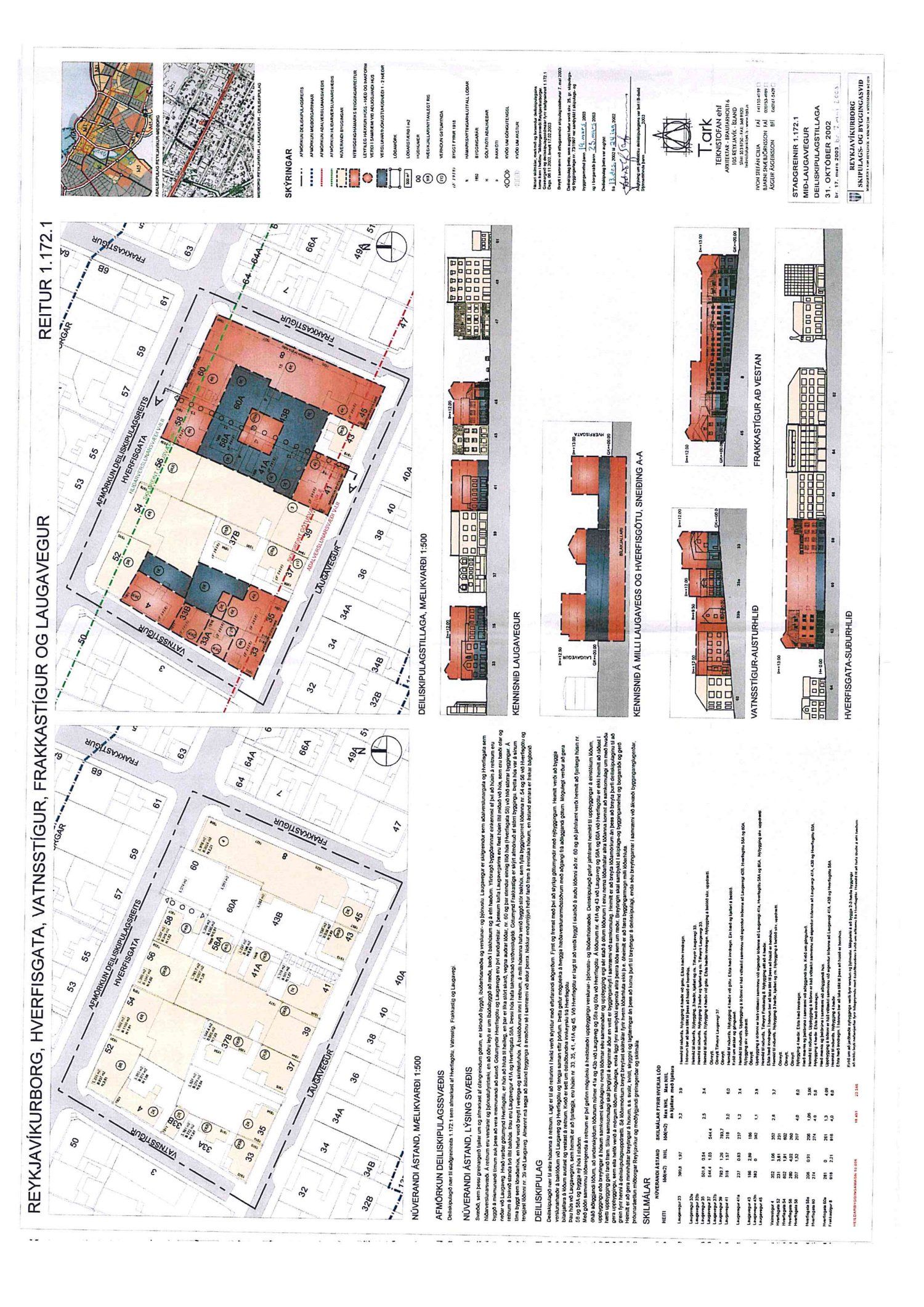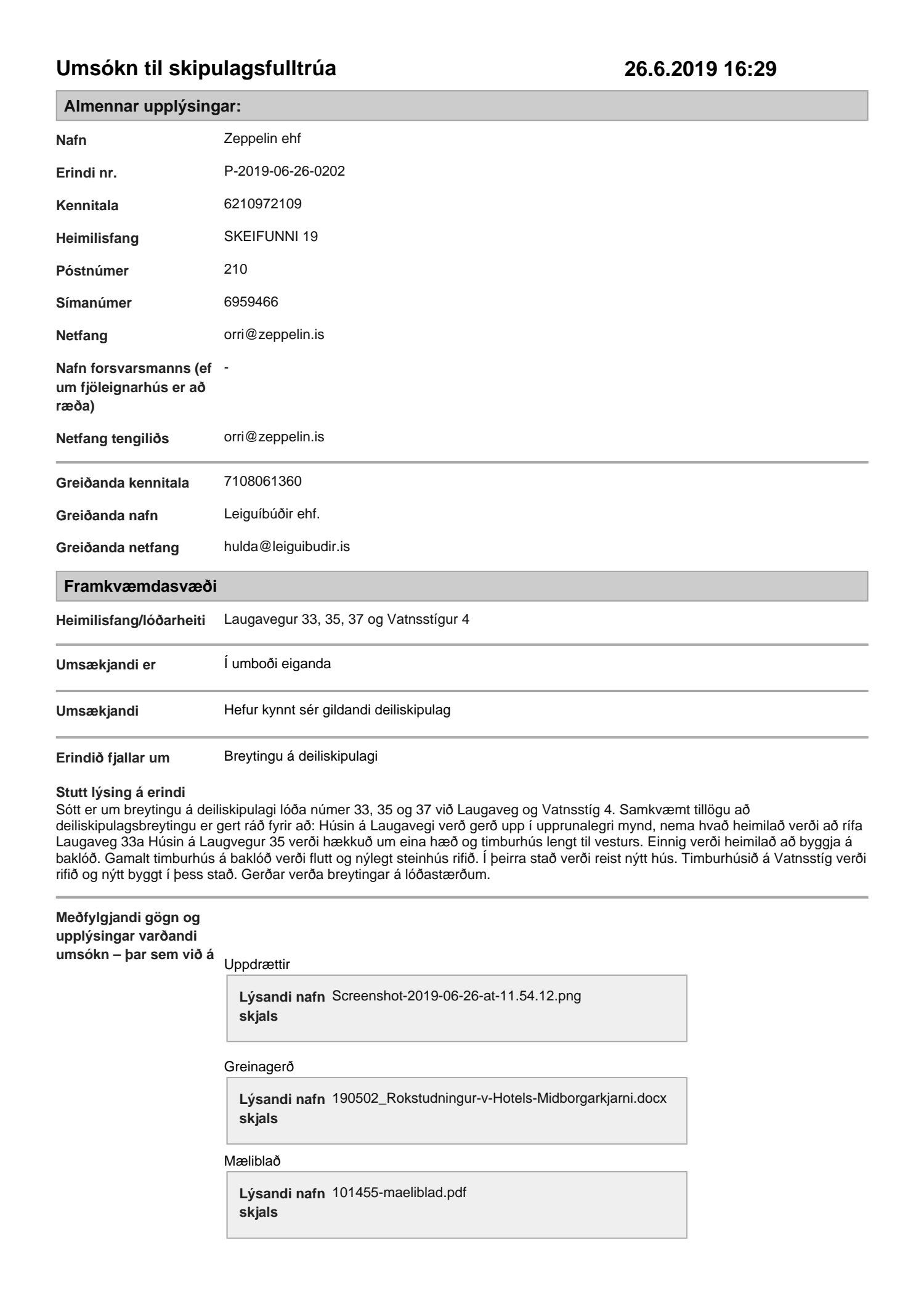 dags. 26. júní 2019 um breytingu á deiliskipulagi reits 1.172.1, Frakkastígsreits, vegna lóðanna nr. 33, 33A, 33B, 35 og 37 við Laugaveg og 4 við Vatnsstíg. Í breytingunni felst að húsin á Laugavegi 33, 33B og 35 verði gerð upp í upprunalegri mynd, heimilað verði að rífa Laugaveg 33A, húsin við Laugaveg 35 verði hækkuð um eina hæð, timburhúsið að Laugavegi 35 verði lengt til austurs og leyft verði að byggja fjórlyft hús á baklóð. Húsið að Laugavegi 37, sem stendur við götu helst óbreytt, en gert er ráð fyrir að gamalt timburhús á baklóð Laugavegs 37 verði flutt, nýlegt steinhús á baklóð rifið og nýtt hús, þriggja hæða með kjallara, reist í staðinn. Einnig er gert ráð fyrir að timburhúsið við Vatnsstíg 4 verði rifið og nýtt hús, þrjár hæðir með tveggja hæða risi, byggt í staðinn. Deiliskipulagið heimilar byggingu bílageymslu undir þeim hluta lóðanna, þar sem ekki standa friðuð hús. Breytingar verða á lóðarstærðum samkvæmt deiliskipulagsuppdr.