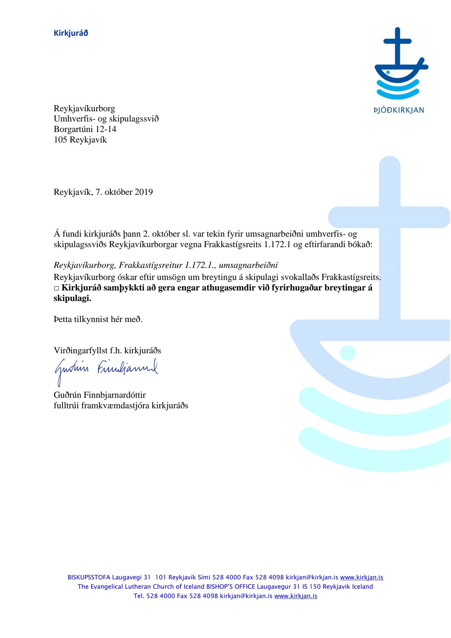 , Knútur Bruun, Anna Sigríður Jóhannsdóttir og Hilmar Einarsson dags. 12. nóvember 2019 og Lögfræðistofa Reykjavíkur f.h. Karls Mikla ehf. dags. 13. nóvember 2019. Einnig er lögð fram umsögn Þjóðkirkjunnar dags. 7. október 2019 og umsögn skipulagsfulltrúa, dags. 13. mars 2020.