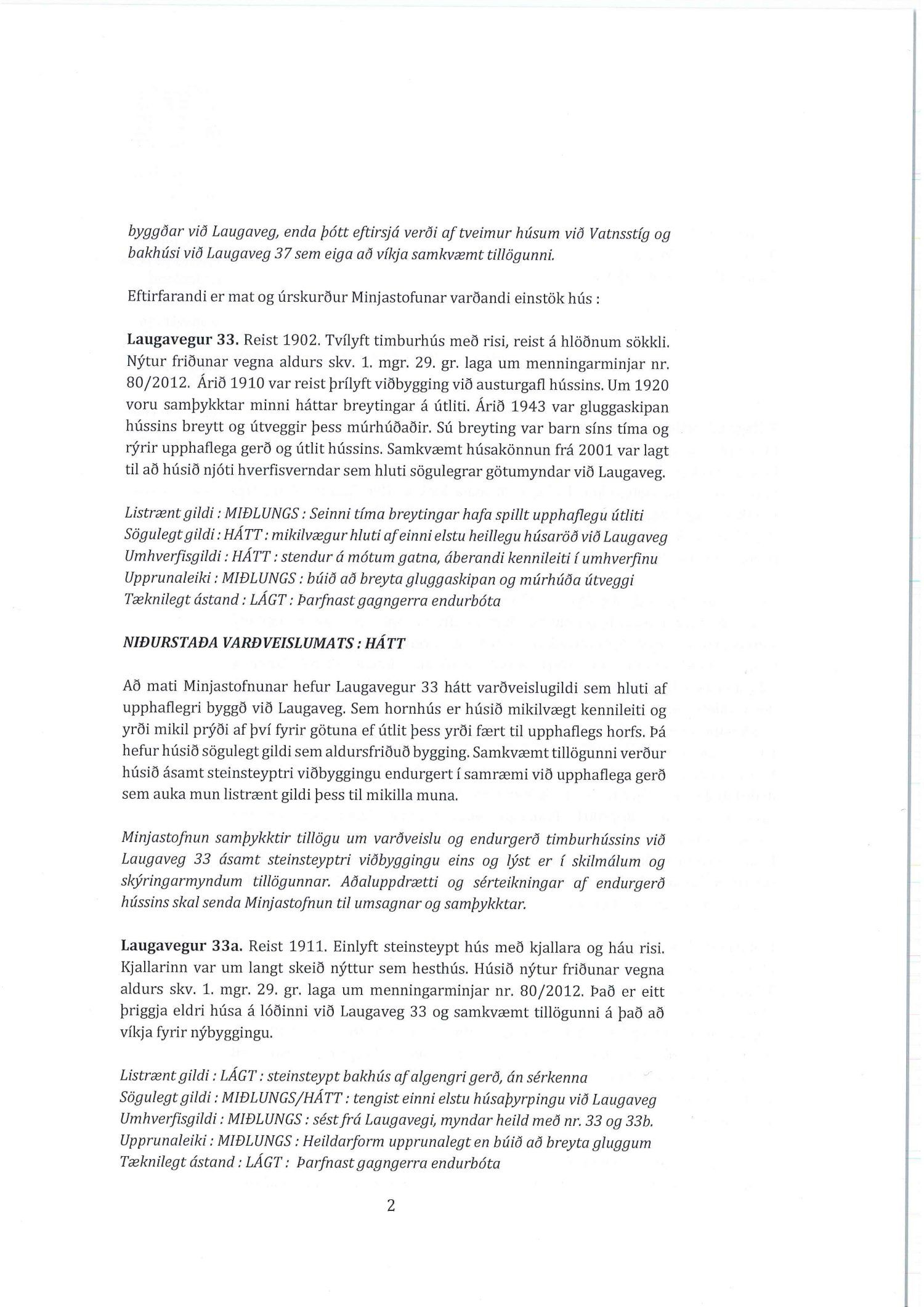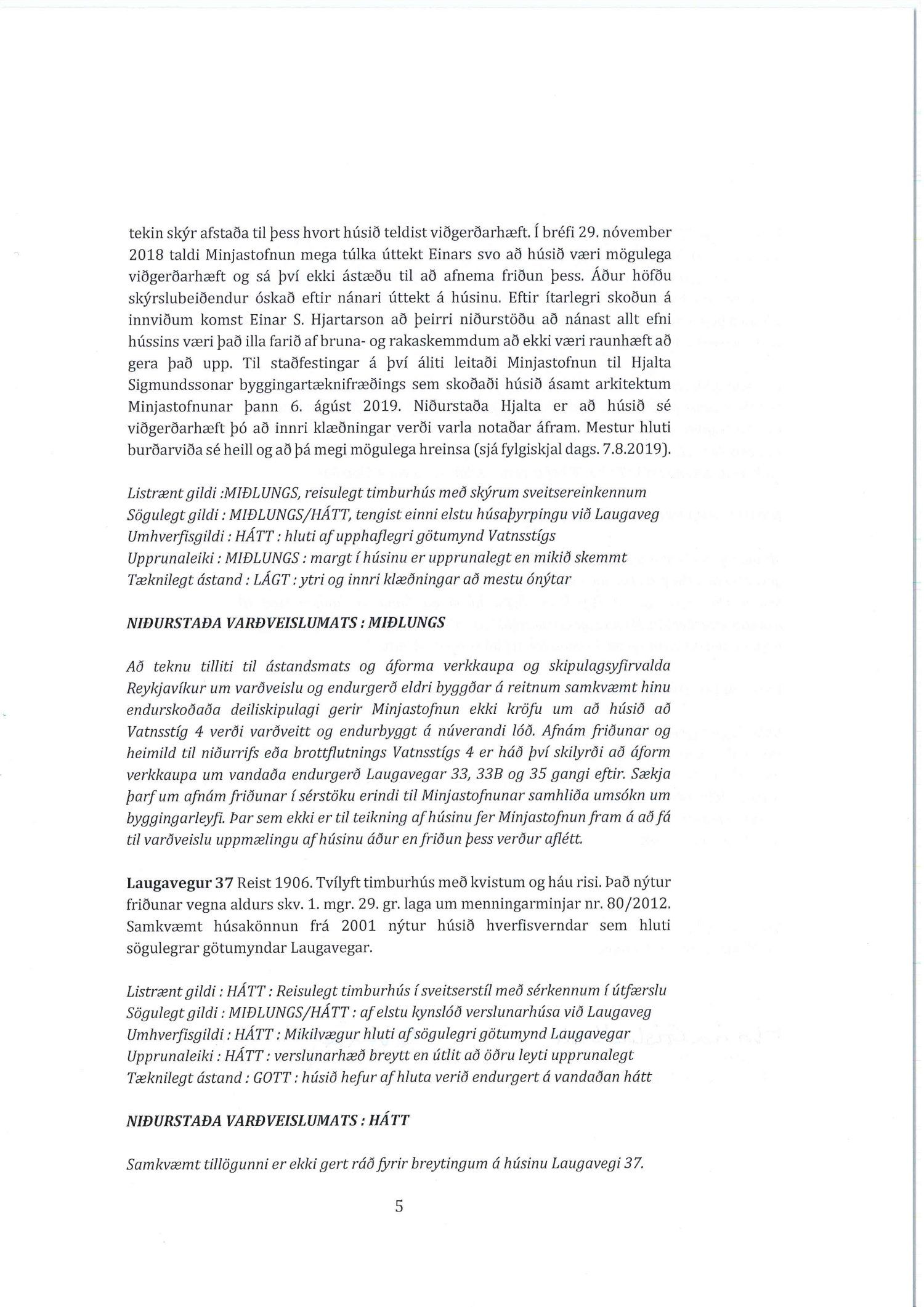 dags 28. júní 2019, lagfært 22. ágúst 2019. Einnig er lagt fram umboðsbréf og rökstuðning fyrir hóteli ásamt mæli- og hæðarblaði. Einnig er sótt er um breytingu á deiliskipulagi lóða númer 33, 35 og 37 við Laugaveg og Vatnsstíg 4. Gert er ráð fyrir að húsin á Laugavegi verð gerð upp, nema hvað heimilað verði að rífa Laugaveg 33a. Húsin við Laugaveg 35 verði hækkuð um eina hæð og timburhús lengt til vesturs. Einnig verði heimilað að byggja á baklóð. Gamalt timburhús á baklóð Laugavegs 37 verði flutt og nýlegt steinhús rifið. Í þeirra stað verði reist nýtt hús. Timburhúsið á Vatnsstíg verði rifið og nýtt byggt í þess stað. Gerðar verða breytingar á lóðastærðum. Einnig er lagt fram álit Minjastofnunnar dags. 9. ágúst 2019.