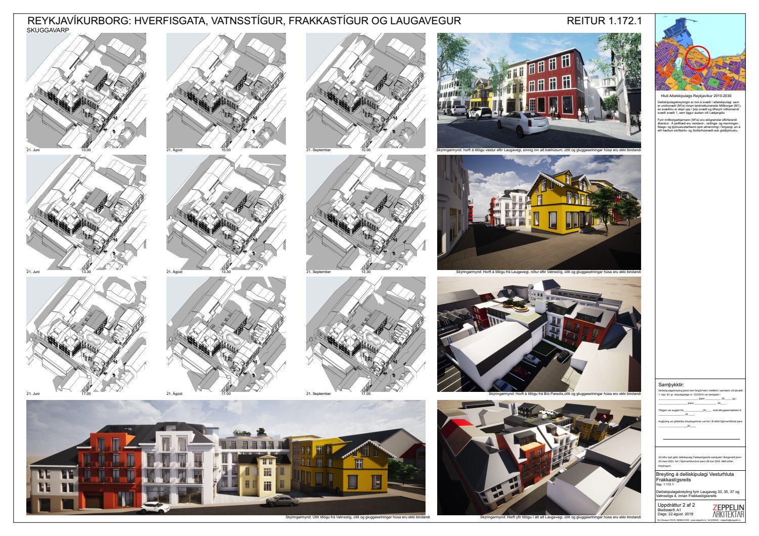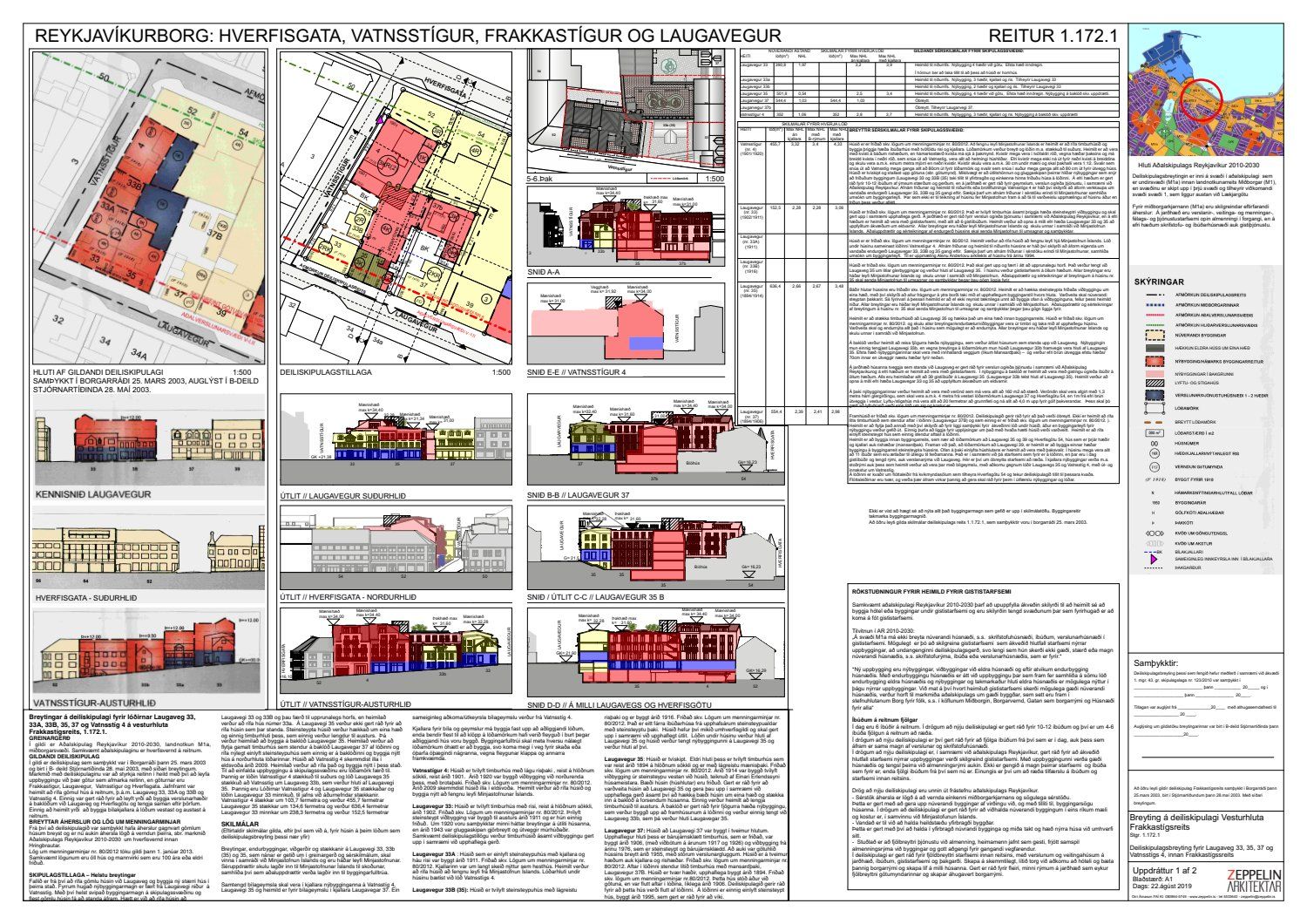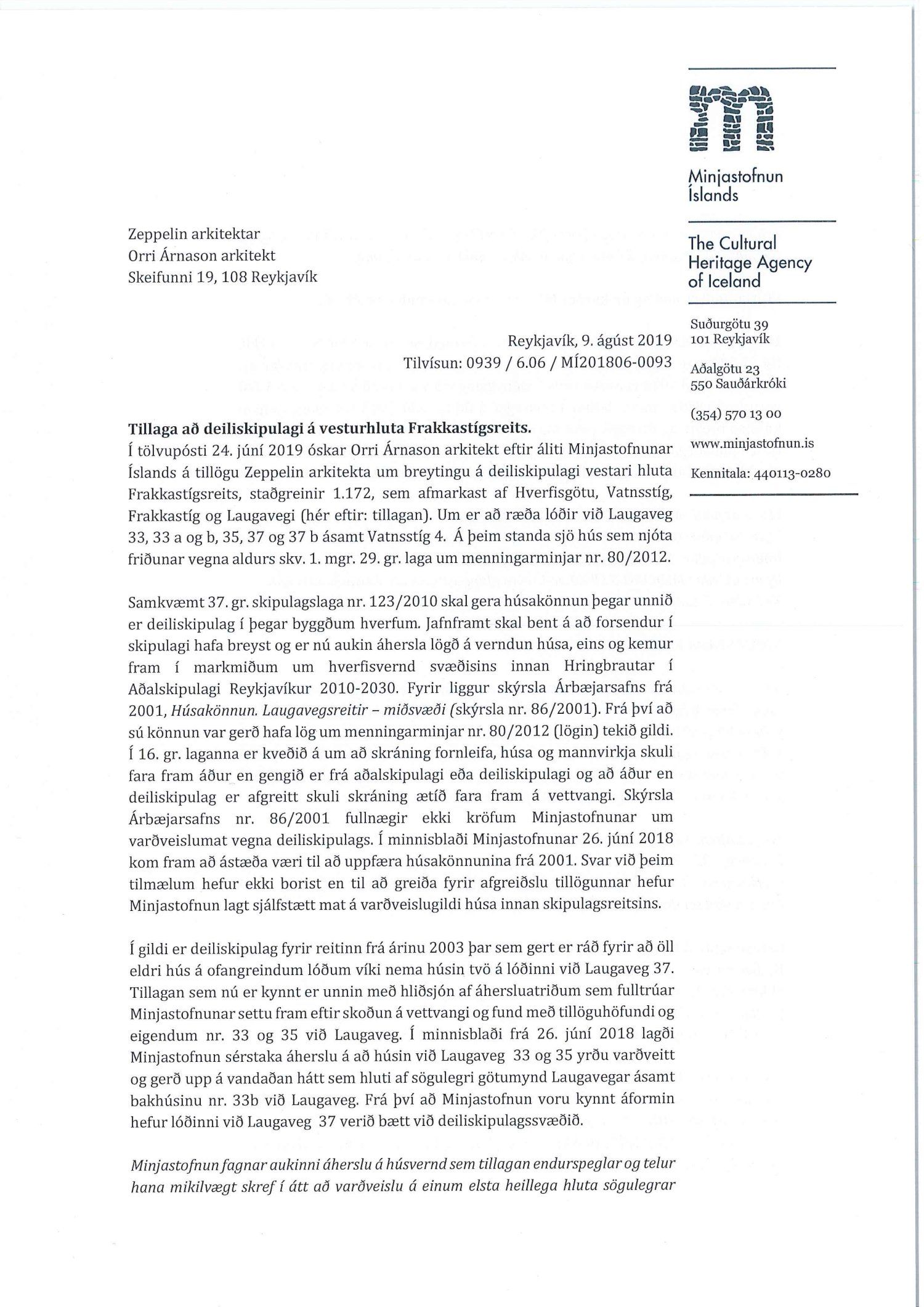 dags. 26. júní 2019 um breytingu á deiliskipulagi reits 1.172.1, Frakkastígsreits, vegna lóðanna nr. 33, 35 og 37 við Laugaveg og 4 við Vatnsstíg. Í breytingunni felst að húsin við Laugaveg verði gerð upp í upprunalegri mynd, heimilað verði að rífa Laugaveg 33A, húsin við Laugaveg 35 verði hækkuð um eina hæð og timburhús lengt til vesturs, heimilað verði að byggja á baklóð, gamalt timburhús verði flutt og nýlegt steinhús rifið og nýtt hús reist í staðinn, timburhúsið við Vatnsstíg 4 verði rifið og byggt nýtt hús í staðinn ásamt breytingum á lóðarstærðum samkvæmt uppdrætti