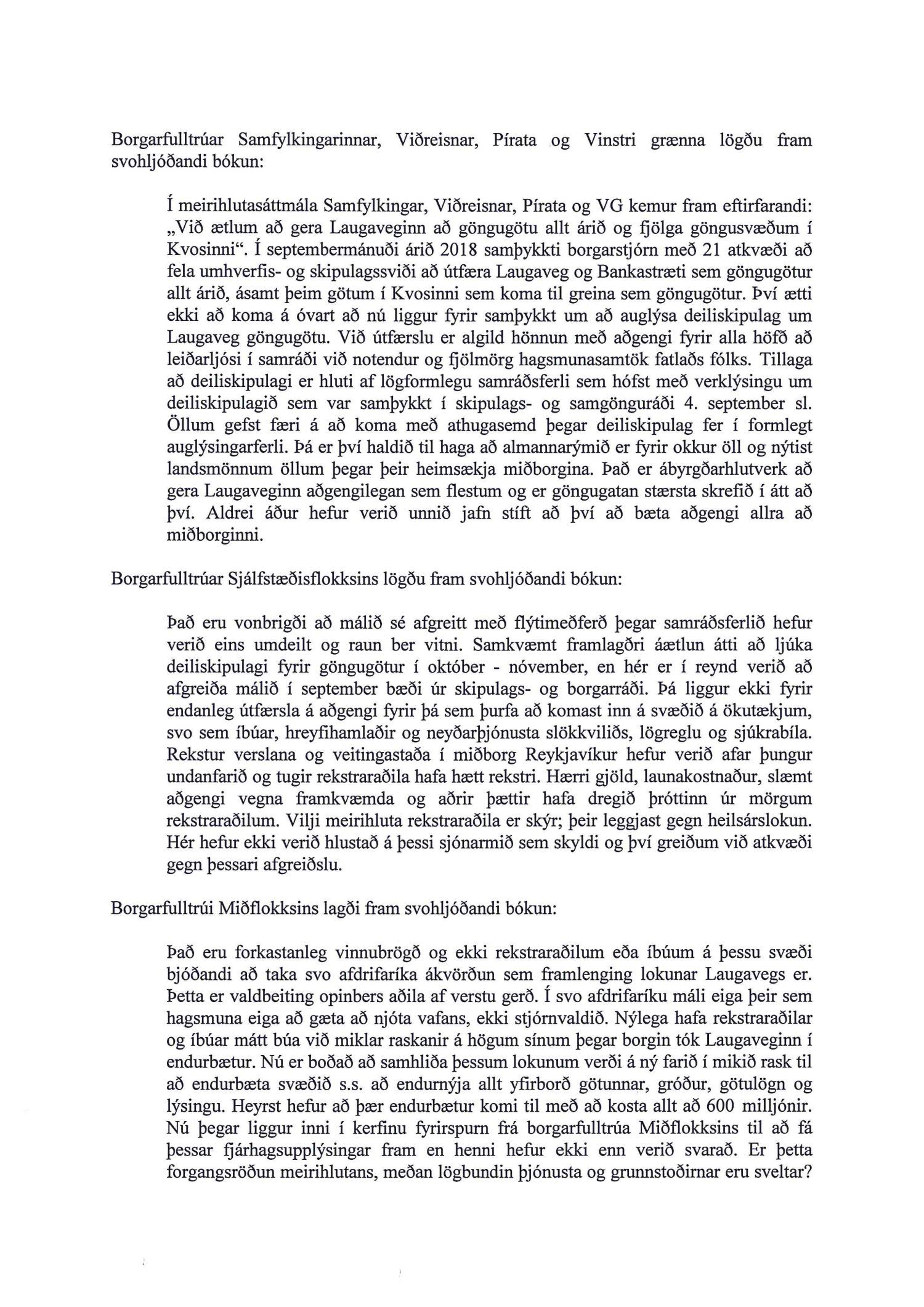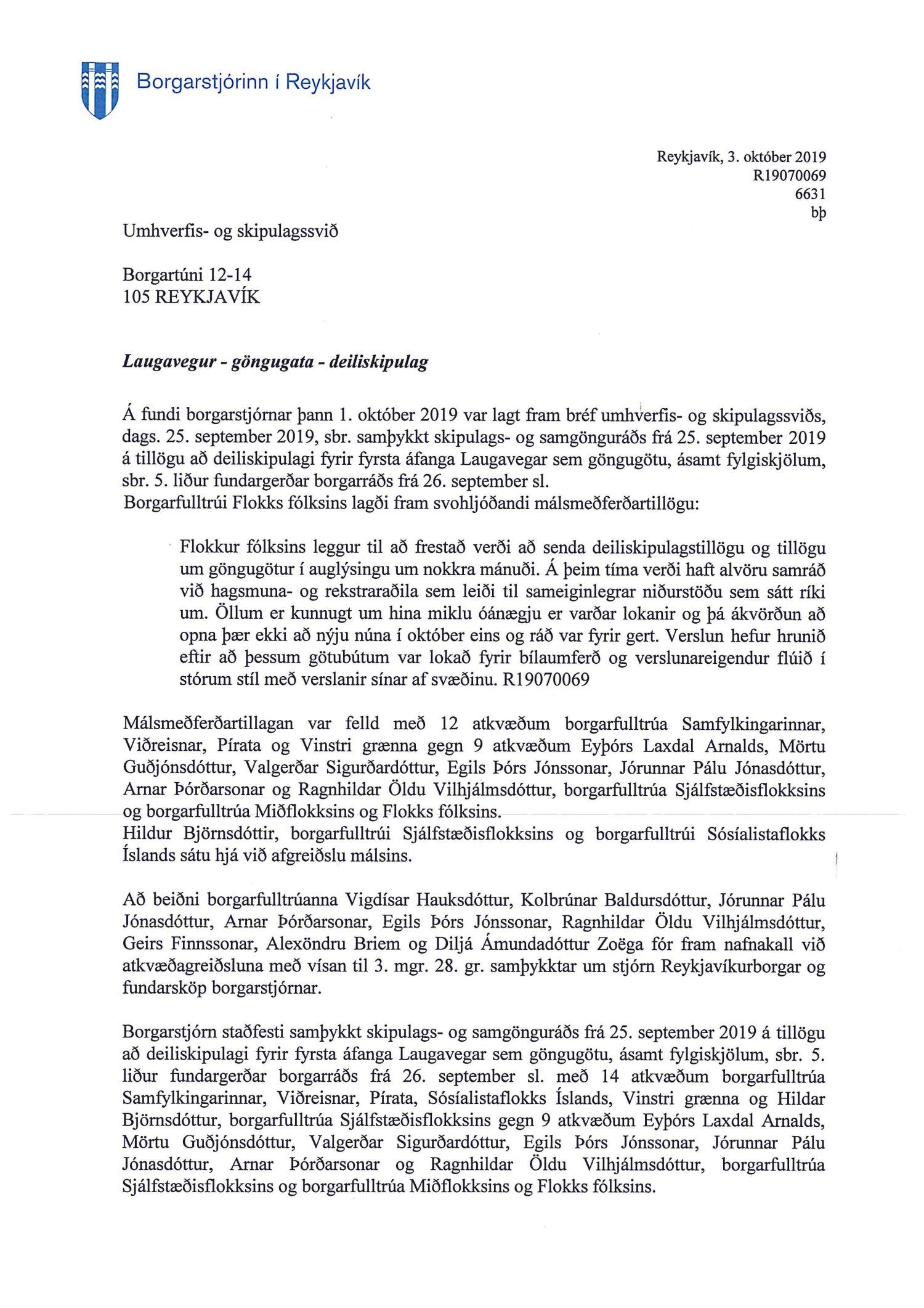 Lagt fram bréf borgarstjóra dags. 3. október 2019 vegna samþykktar borgarstjórnar frá 1. október 2019 á tillögu að deiliskipulagi fyrir 1. áfanga Laugavegar sem göngugötu.