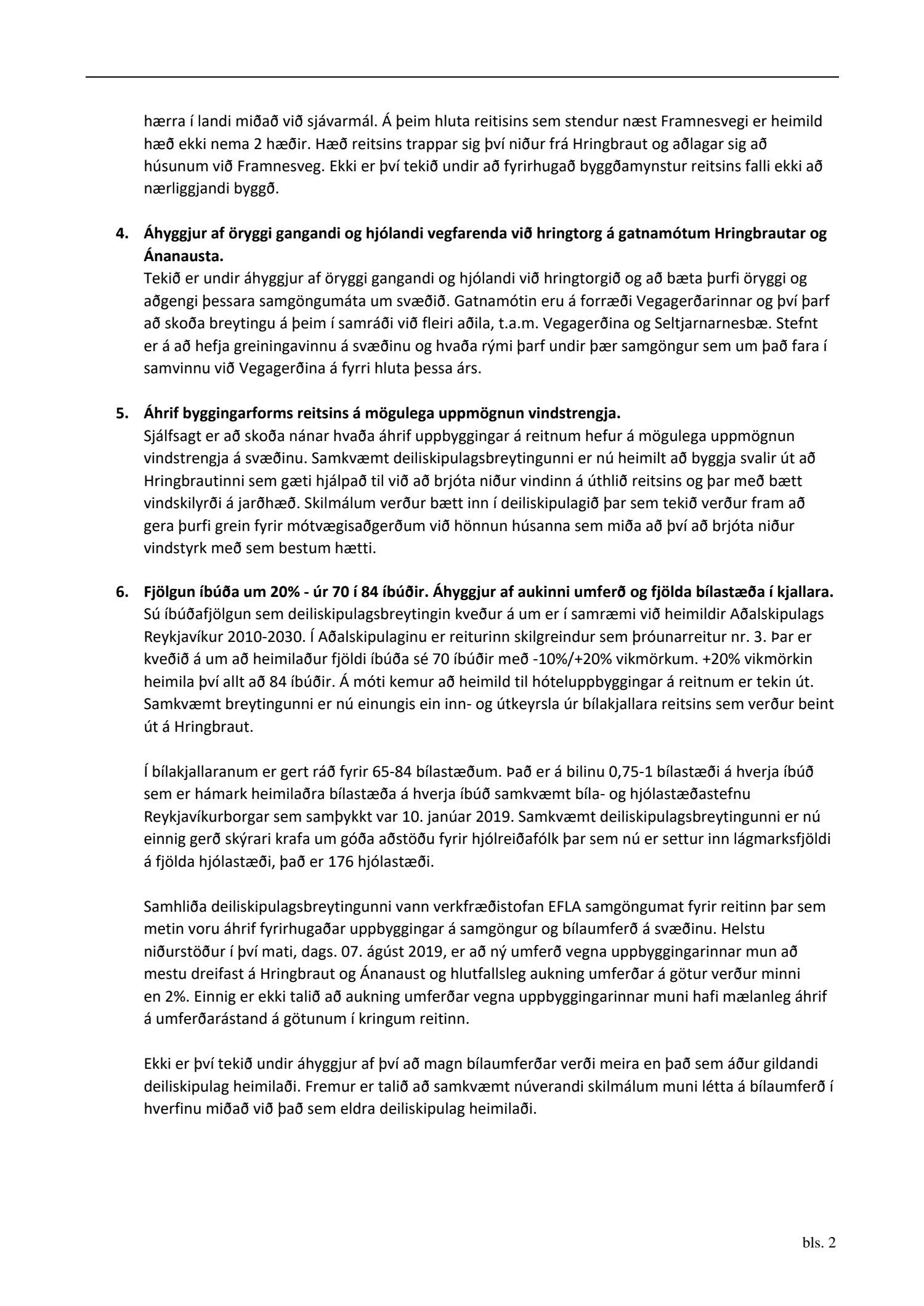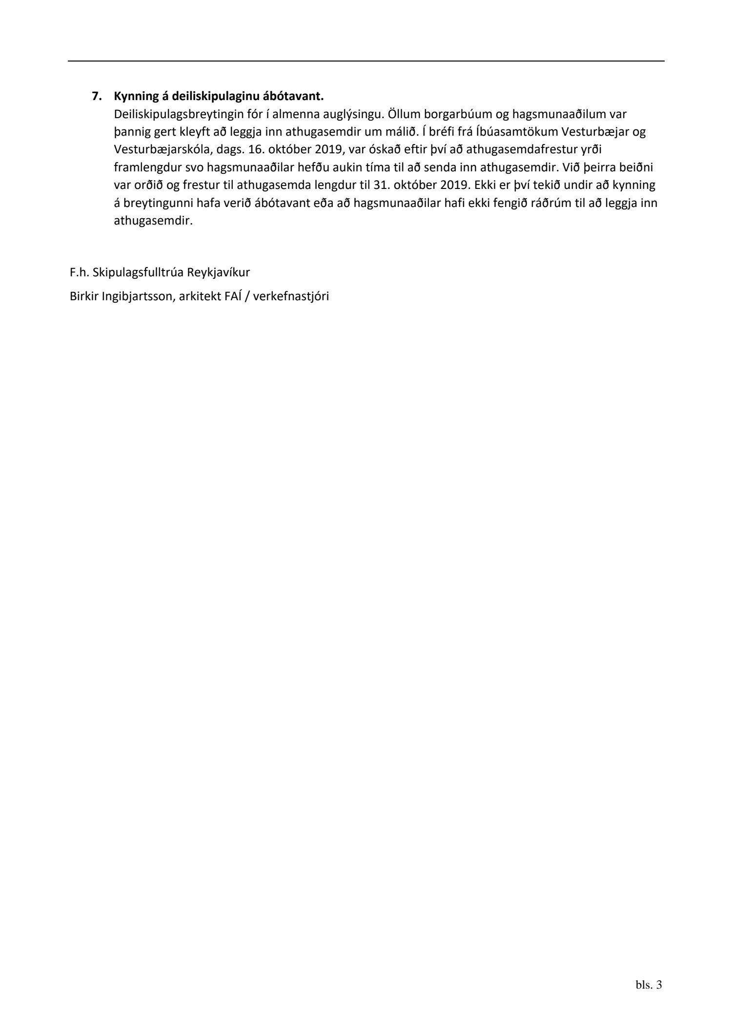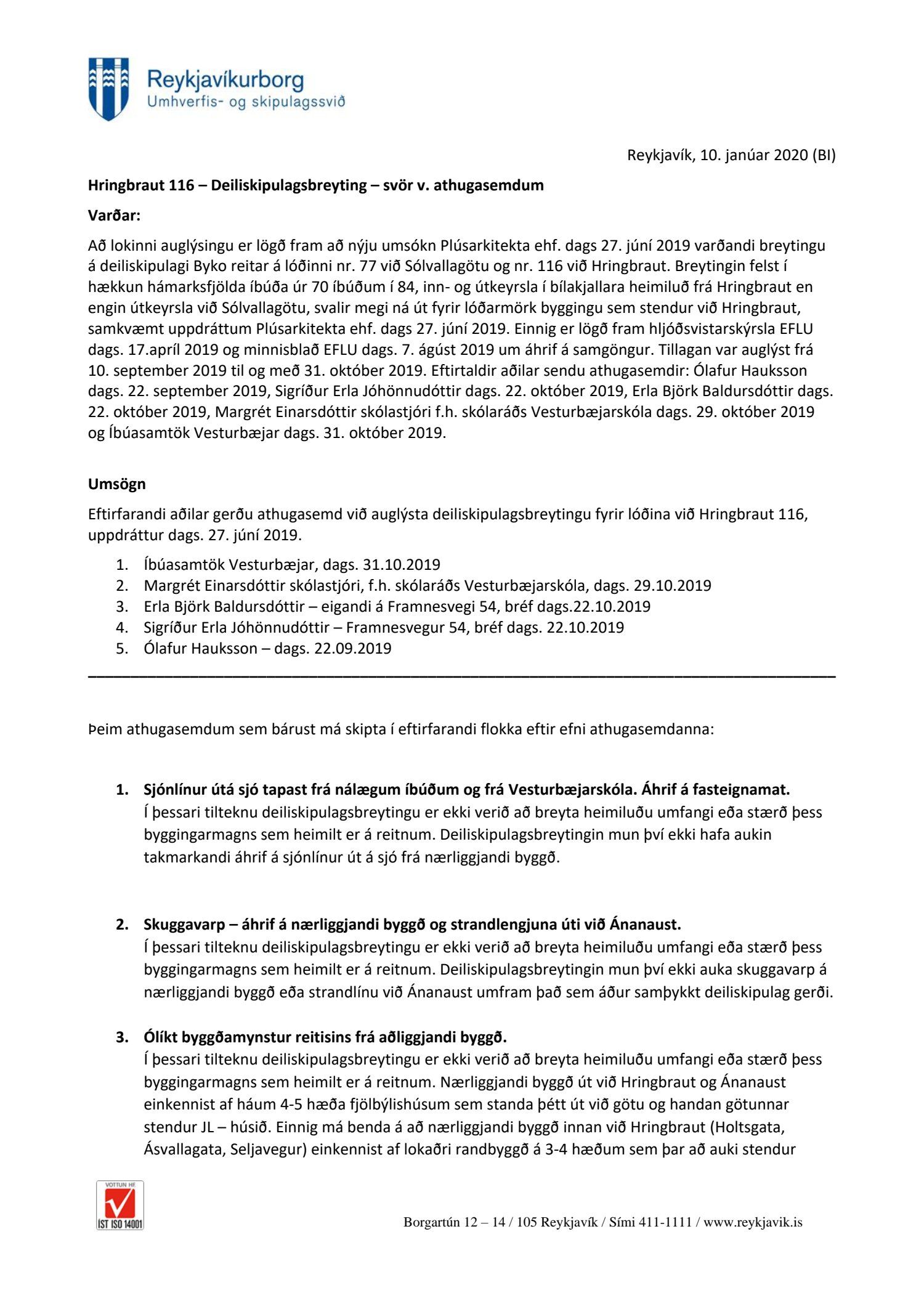 dags 27. júní 2019, br. 26. febrúar 2020. Einnig er lögð fram hljóðsvistarskýrsla Eflu dags. 17. apríl 2019 og minnisblað EFLU dags. 7. ágúst 2019 um áhrif á samgöngur. Tillagan var auglýst frá 10. september 2019 til og með 31. október 2019. Eftirtaldir aðilar sendu athugasemdir: Ólafur Hauksson dags. 22. september 2019, Sigríður Erla Jóhönnudóttir dags. 22. október 2019, Erla Björk Baldursdóttir dags. 22. október 2019, Margrét Einarsdóttir skólastjóri f.h. skólaráðs Vesturbæjarskóla dags. 29. október 2019 og Íbúasamtök Vesturbæjar dags. 31. október 2019. Einnig er lögð fram umsögn Vegagerðarinnar dags. 2. desember 2019 og umsögn skipulagsfulltrúa dags. 10. janúar 2020.
