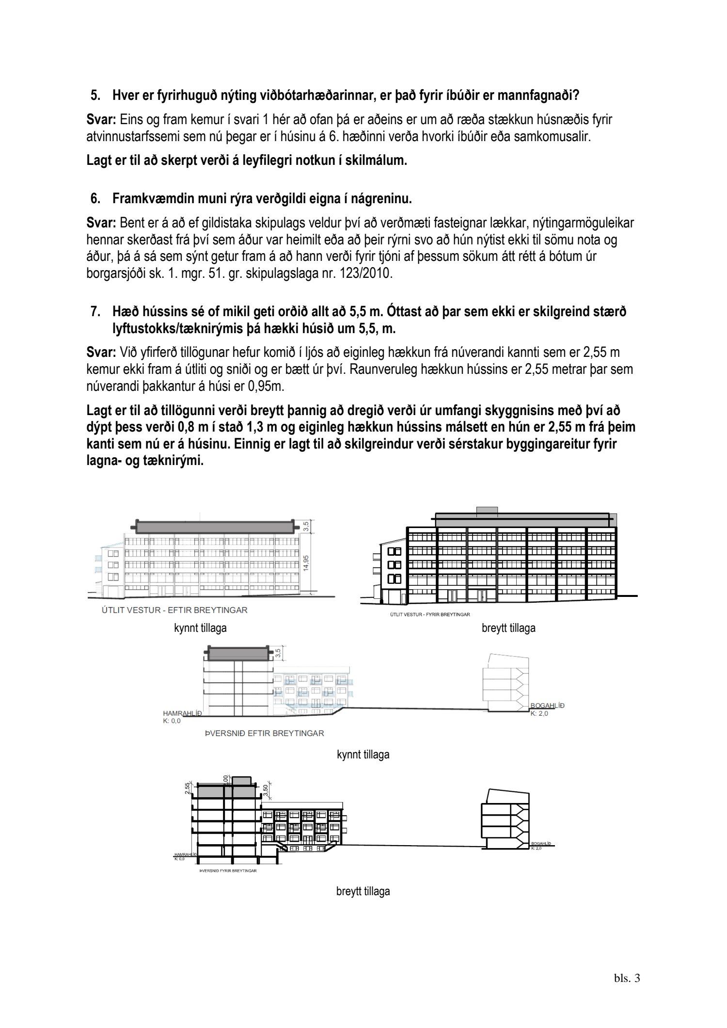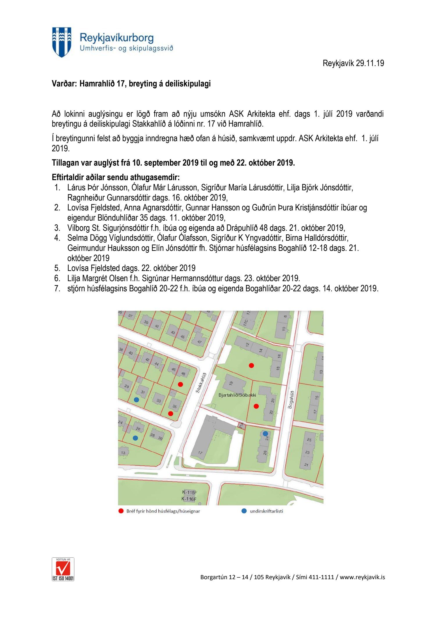 1. júlí 2019. Tillagan var auglýst frá 10. september 2019 til og með 22. október 2019. Eftirtaldir aðilar sendu athugasemdir: Lovísa Fjeldsted, Anna Agnarsdóttir, Gunnar Hansson og Guðrún Þura Kristjánsdóttir íbúar og eigendur Blönduhlíðar 35 dags. 11. október 2019, stjórn húsfélagsins Bogahlíð 20-22 f.h. íbúa og eigenda Bogahlíðar 20-22 dags. 14. október 2019, Lárus Þór Jónsson, Ólafur Már Lárusson, Sigríður María Lárusdóttir, Lilja Björk Jónsdóttir, Ragnheiður Gunnarsdóttir dags. 16. október 2019, Vilborg St. Sigurjónsdóttir f.h. íbúa og eigenda að Drápuhlíð 48 dags. 21. október 2019, Selma Dögg Víglundsdóttir, Ólafur Ólafsson, Sigríður K Yngvadóttir, Birna Halldórsdóttir, Geirmundur Hauksson og Elín Jónsdóttir fh. Stjórnar húsfélagsins Bogahlíð 12-18 dags. 21. október 2019, Lovísa Fjeldsted dags. 22. október 2019 og Lilja Margrét Olsen f.h. Sigrúnar Hermannsdóttur dags. 23. október 2019. Einnig er lögð fram umsögn skipulagsfulltrúa dags. 29. nóvember 2019.
