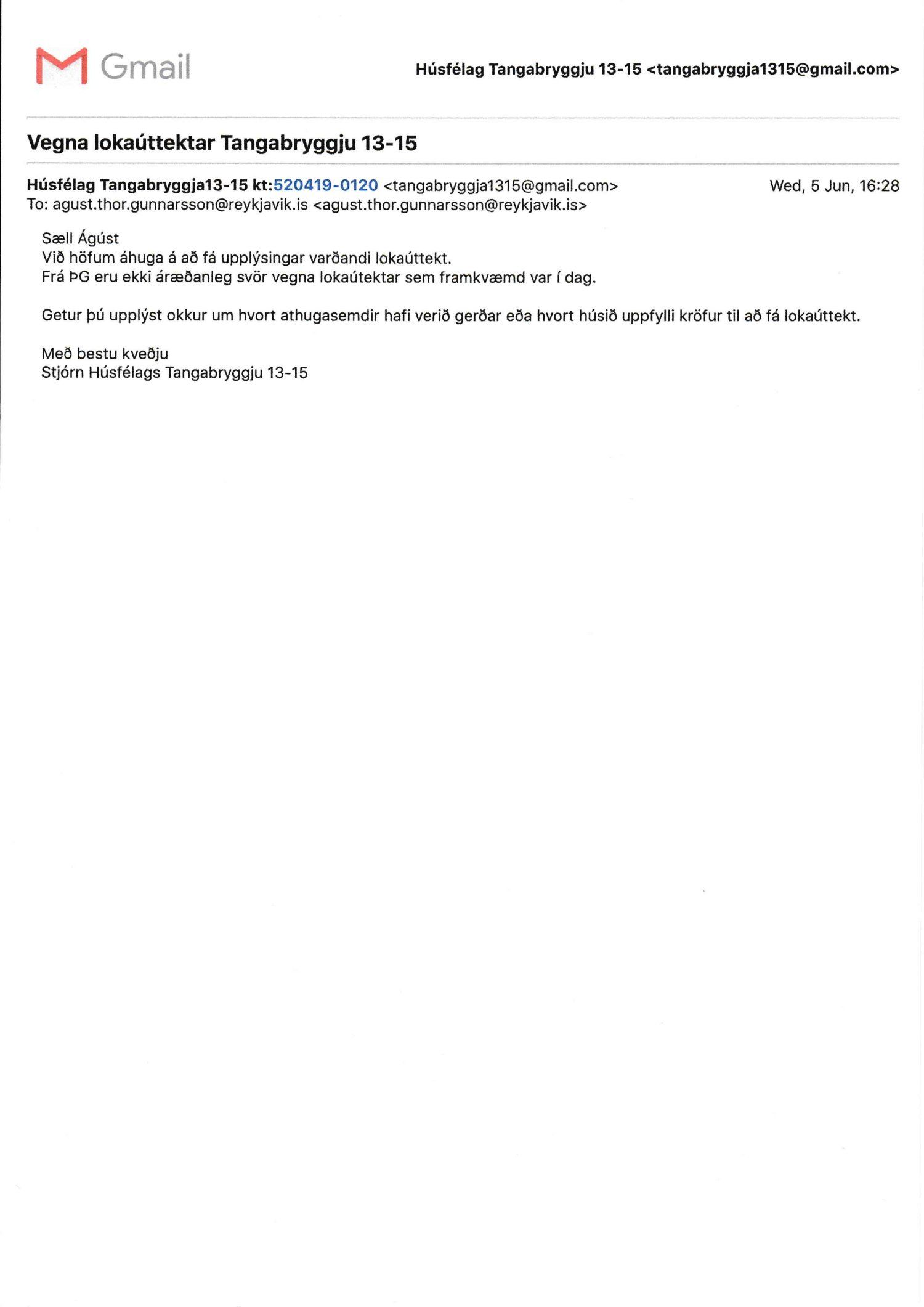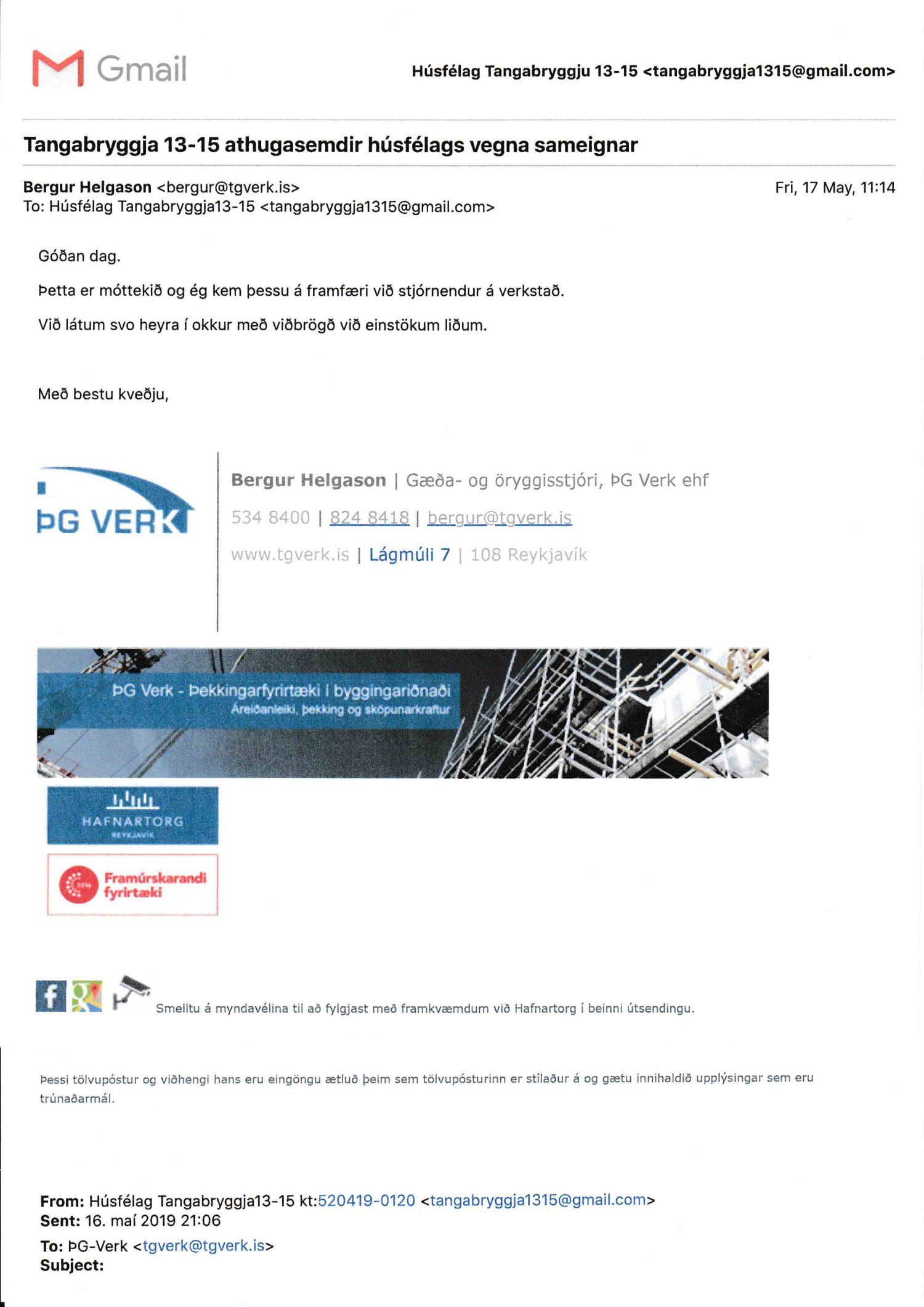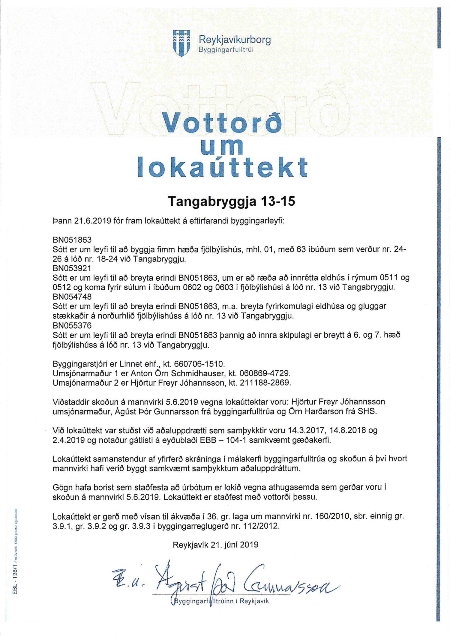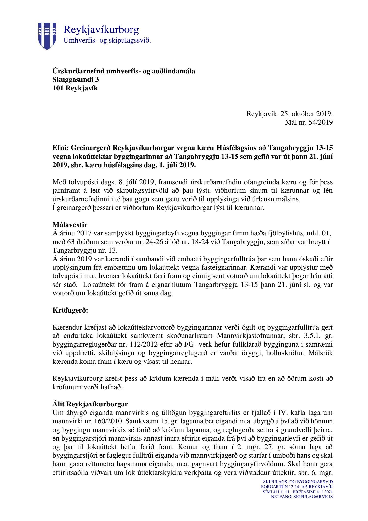 Lagt fram erindi úrskurðarnefndar umhverfis- og auðlindamála dags. 8. júlí 2019 ásamt kæru dags. 1. júlí 2019 þar sem kærð er útgáfa byggingarfulltrúa Reykjavíkur á lokaúttekt vegna Tangabryggju 13 og 15, útgefin þann 21. júní 2019. Einnig er lögð fram umsögn skrifstofu sviðsstjóra dags. 25. október 2019.