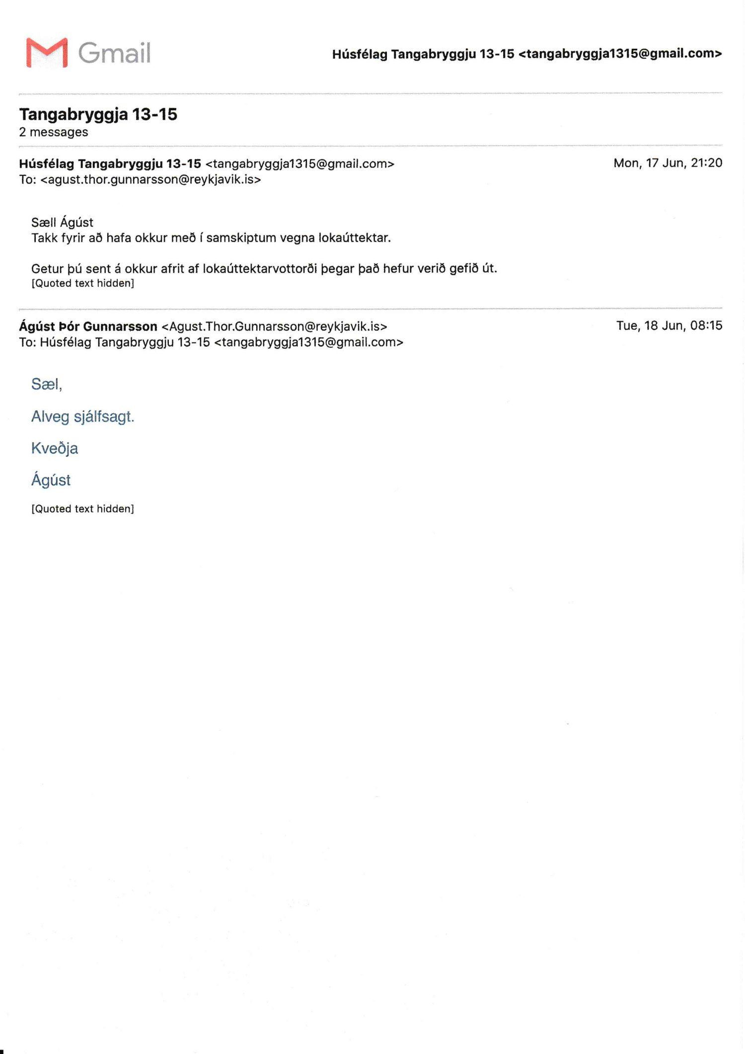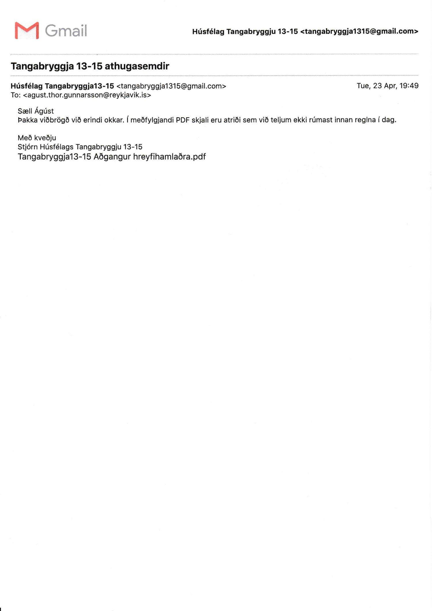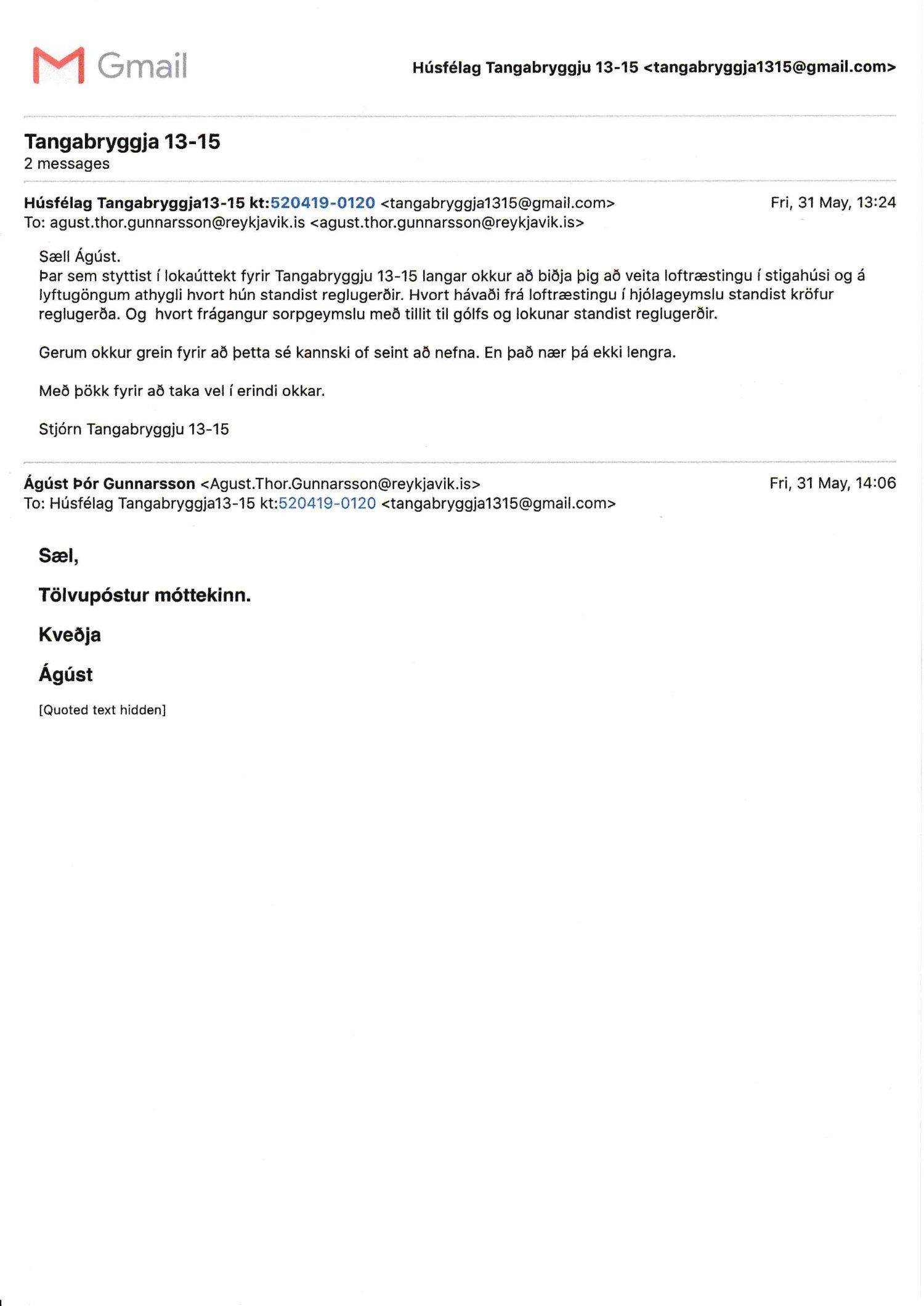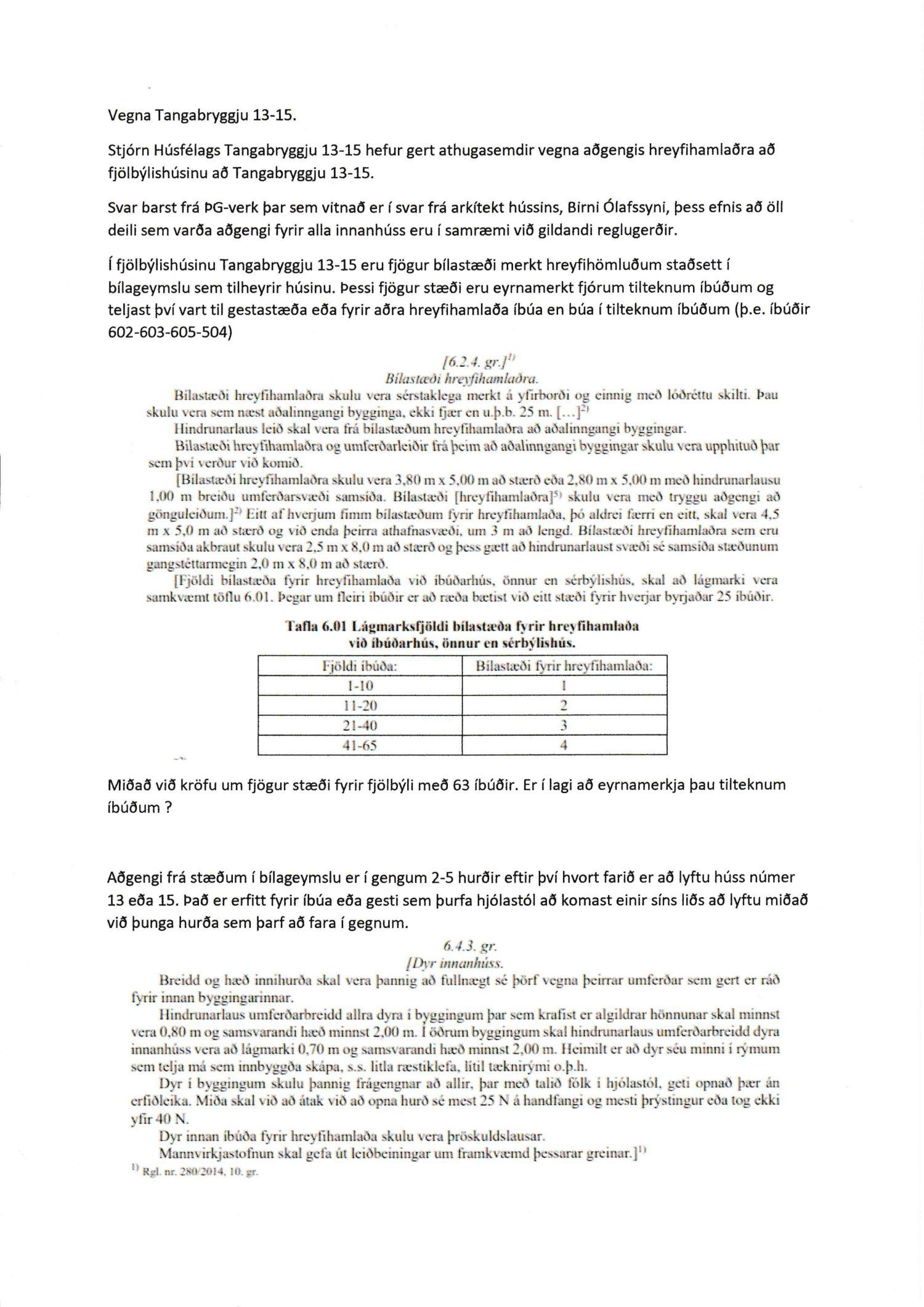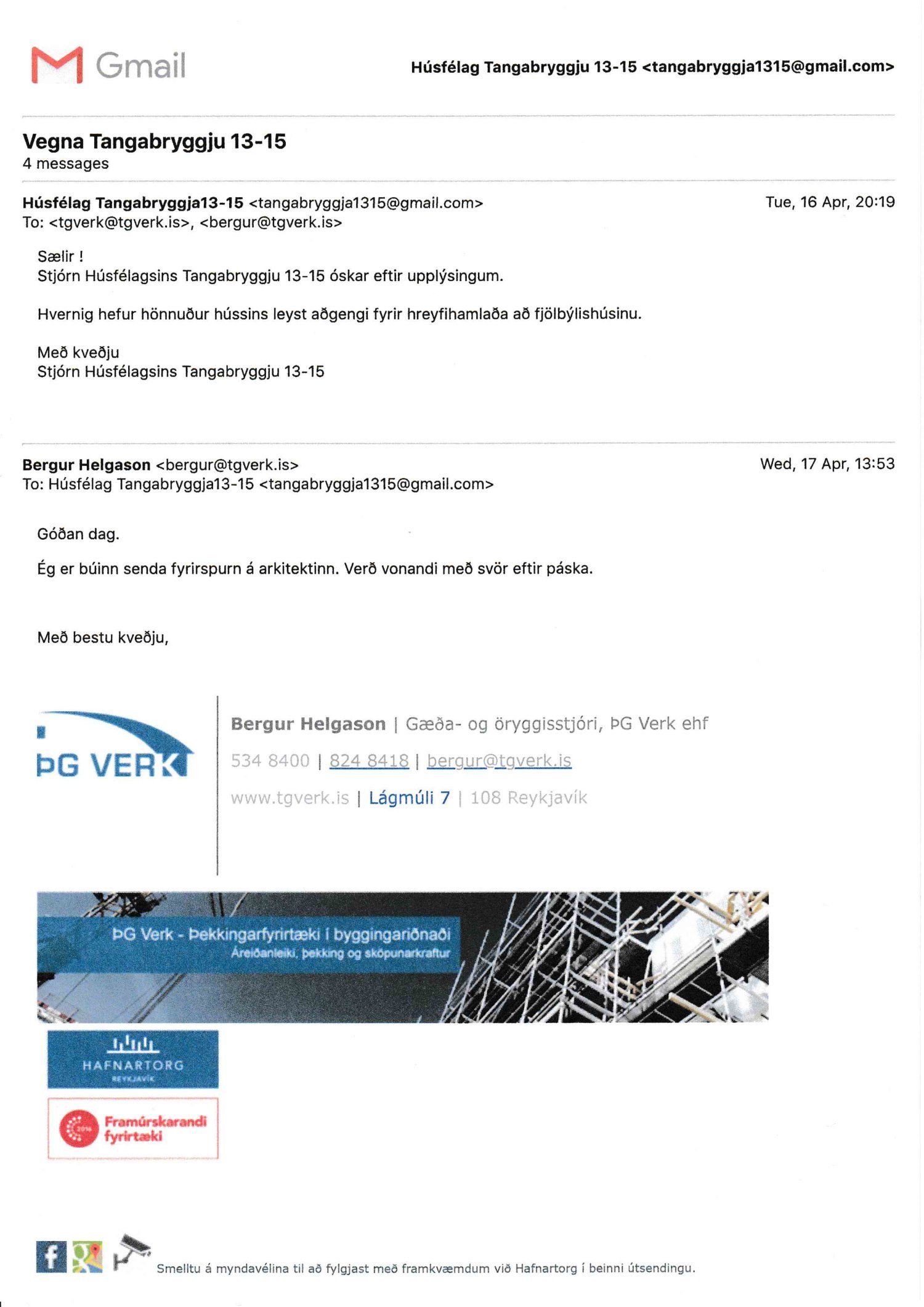 Lagt fram erindi úrskurðarnefndar umhverfis- og auðlindamála dags. 8. júlí 2019 ásamt kæru dags. 1. júlí 2019 þar sem kærð er útgáfa byggingarfulltrúa Reykjavíkur á lokaúttekt vegna Tangabryggju 13 og 15, útgefin þann 21. júní 2019. Einnig er lögð fram umsögn skrifstofu sviðsstjóra dags. 25. október 2019.