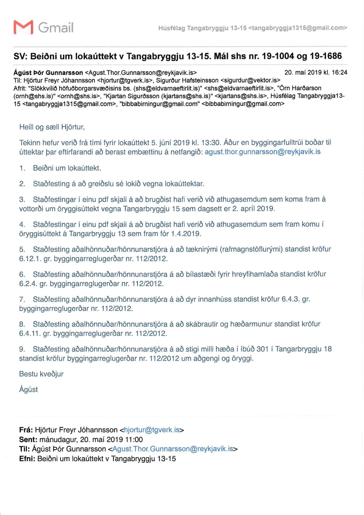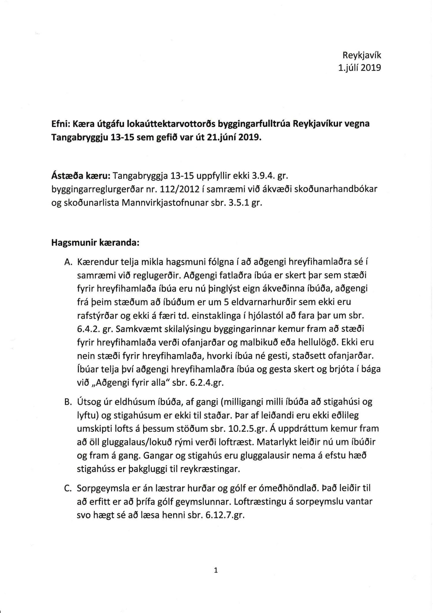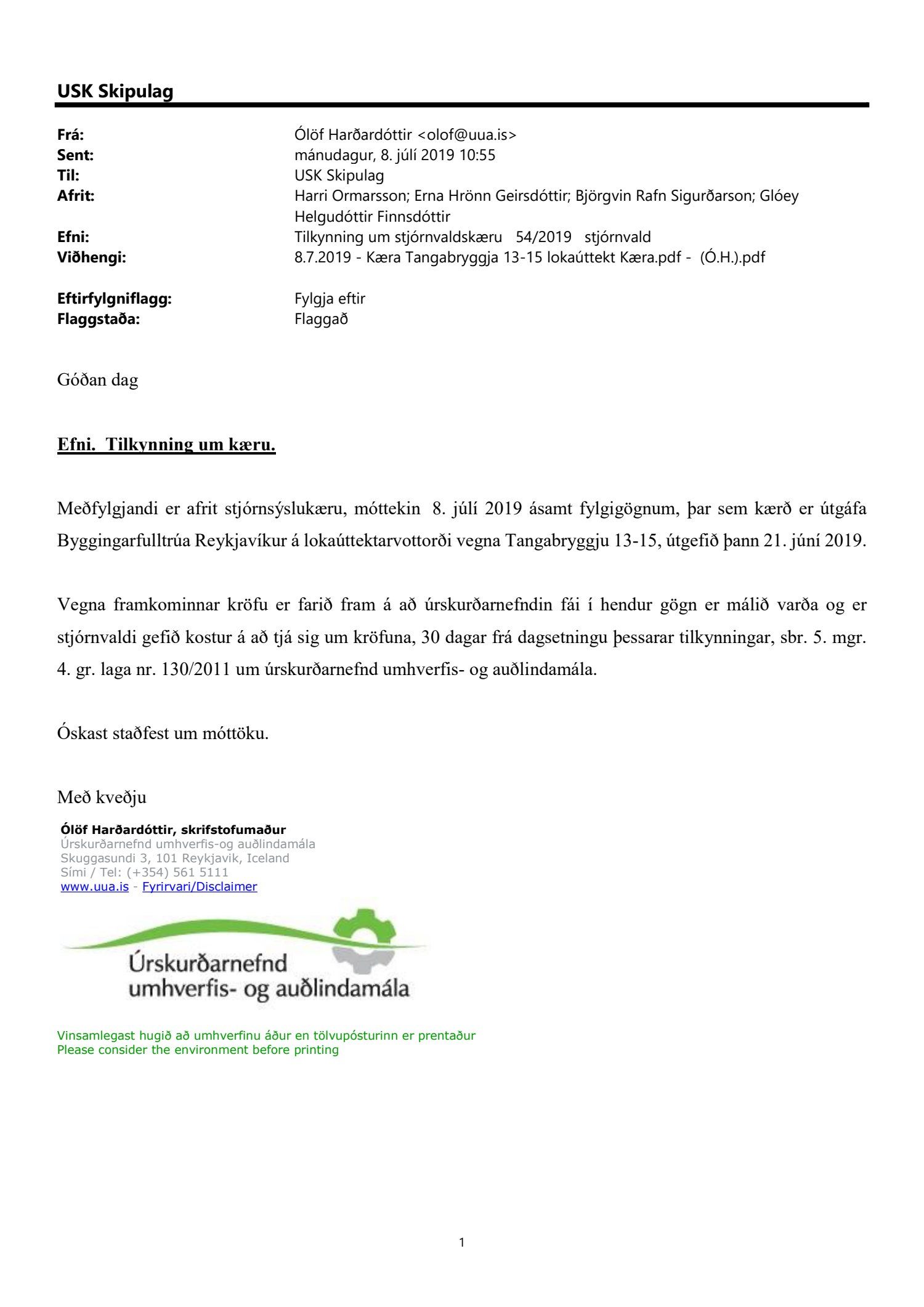 Lagt fram erindi úrskurðarnefndar umhverfis- og auðlindamála dags. 8. júlí 2019 ásamt kæru dags. 1. júlí 2019 þar sem kærð er útgáfa byggingarfulltrúa Reykjavíkur á lokaúttekt vegna Tangabryggju 13 og 15, útgefin þann 21. júní 2019.