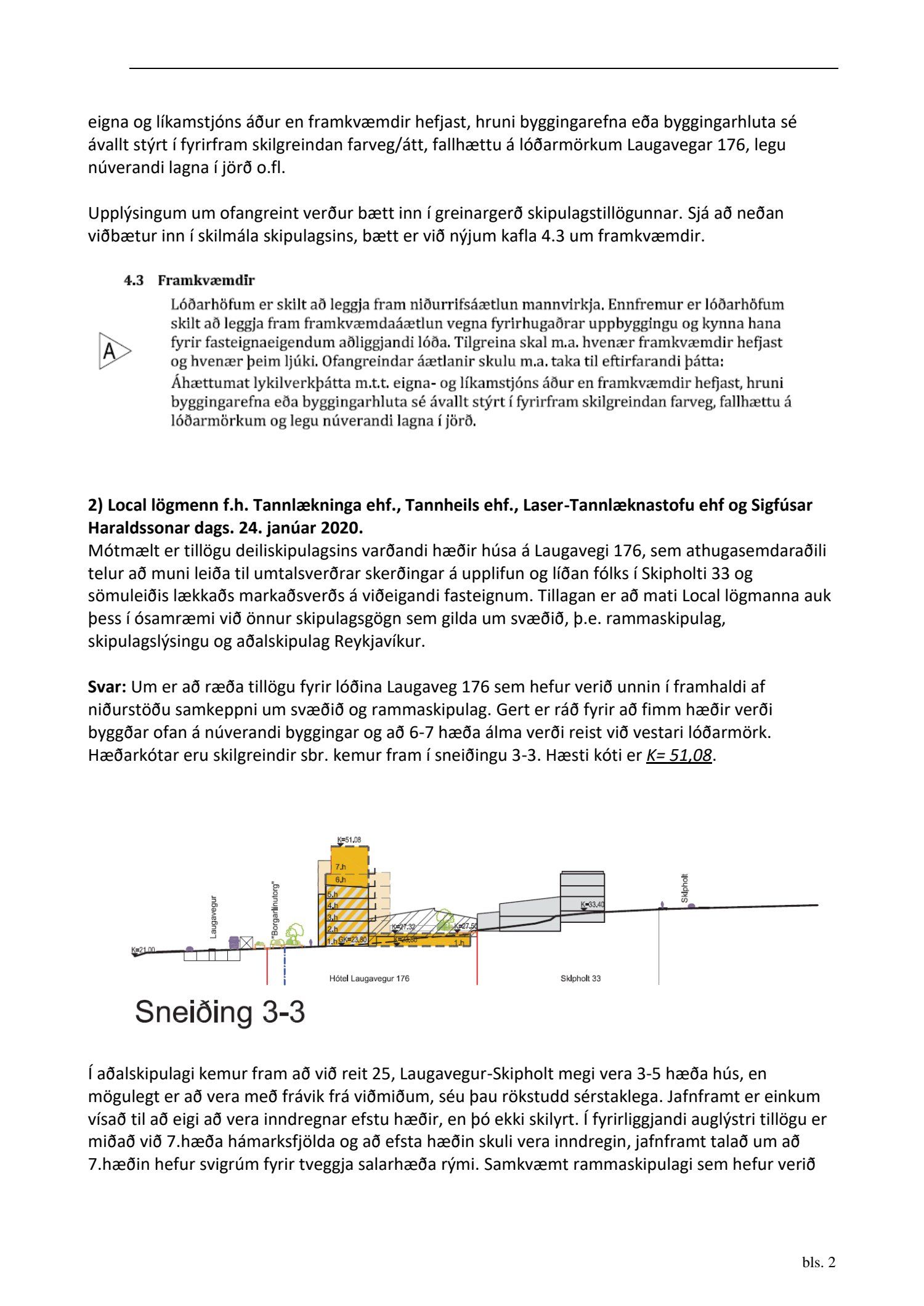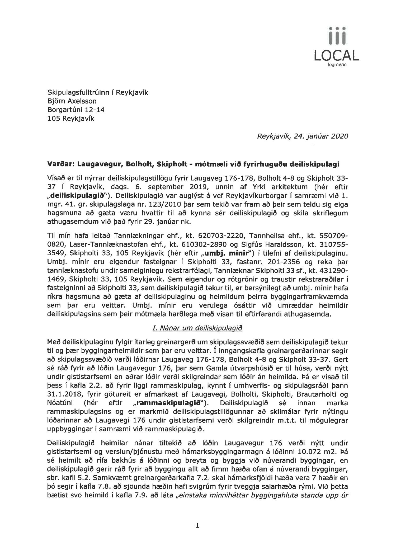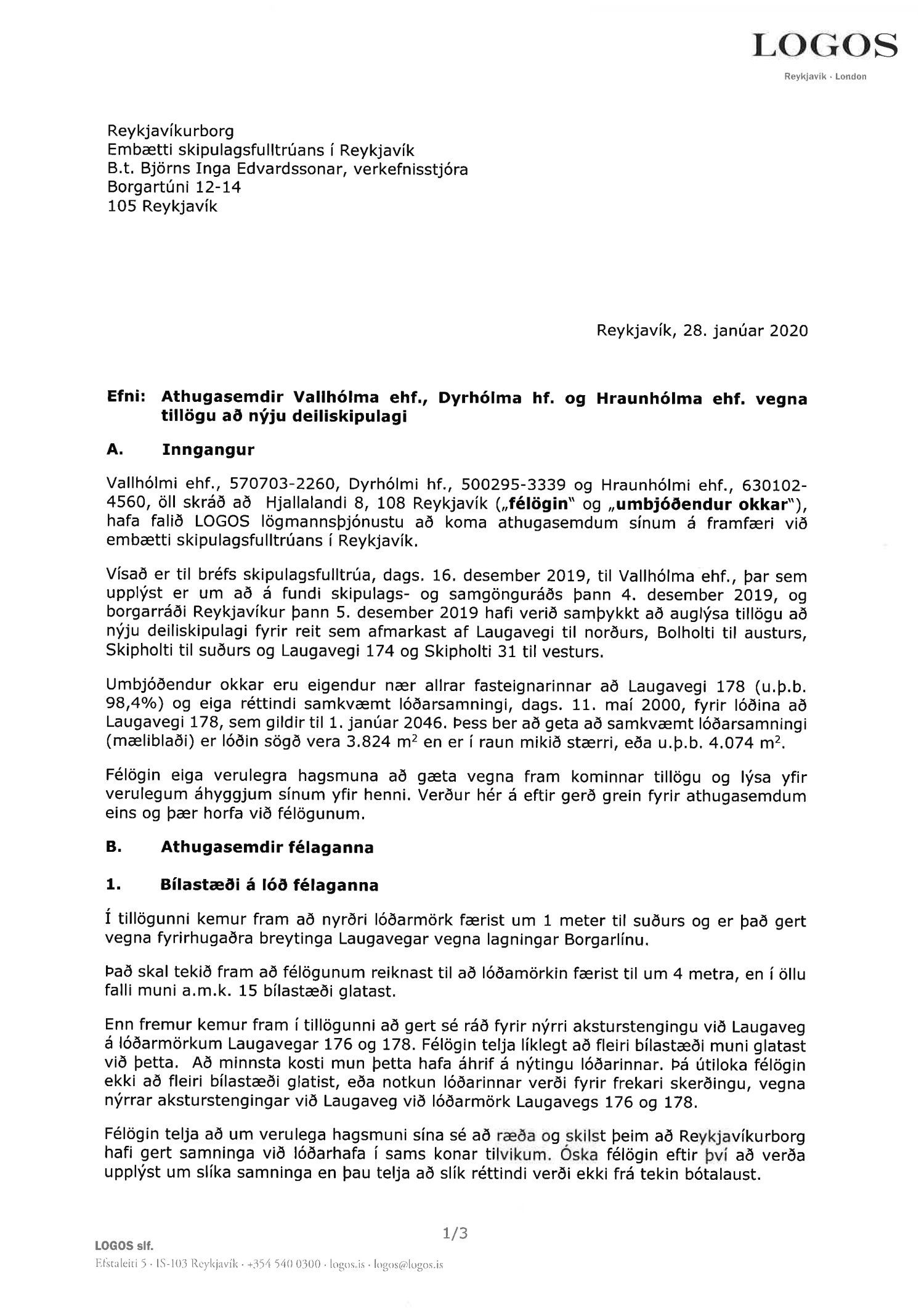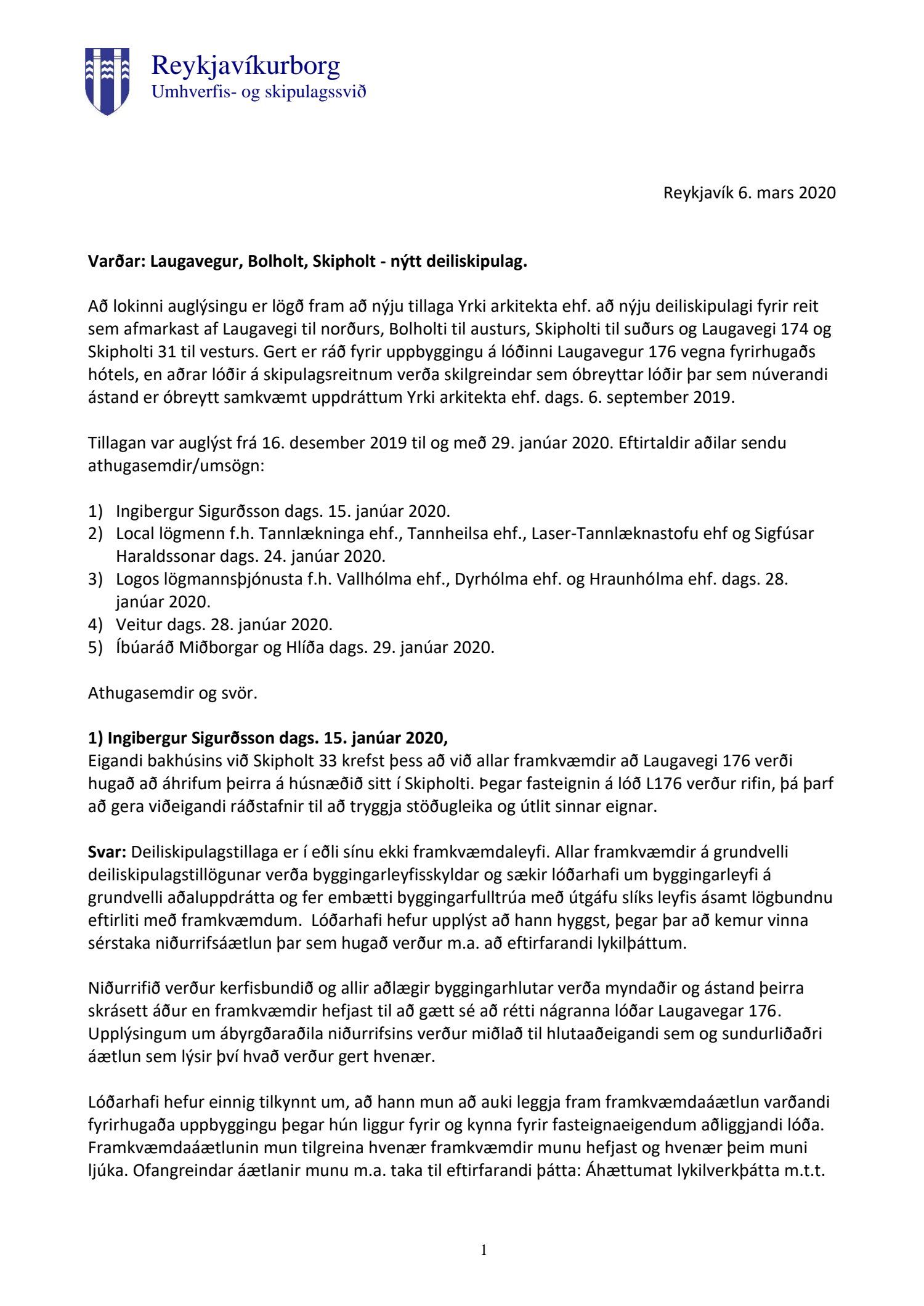 dags. 6. september 2019 br. 3. mars 2020. Tillagan var auglýst frá 16. desember 2019 til og með 29. janúar 2020. Eftirtaldir aðilar sendu athugasemdir/umsögn: Ingibergur Sigurðsson dags. 15. janúar 2020, Local lögmenn f.h. Tannlækninga ehf., Tannheils ehf., Laser-Tannlæknastofu ehf og Sigfúsar Haraldssonar dags. 24. janúar 2020, Logos lögmannsþjónusta f.h. Vallhólma ehf., Dyrhólma ehf. og Hraunhólma ehf. dags. 28. janúar 2020, Veitur dags. 28. janúar 2020 og Íbúaráð Miðborgar og Hlíða dags. 29. janúar 2020. Einnig er lögð fram eignaskiptayfirlýsingu vegna bílastæðahúss dags. 18. desember 2008 og framsal samkomulags frá Vallhólma til Dyrhólma til byggingar bílastæðahúss dags. 26. janúar 2009. Einnig er lögð fram umsögn skipulagsfulltrúa dags. 6. mars 2020.