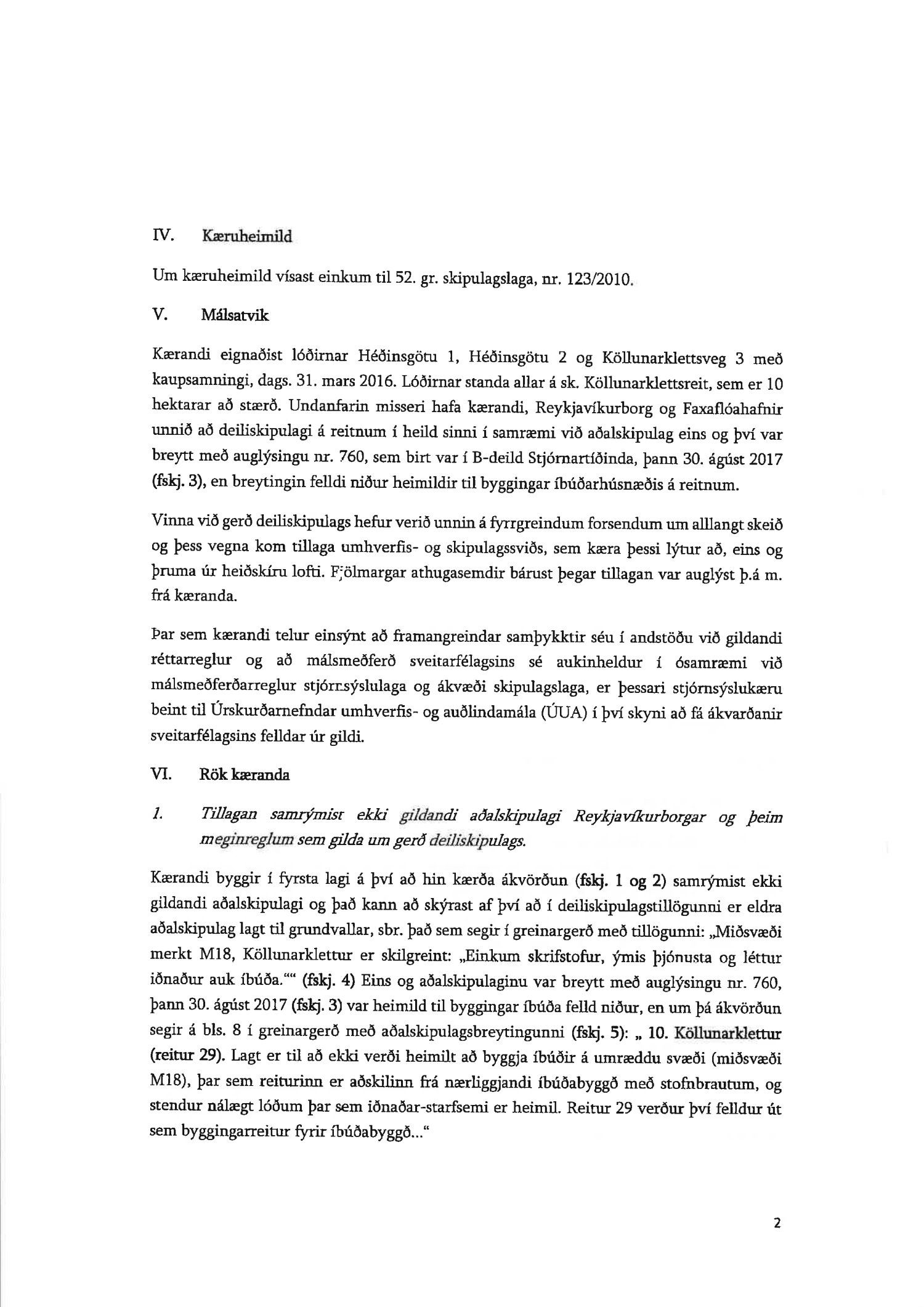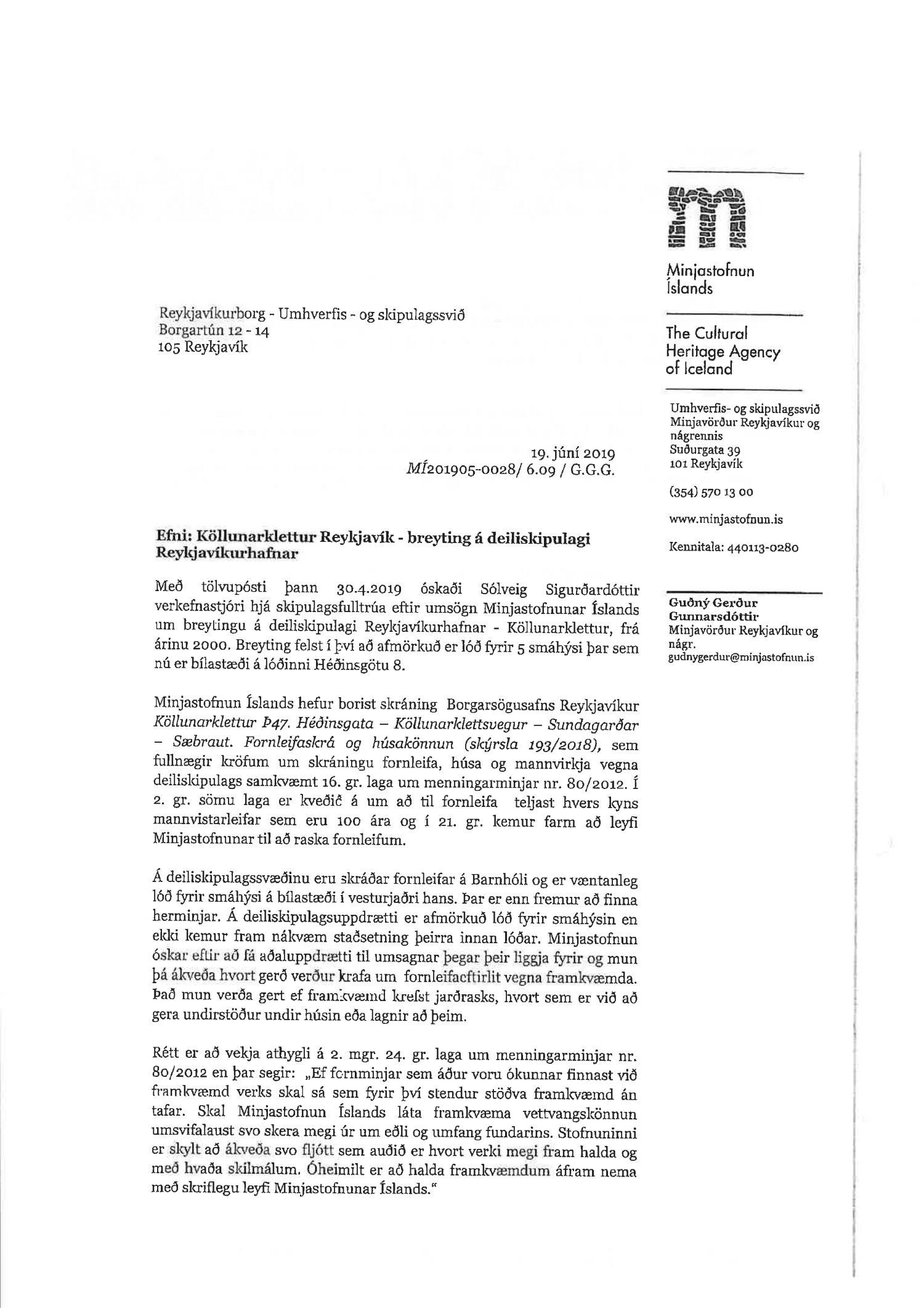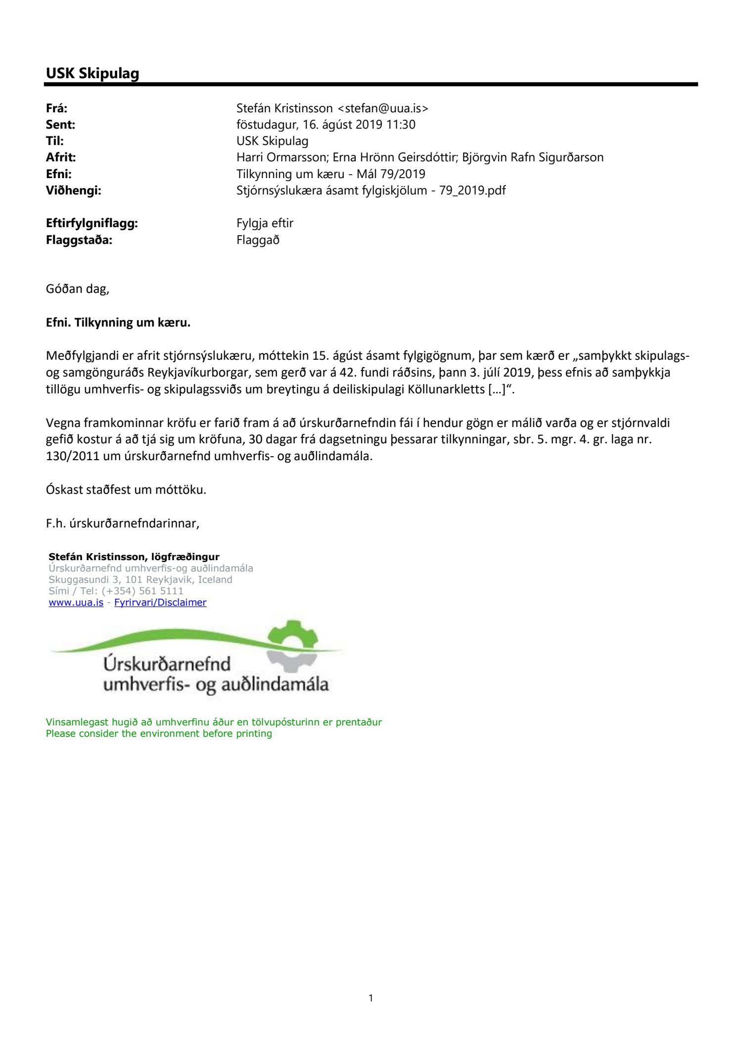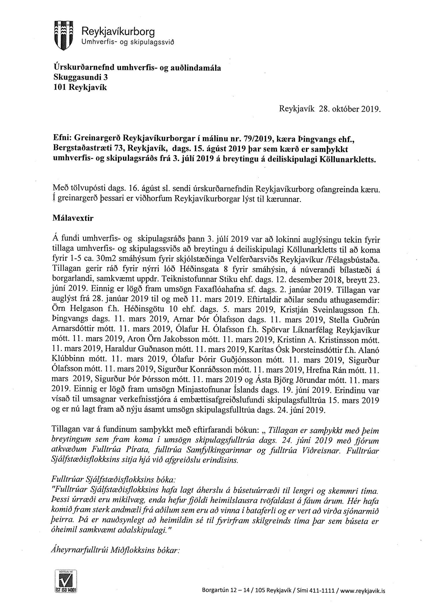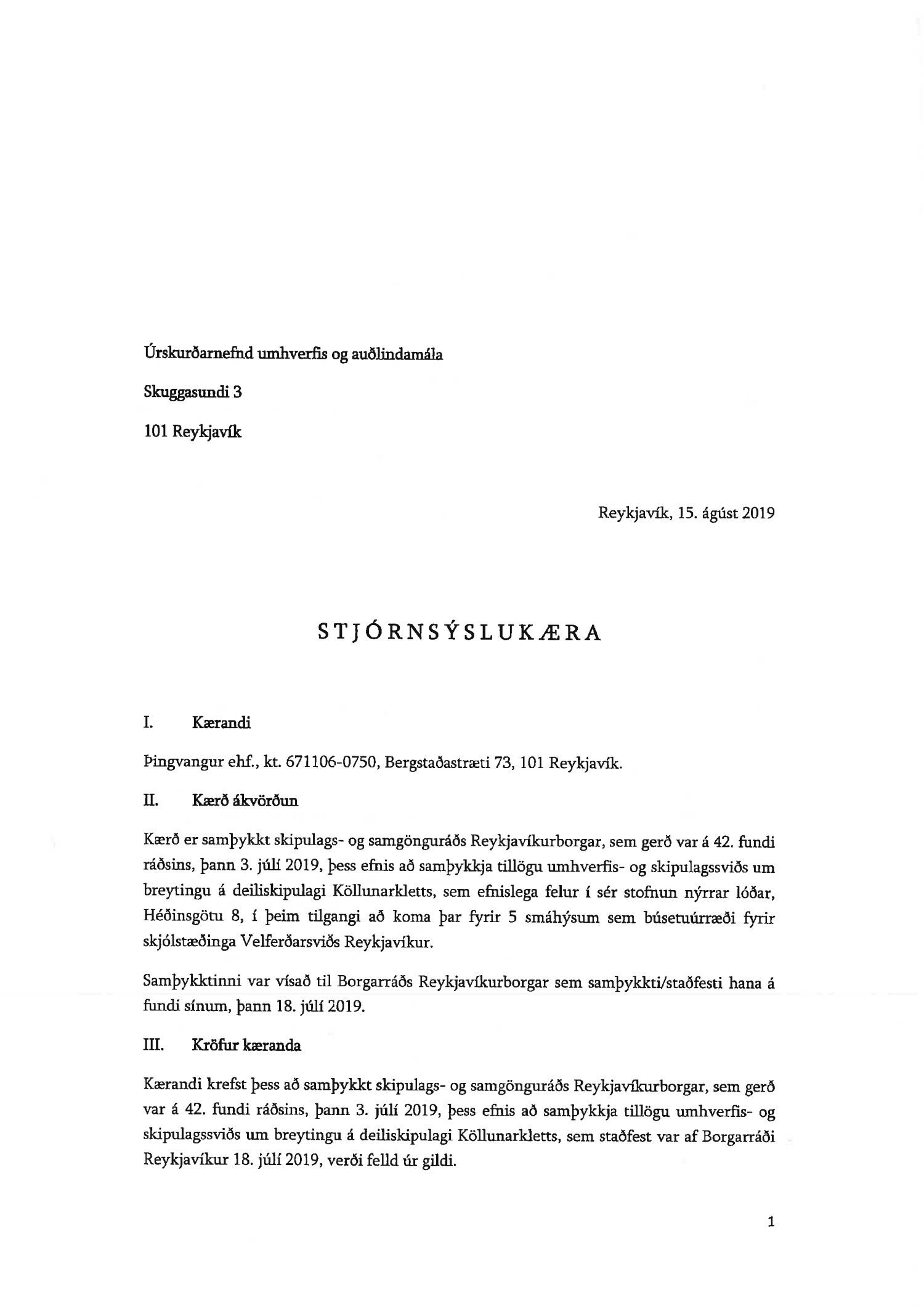 Lagt fram erindi úrskurðarnefndar umhverfis- og auðlindamála dags. 16. ágúst 2019 ásamt kæru dags. 15. ágúst 2019 þar sem kærð er samþykkt skipulags- og samgönguráðs frá 3. júlí 2019 á tillögu að breytingu á deiliskipulagi Köllunarkletts. Einnig er lögð fram umsögn skrifstofu sviðsstjóra dags. 28. október 2019.