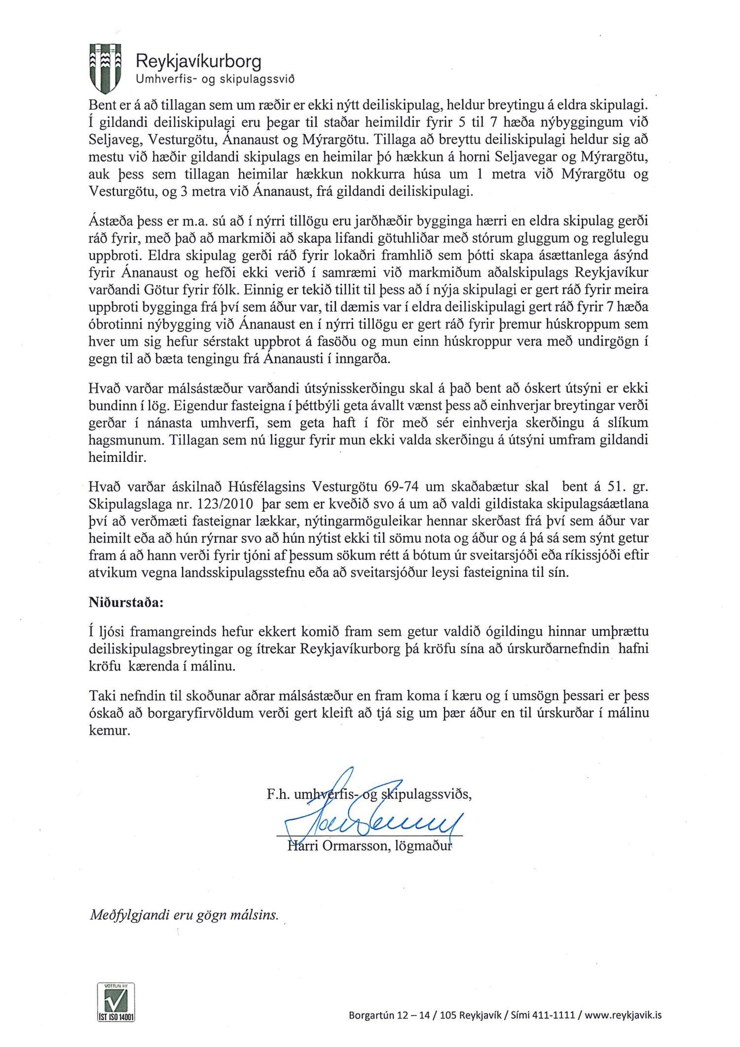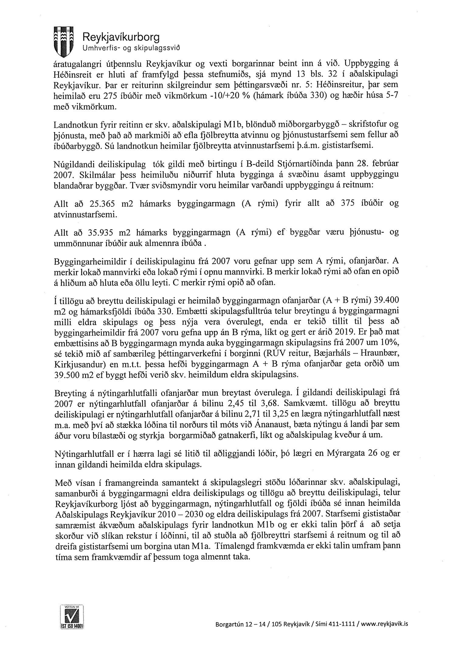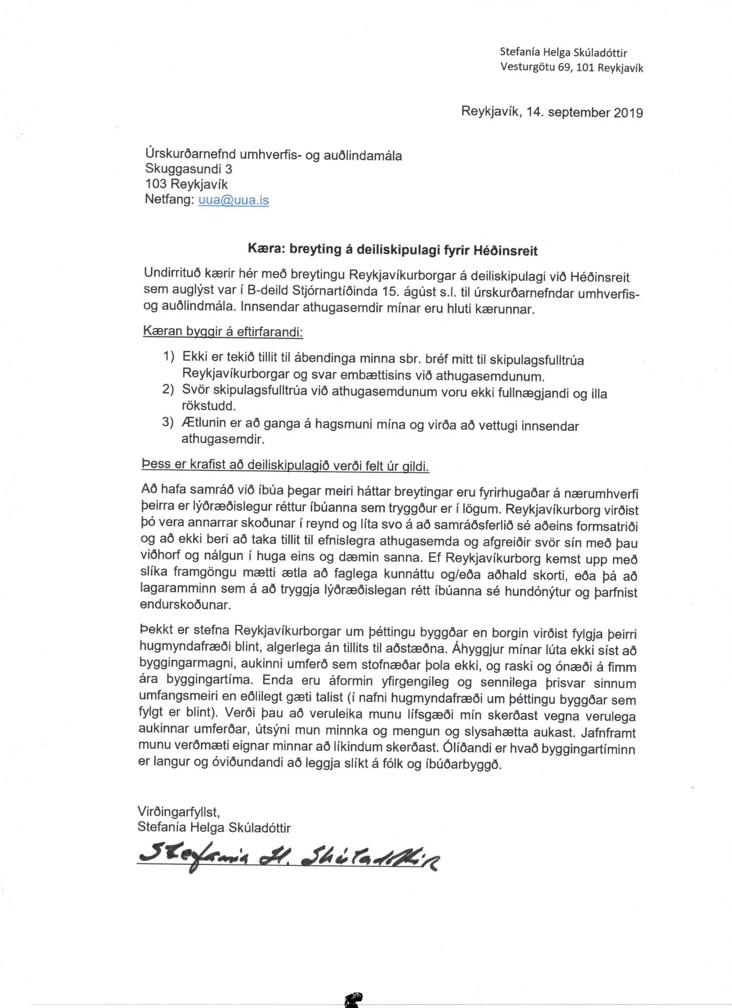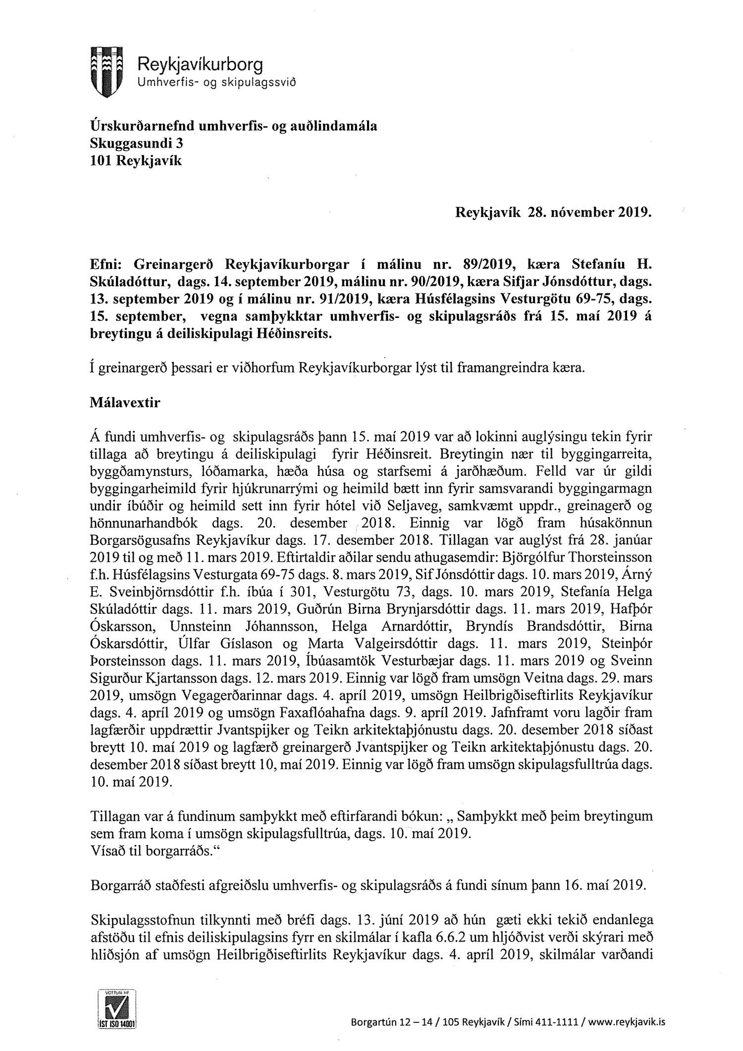 Lagt fram erindi úrskurðarnefndar umhverfis- og auðlindamála dags. 16. september 2019 ásamt kæru dags. 14. september 2019 þar sem kærð er breyting á deiliskipulagi Héðinsreits, reitur 1.130.1, sem auglýst var í B-deild Stjórnartíðinda 15. ágúst 2019. Einnig er lögð fram umsögn skrifstofu sviðsstjóra dags. 28. nóvember 2019.
