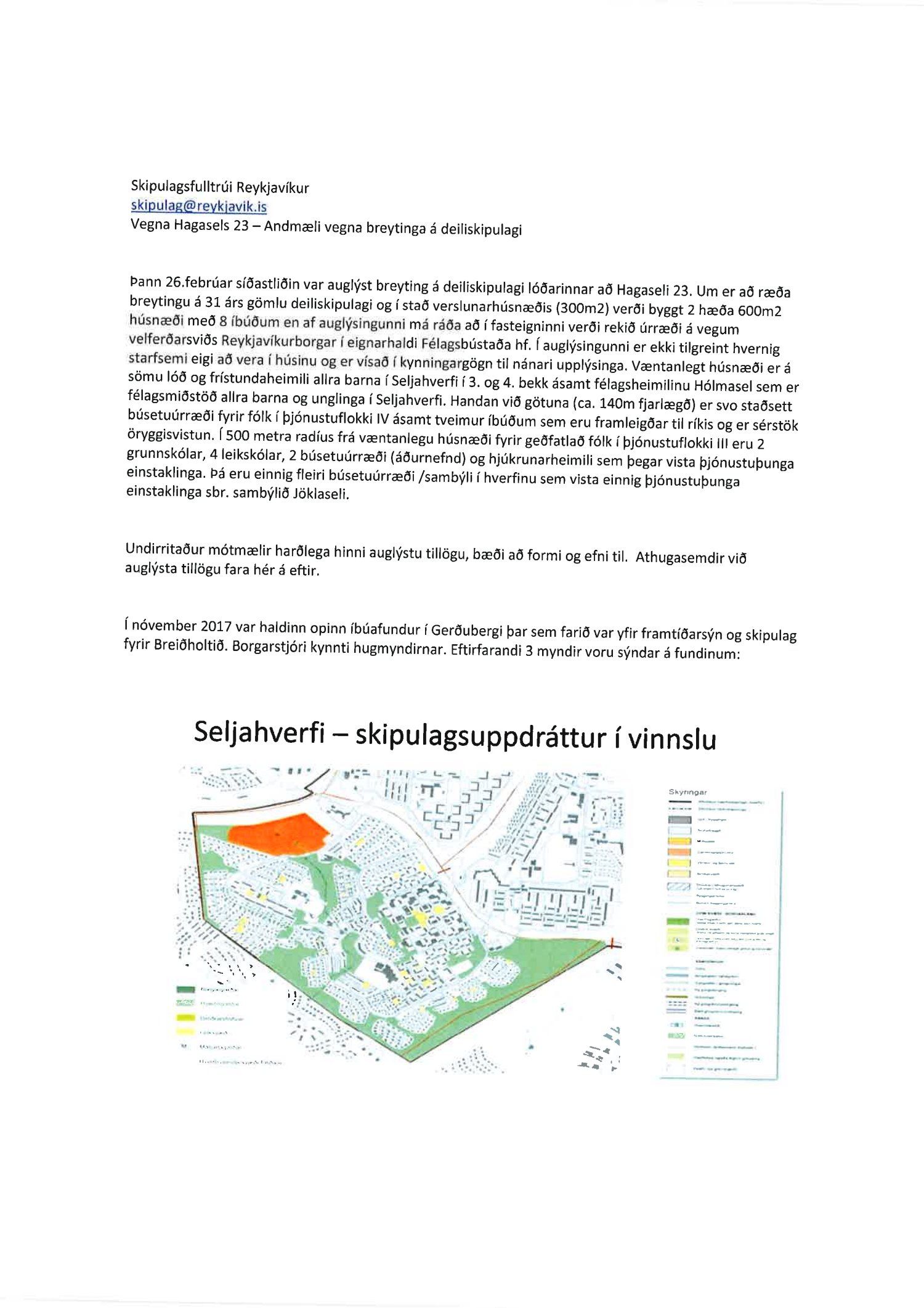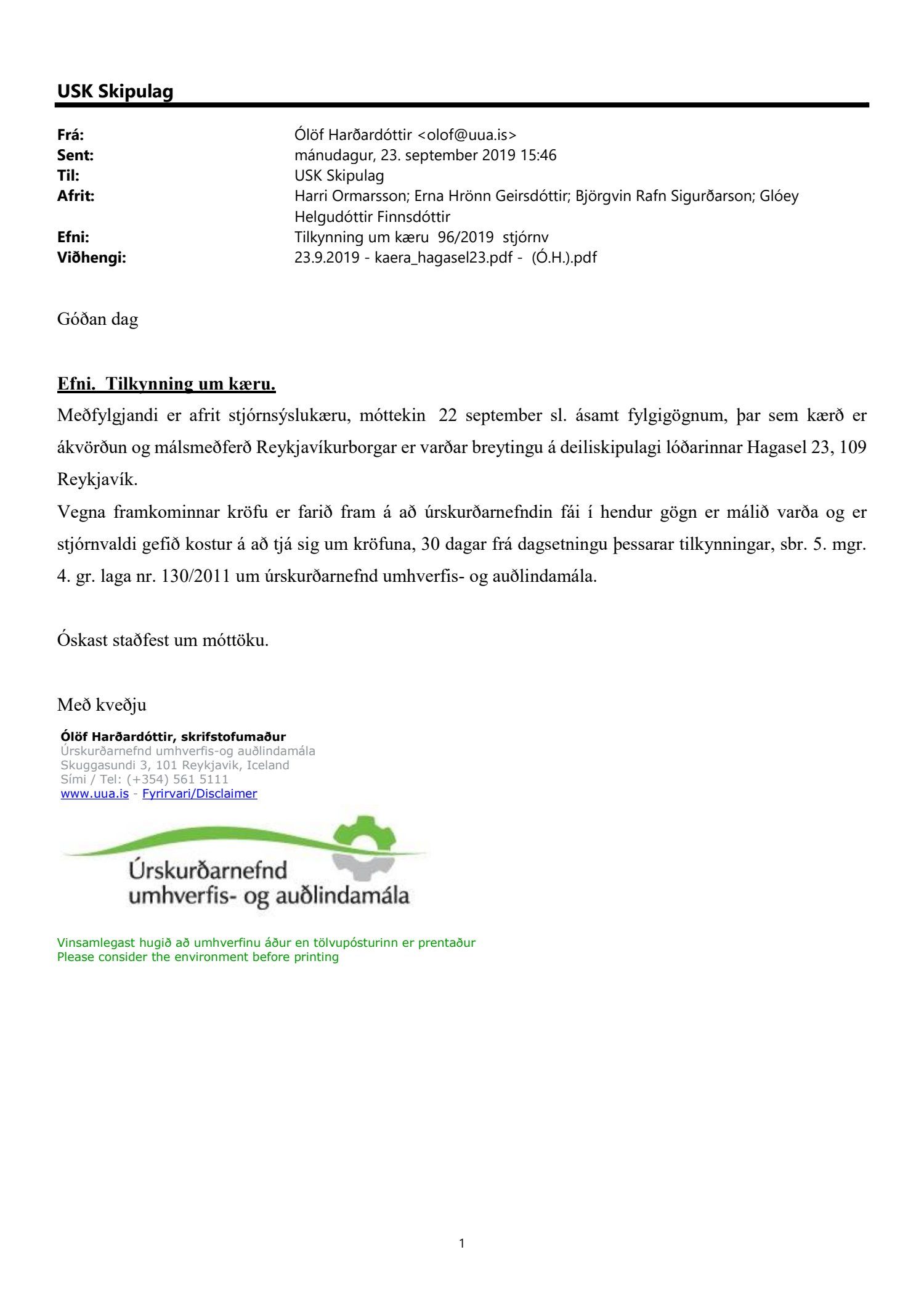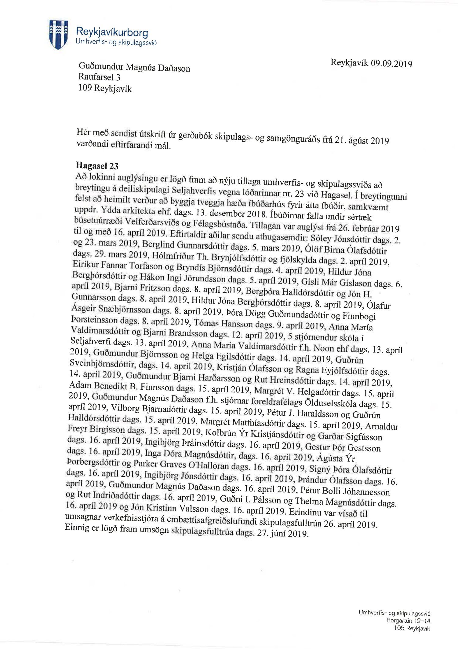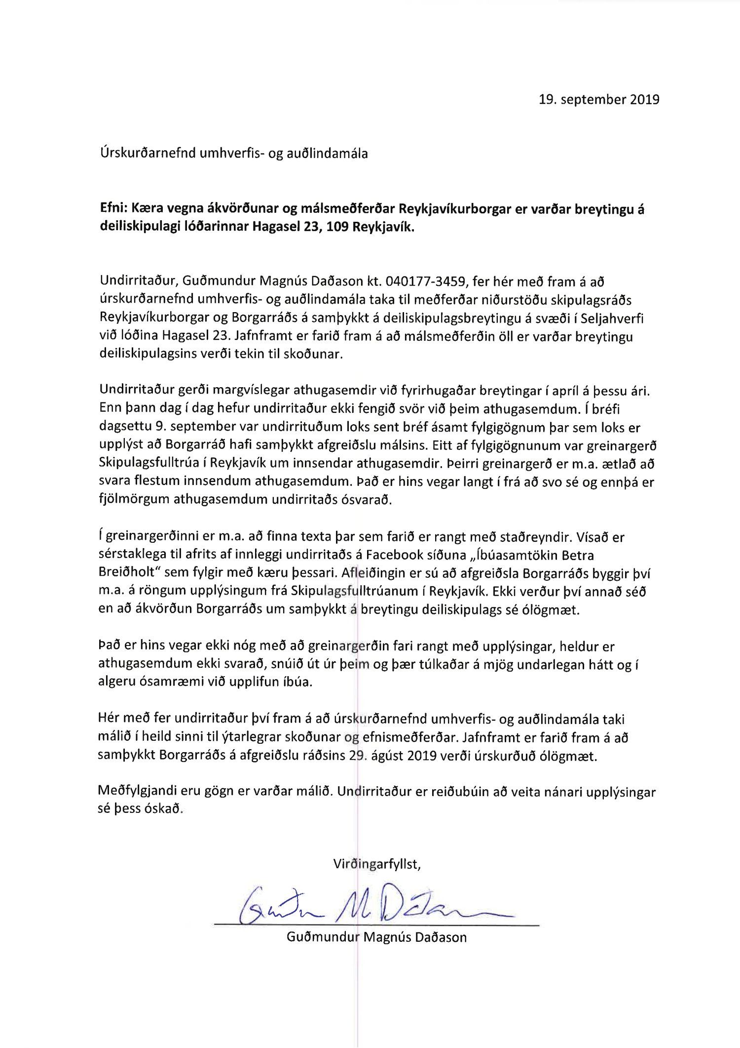 Lagt fram erindi úrskurðarnefnar umhverfis- og auðlindamála dags. 23. september 2019 ásamt kæru dags. 19. september 2019 þar sem kærð er samþykkt skipulags- og samgönguráðs frá 21. ágúst 2019 og borgarráðs frá 29. ágúst 2019 og málsmeðferð Reykjavíkurborgar á breytingu á deiliskipulagi Seljahverfis vegna lóðarinnar nr. 23 við Hagasel. Einnig er lögð fram umsögn skrifstofu sviðsstjóra dags. 25. október 2019.