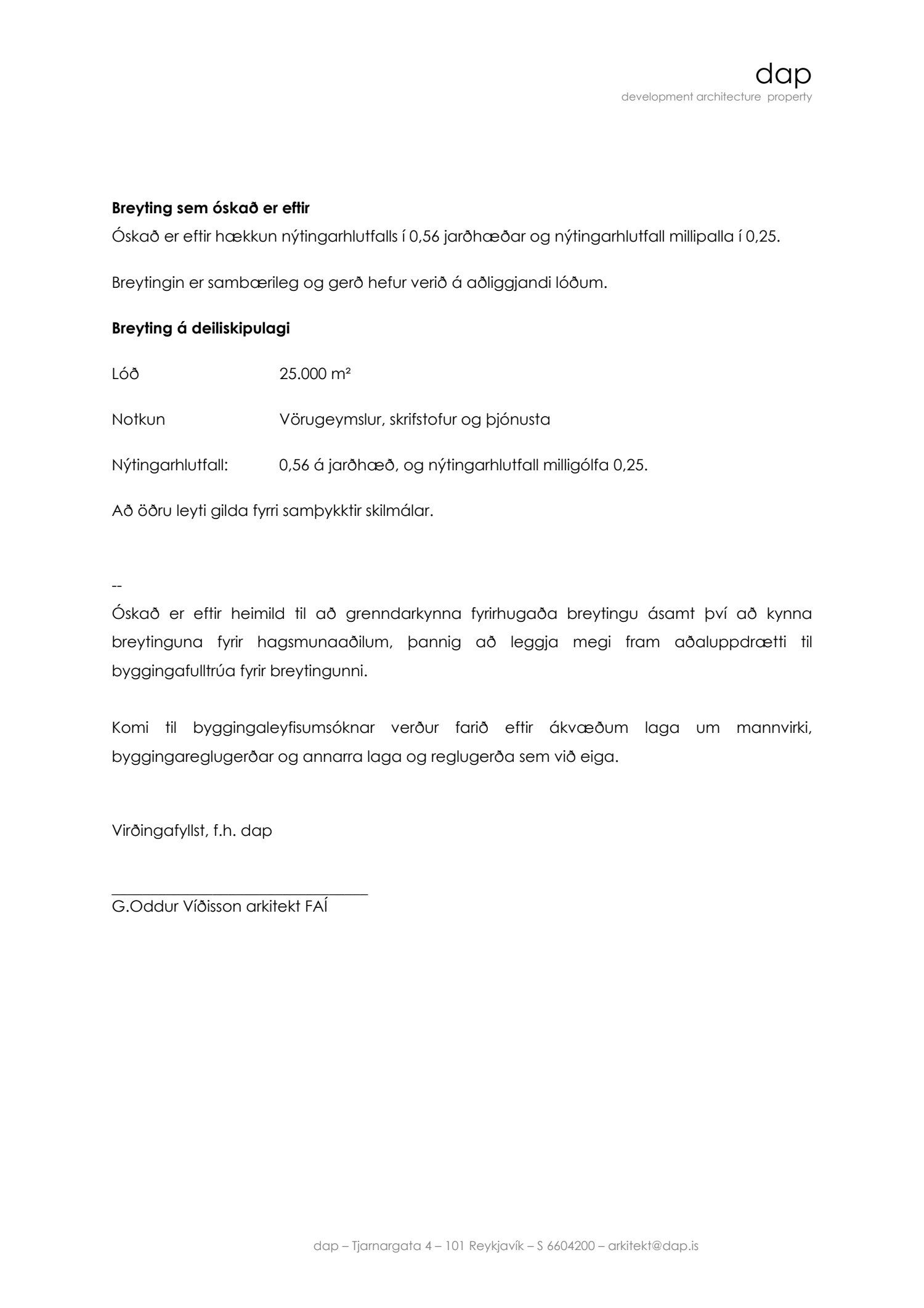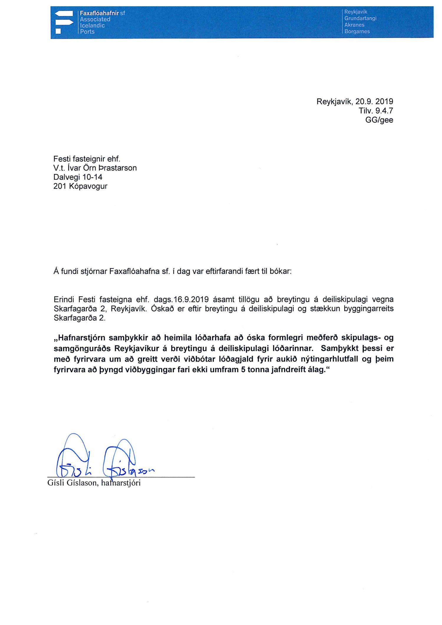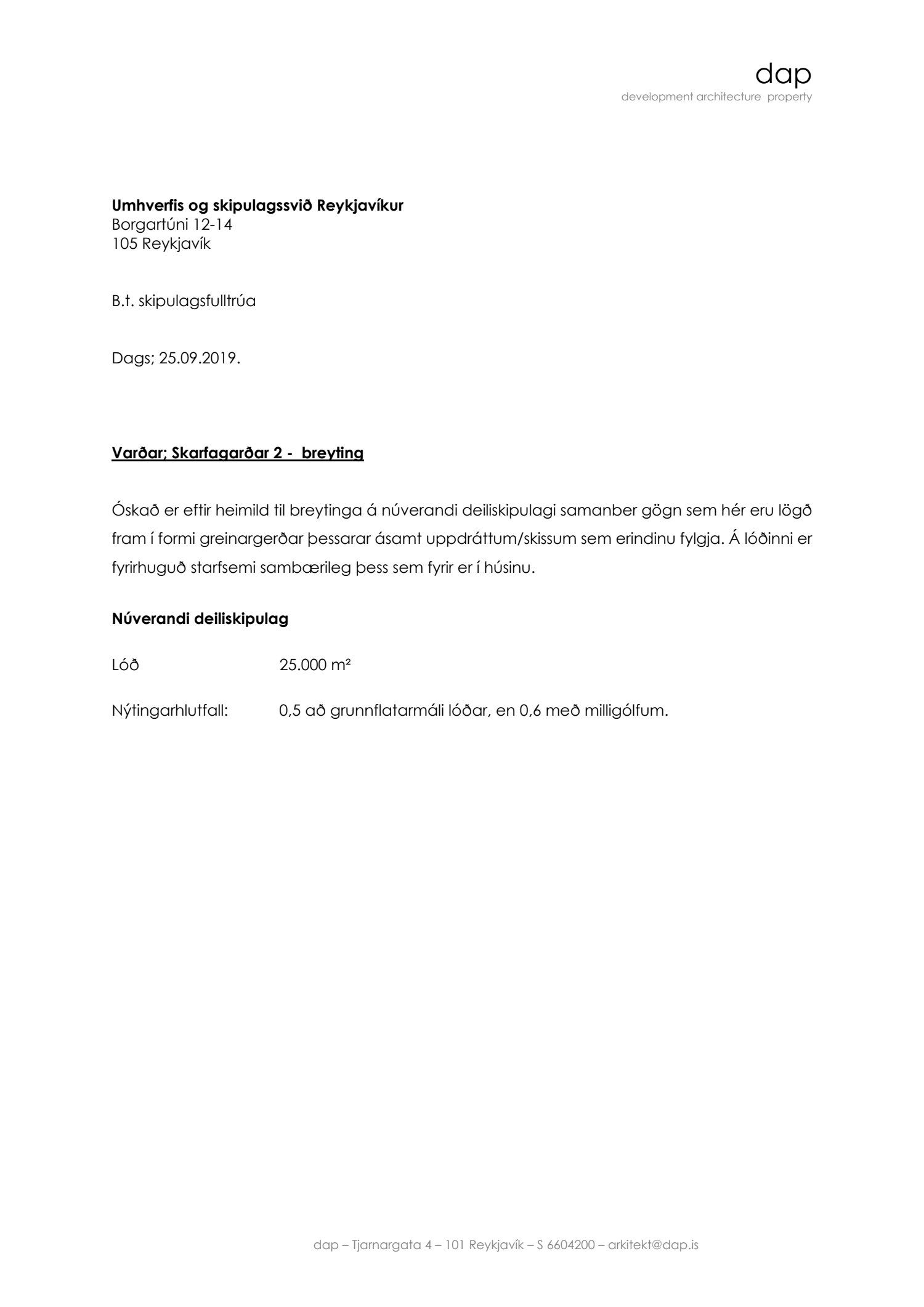 Lögð fram umsókn DAP ehf. dags. 26. september 2019 ásamt bréfi dags. 25. september 2019 ásamt greinargerð dags. 25. september 2019 varðandi breytingu á deiliskipulagi Klettasvæðis, Skarfabakka vegna lóðarinnar nr. 2 við Skarfagarða. Í breytingunni felst að byggingarreitur er stækkaður að hluta á norðvestur horn reitsins. Nýtingarhlutfall jarðhæðar fer úr 0.5 í 0.56 og nýtingarhlutfall millipalla í 0.25, samkvæmt uppdrætti DAP dags. 25. september 2019. Einnig er lagt fram bréf Faxaflóahafna dags. 20. september 2019.