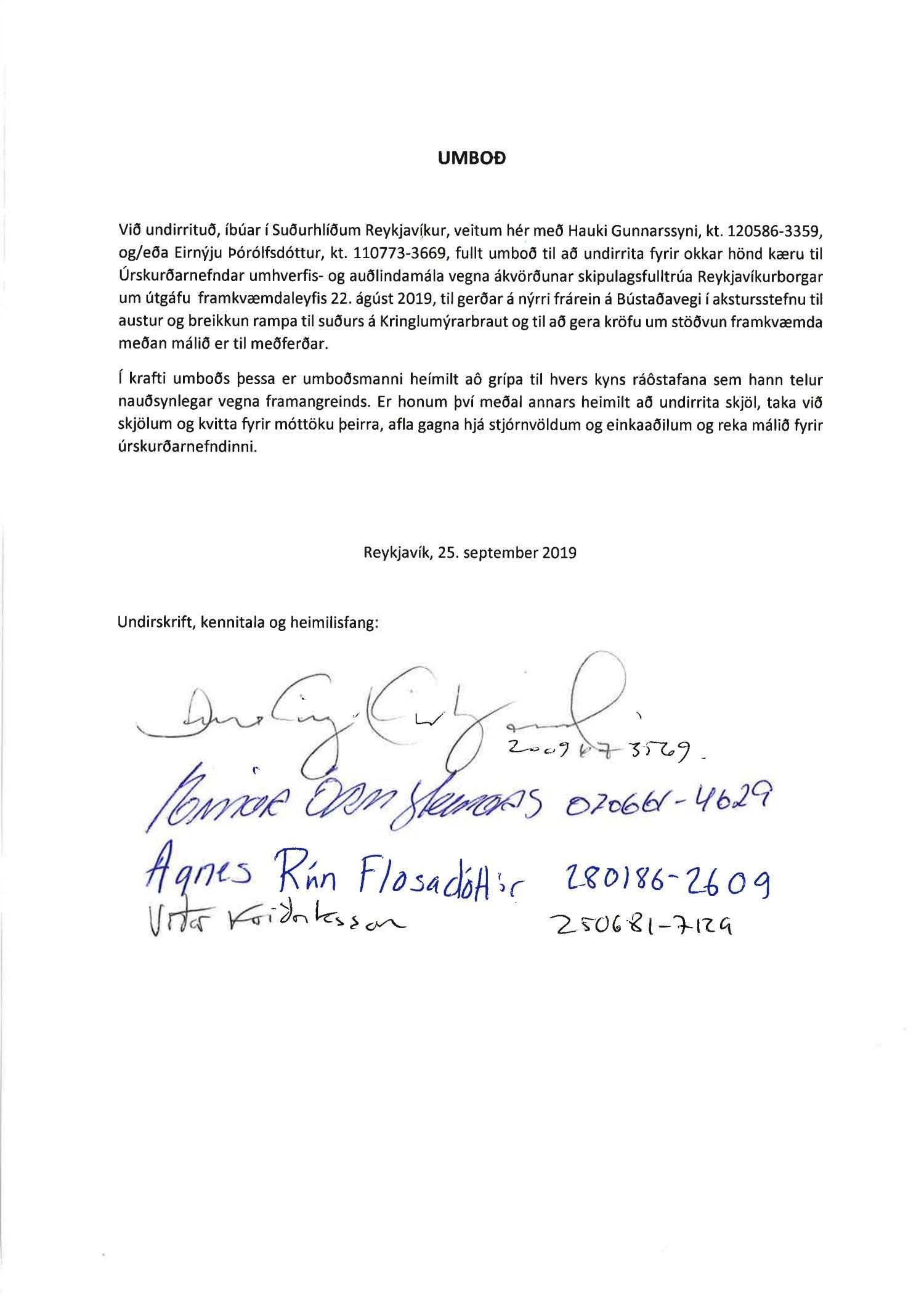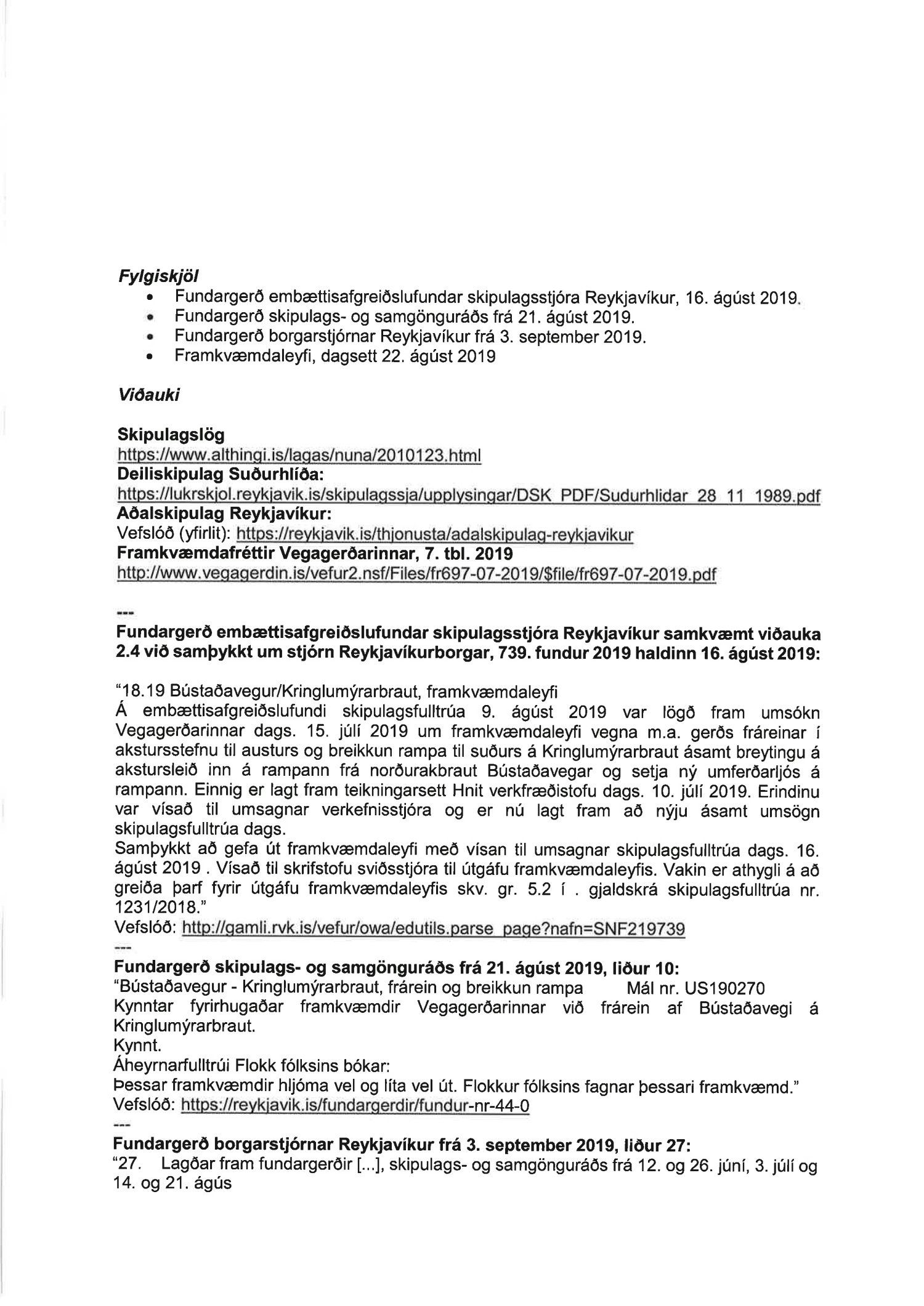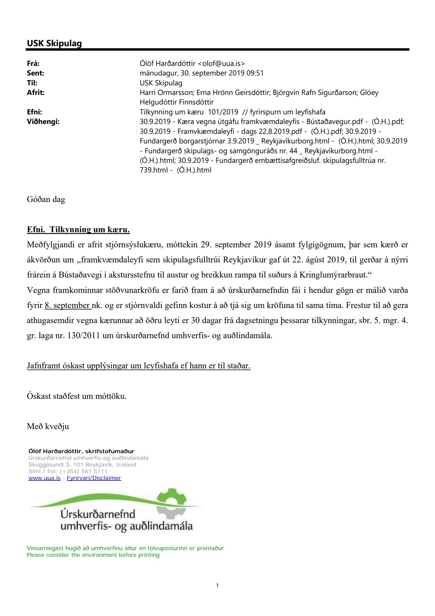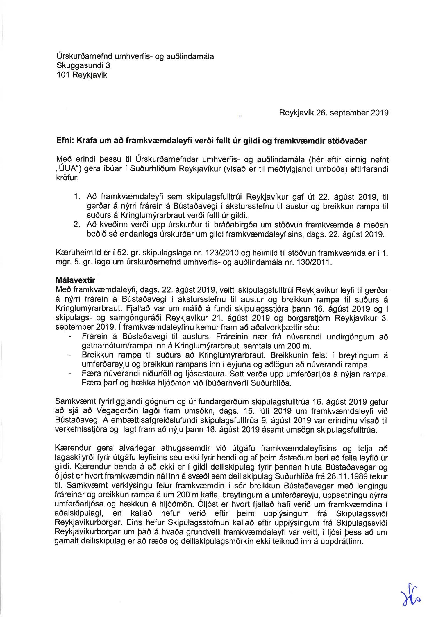 Lagt fram erindi úrskurðarnefndar umhverfis- og auðlindamála dags. 30. september 2019 ásamt kæru dags. 26. september 2019 þar sem kærð er samþykkt skipulagsfulltrúa frá 16. ágúst 2019 um útgáfu framkvæmdaleyfis vegna m.a. gerðs fráreinar í akstursstefnu til austurs og breikkun rampa til suðurs á Kringlumýrarbraut ásamt breytingu á akstursleið inn á rampann frá norðurakbraut Bústaðavegar og setja ný umferðarljós á rampann.