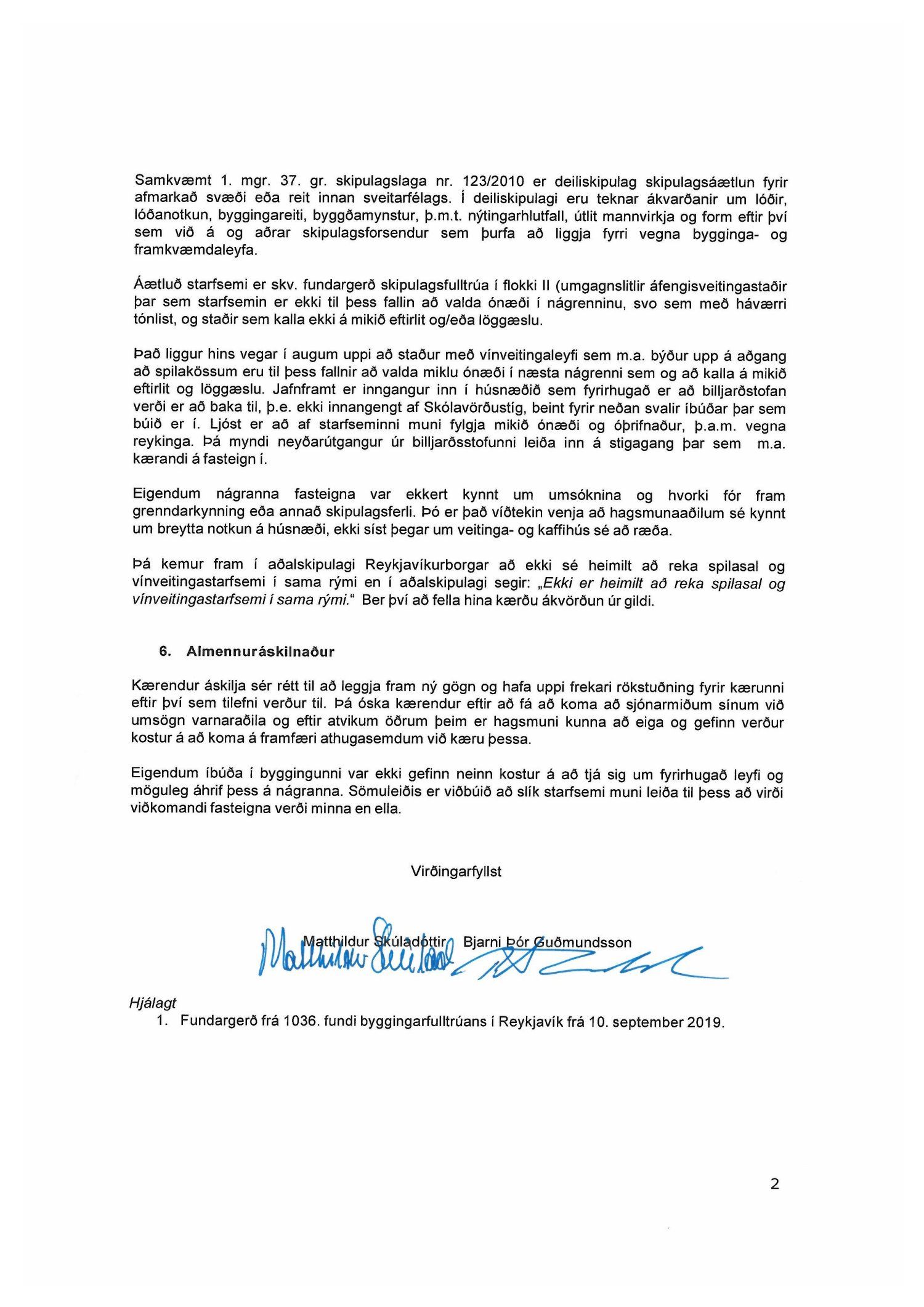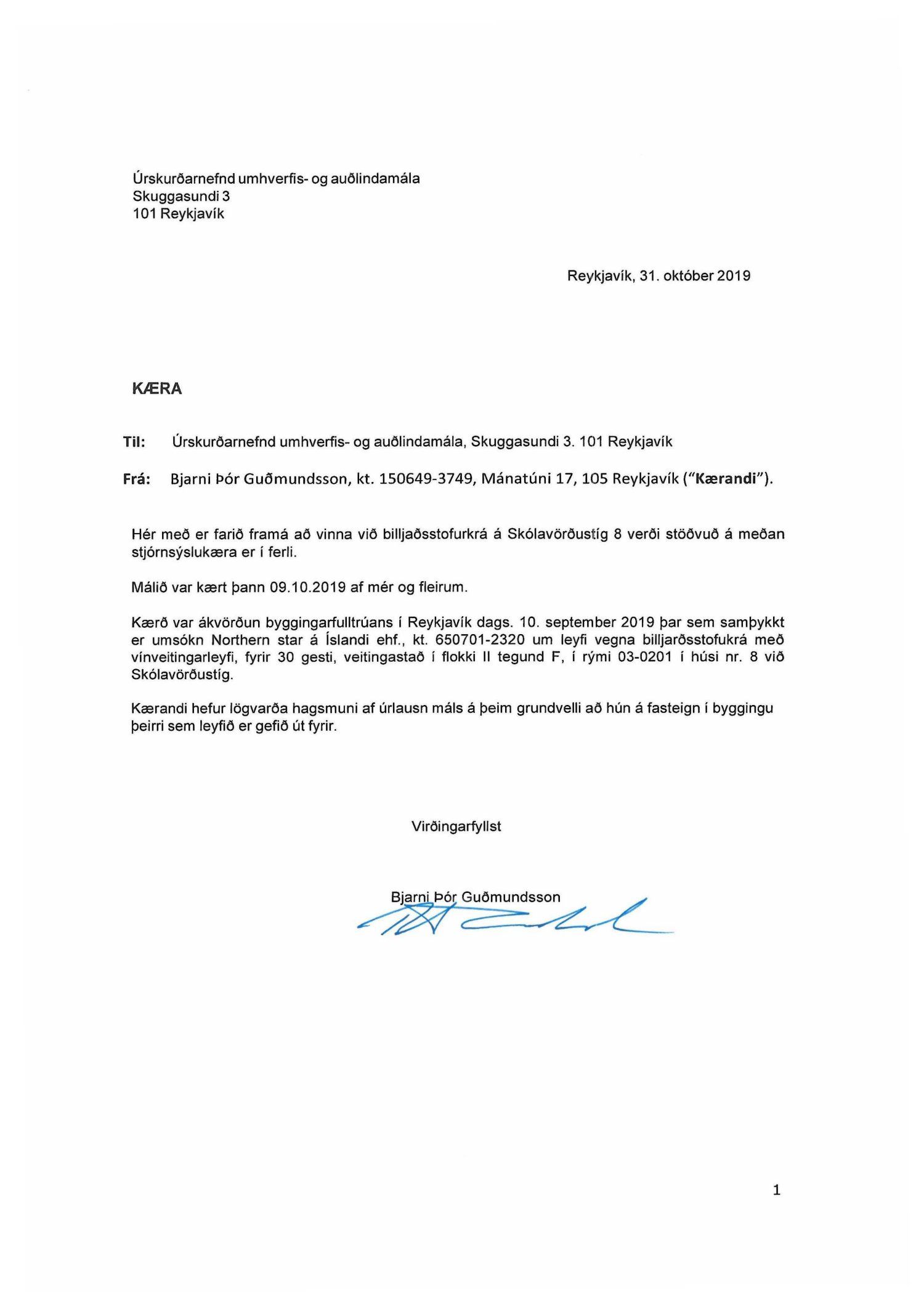 Lagt fram erindi úrskurðarnefndar umhverfis- og auðlindamála dags. 10. október 2019 ásamt kæru dags. 9. október 2019 þar sem kærð er samþykkt byggingarfulltrúa Reykjavík frá 10. september 2019 um leyfi fyrir billjarðstofukrá með vínveitingaleyfi fyrir 30 gesti, veitingastað í flokki II tegund F, í rými 03-0201 í húsi á lóð nr. 8 við Skólavörðustíg. Einnig er lögð fram umsögn skrifstofu sviðsstjóra dags. 4. nóvember 2019.